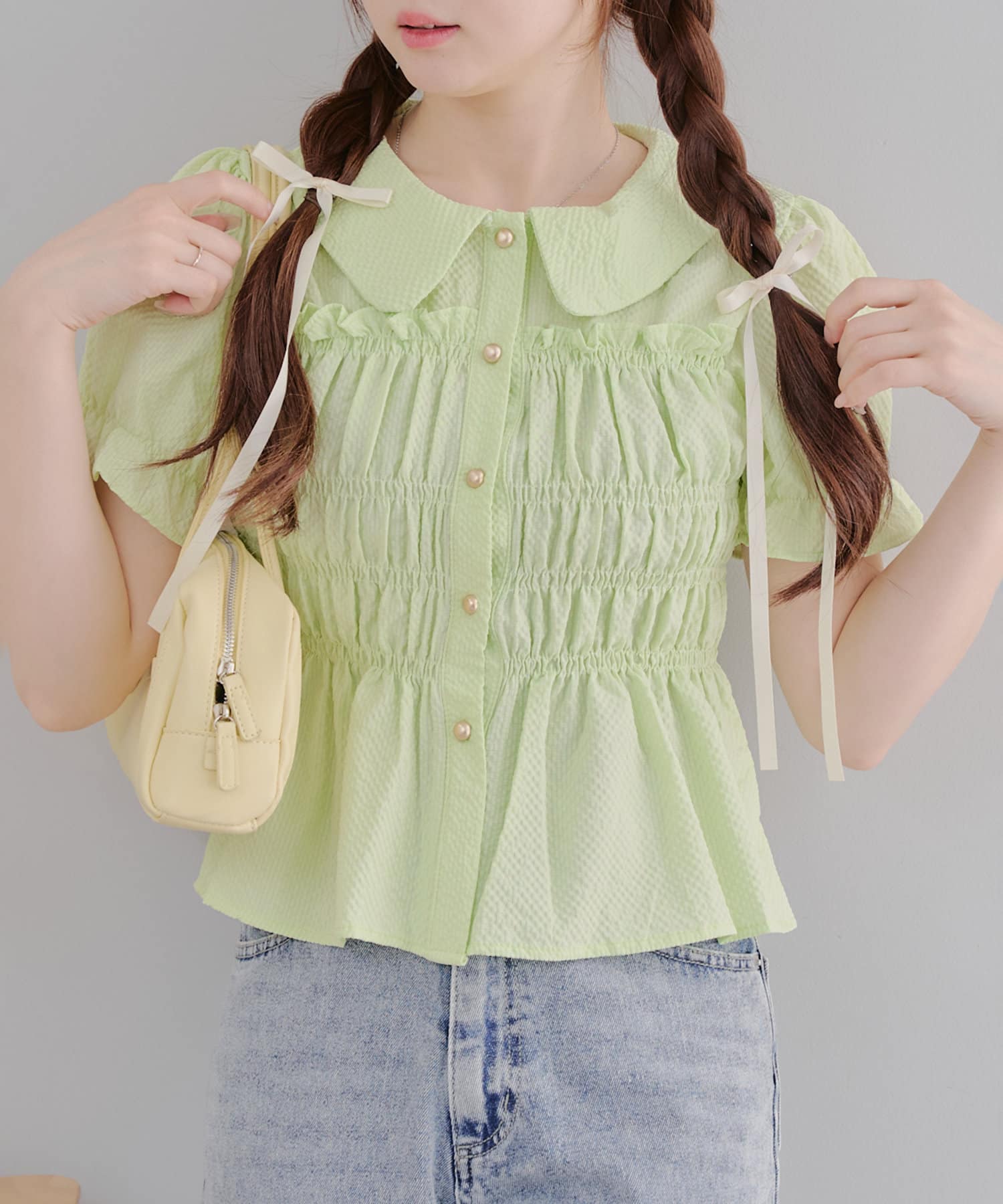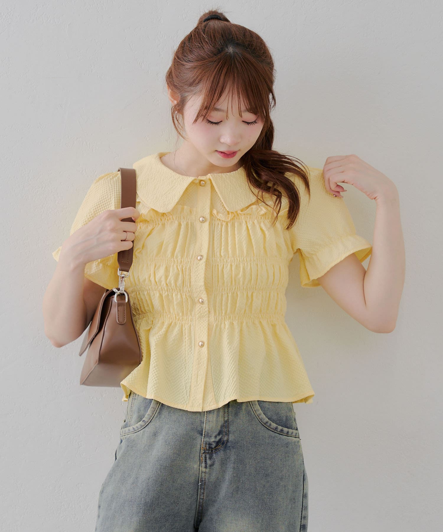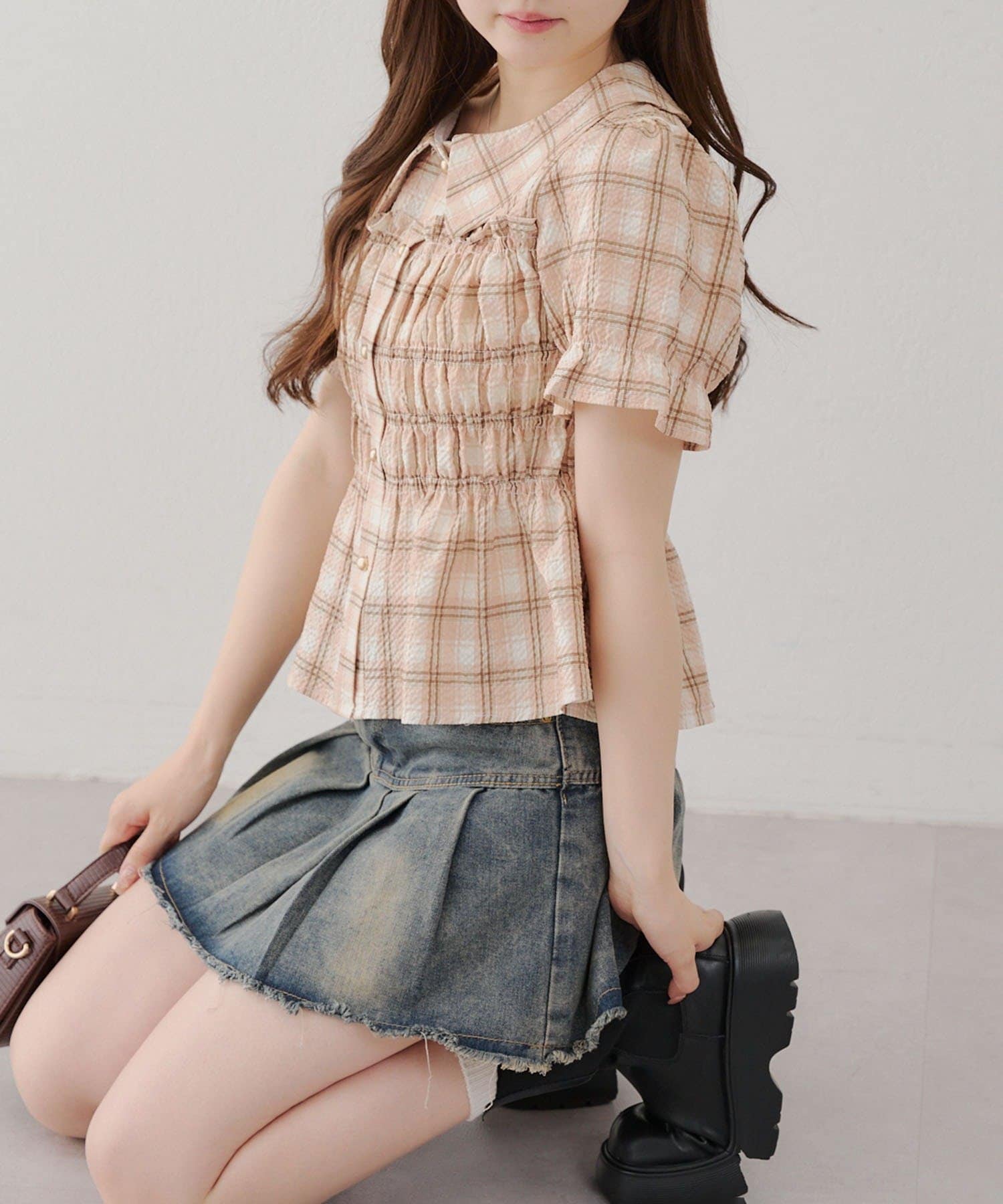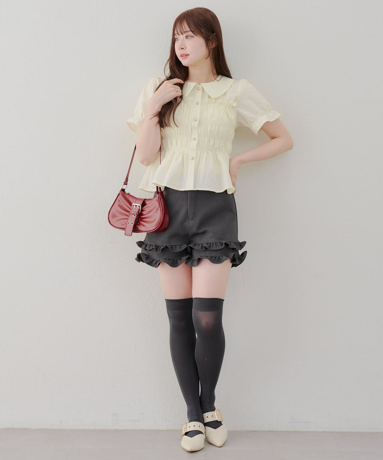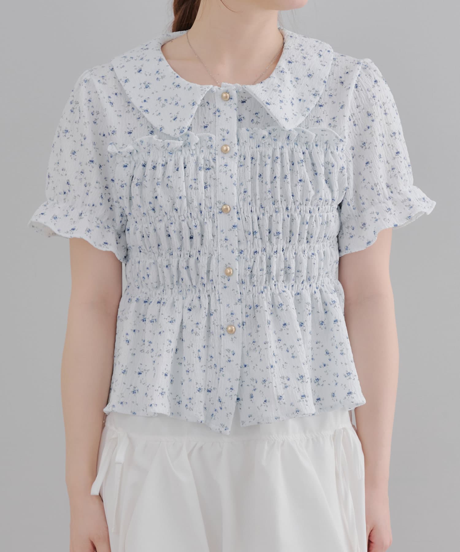 トレンド韓国ガーリーコーデに♪シャーリング衿付ブラウス