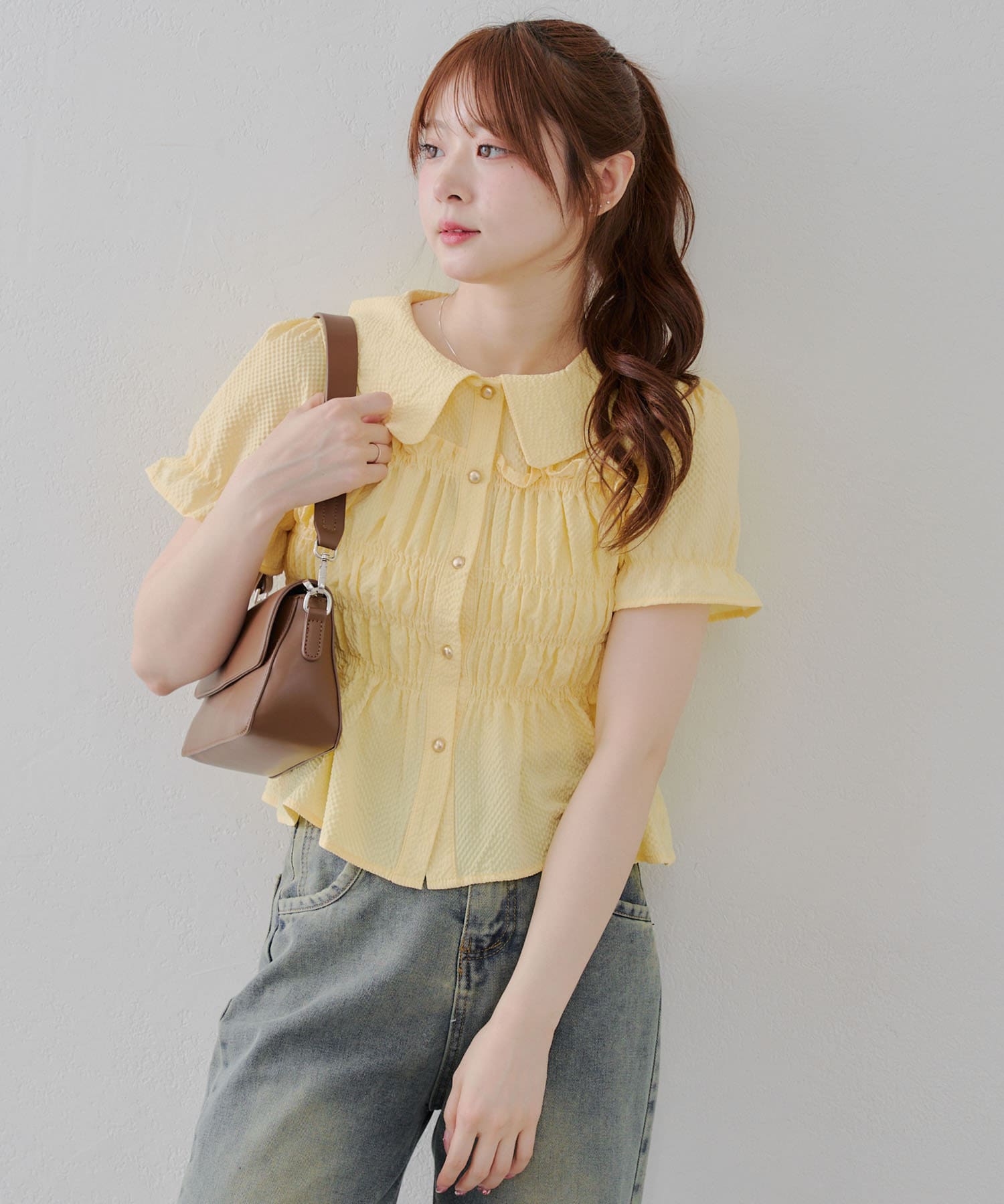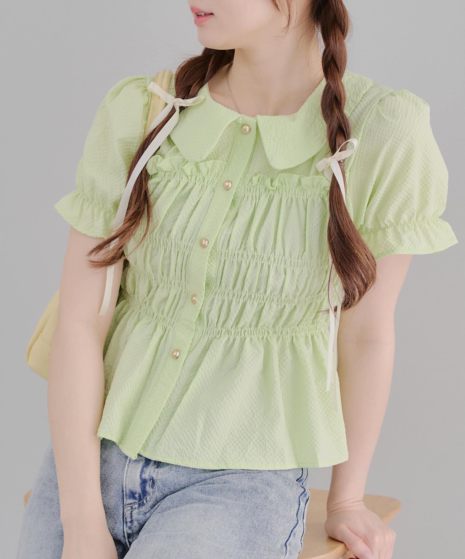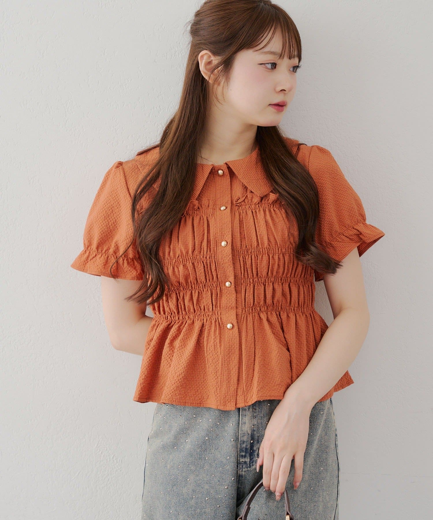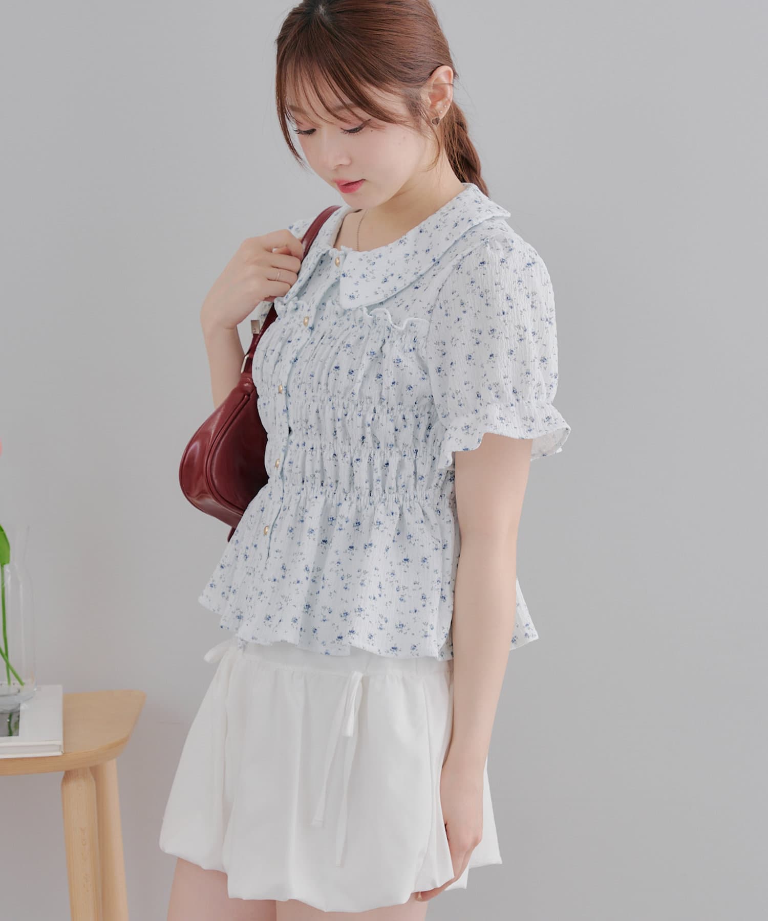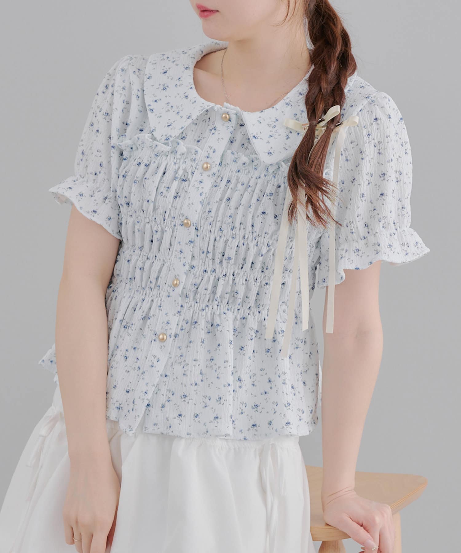 トレンド韓国ガーリーコーデに♪シャーリング衿付ブラウス