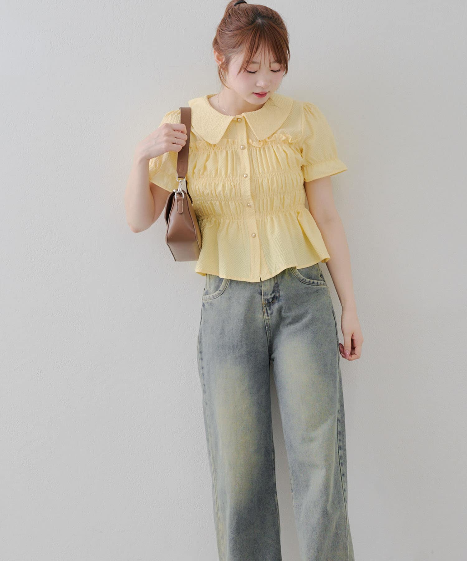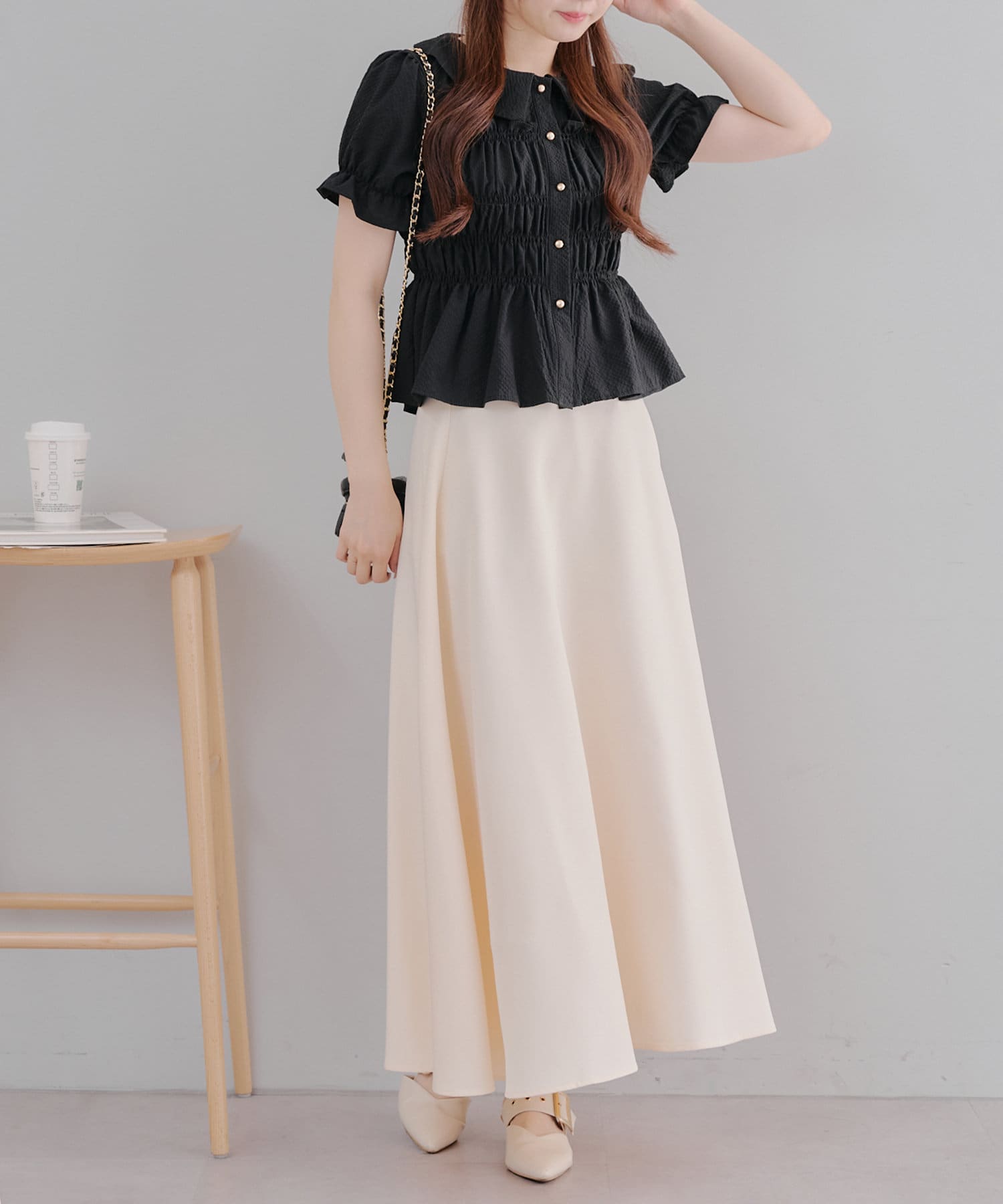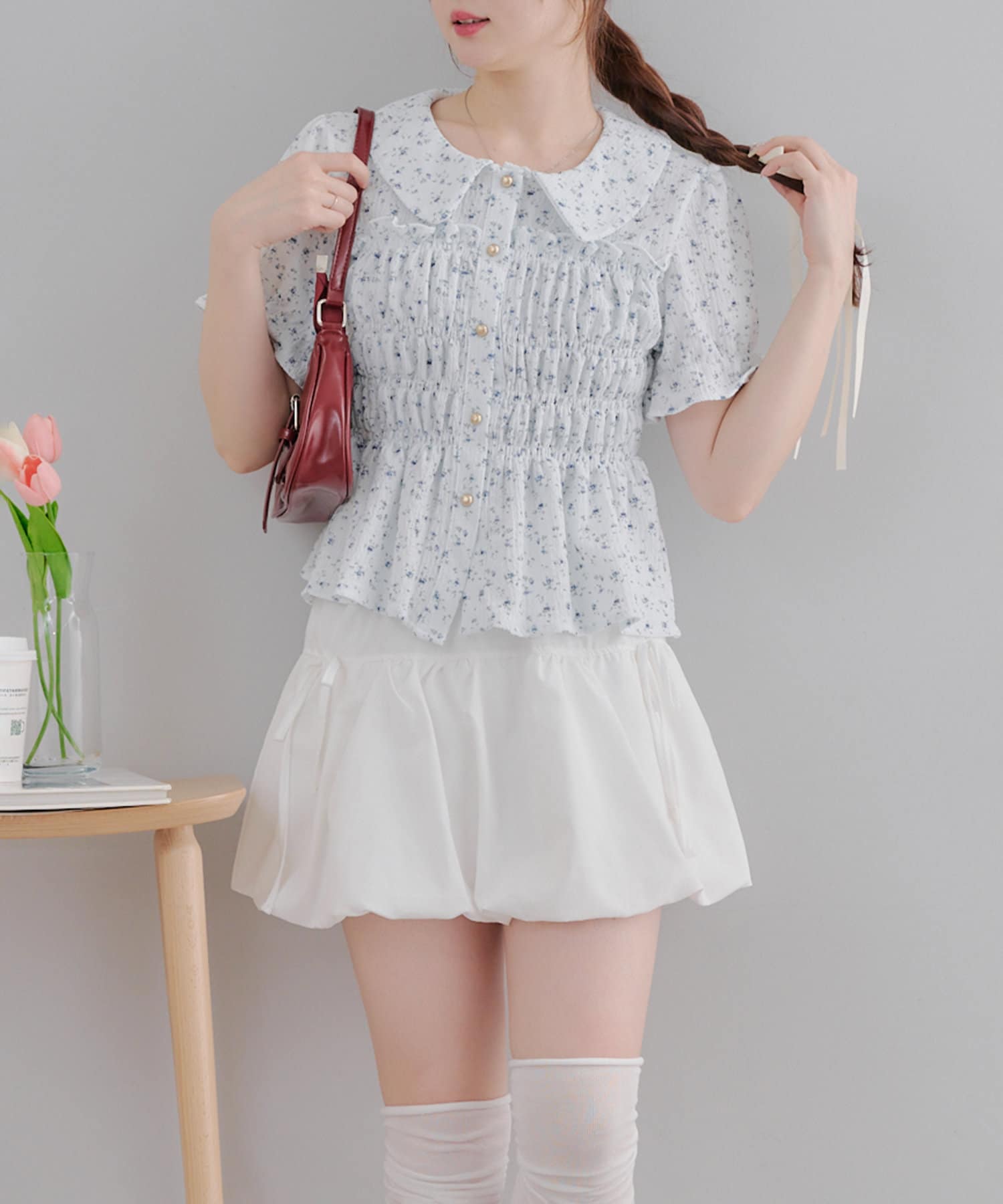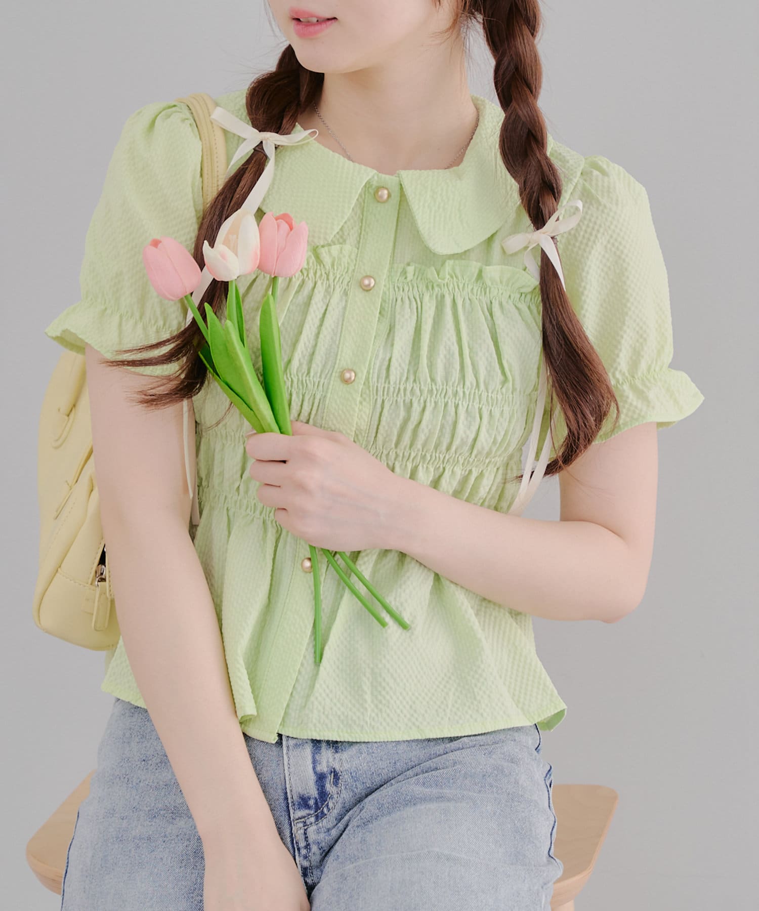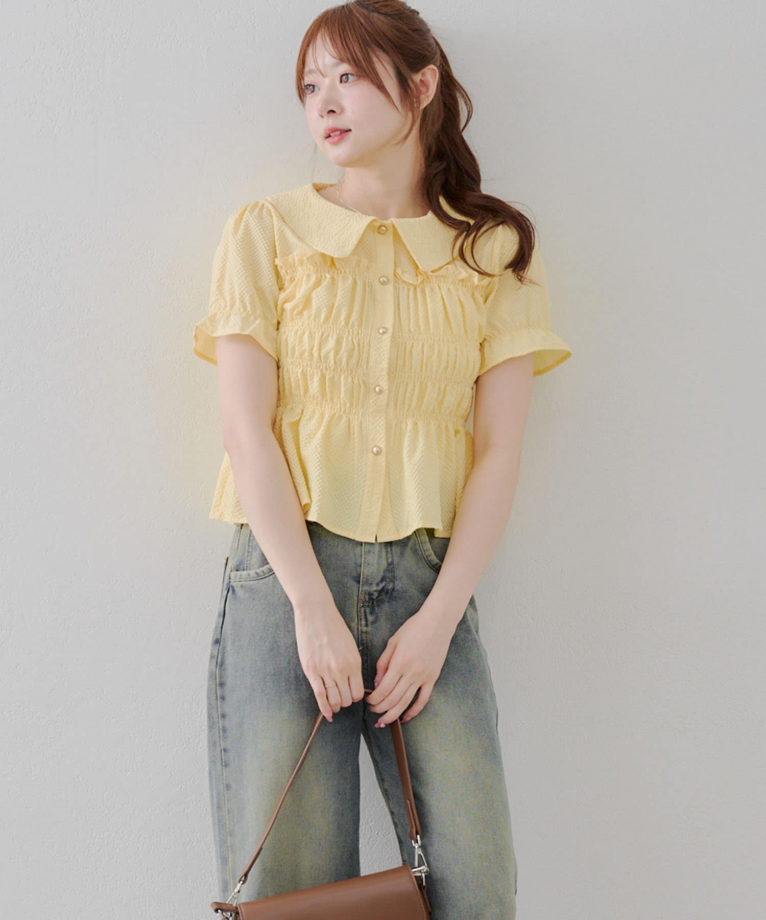 トレンド韓国ガーリーコーデに♪シャーリング衿付ブラウス