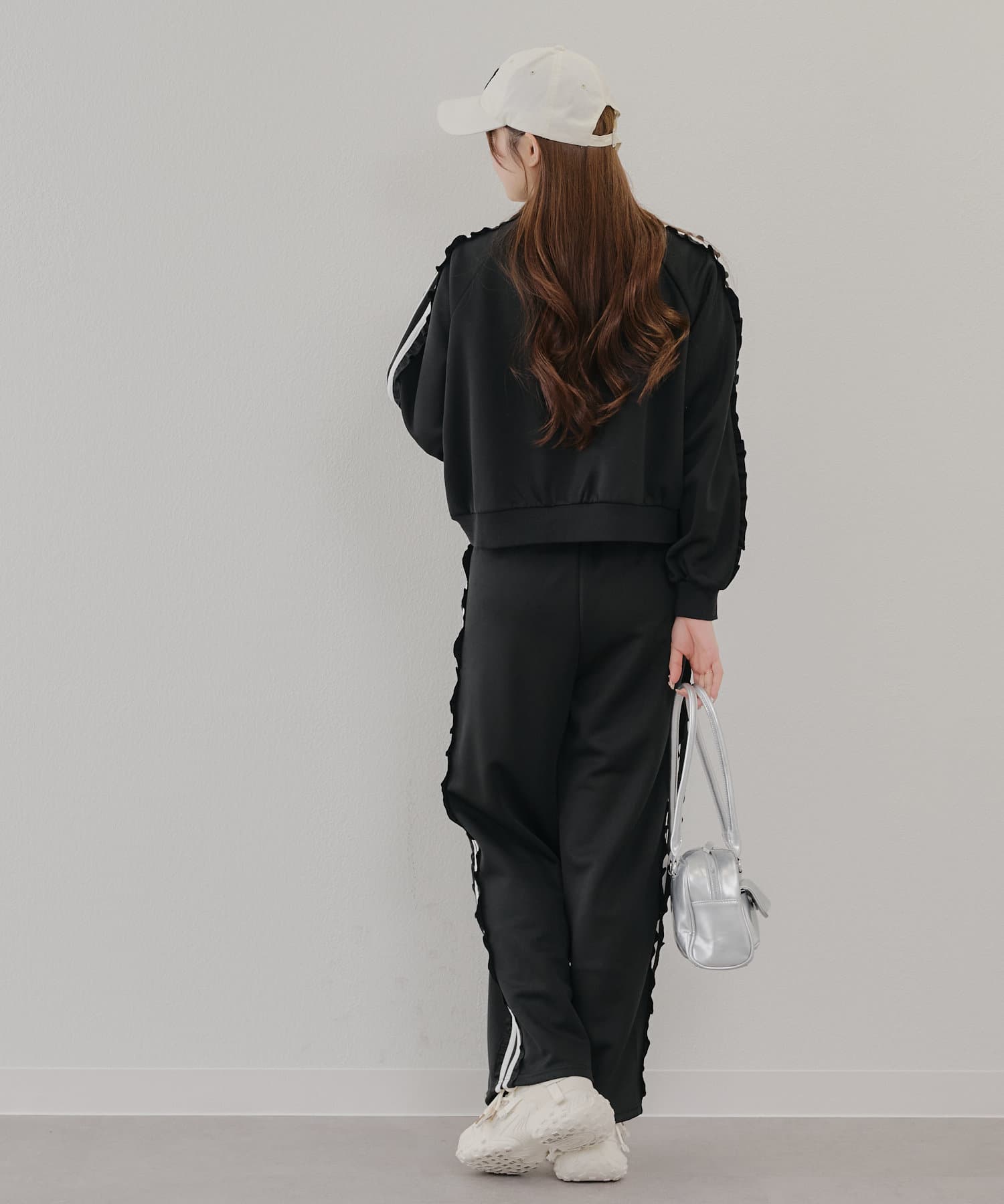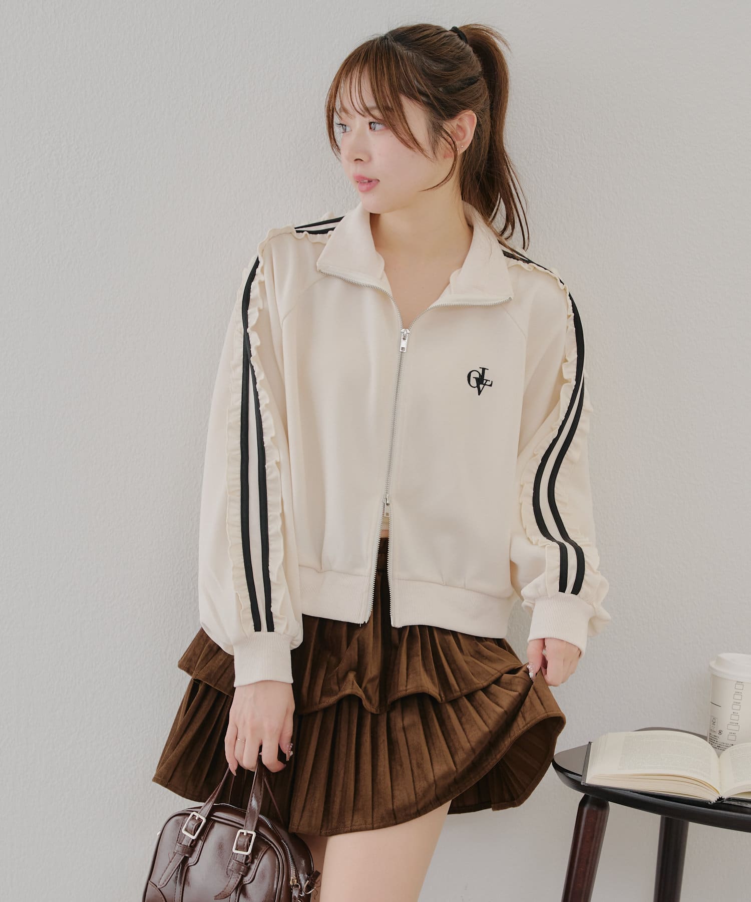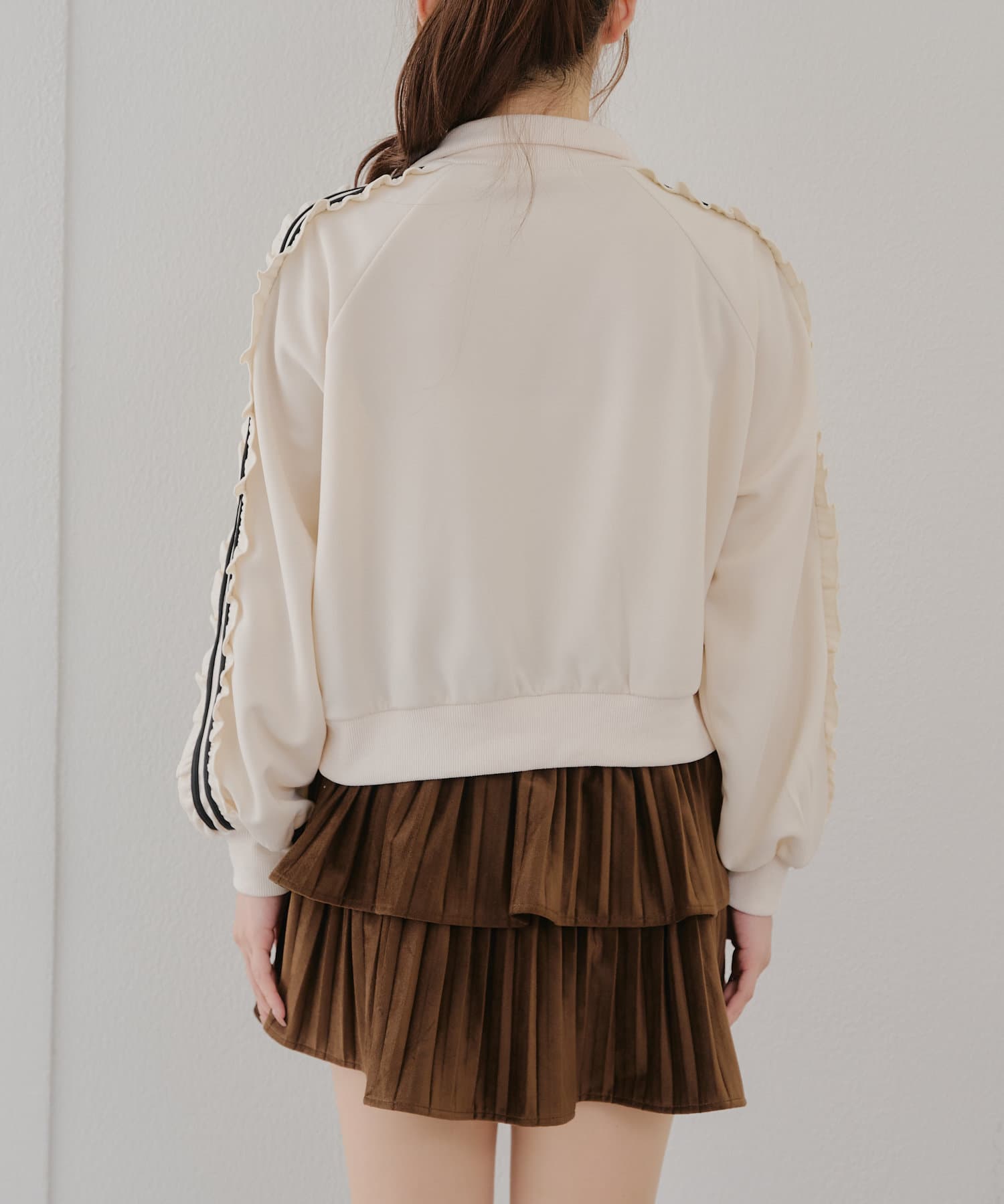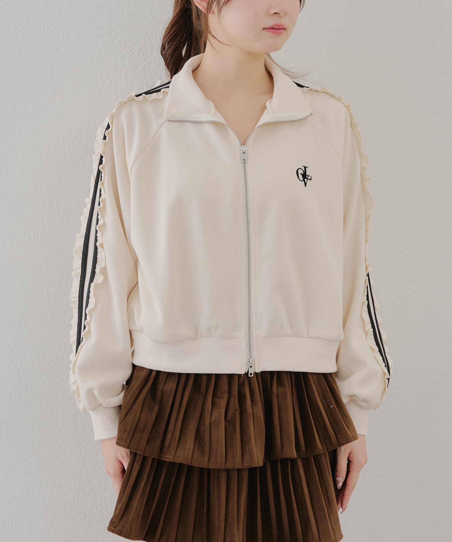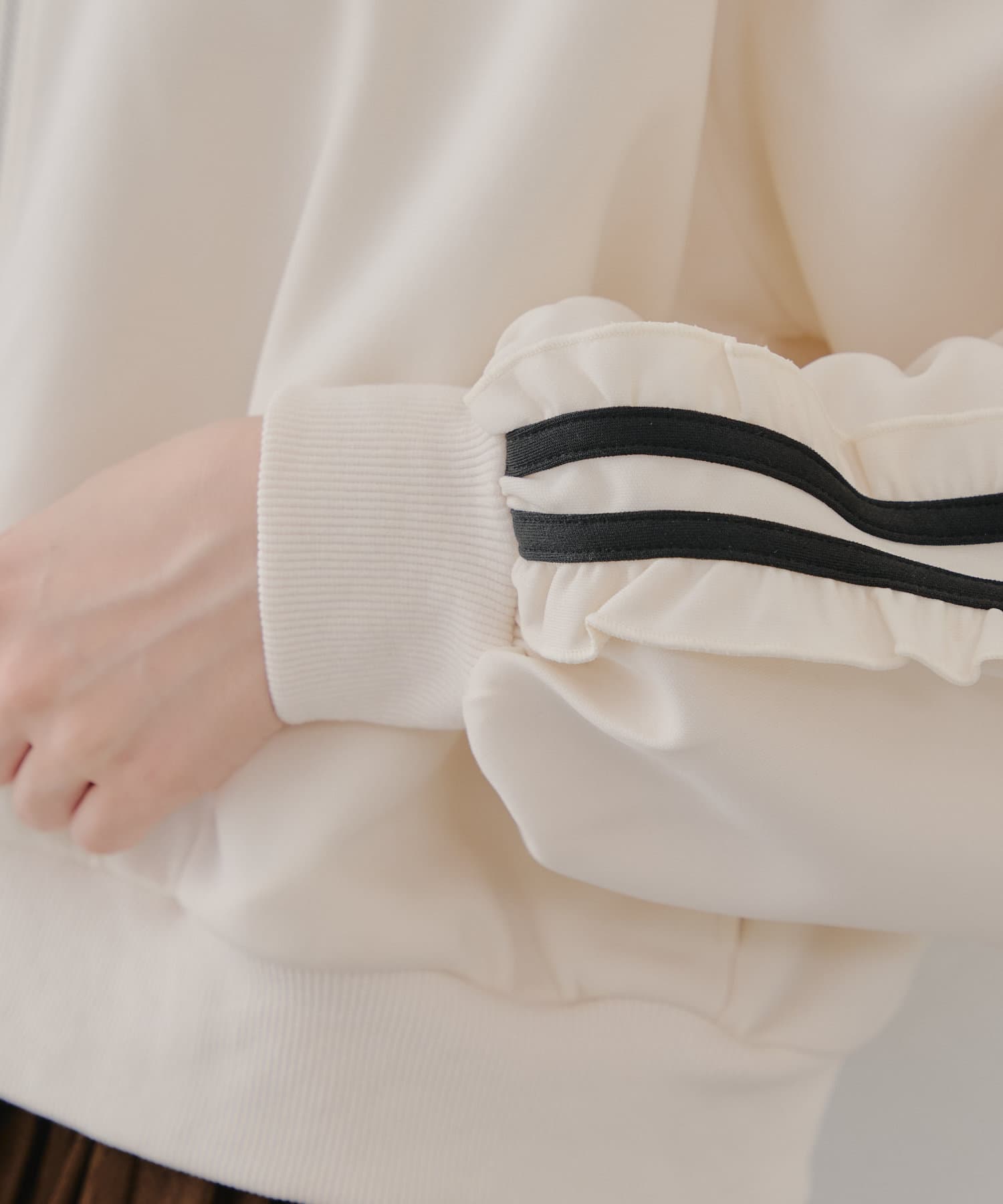 お袖のラインとフリルがカジュアルでガーリーなジャージトップス。