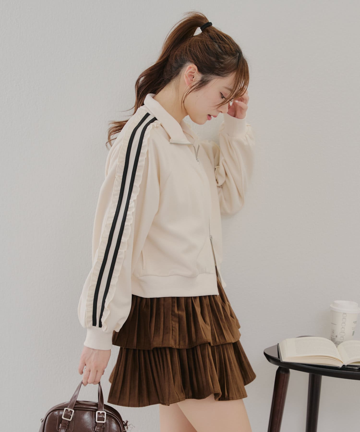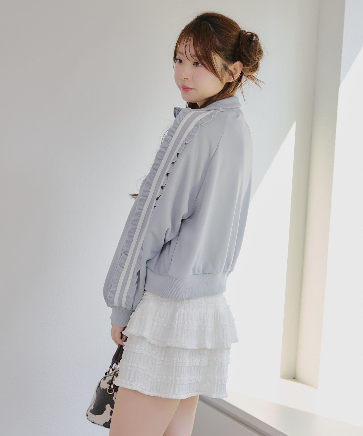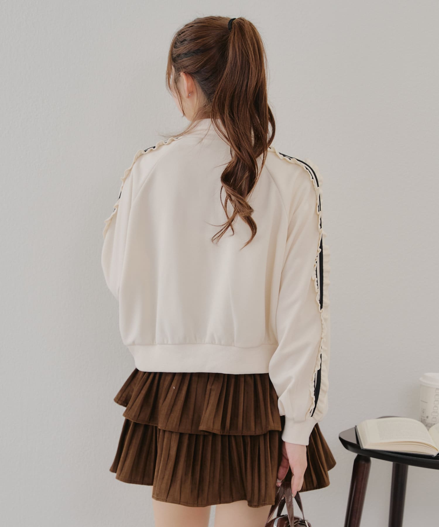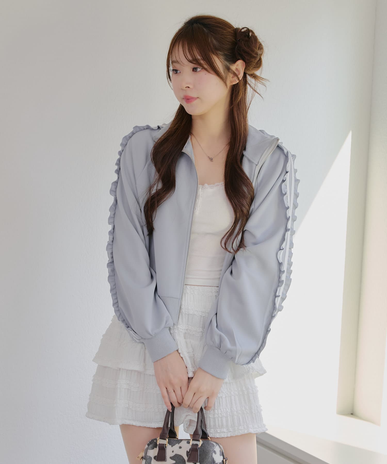 お袖のラインとフリルがカジュアルでガーリーなジャージトップス。
