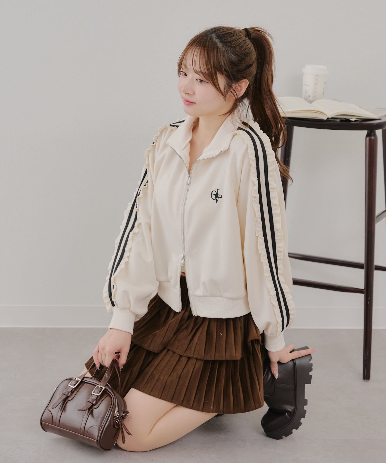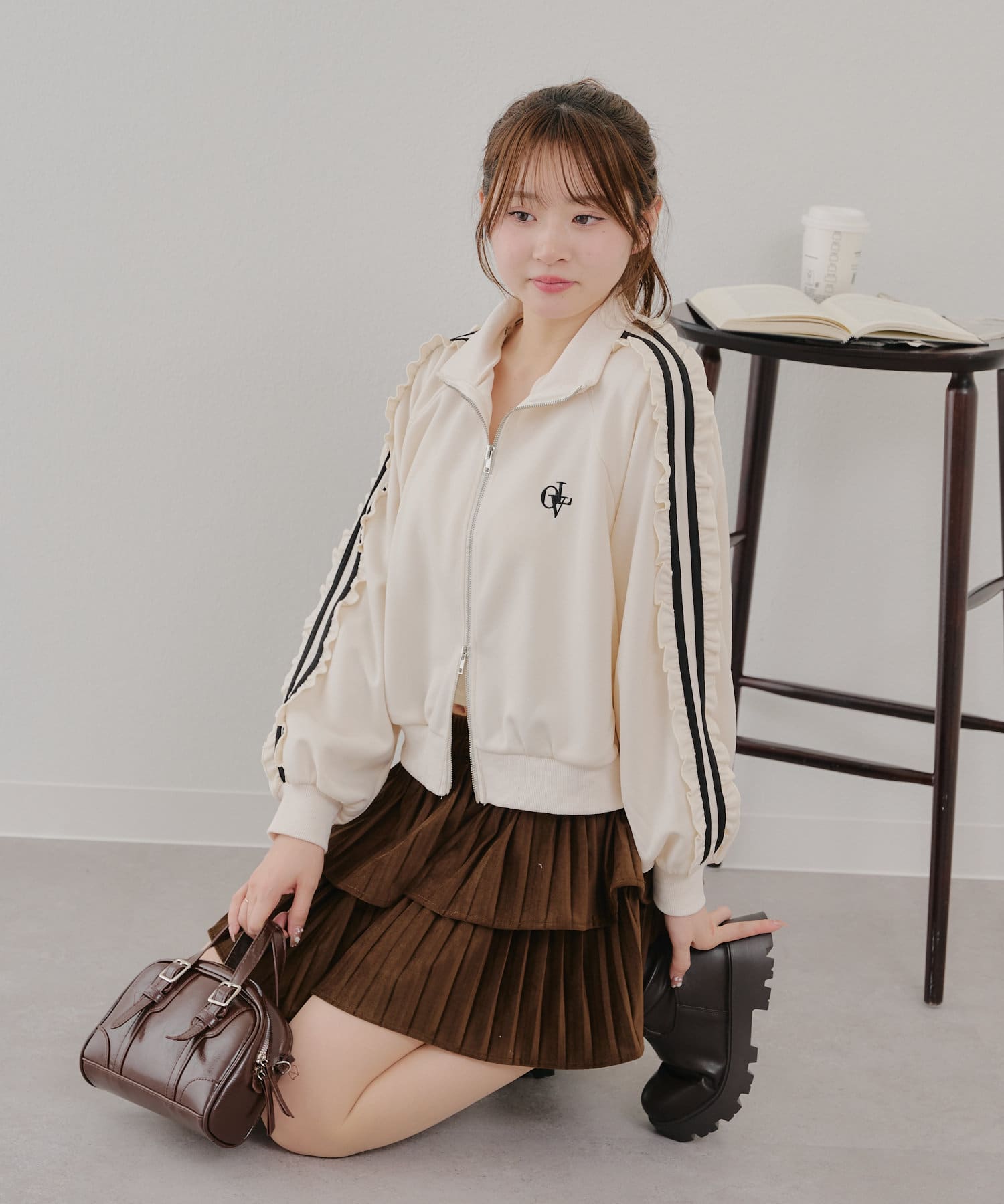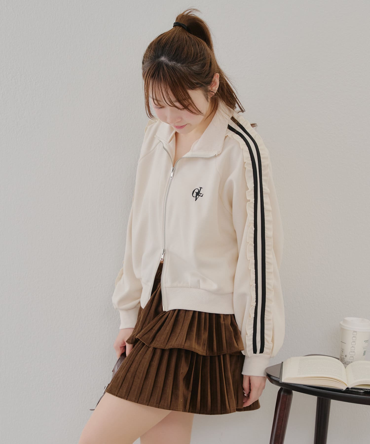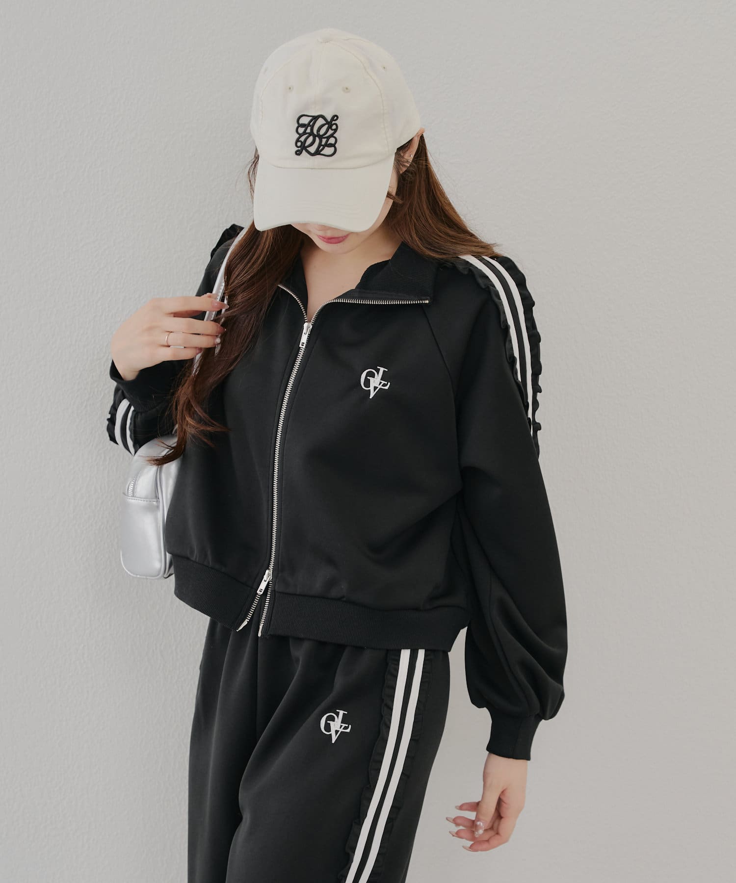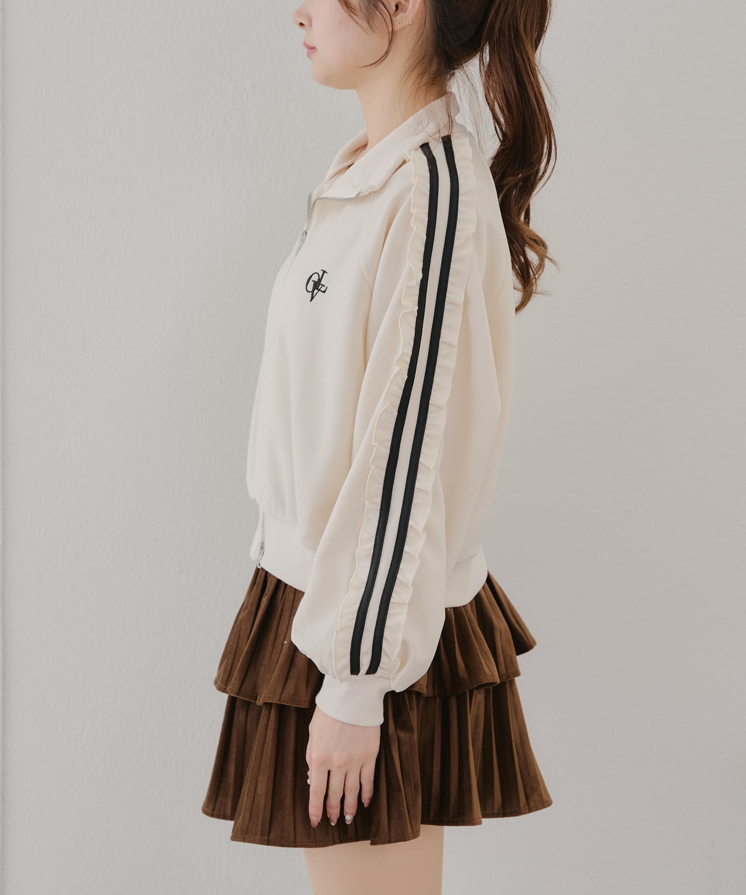 お袖のラインとフリルがカジュアルでガーリーなジャージトップス。