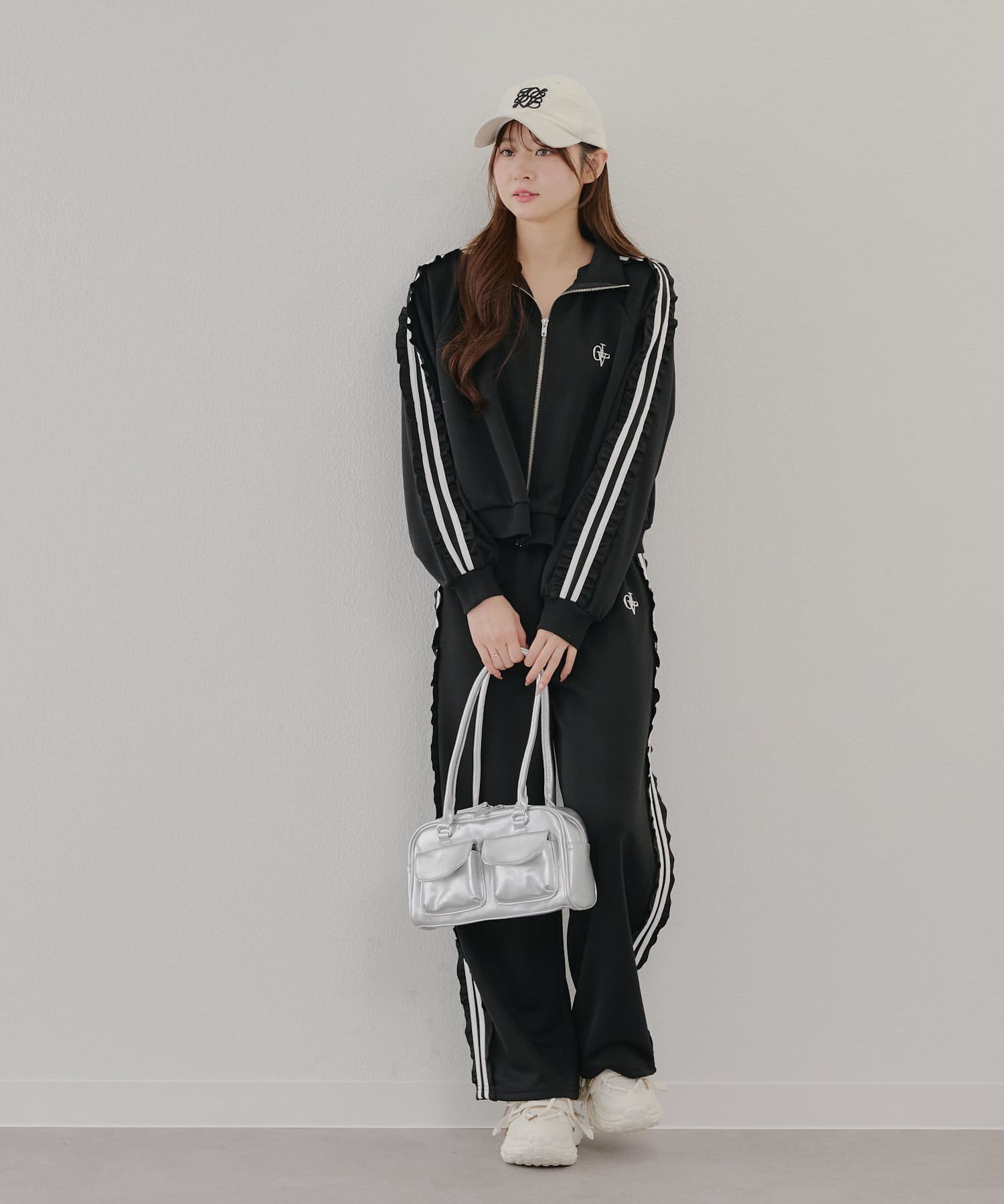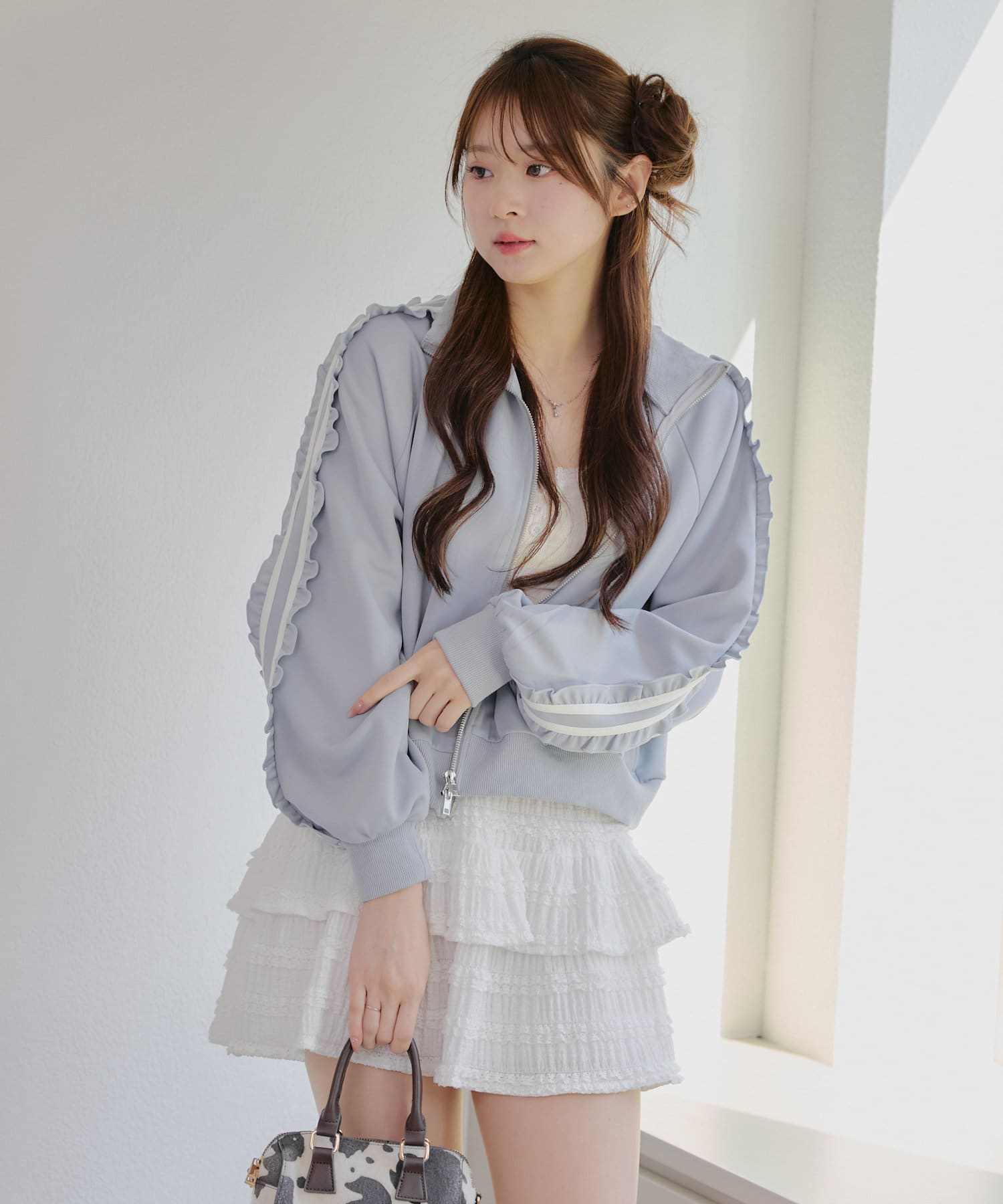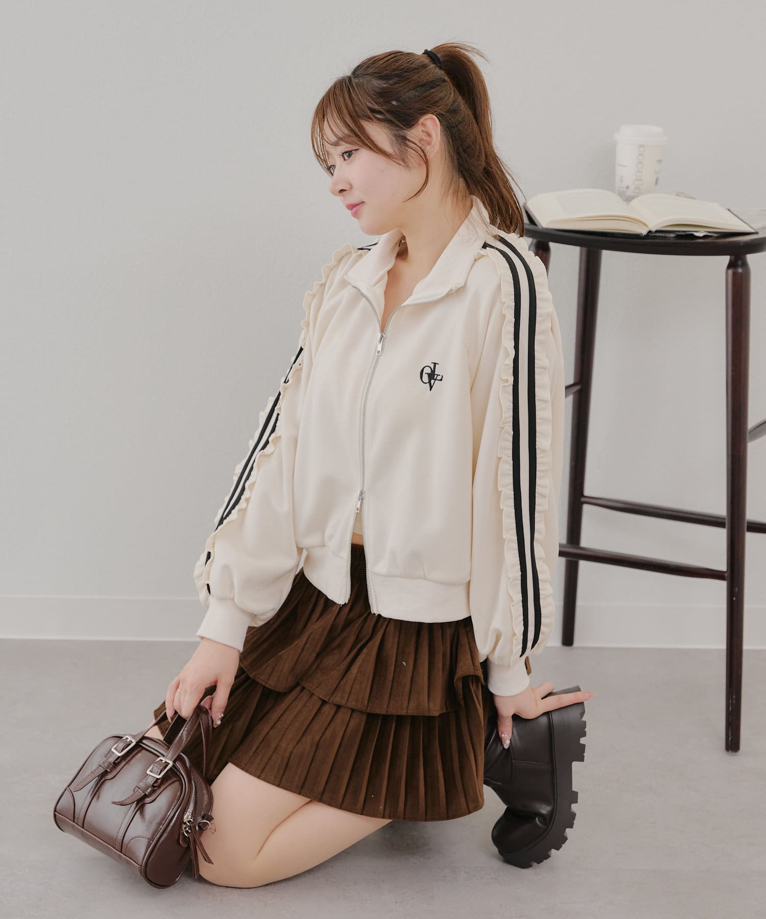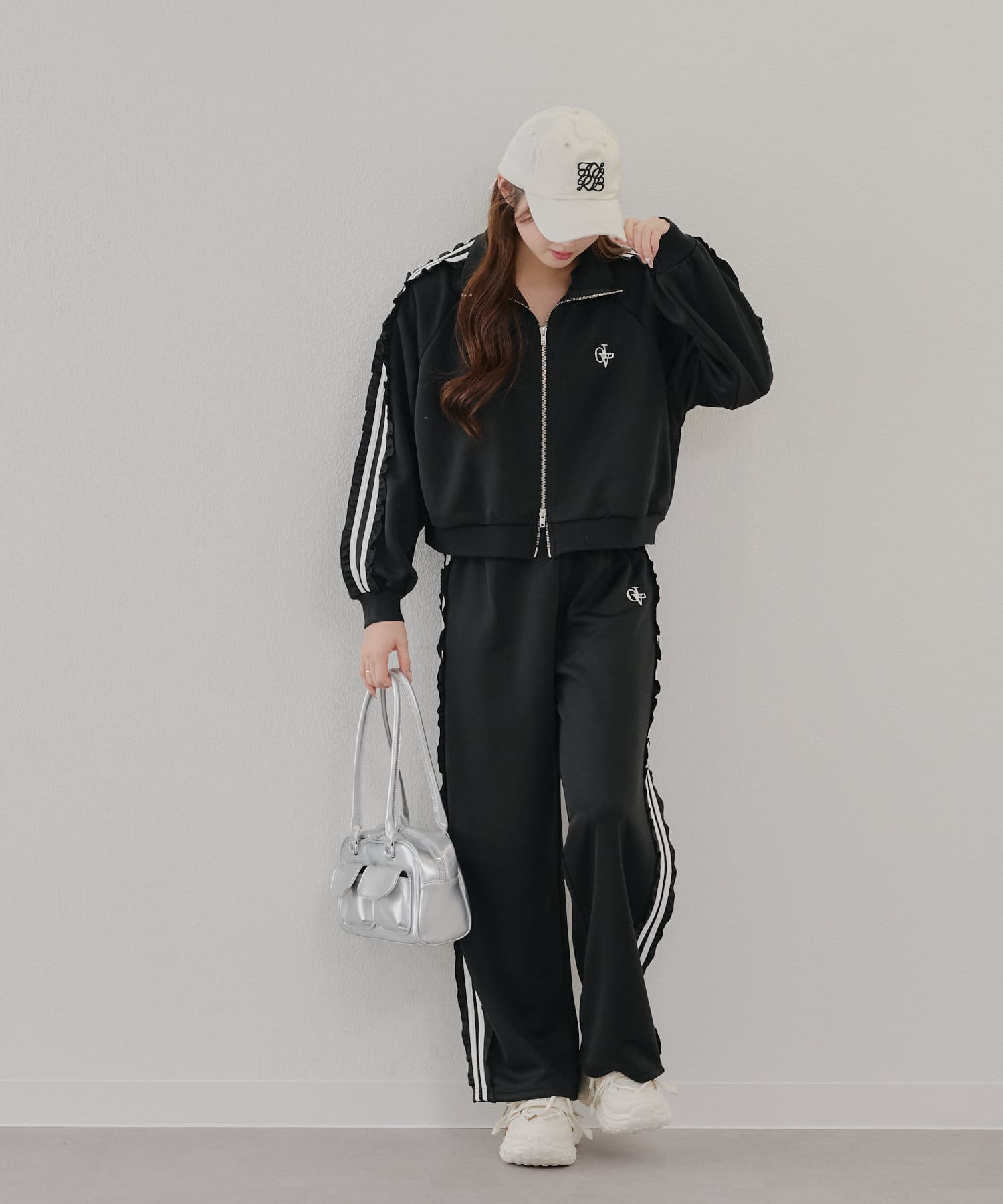 お袖のラインとフリルがカジュアルでガーリーなジャージトップス。