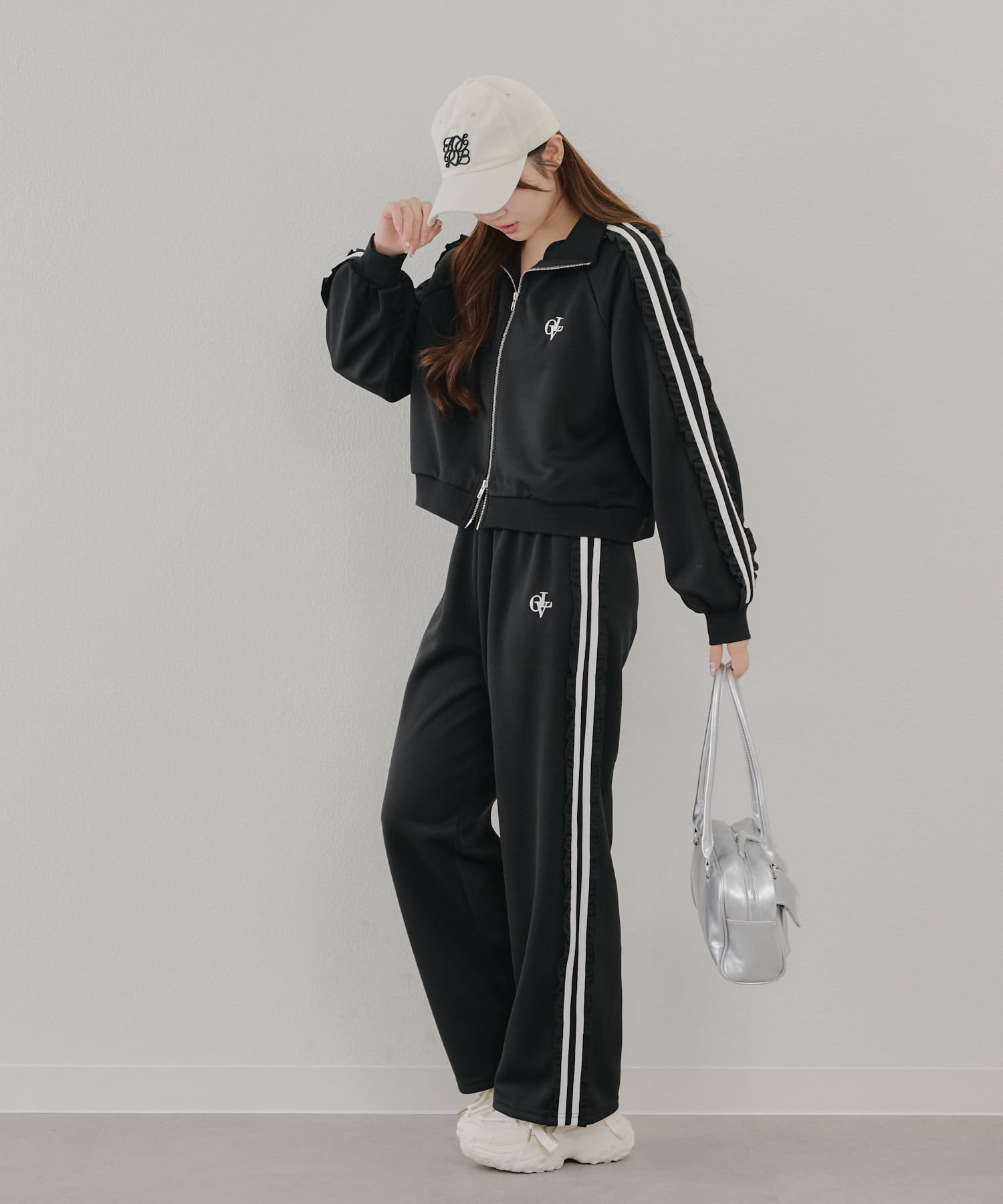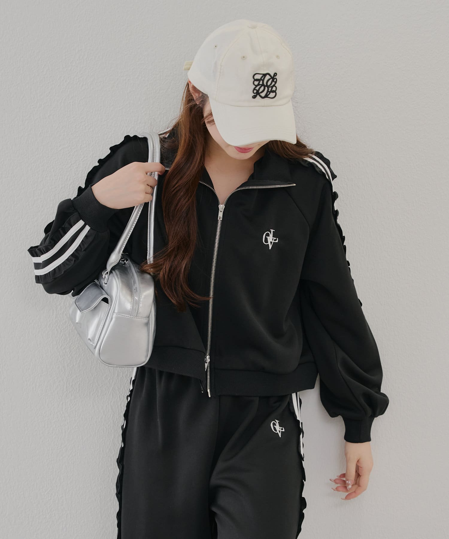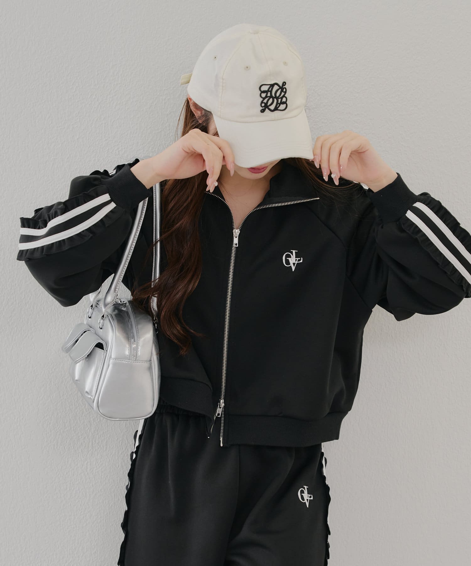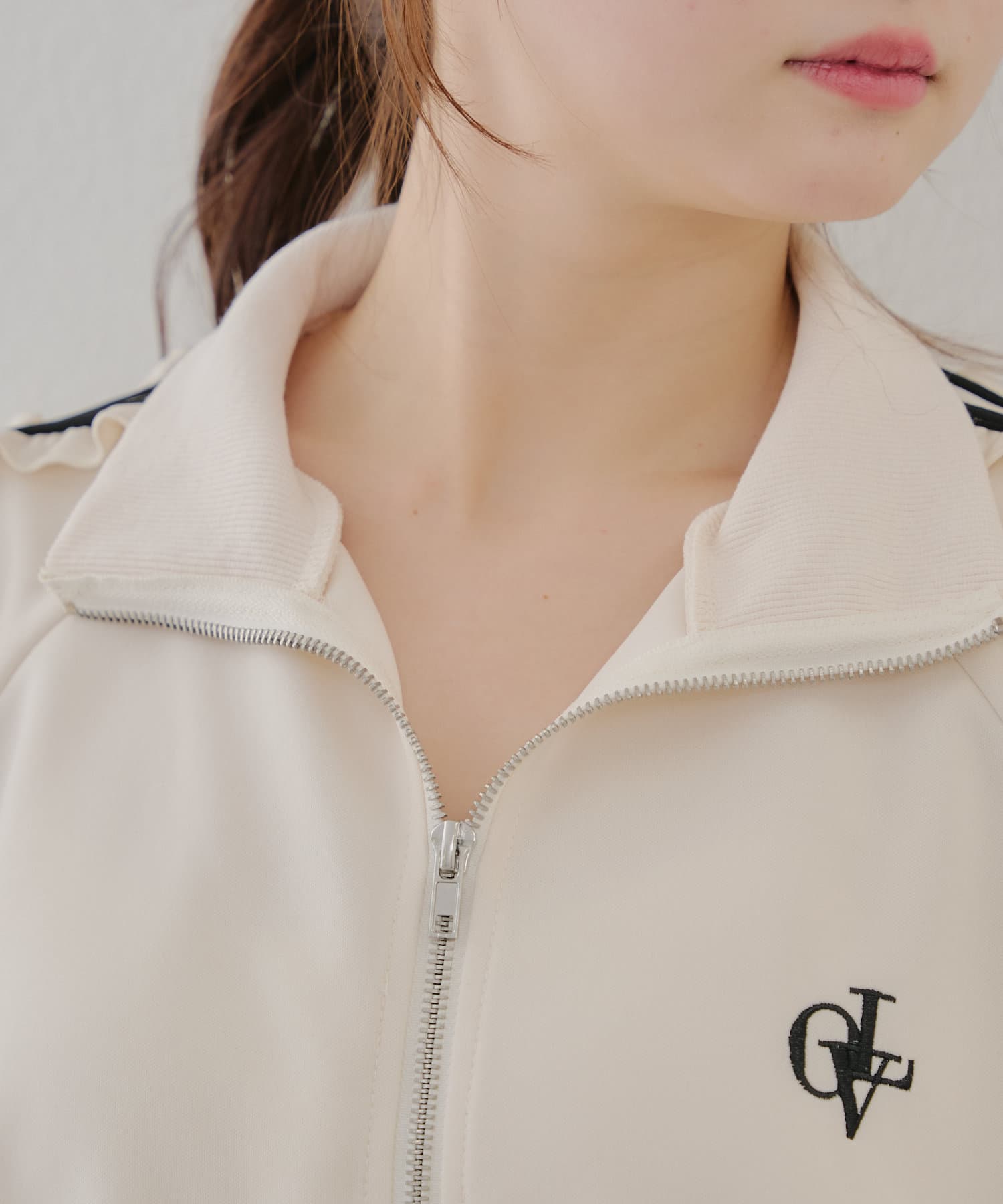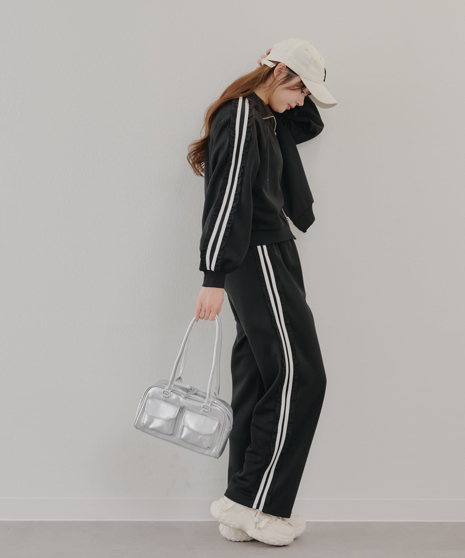 お袖のラインとフリルがカジュアルでガーリーなジャージトップス。