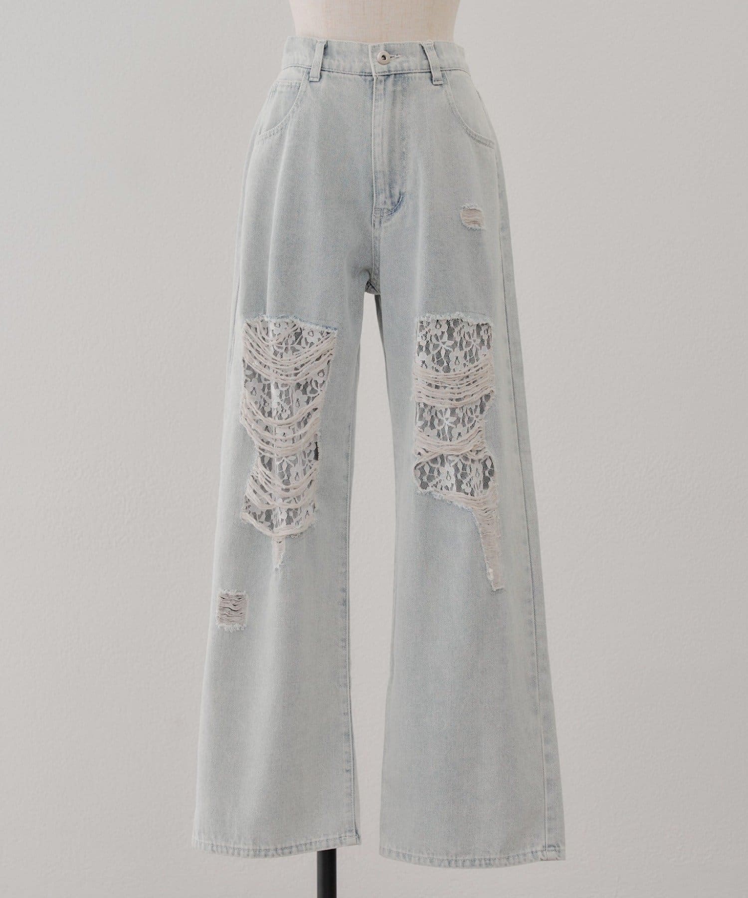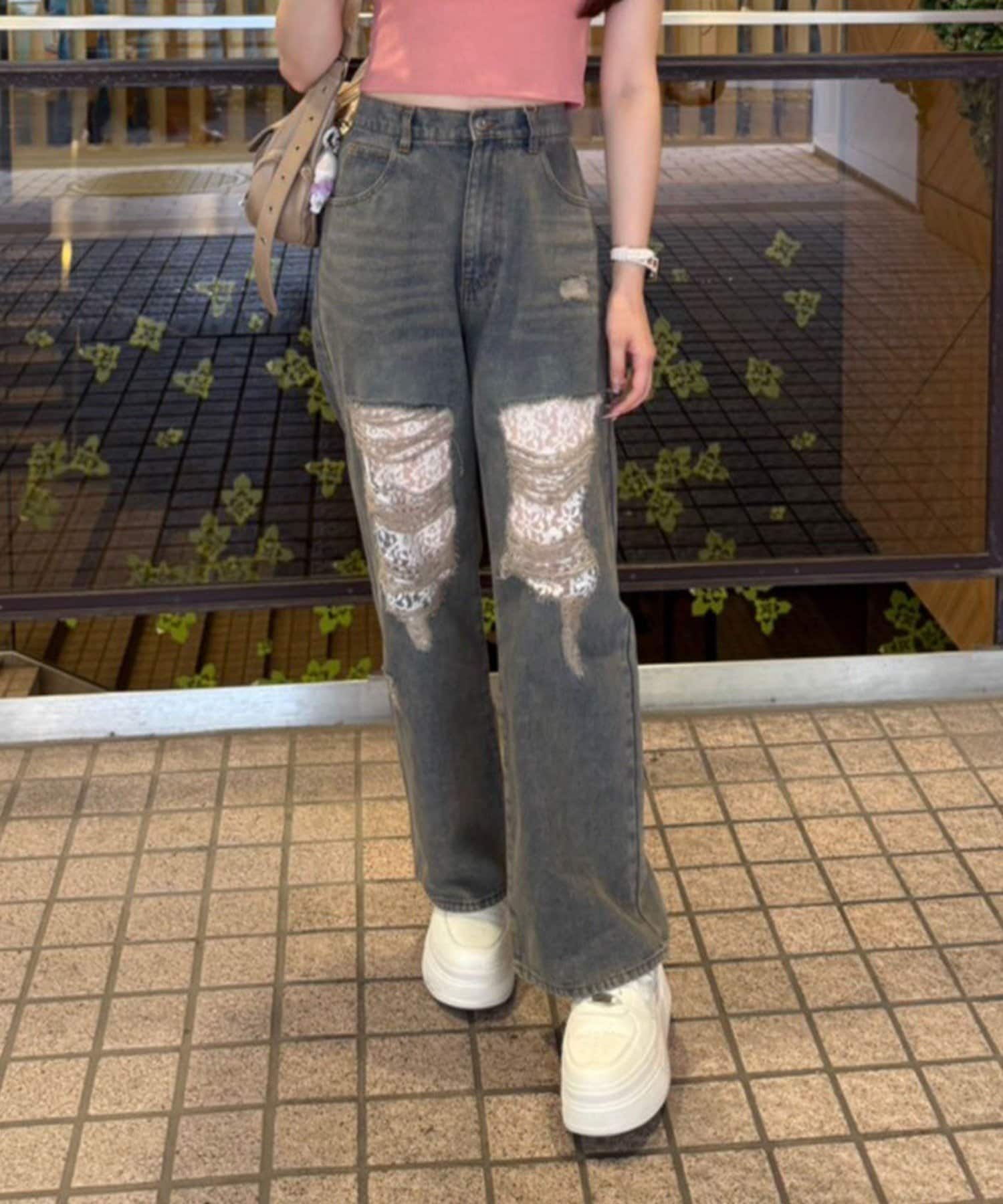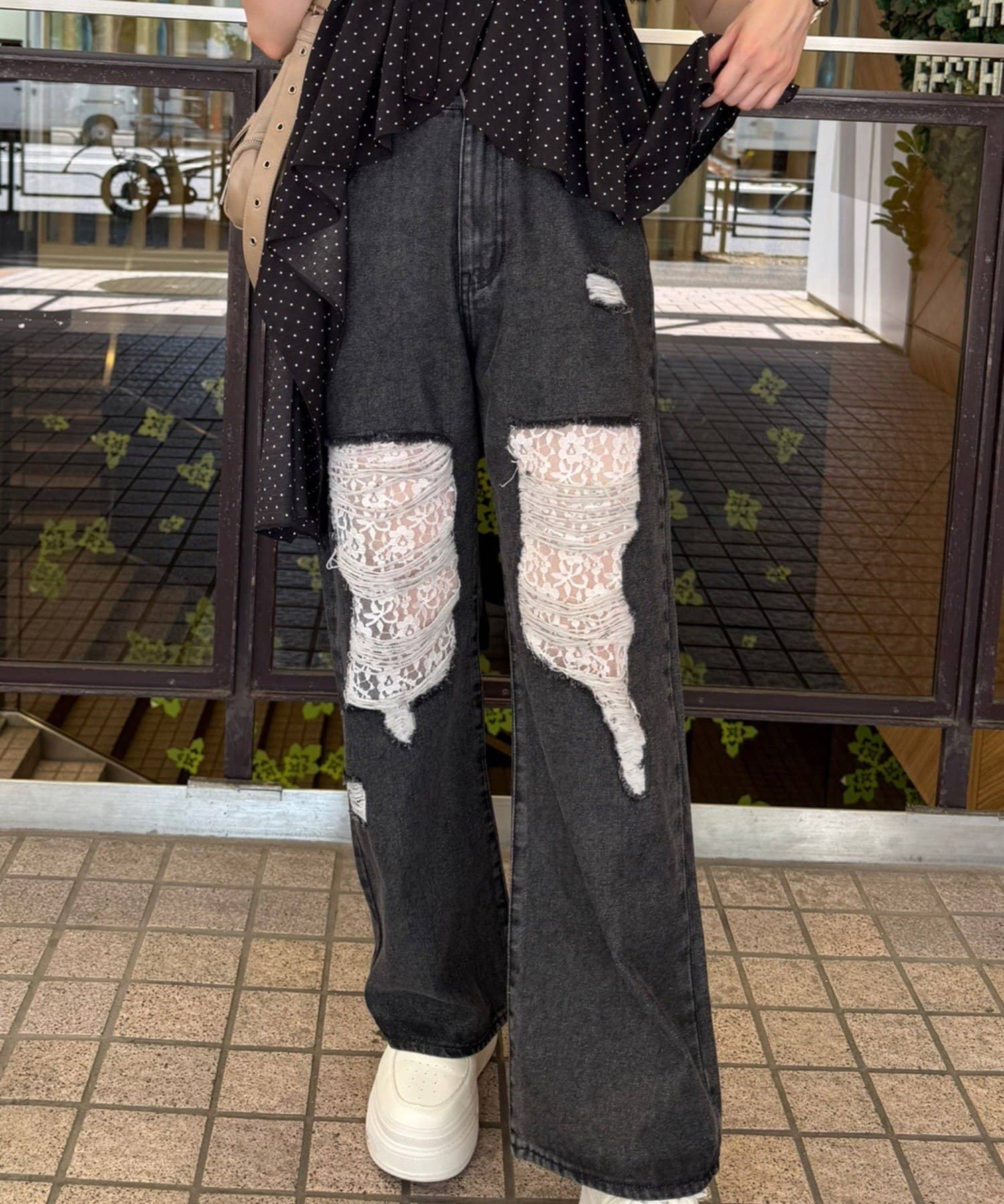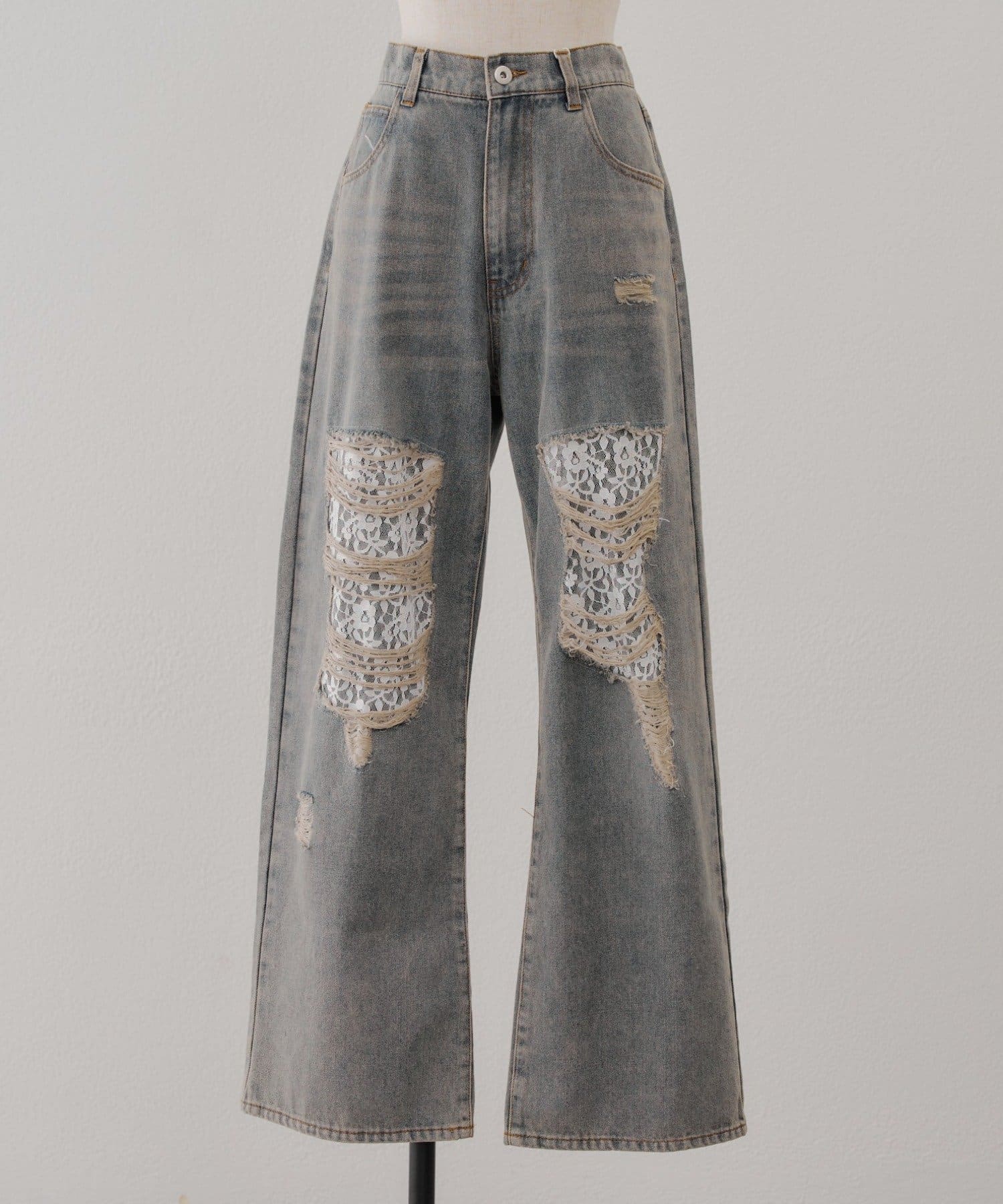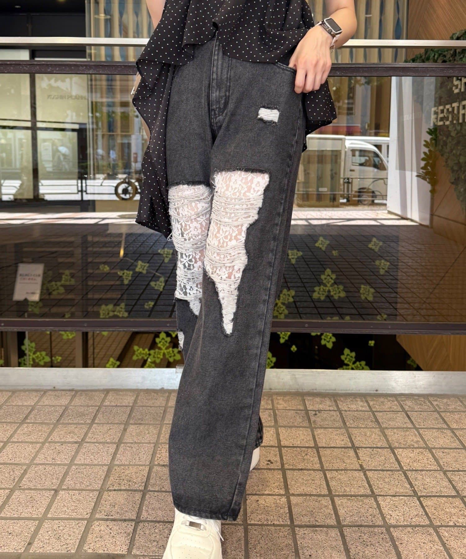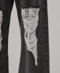 ・大胆なクラッシュ加工に繊細なレースをあしらった、甘辛MIXデニム