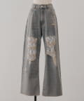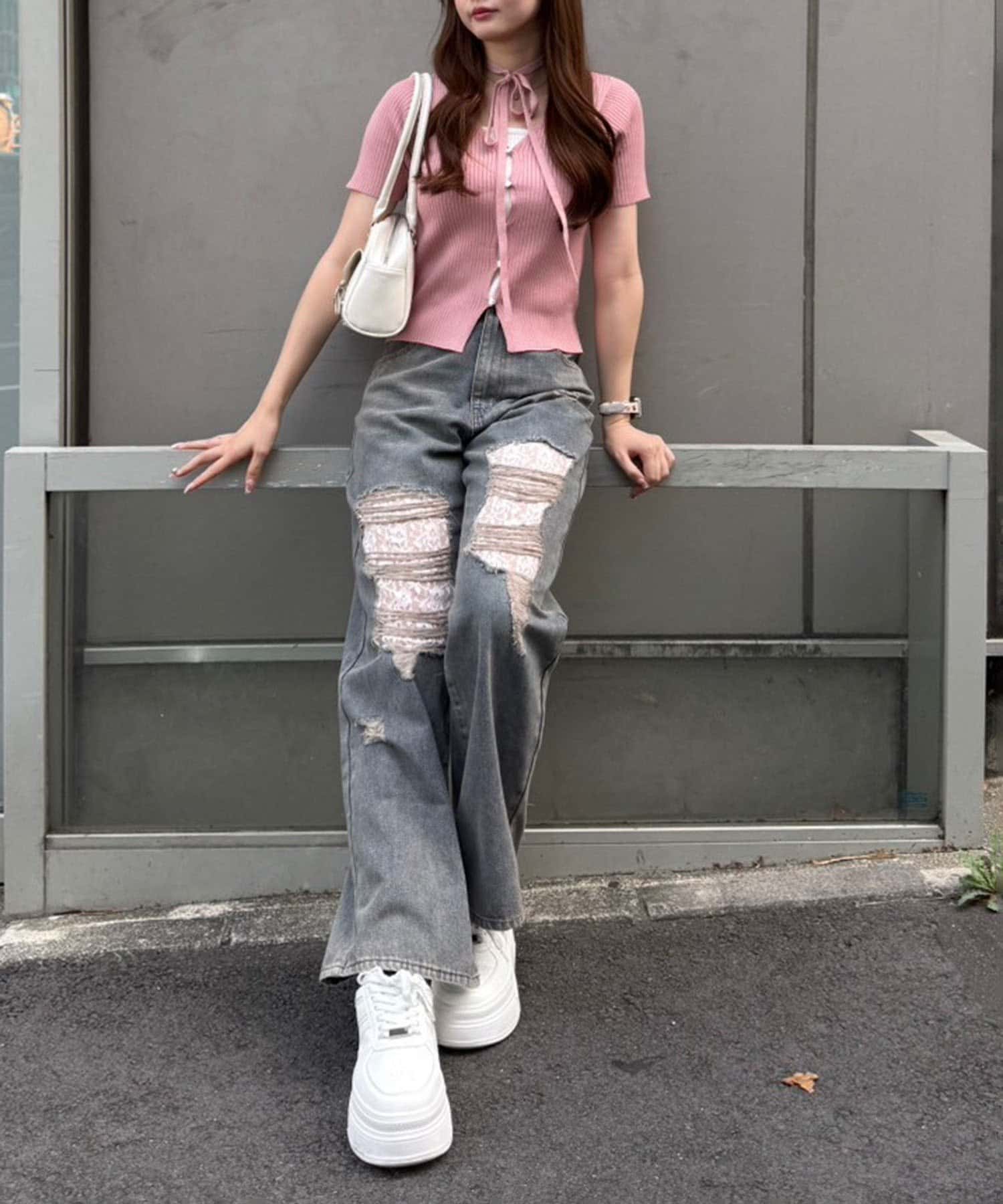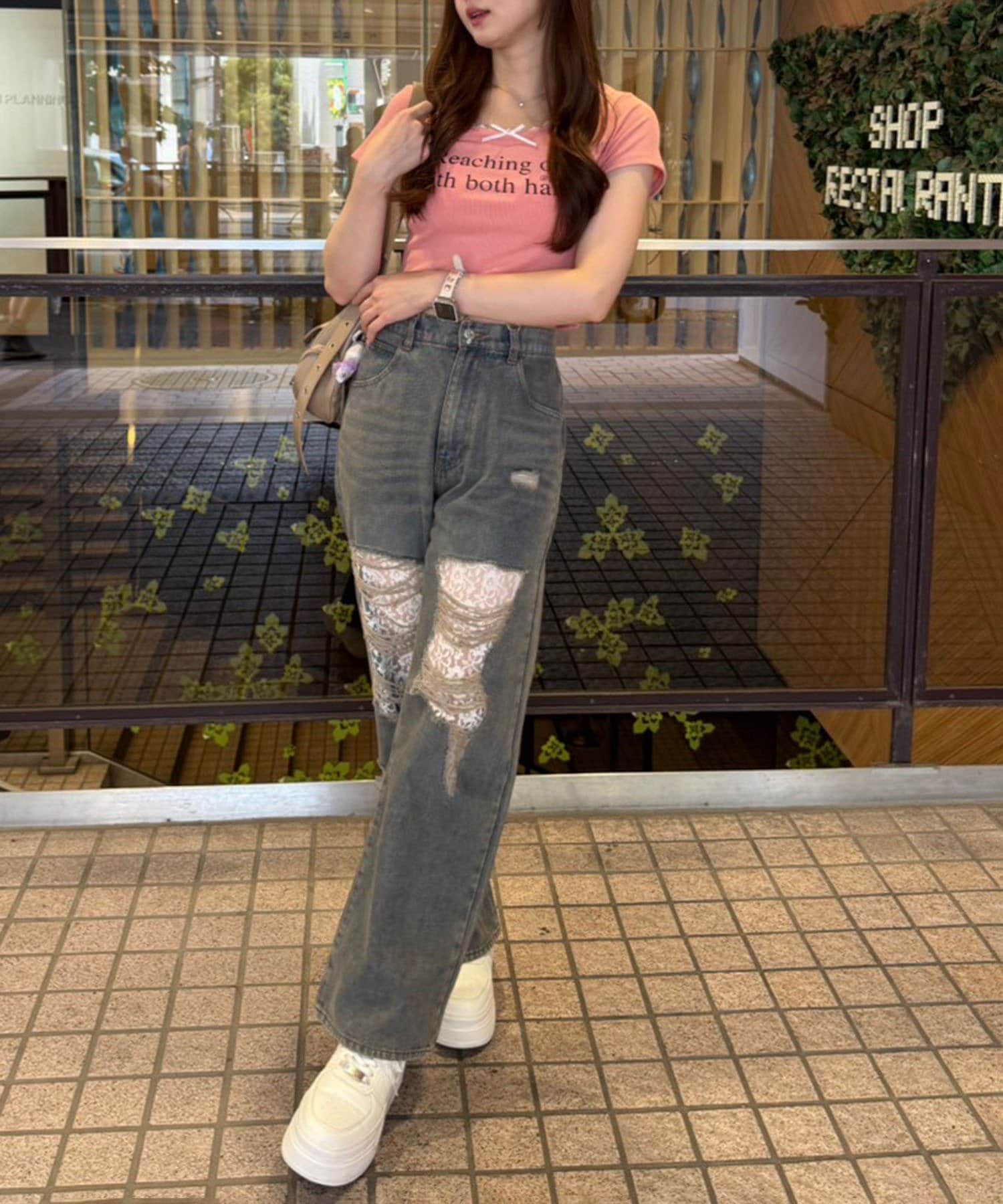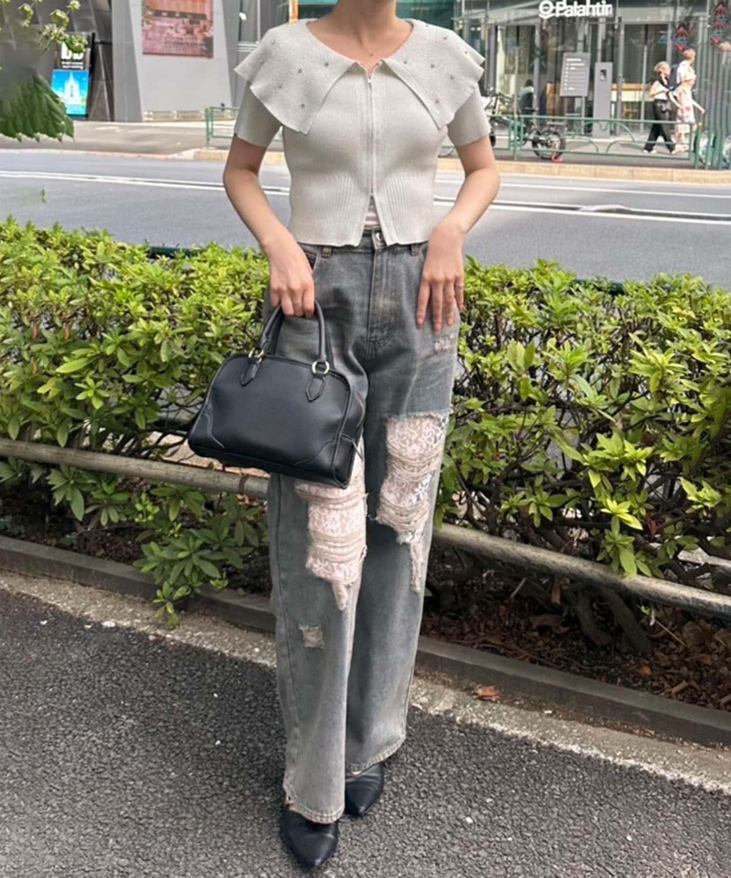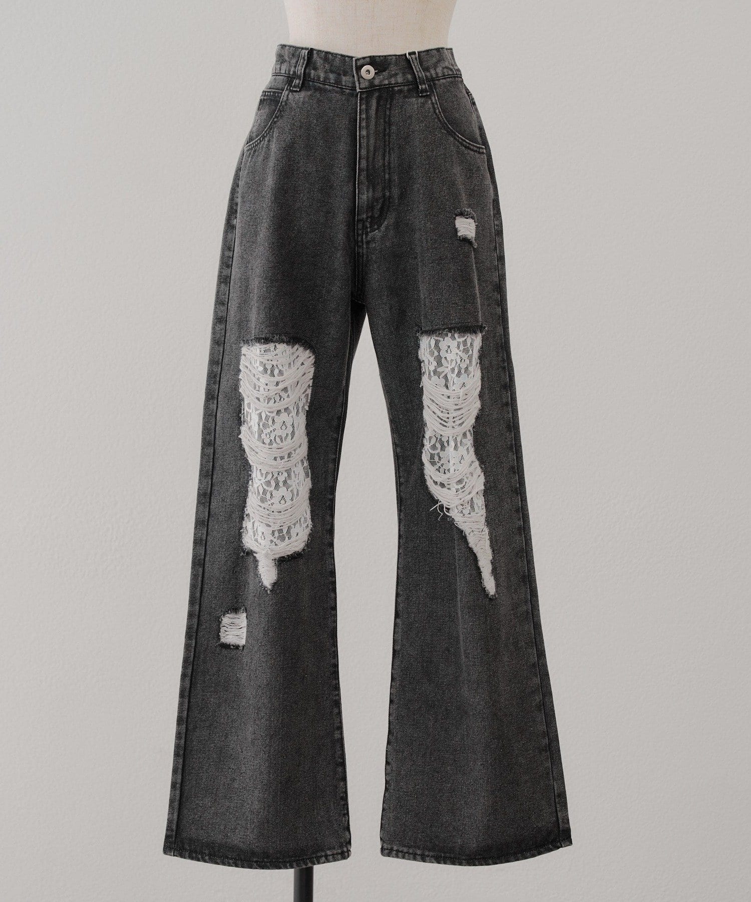 ・大胆なクラッシュ加工に繊細なレースをあしらった、甘辛MIXデニム