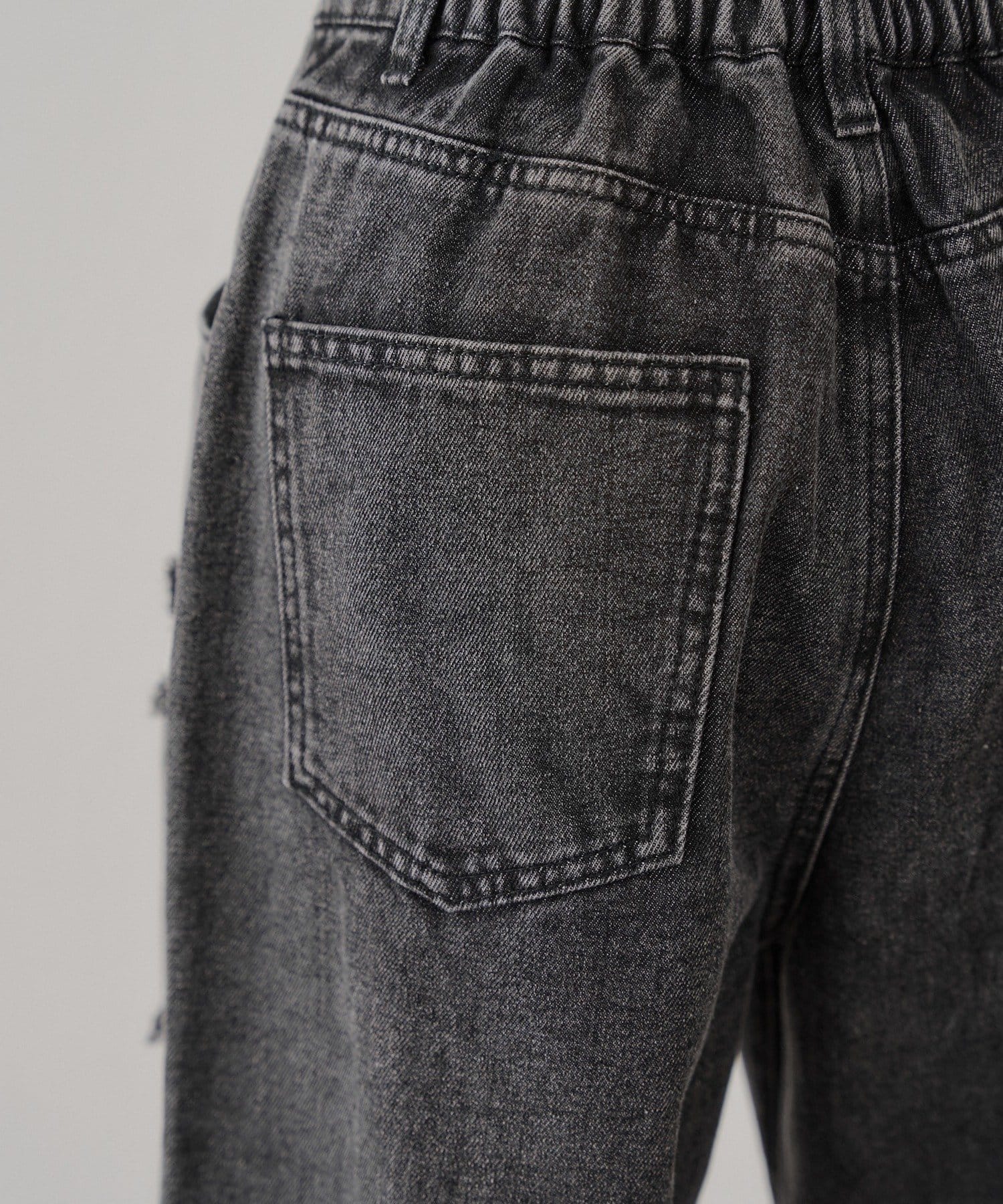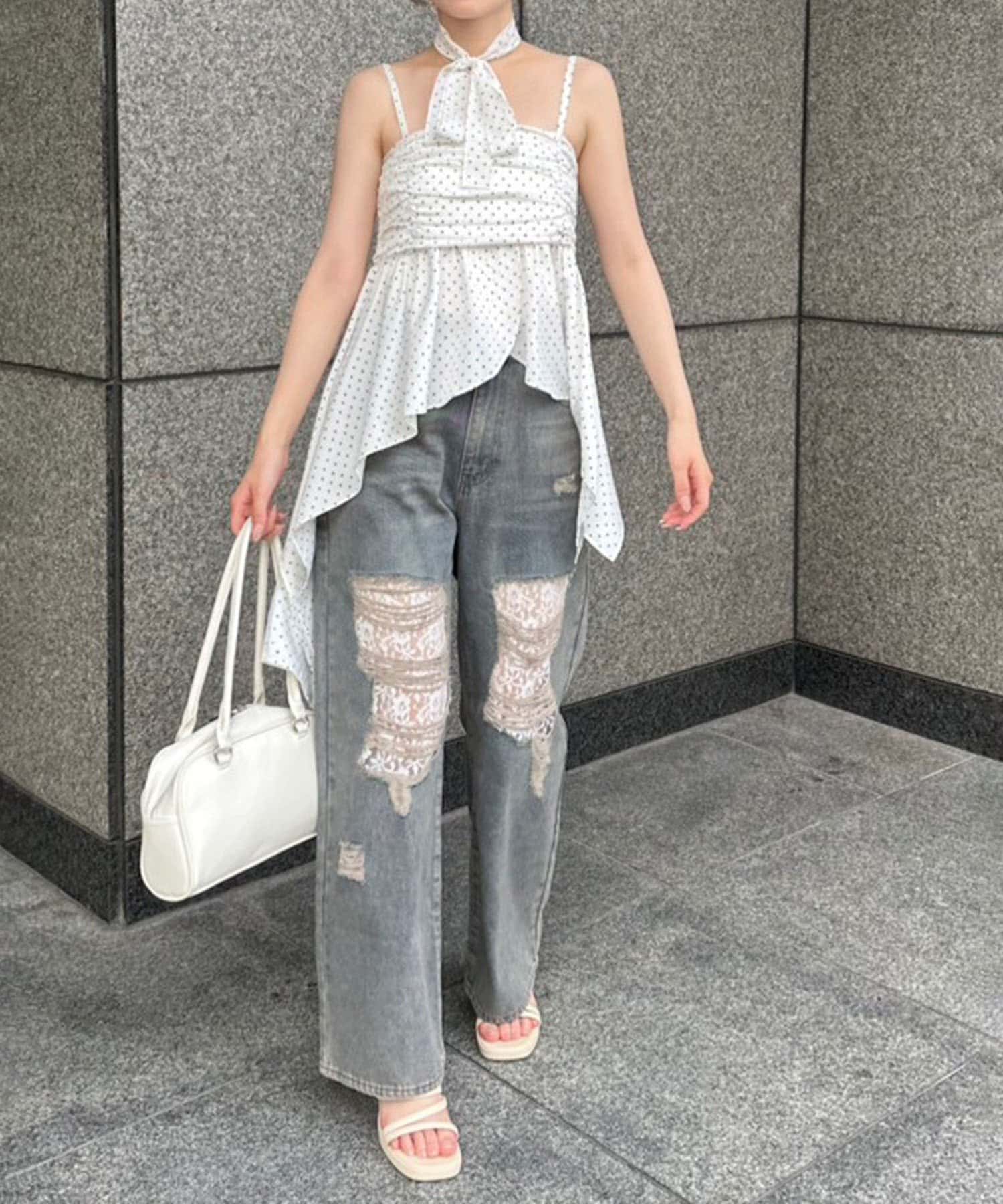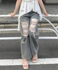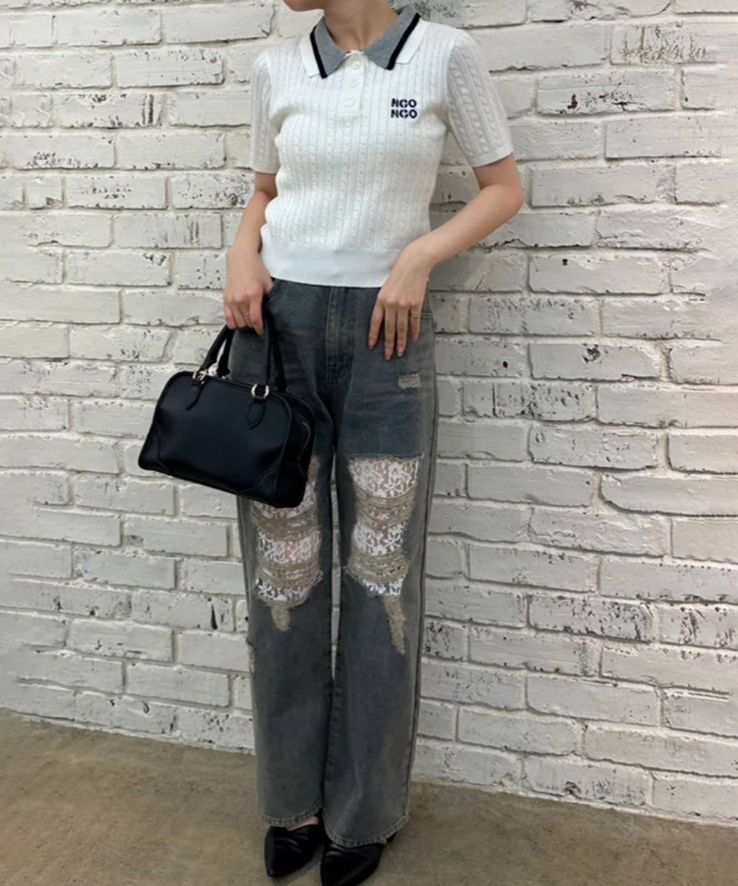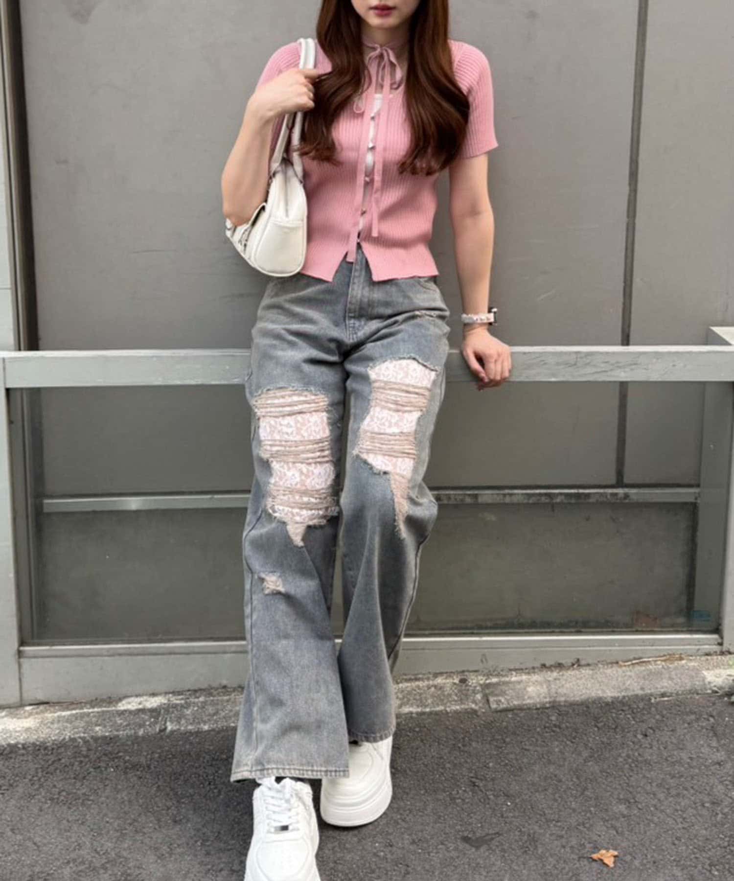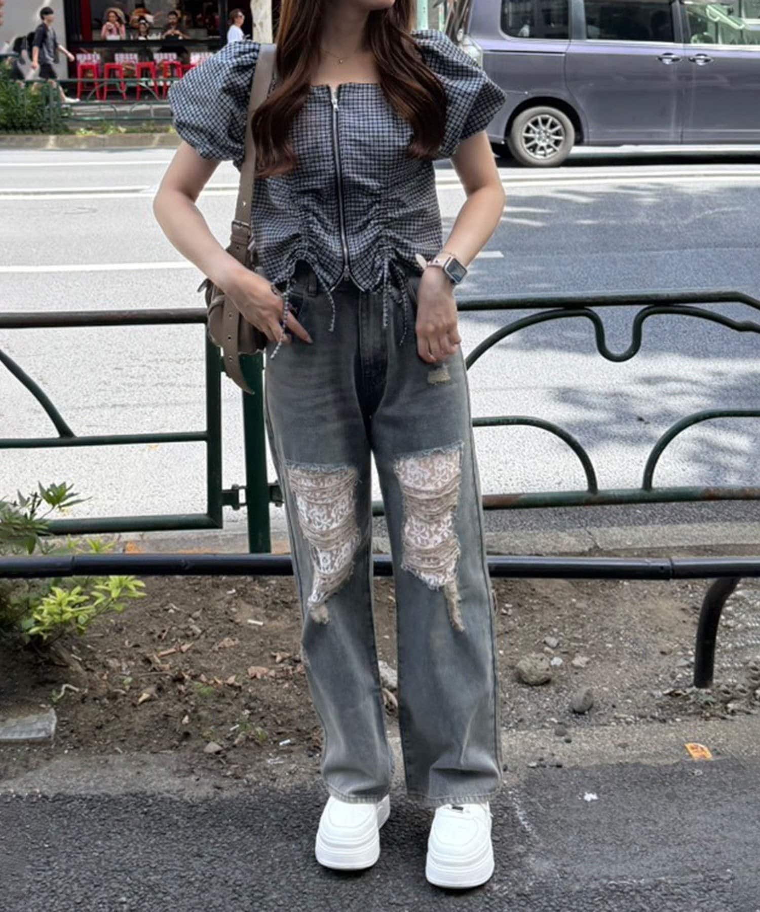 ・大胆なクラッシュ加工に繊細なレースをあしらった、甘辛MIXデニム