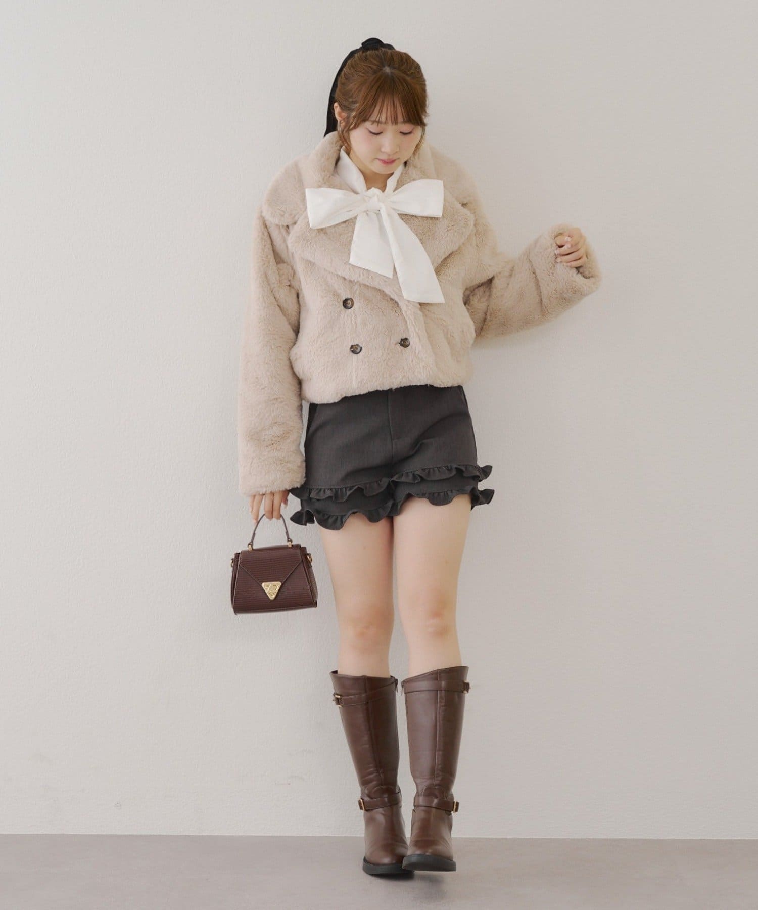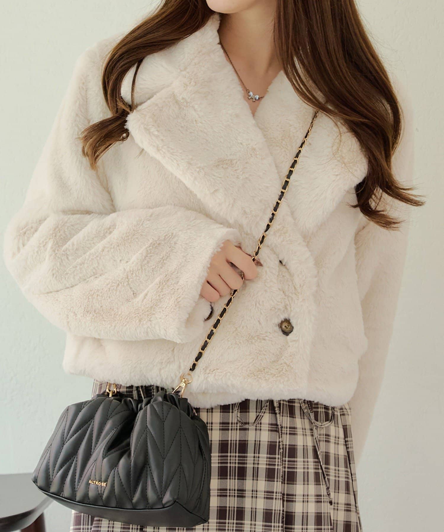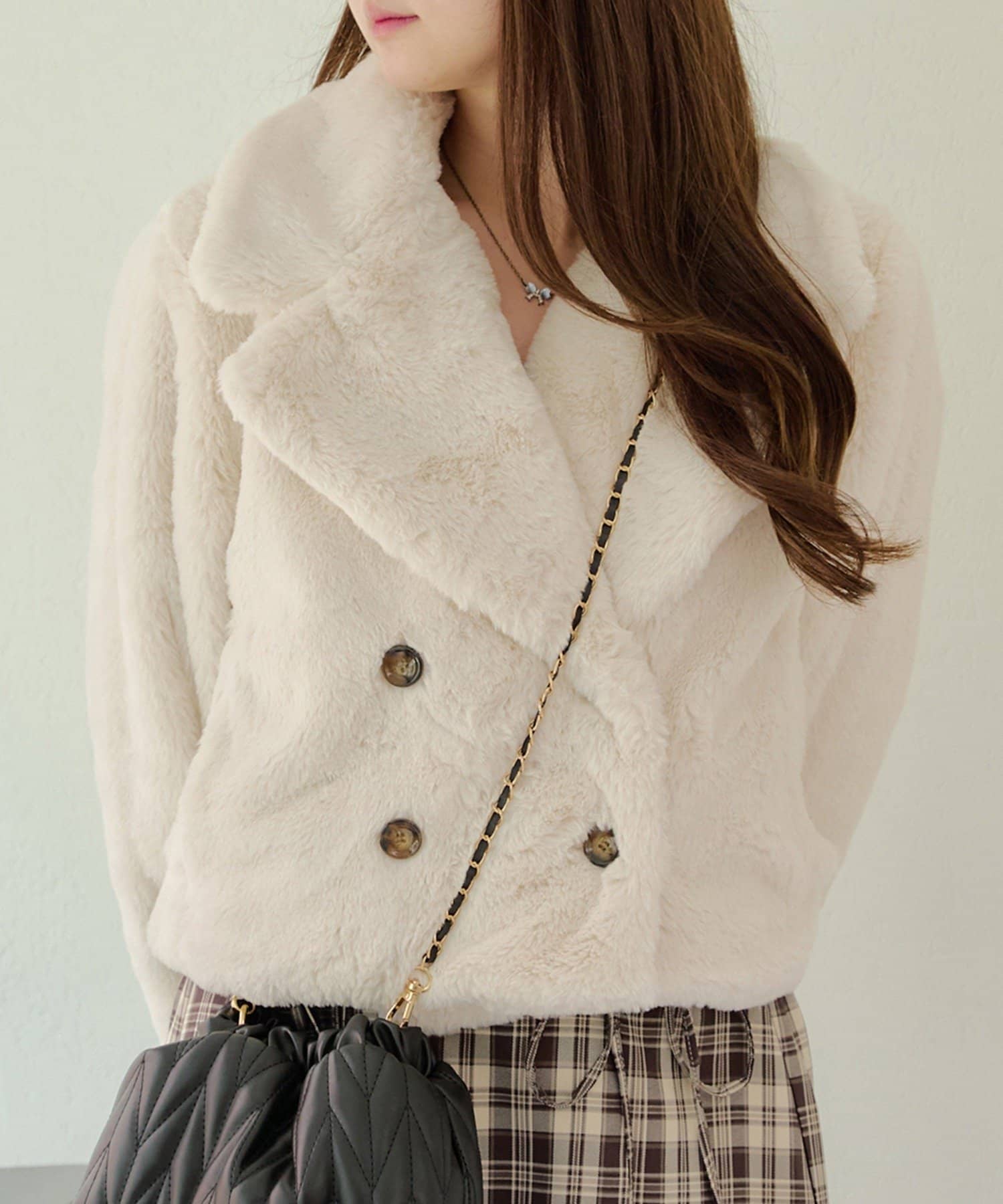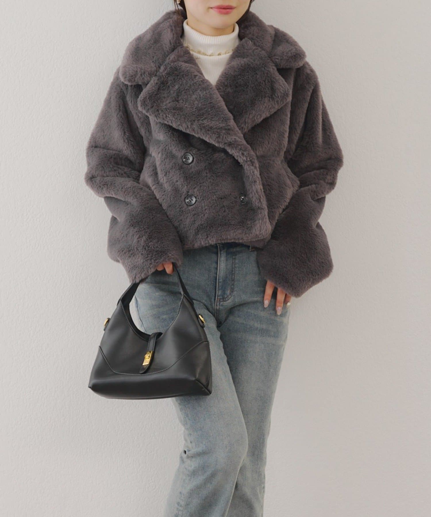 ダブルボタンで大人っぽく、ファーが女性らしさも際立ててくれるアイテムです。
