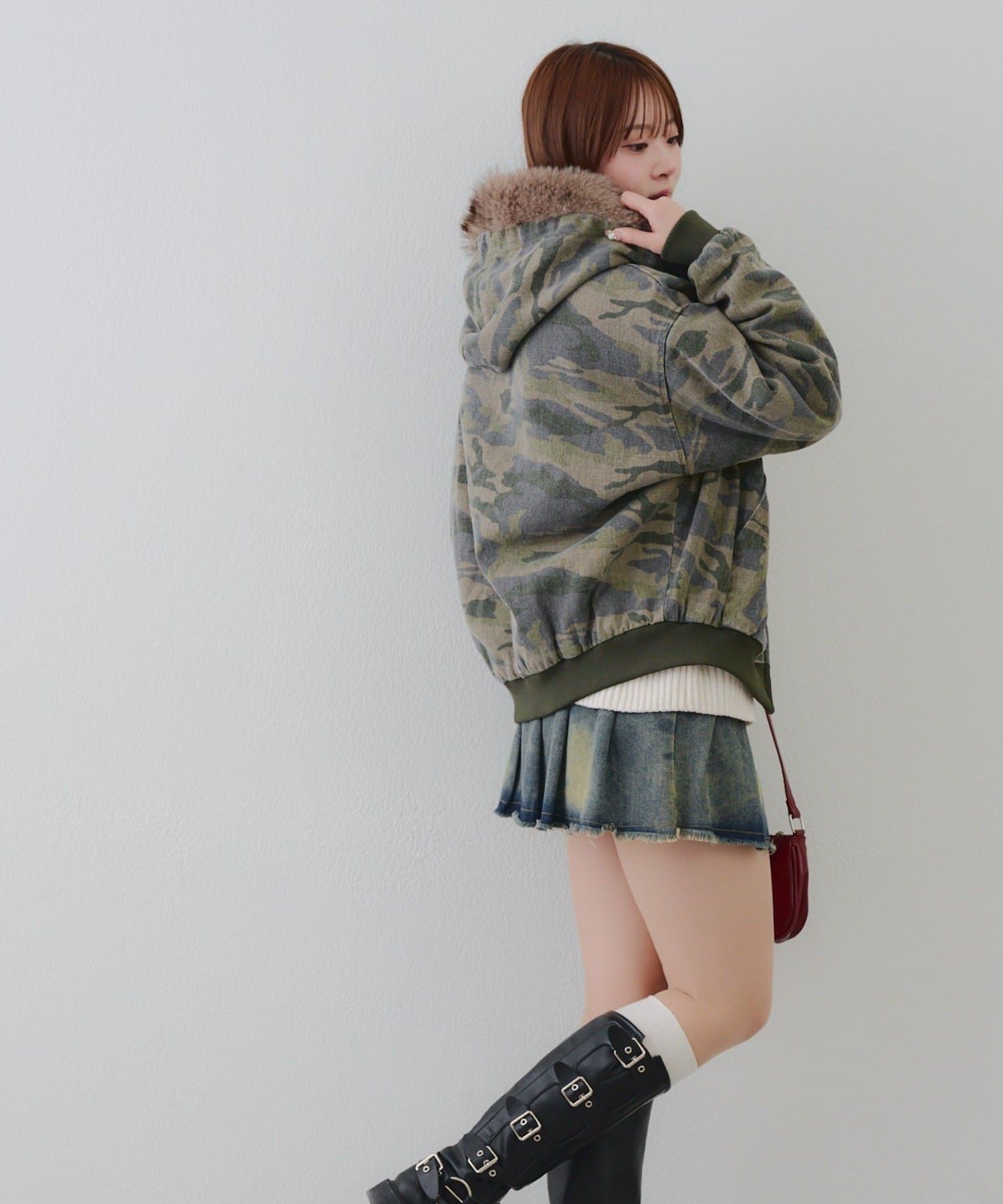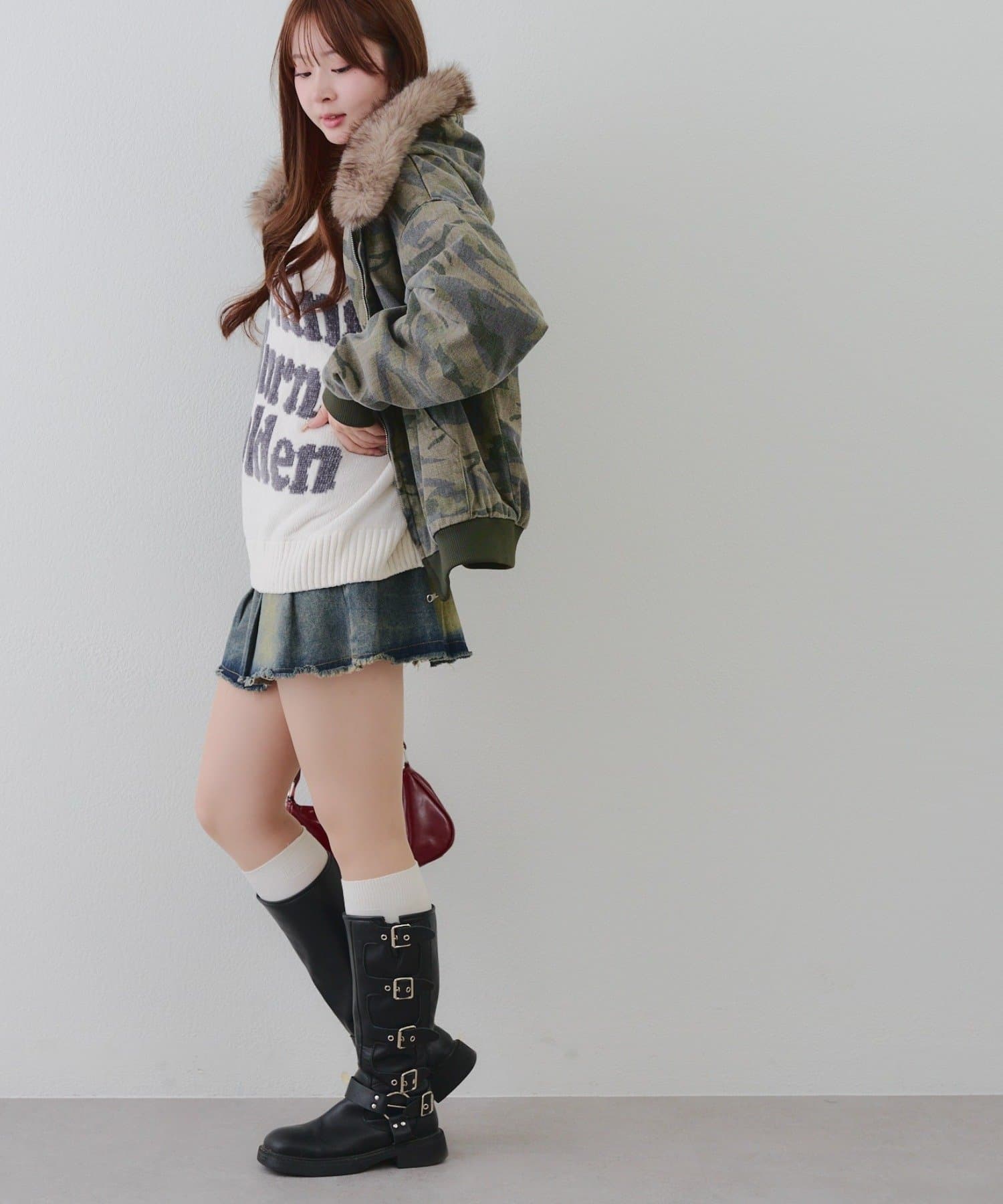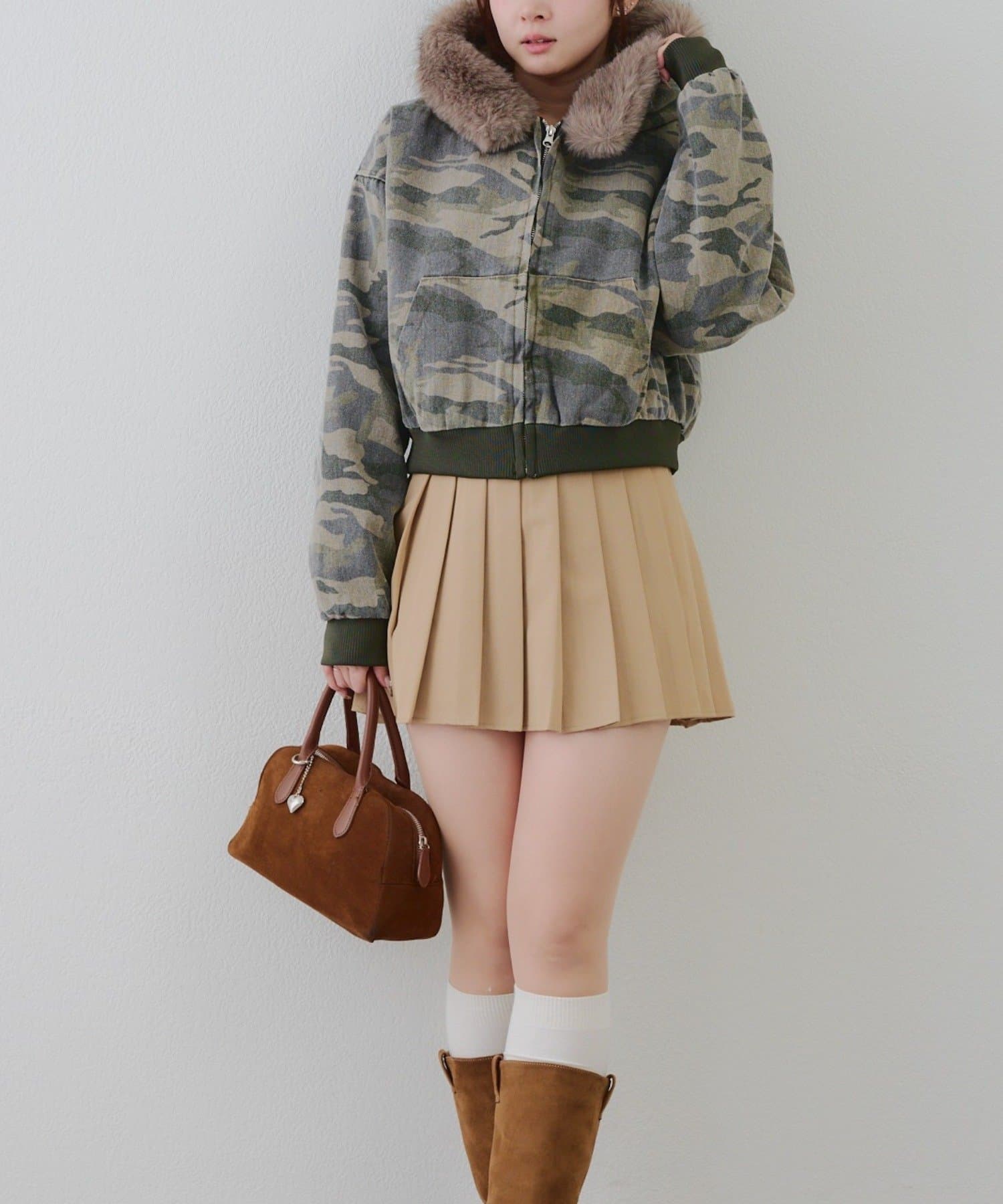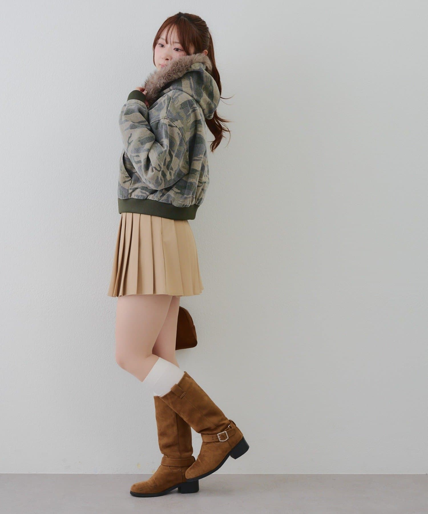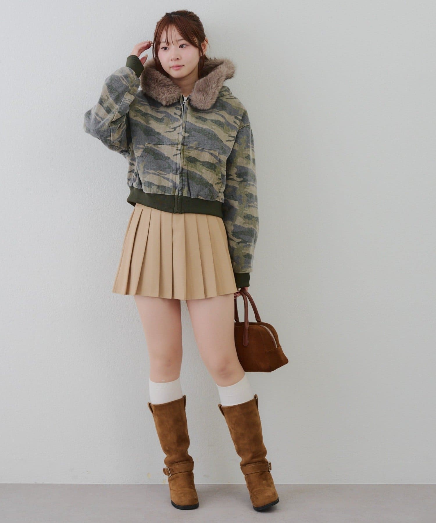 ・プリーツミニスカートにロングブーツ合わせでカジュアルガーリーな着こなし
