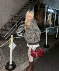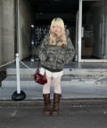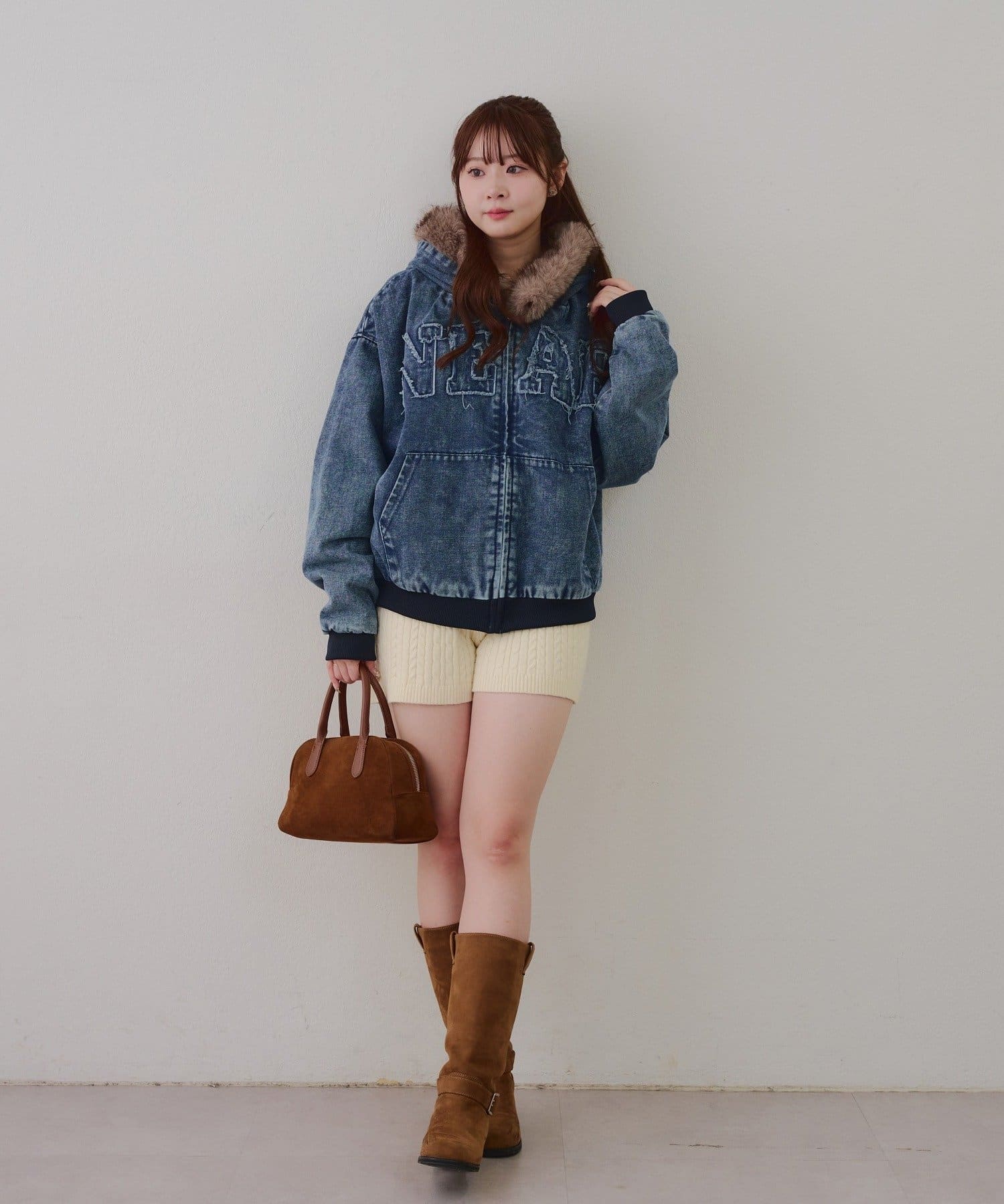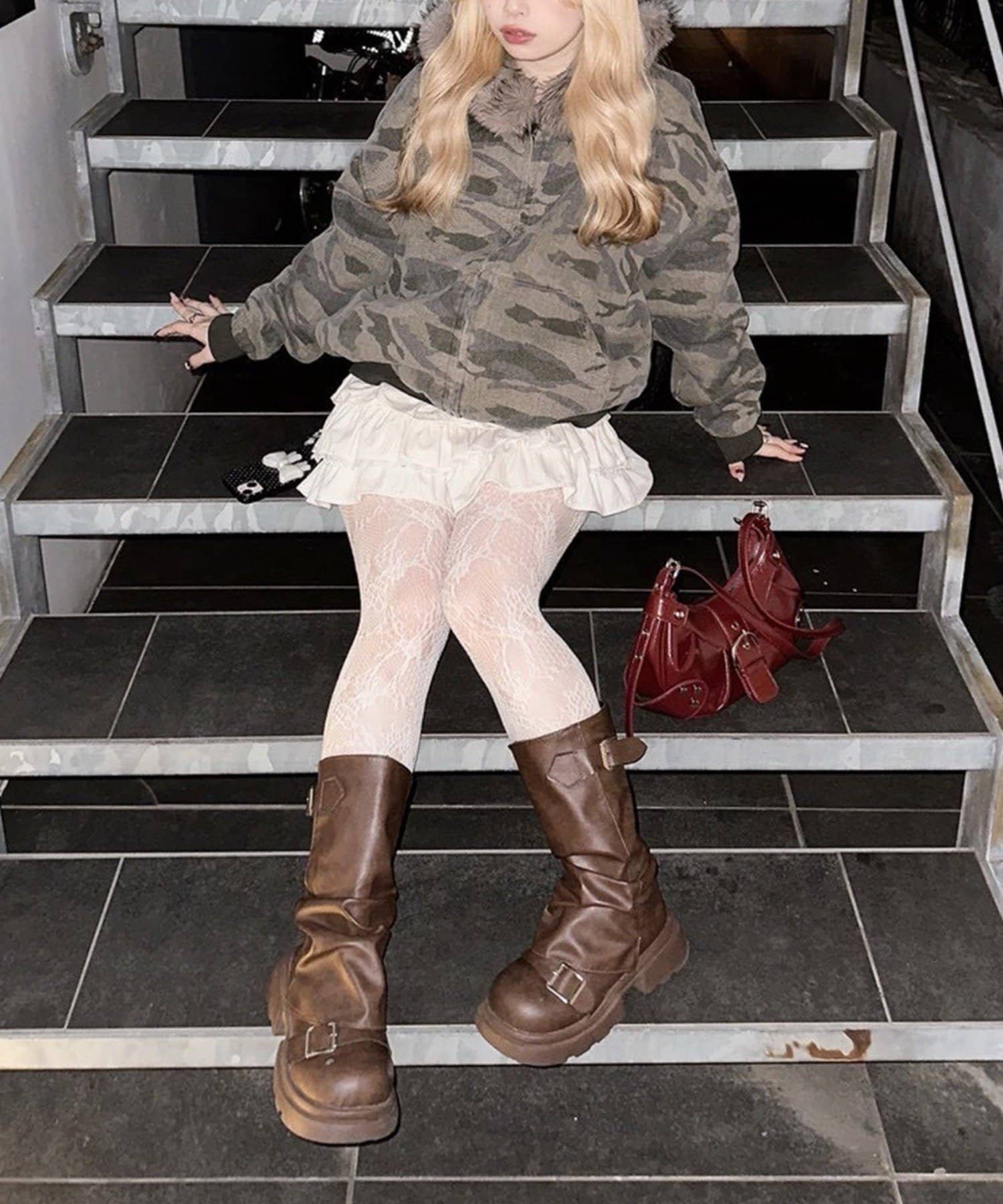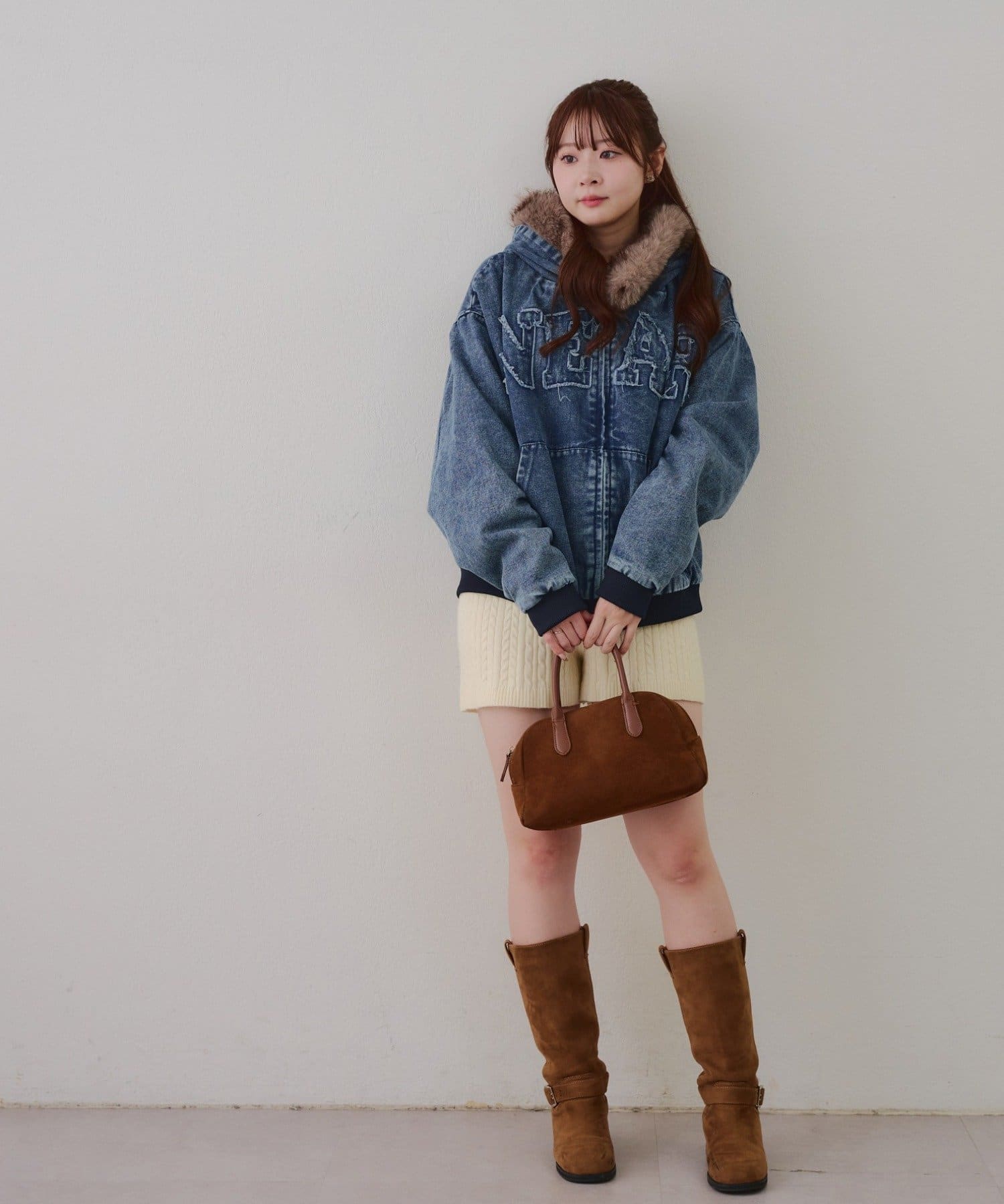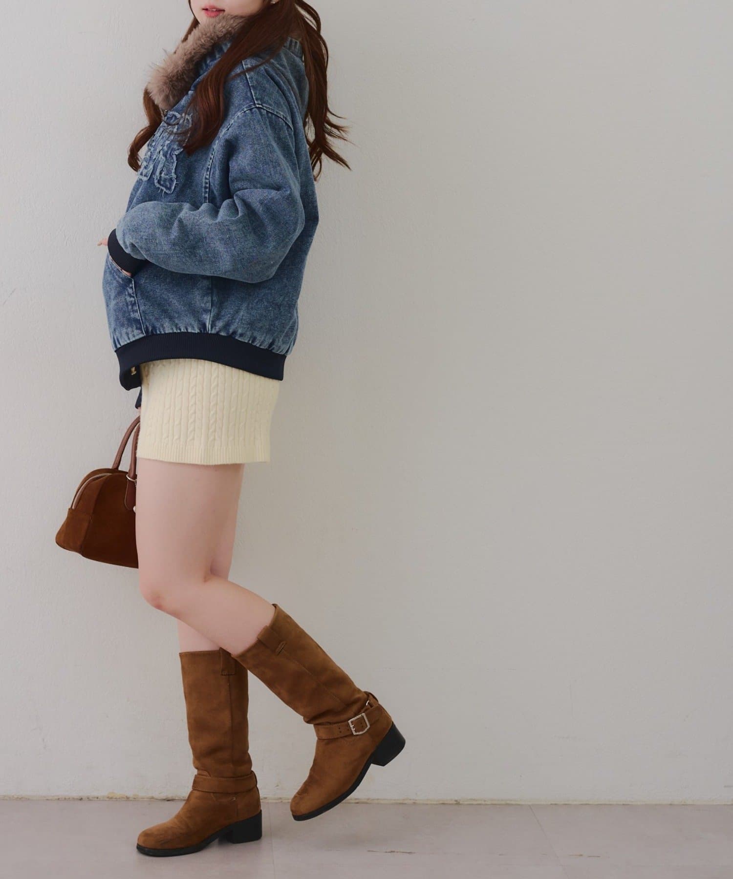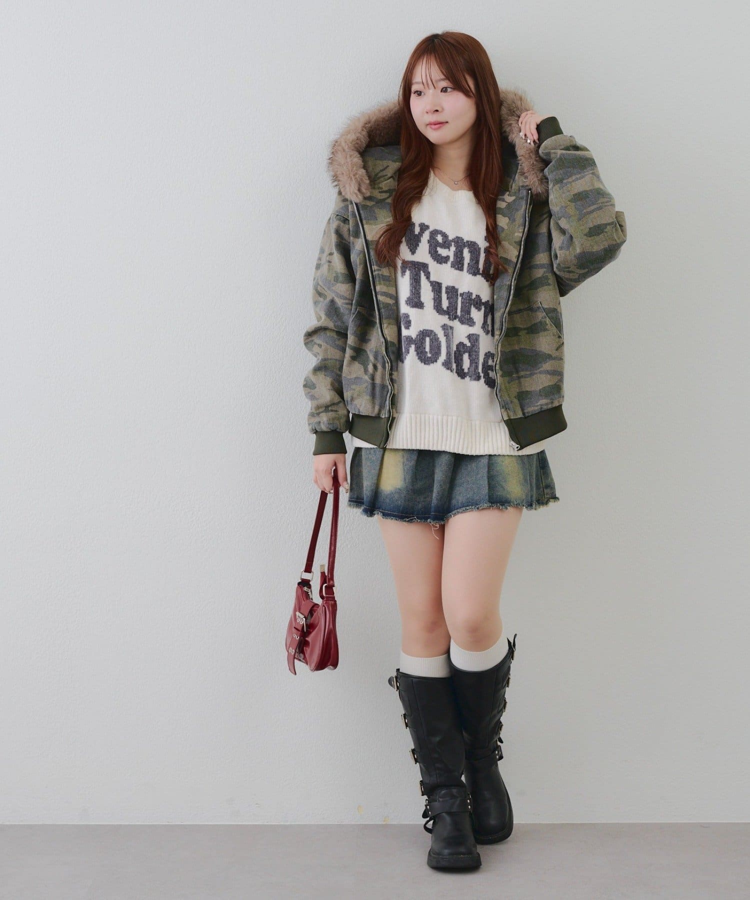 ・プリーツミニスカートにロングブーツ合わせでカジュアルガーリーな着こなし