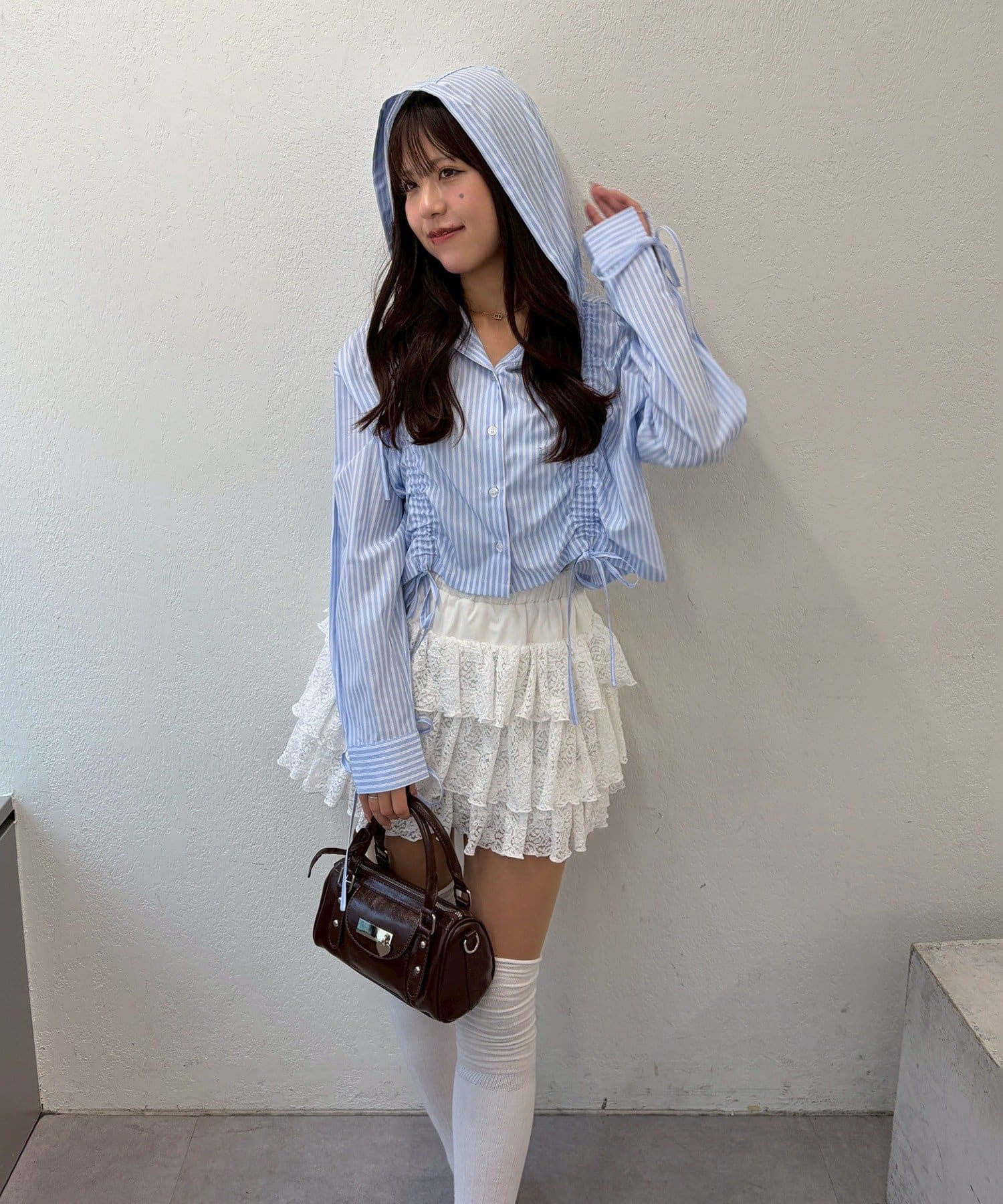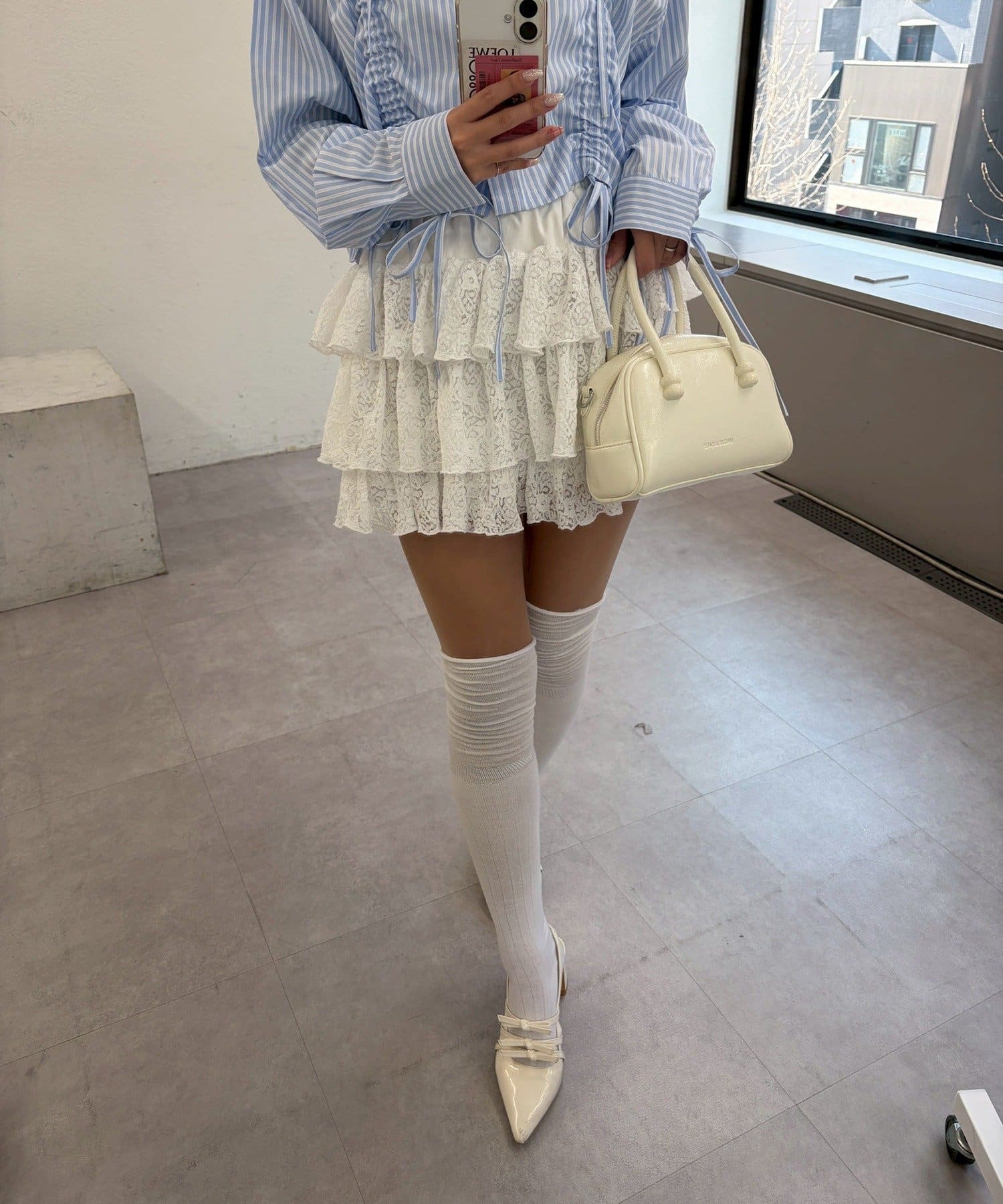 ・白のレーススカート + パステルカラーのニット + スニーカーでカジュアルガーリーな着こなし