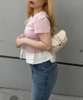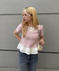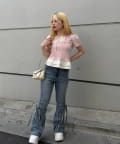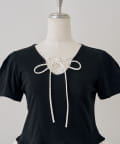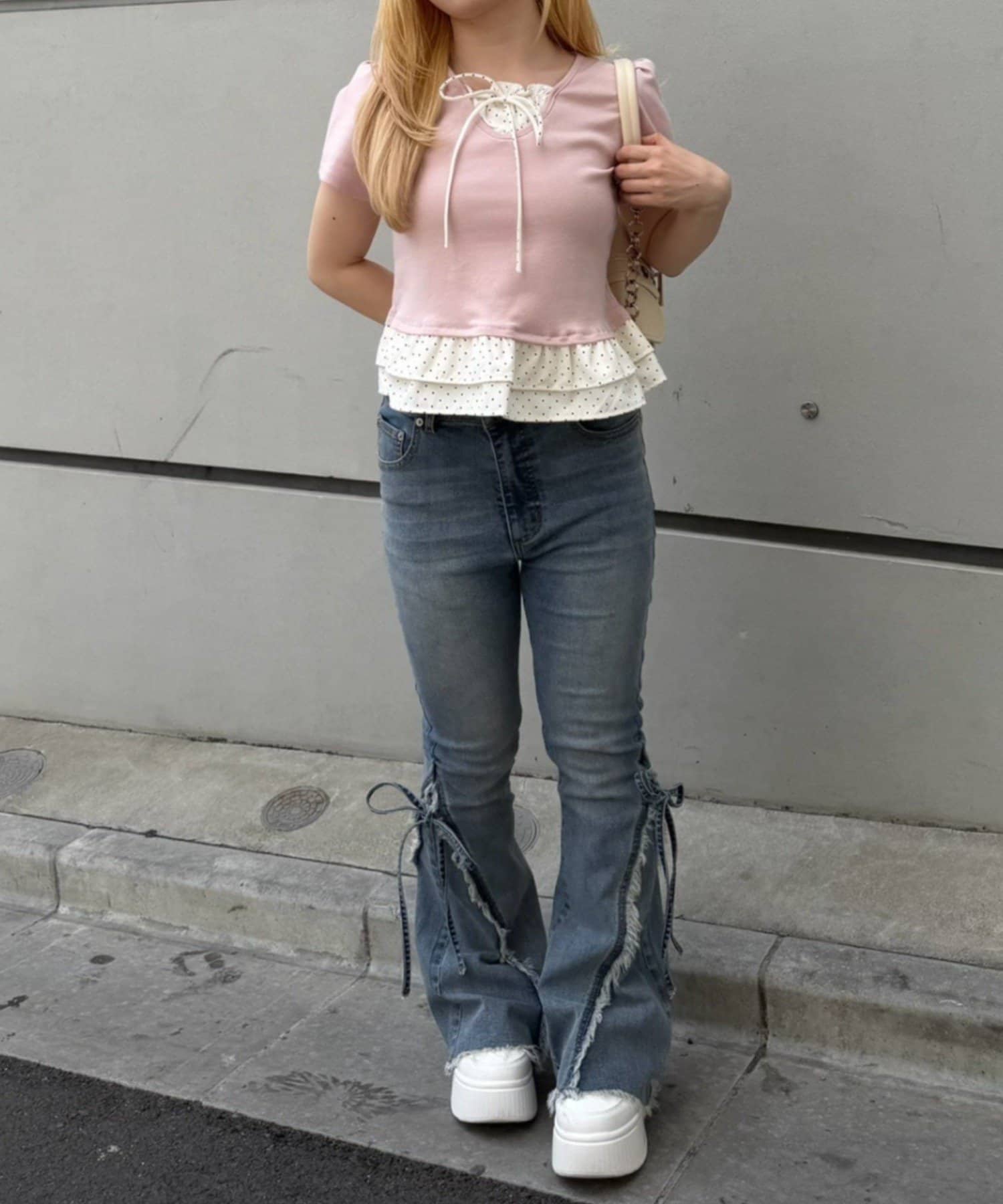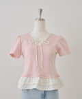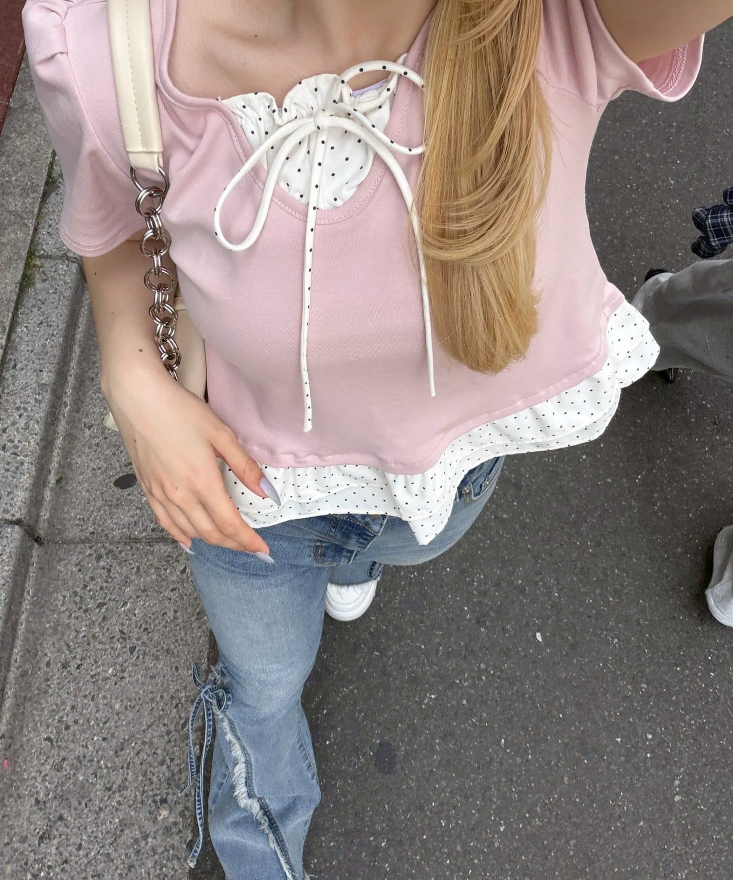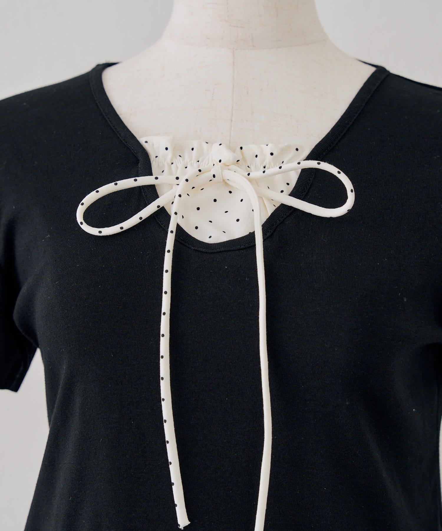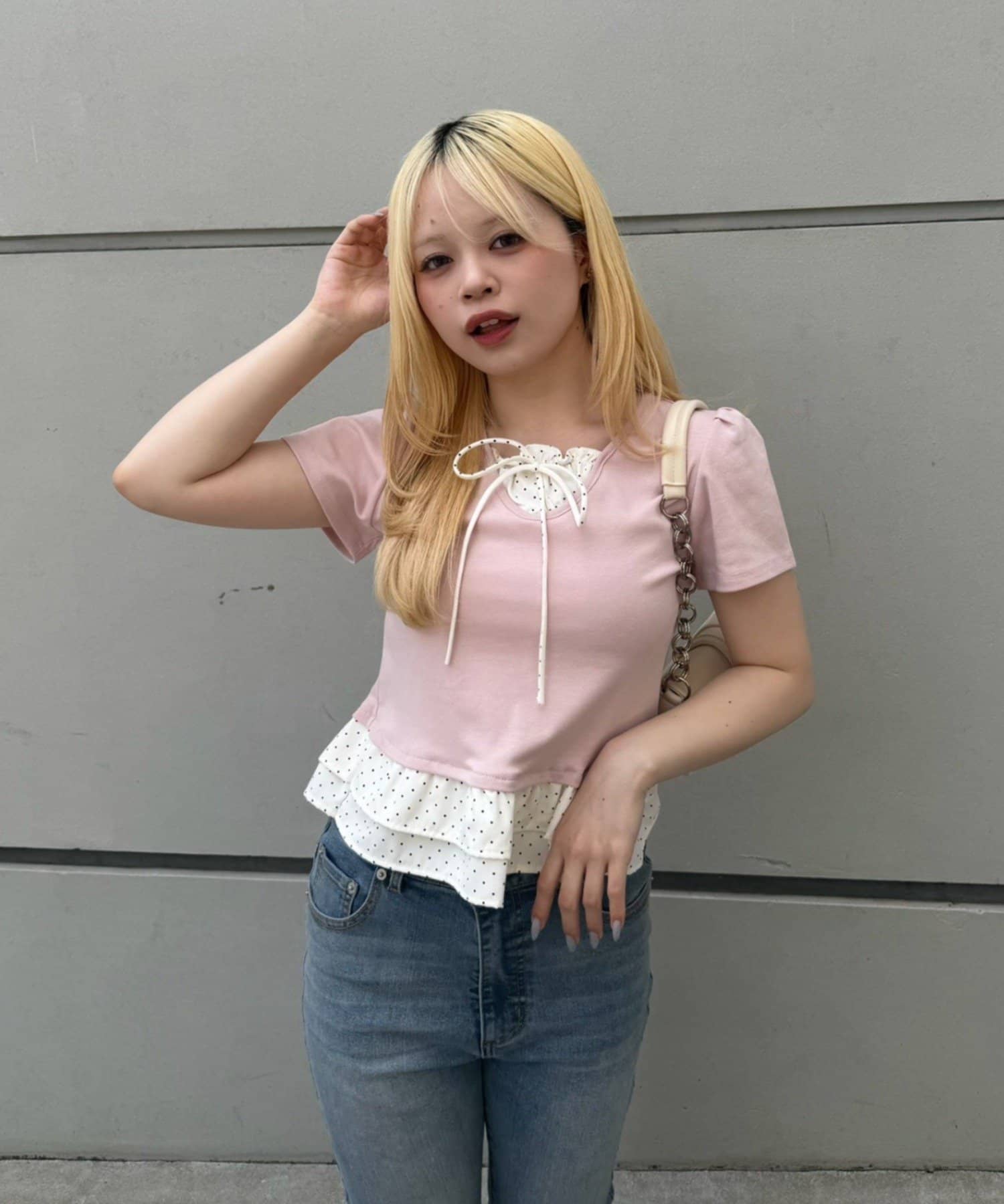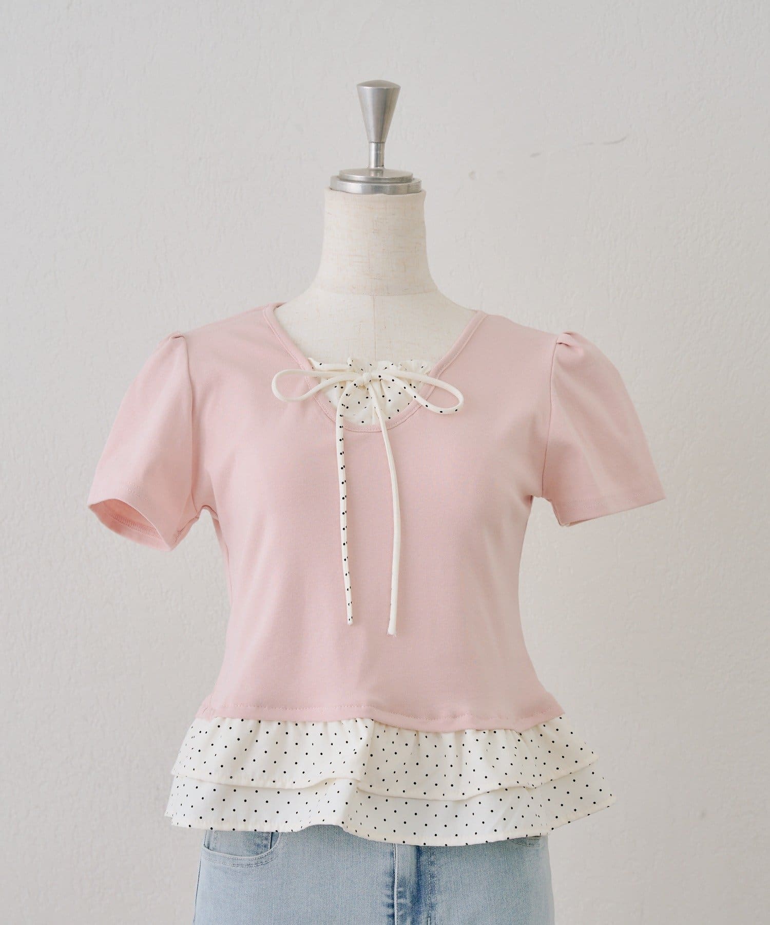 ・胸元のリボンと裾のドット柄フリルがガーリーな雰囲気のトップス