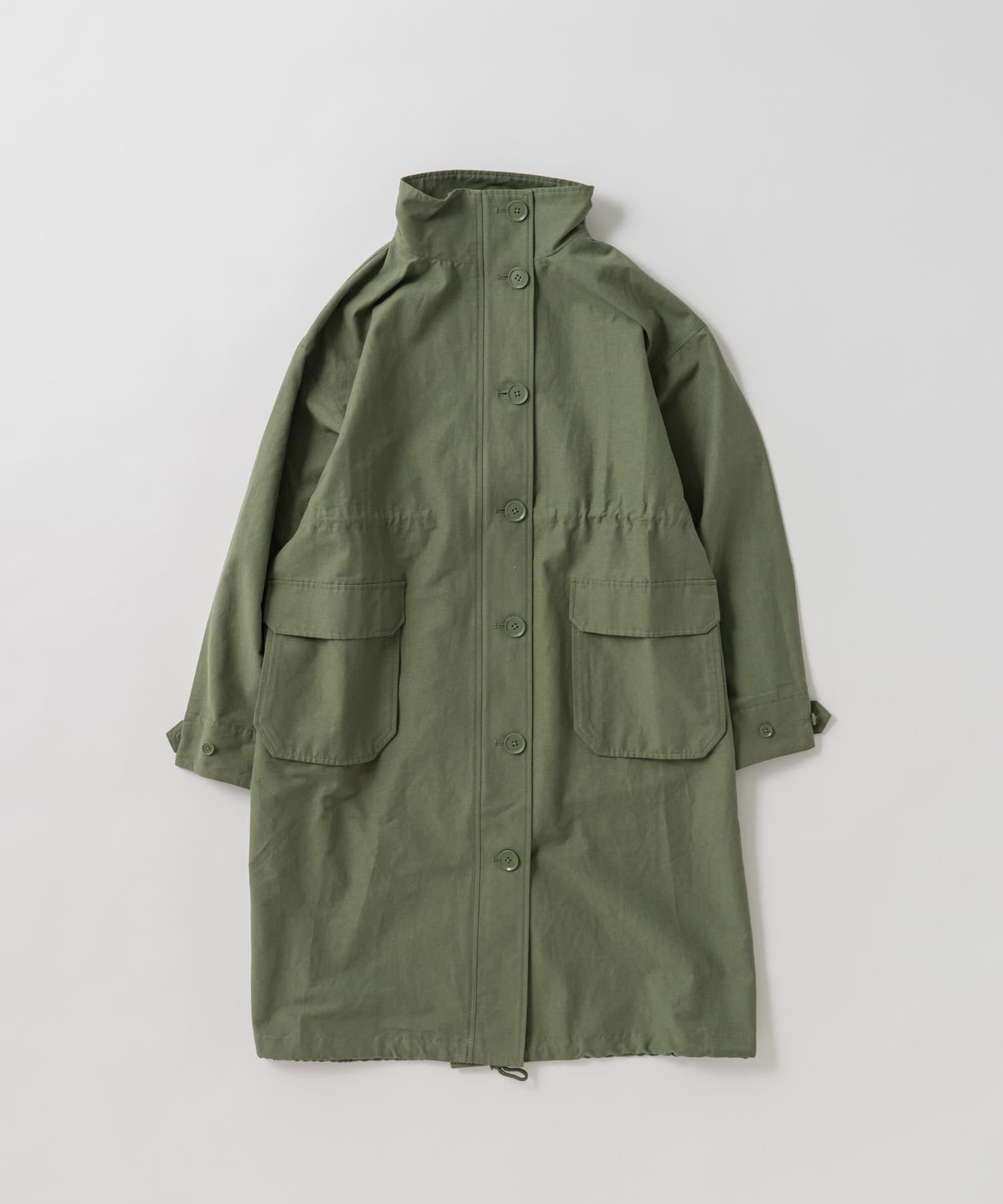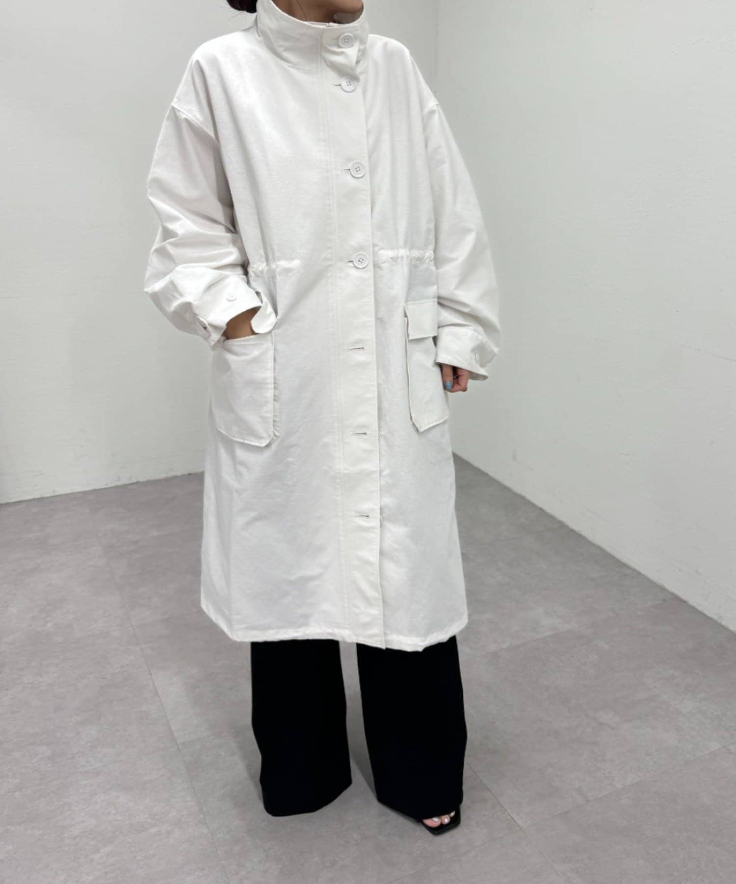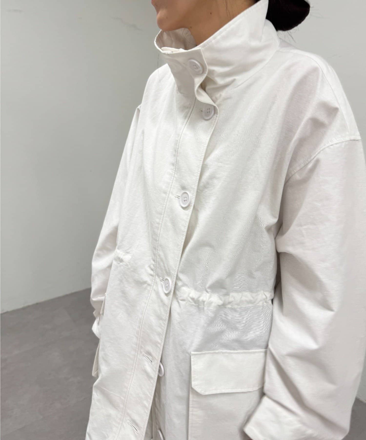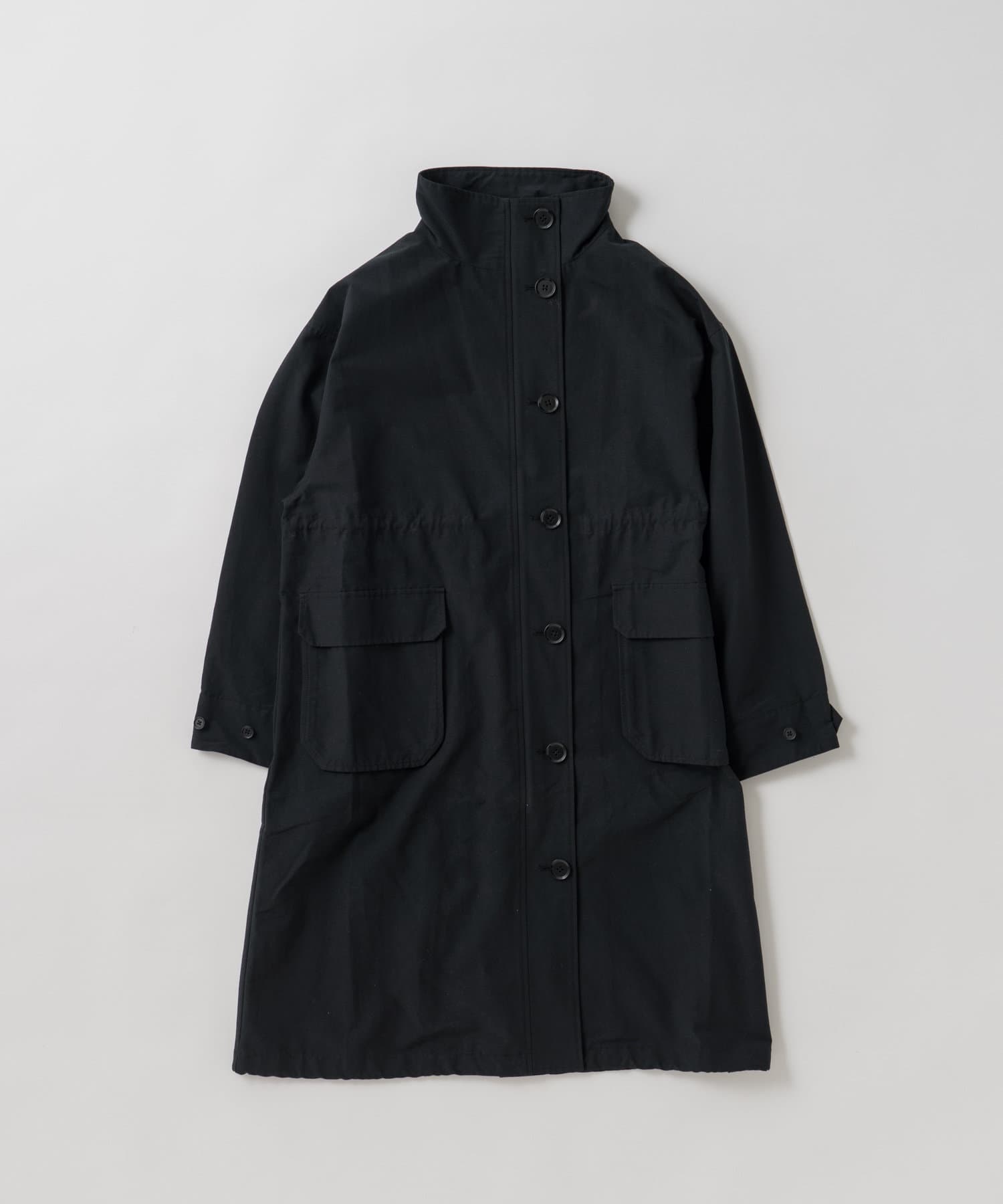 ・ミリタリー要素のディテールが加わったスタンドカラーコート。