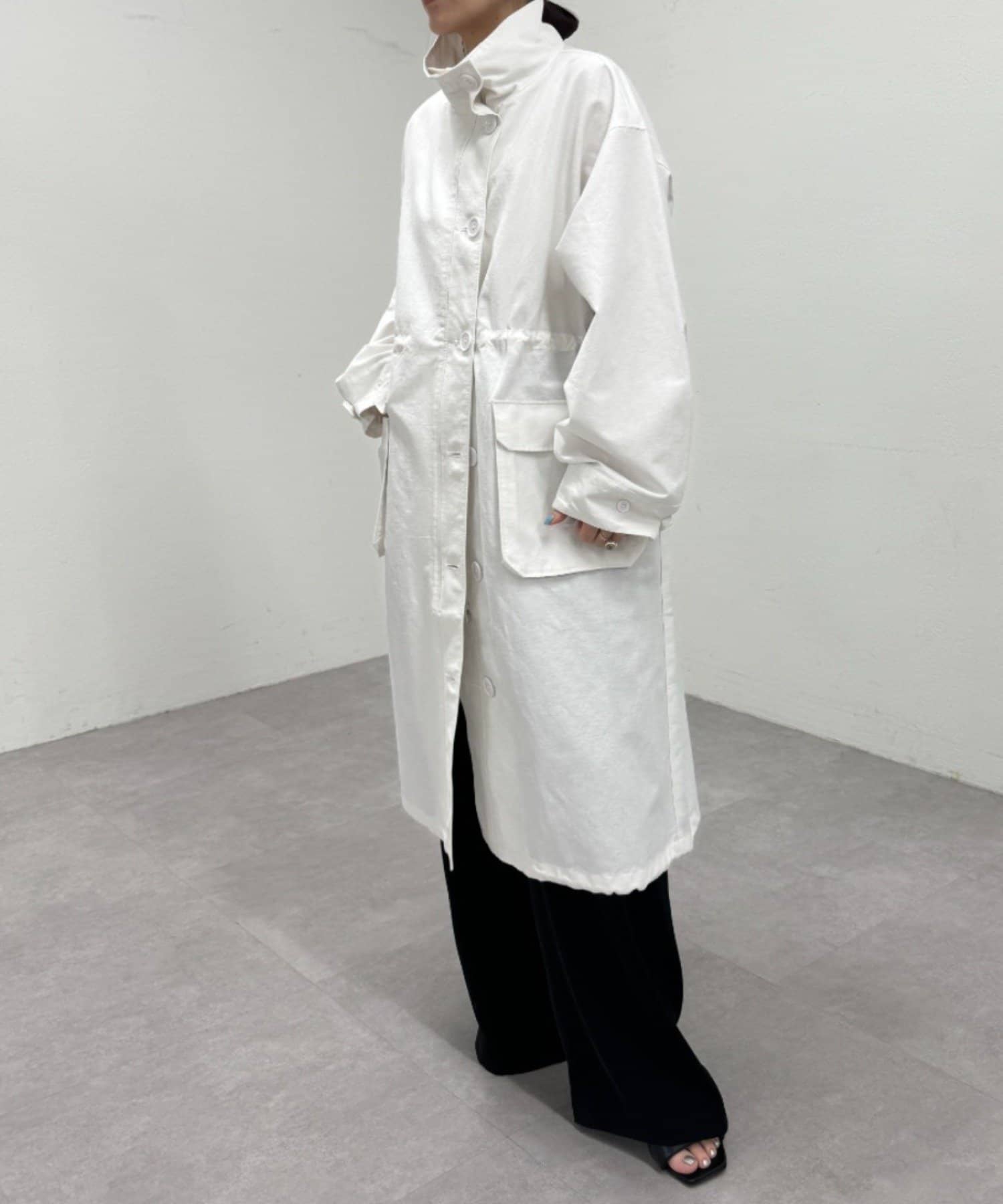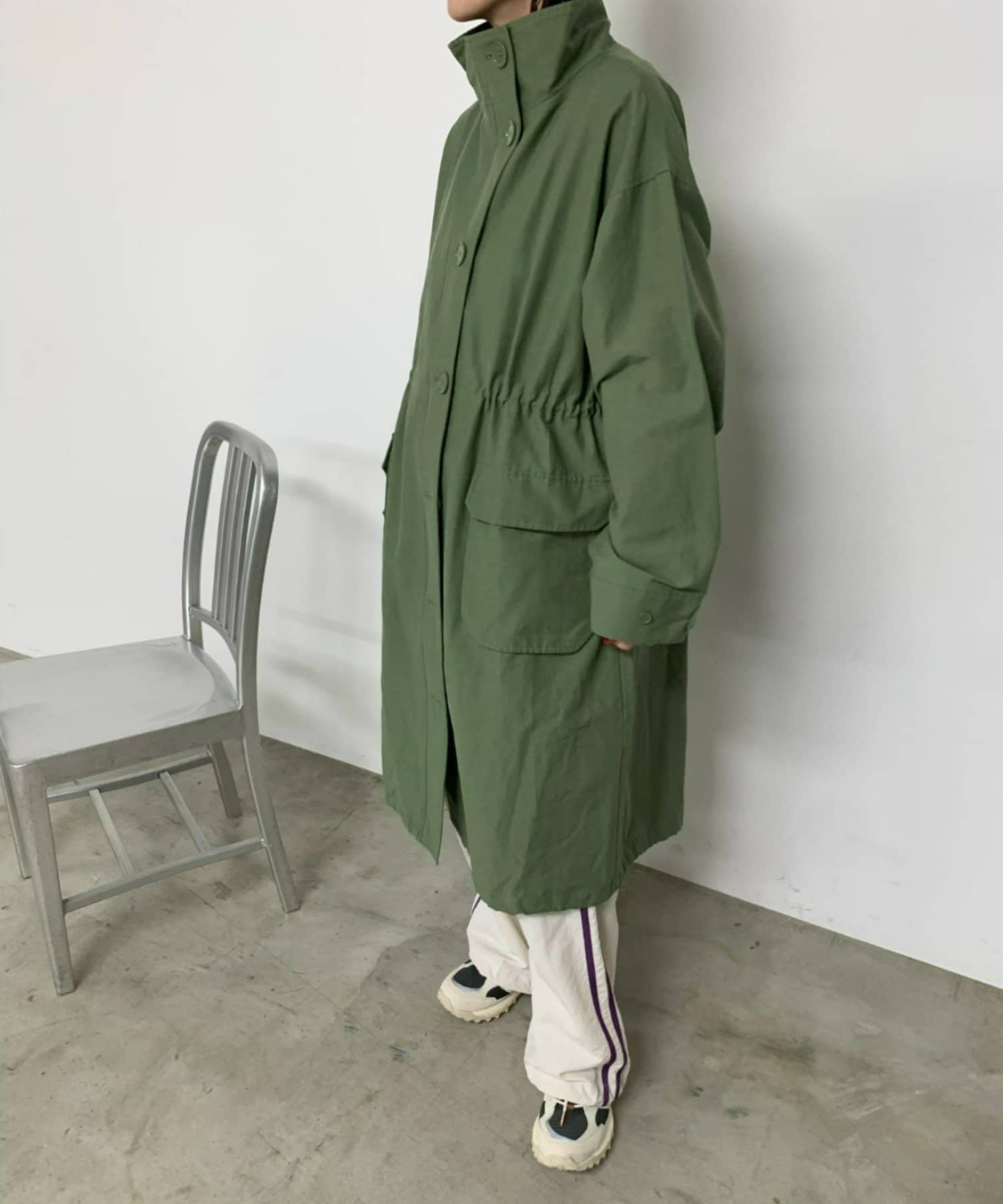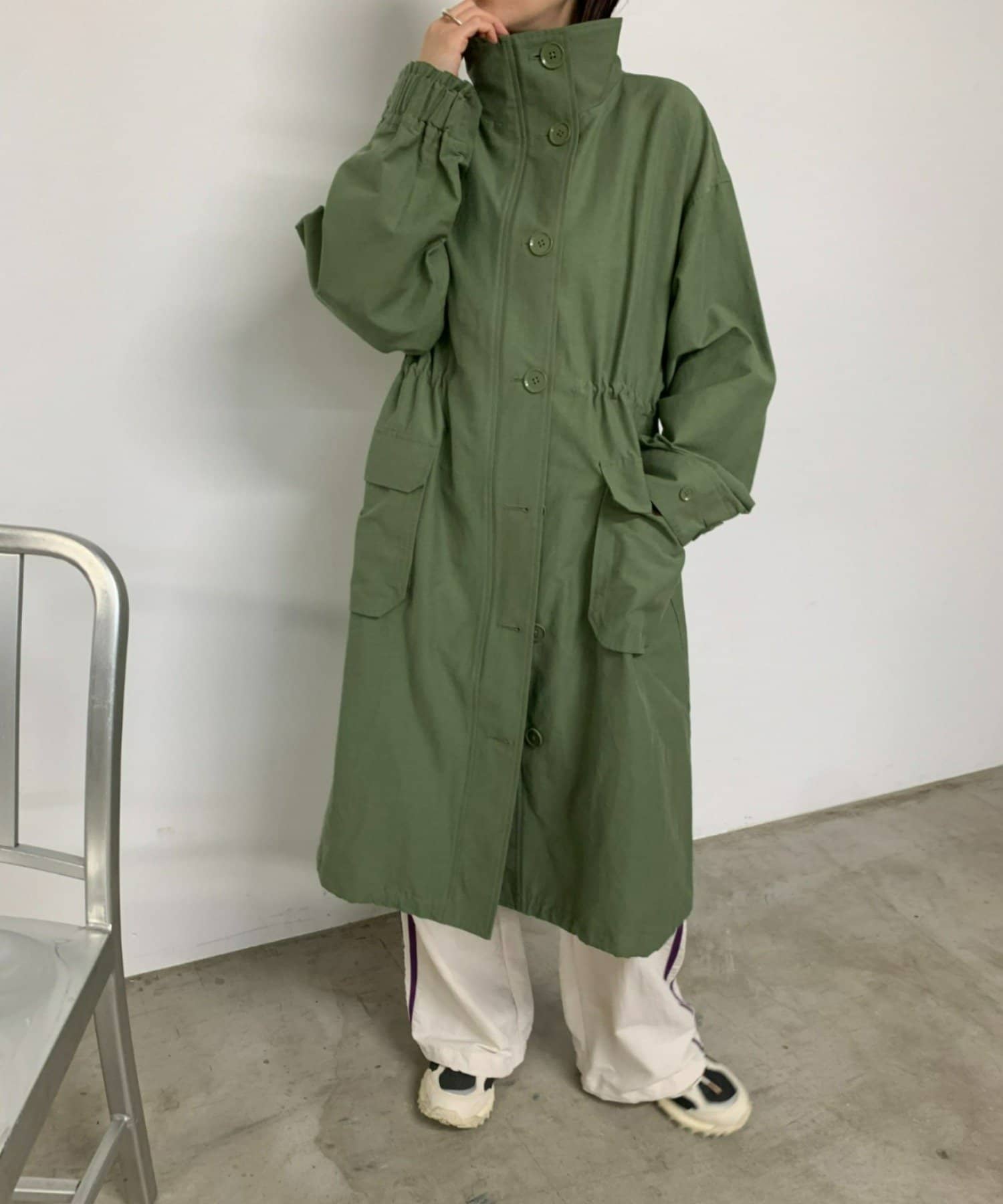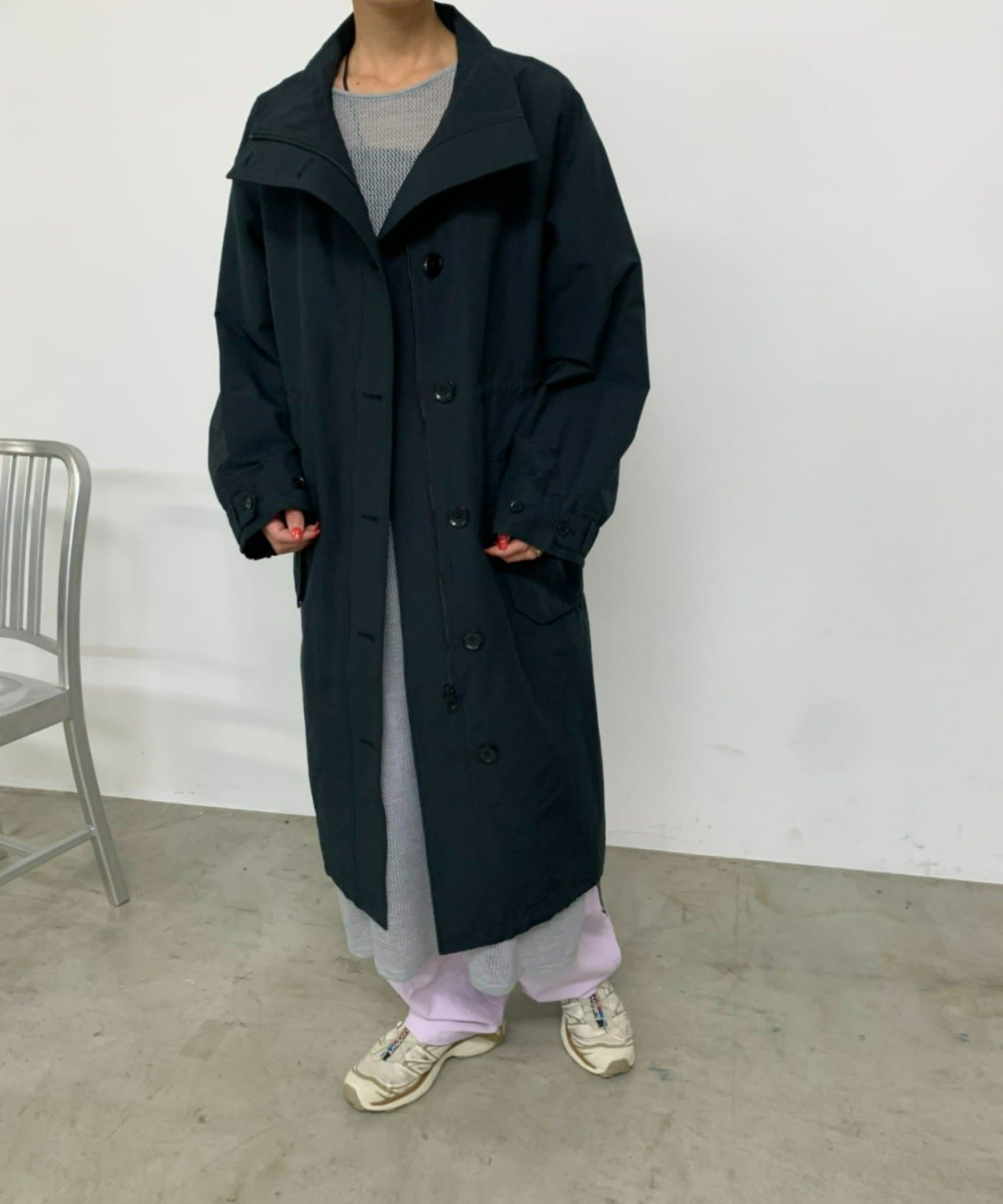 ・ミリタリー要素のディテールが加わったスタンドカラーコート。