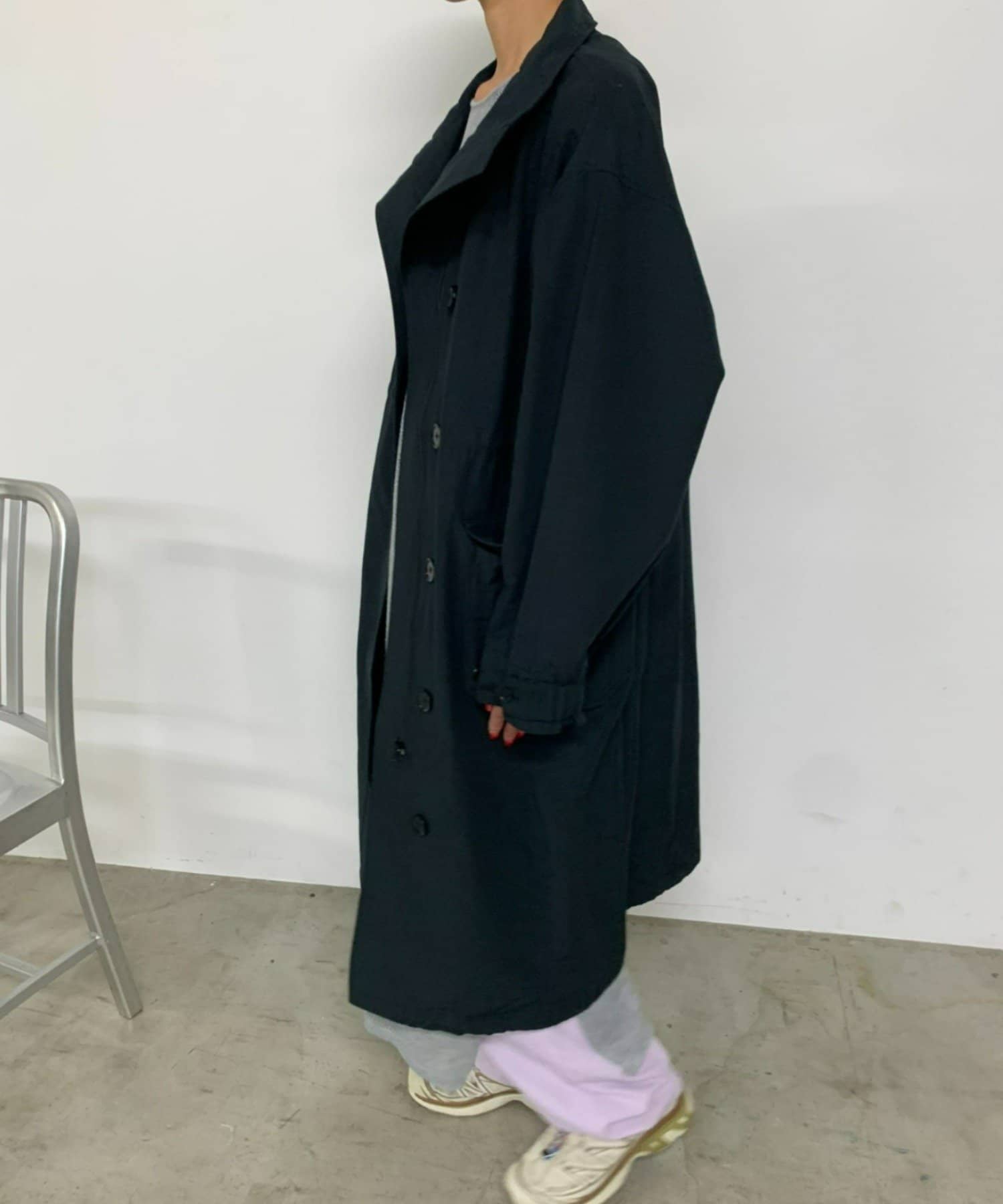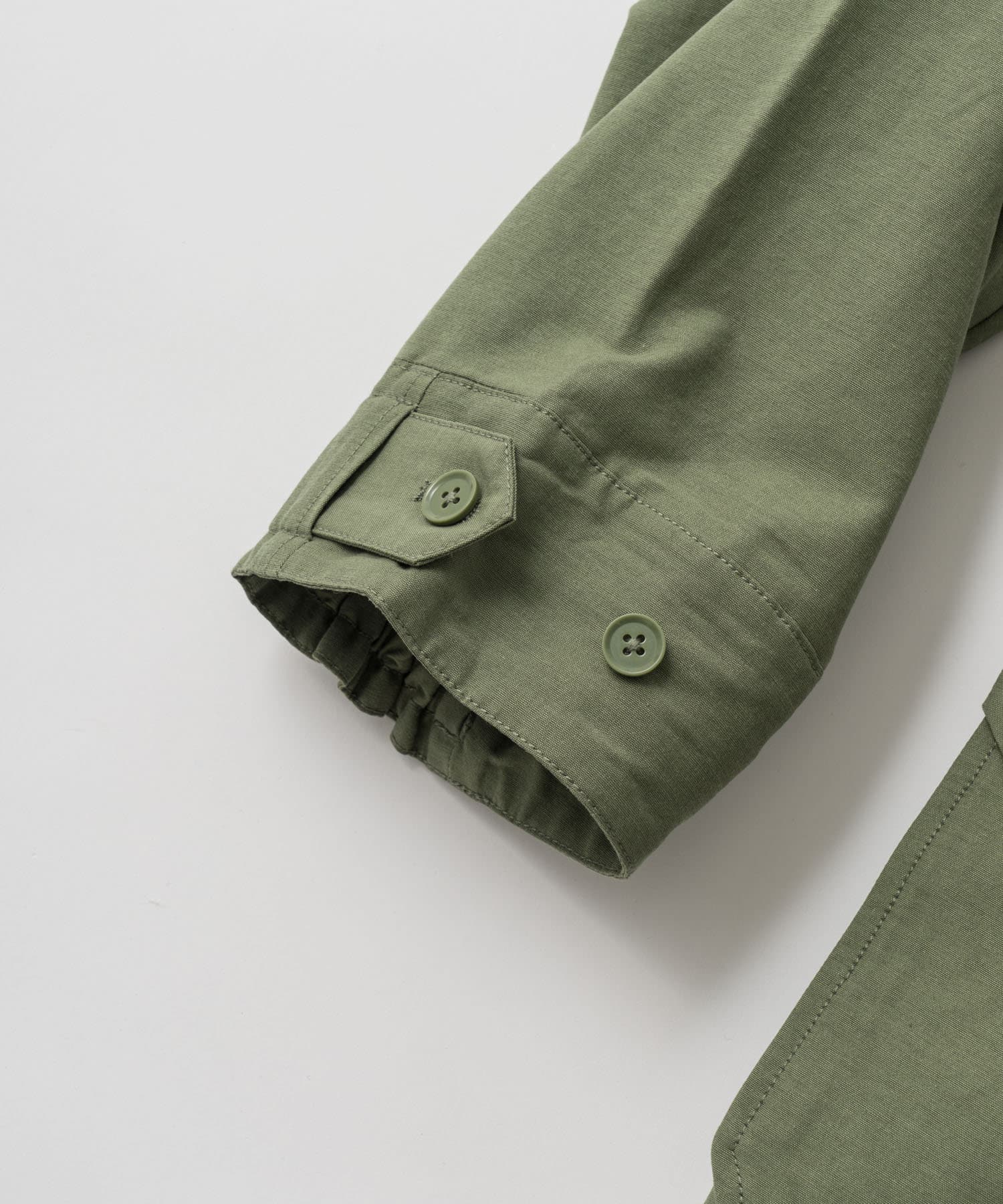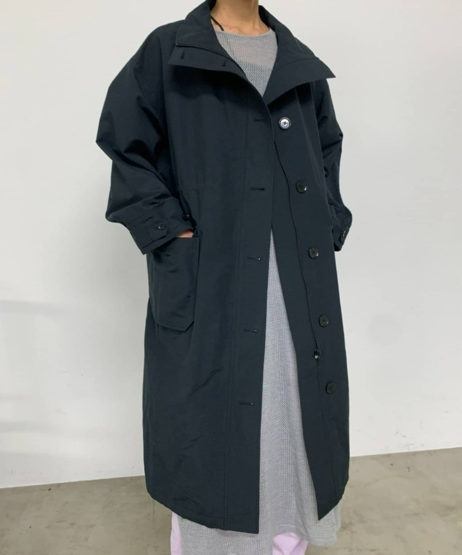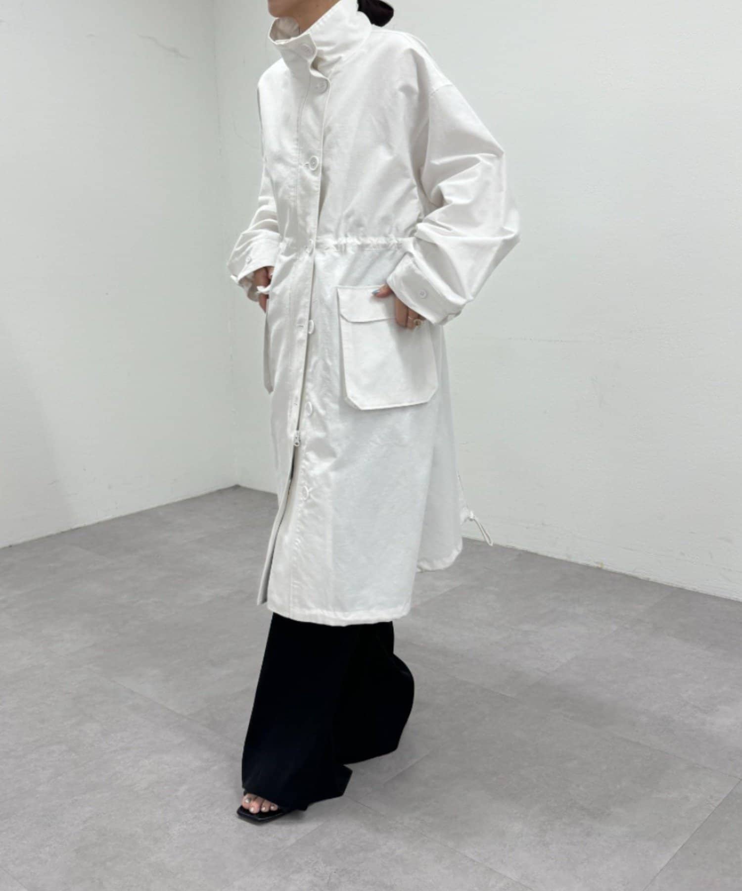 ・ミリタリー要素のディテールが加わったスタンドカラーコート。