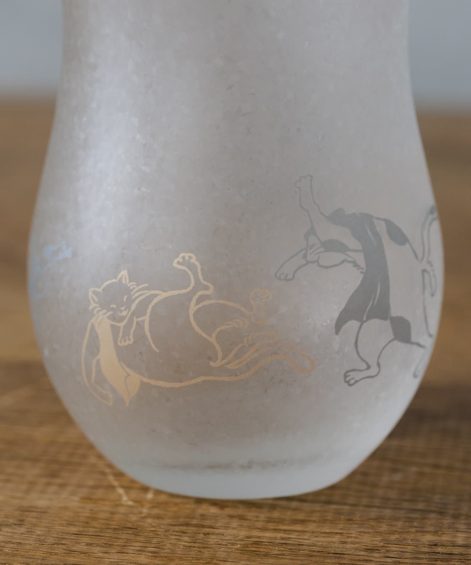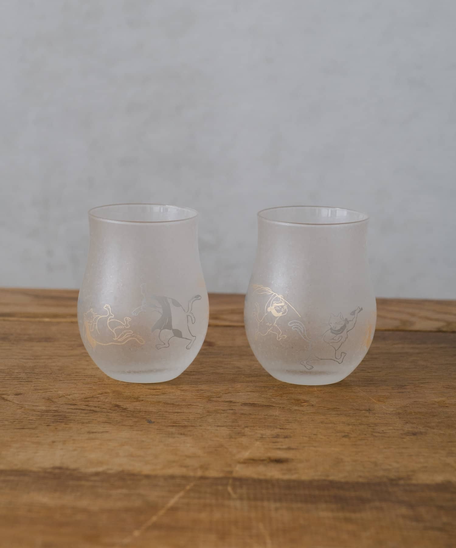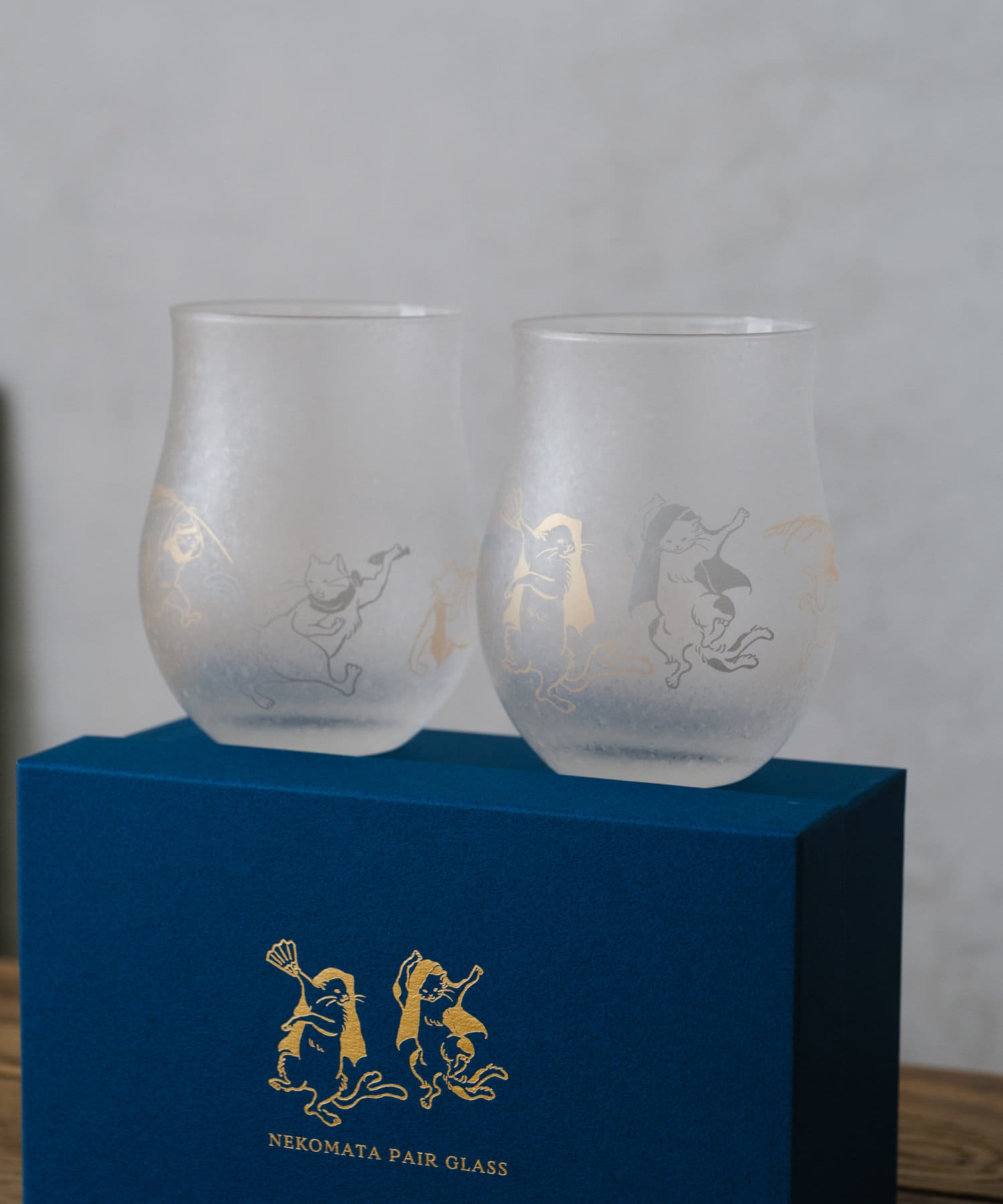 しっぽが二又になったネコの妖怪たちが、人間のように遊んでいるイラストが描かれたグラス。オリジナルの箱にもグラスと同じ愉快なネコのデザインが描かれています。ビールやワイン、お茶や炭酸などお気に入りの飲み物を入れて、デイリーにお使いいただけます。くびれのあるデザインは持ちやすく、食器棚にも入る、ちょうど使いやすいサイズ感。ペアになっているので、ご結婚やお引越しなどお祝いやプレゼントにも最適です。