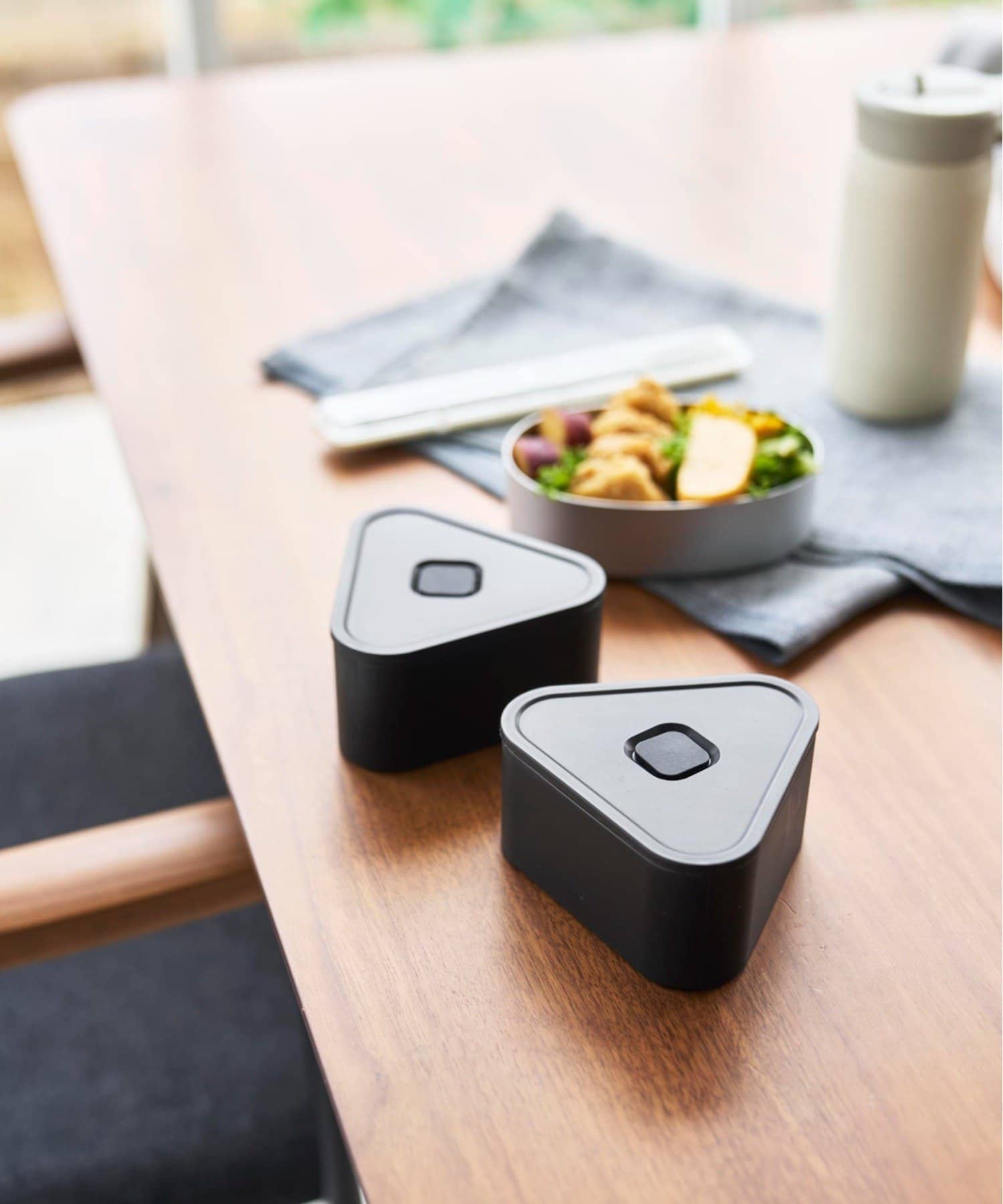 コンビニのおにぎりも形を崩さず持ち運べ、フタにワンプッシュ式のバルブが付いており、軽く押すだけで簡単密閉できます。
