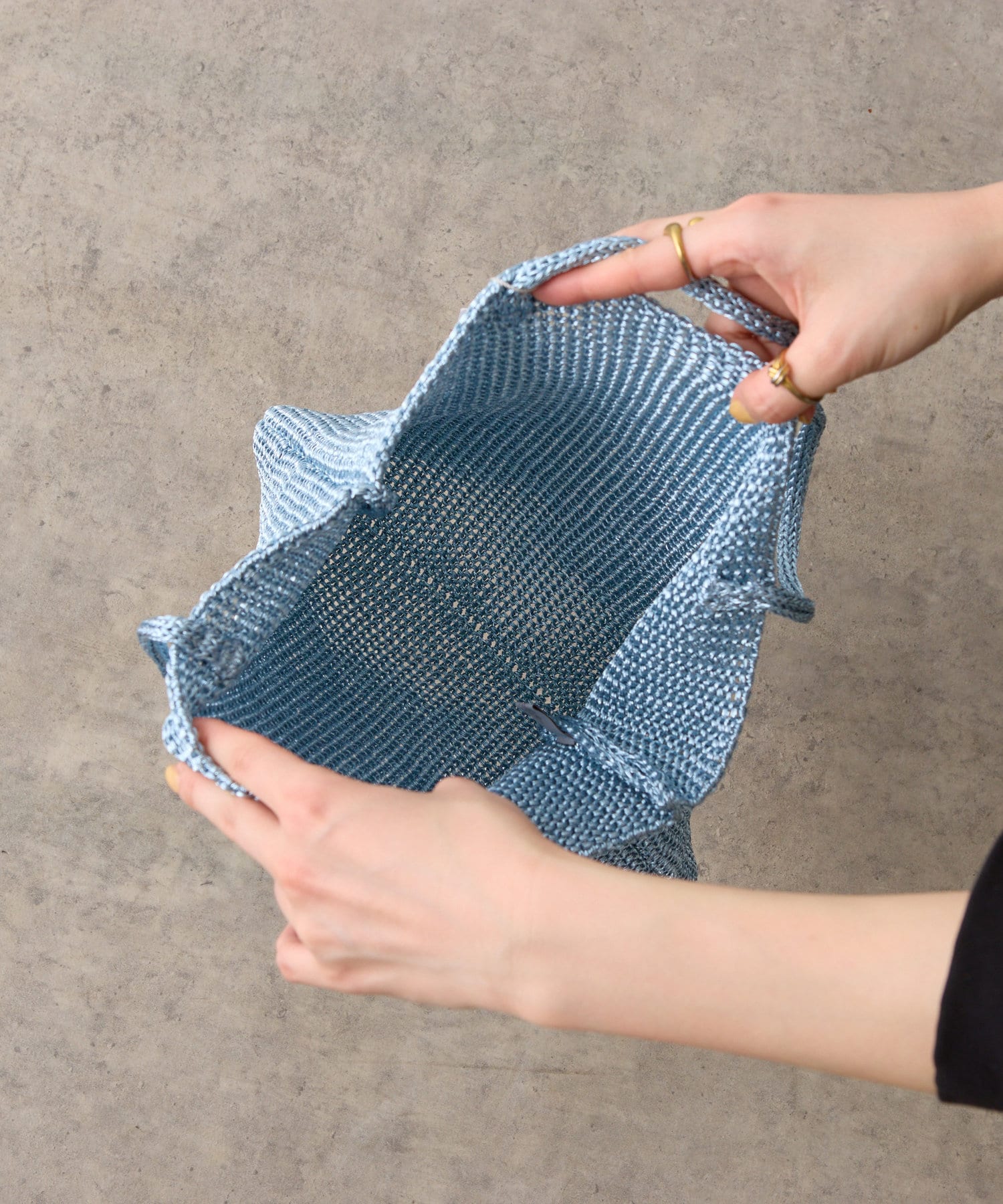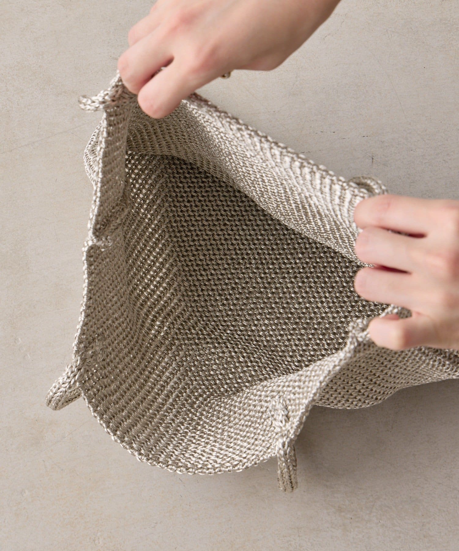 ・伸縮性のある編み方をしております。物を入れると縦に伸びますが、平らにして横に広げると元のサイズにほぼ戻ります。