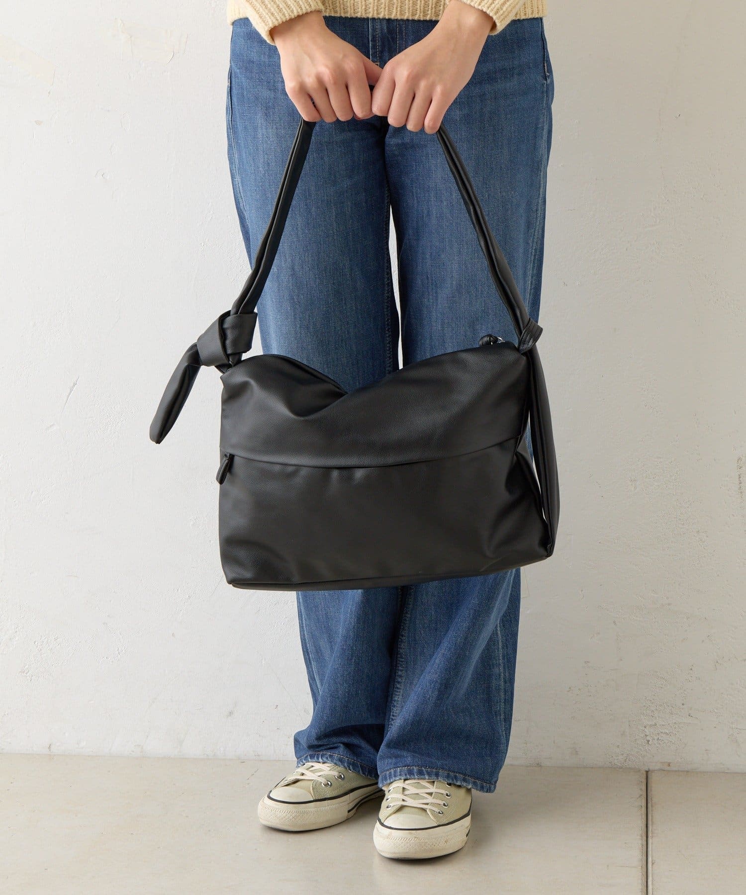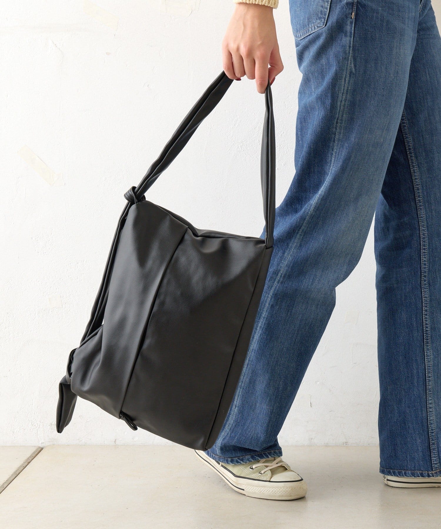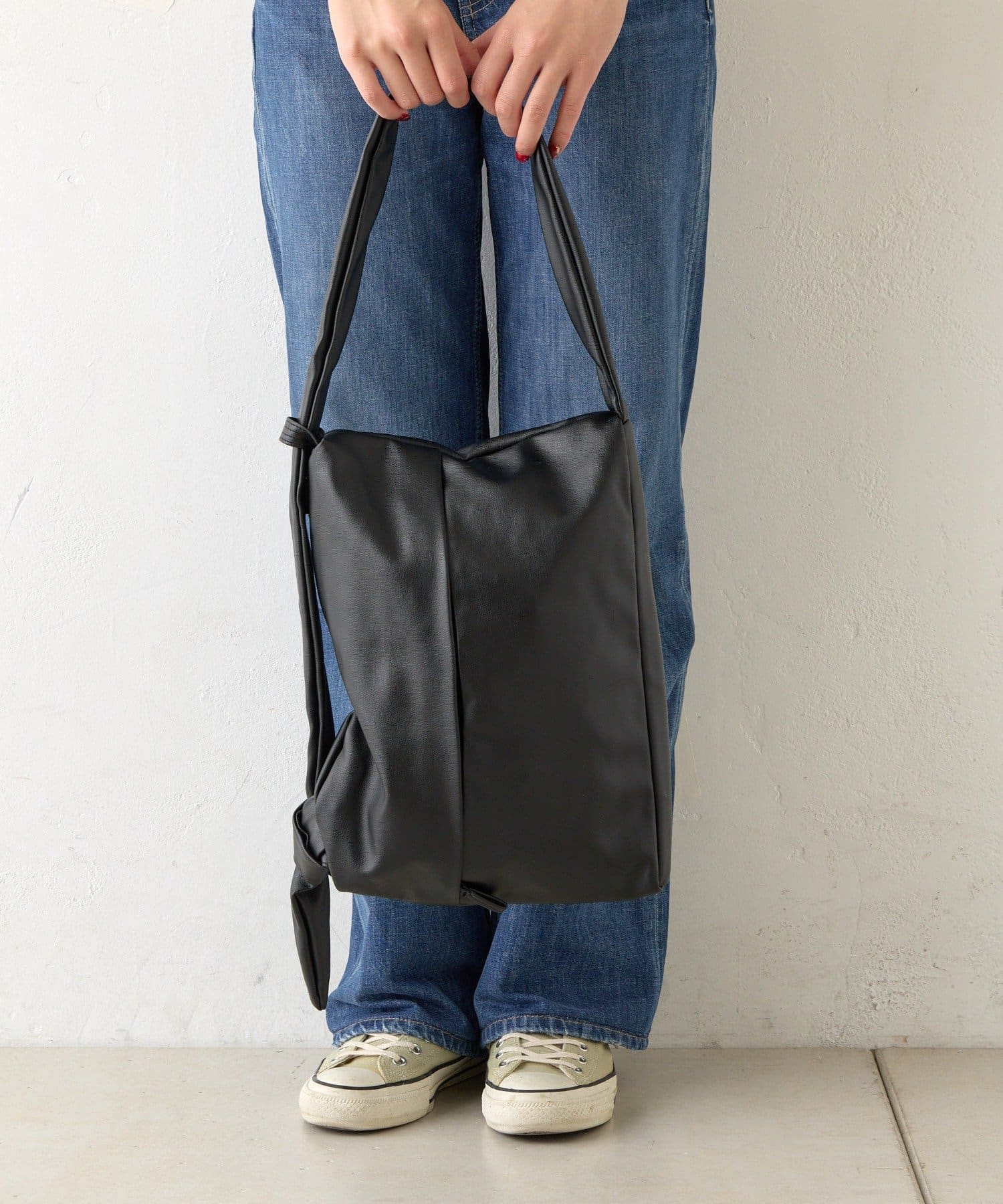 反対側のショルダーをしぼってバッグを縦向きにすると、トレンドの巾着型リュックのようなボンサック風にアレンジすることも可能◎
