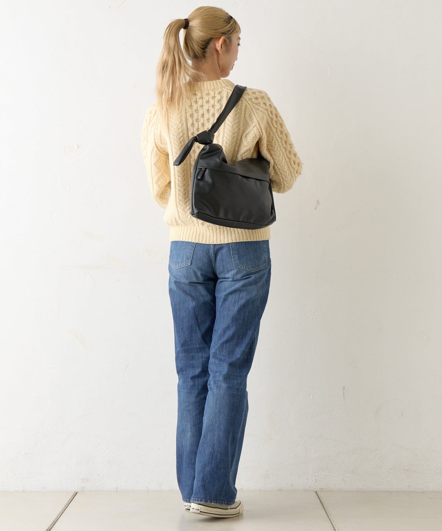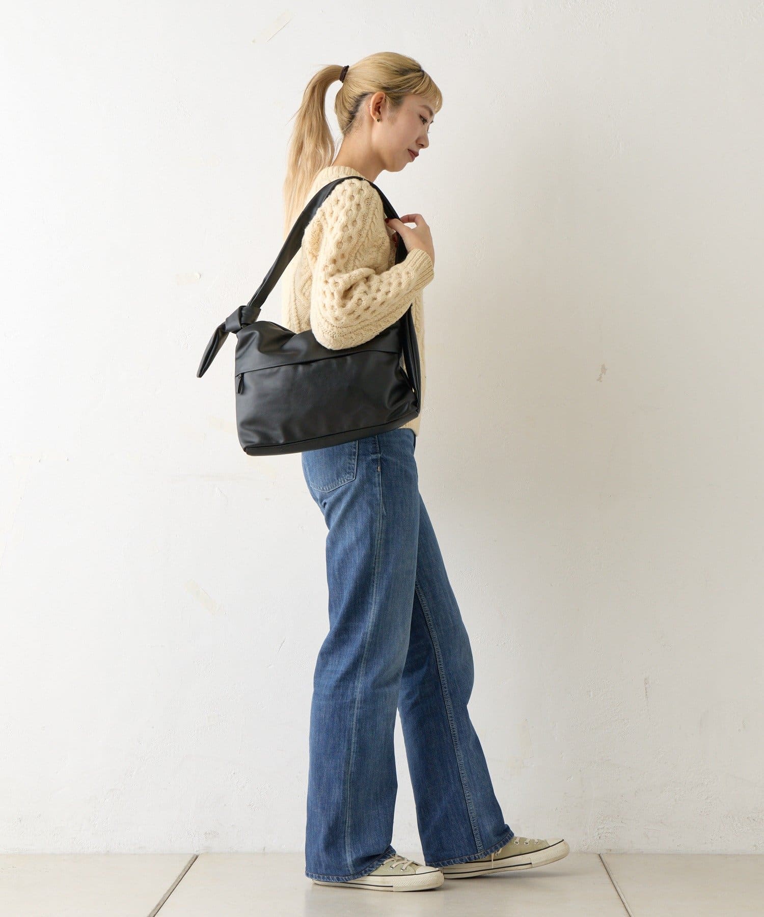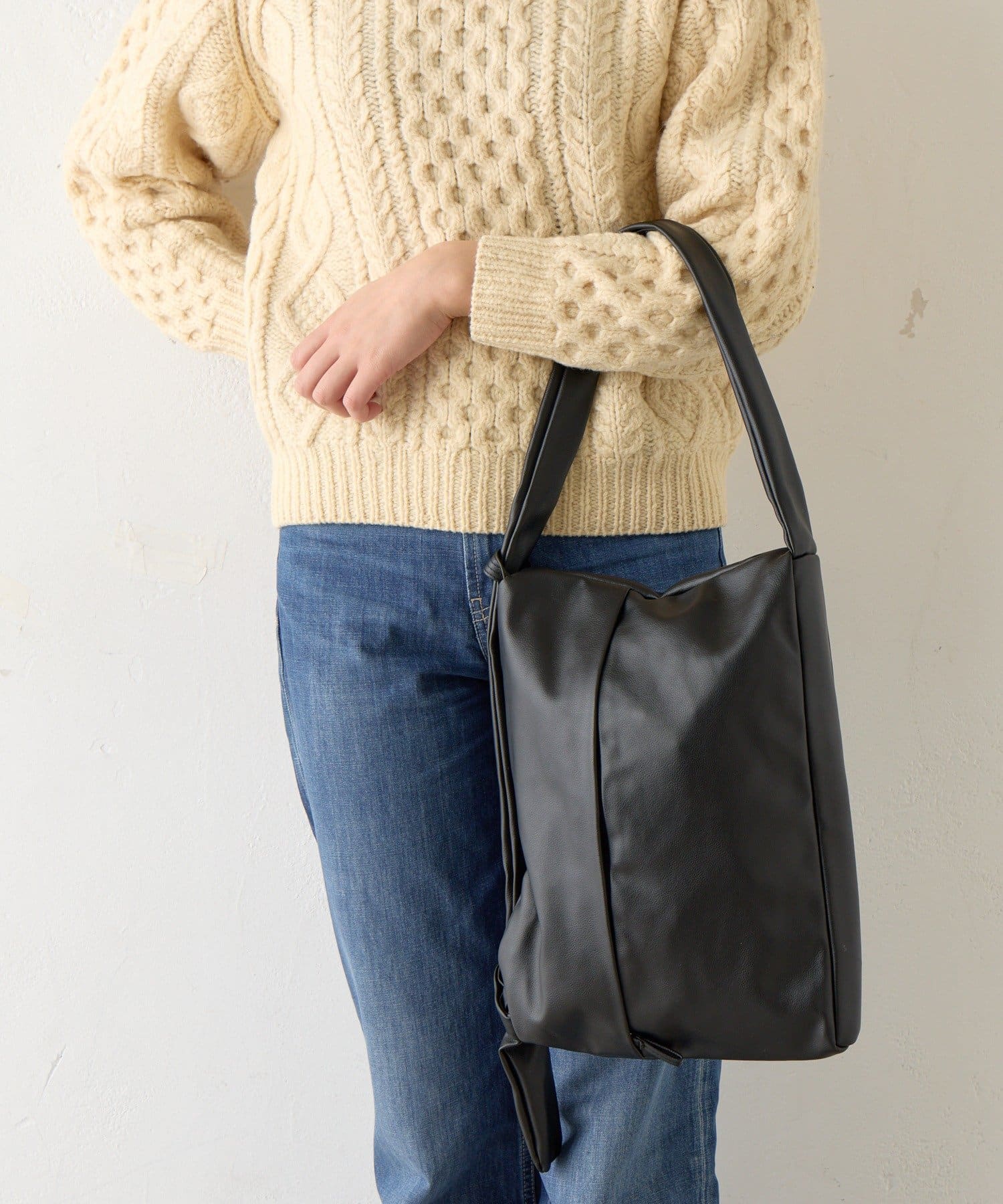 反対側のショルダーをしぼってバッグを縦向きにすると、トレンドの巾着型リュックのようなボンサック風にアレンジすることも可能◎