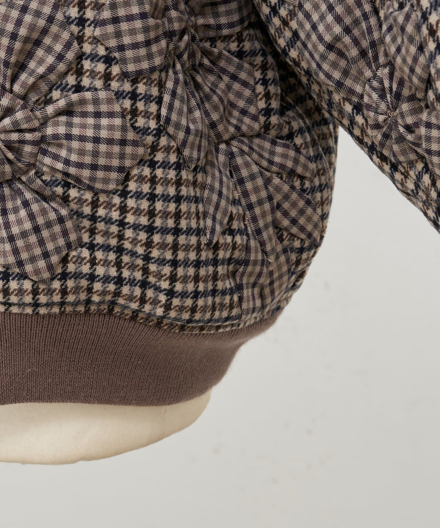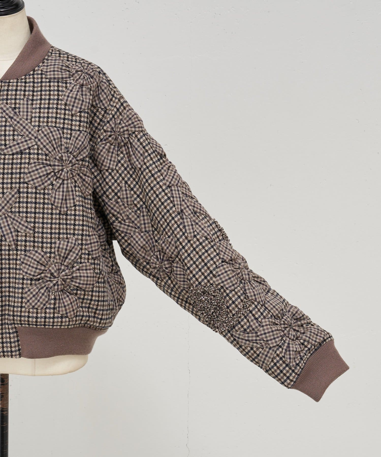 チェック柄に繊細な花の立体刺繍を重ね、職人の手仕事を思わせる奥行きと温もりを添えました。
