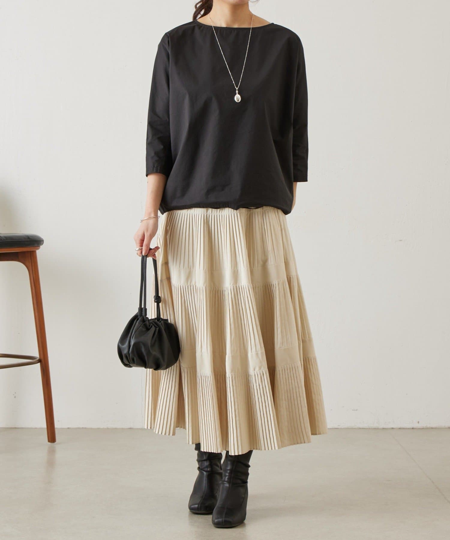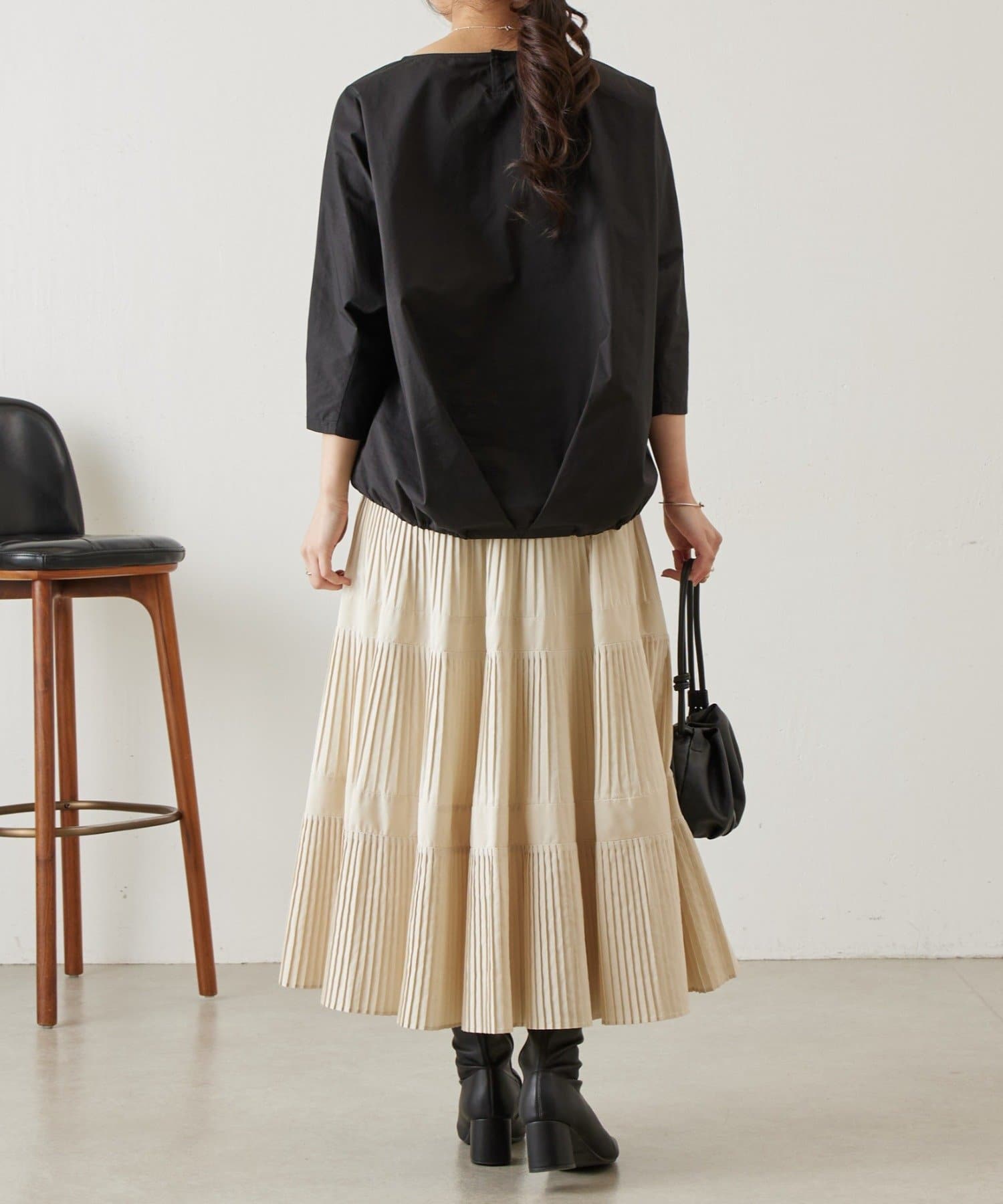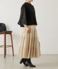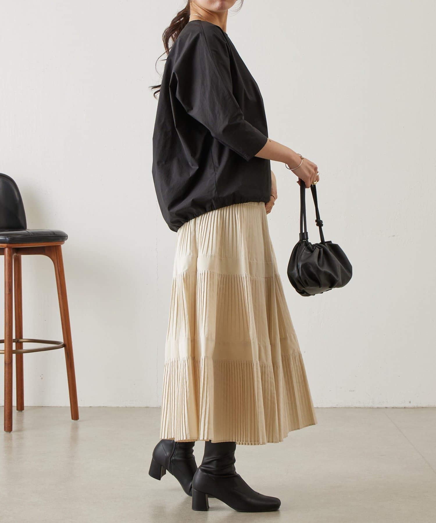 ポリエステル素材特有の艶と、歩くたびに揺れるプリーツが女性らしく上品な印象に。