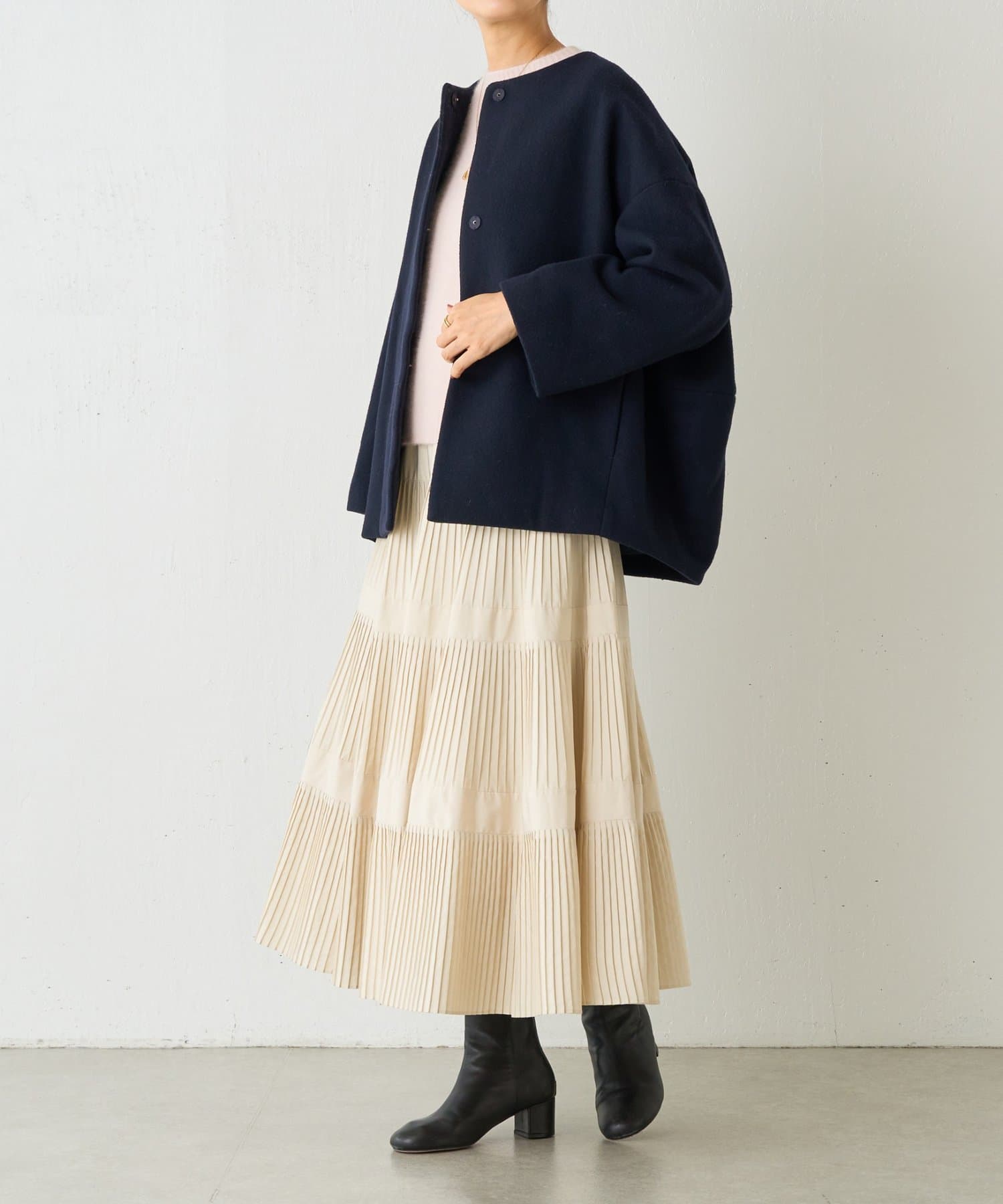 細めのプリーツで広がりすぎず、すっきりと穿けるのも嬉しいポイントです。