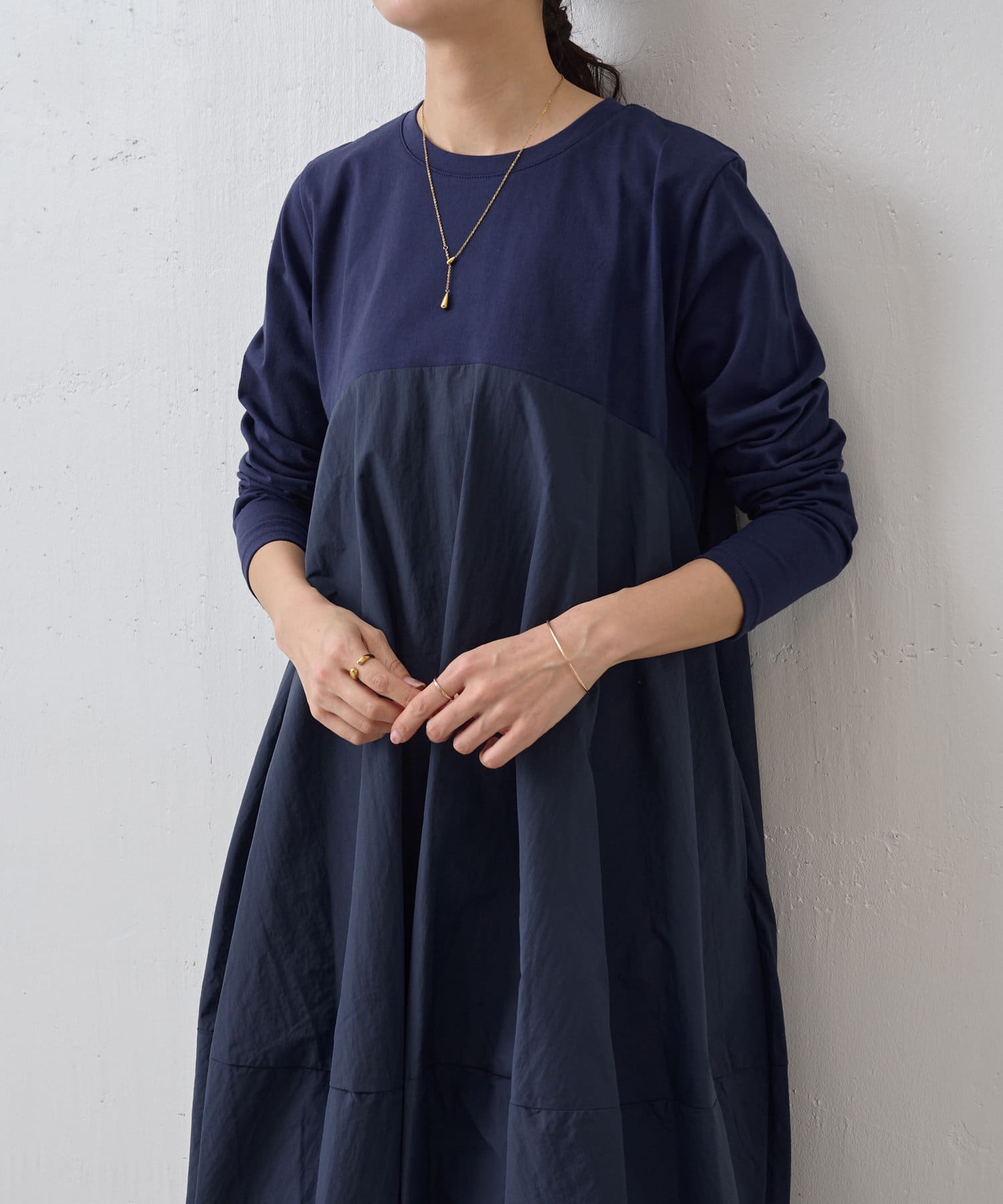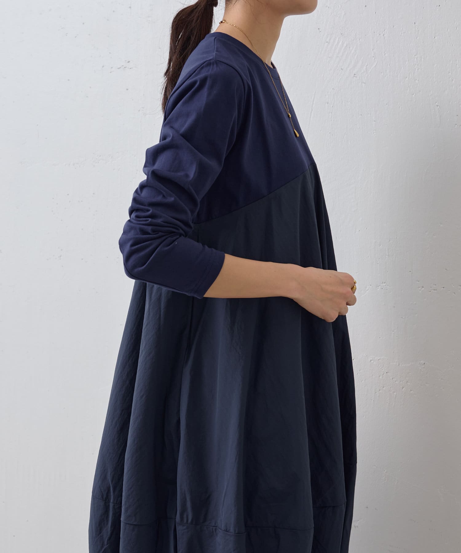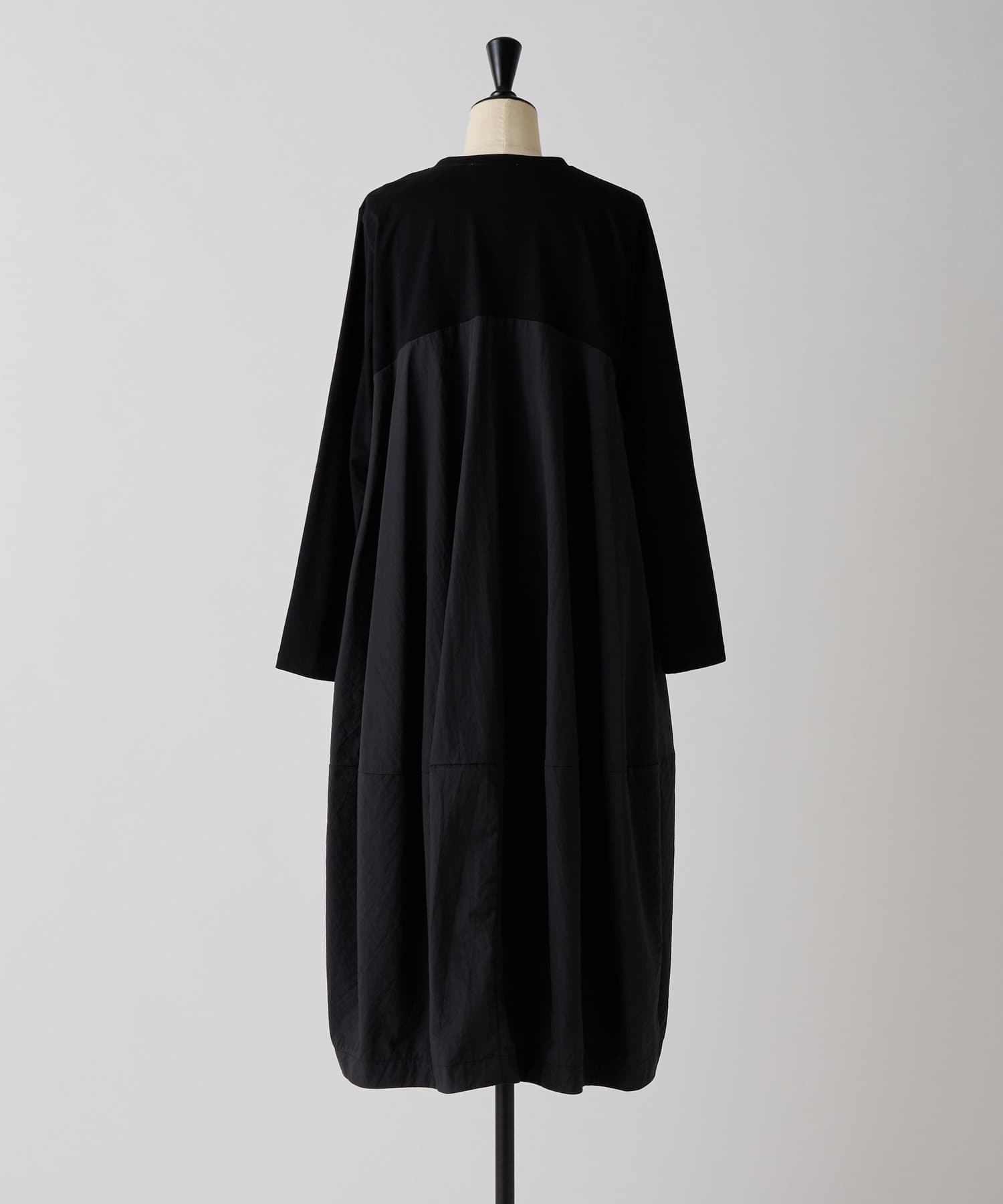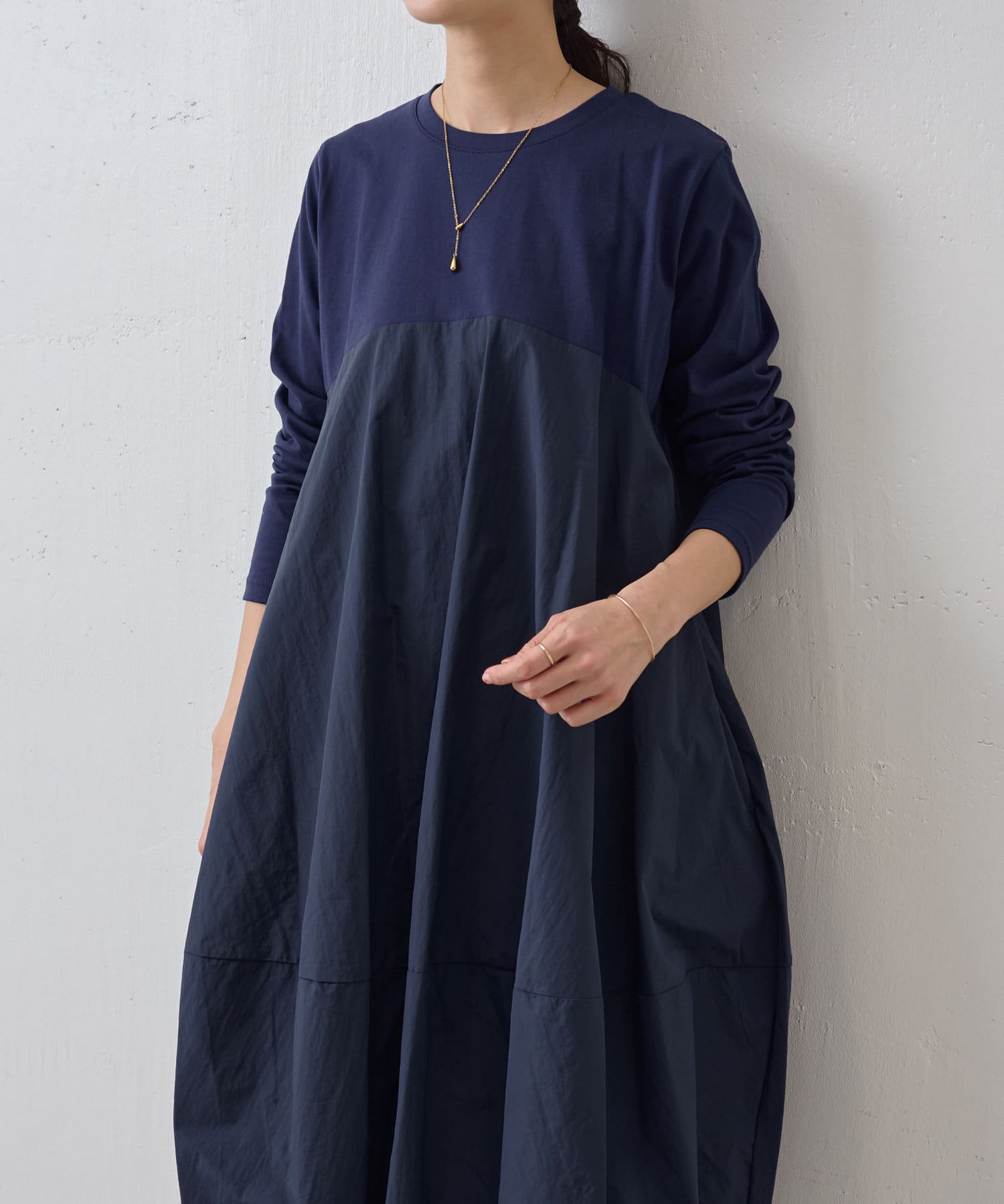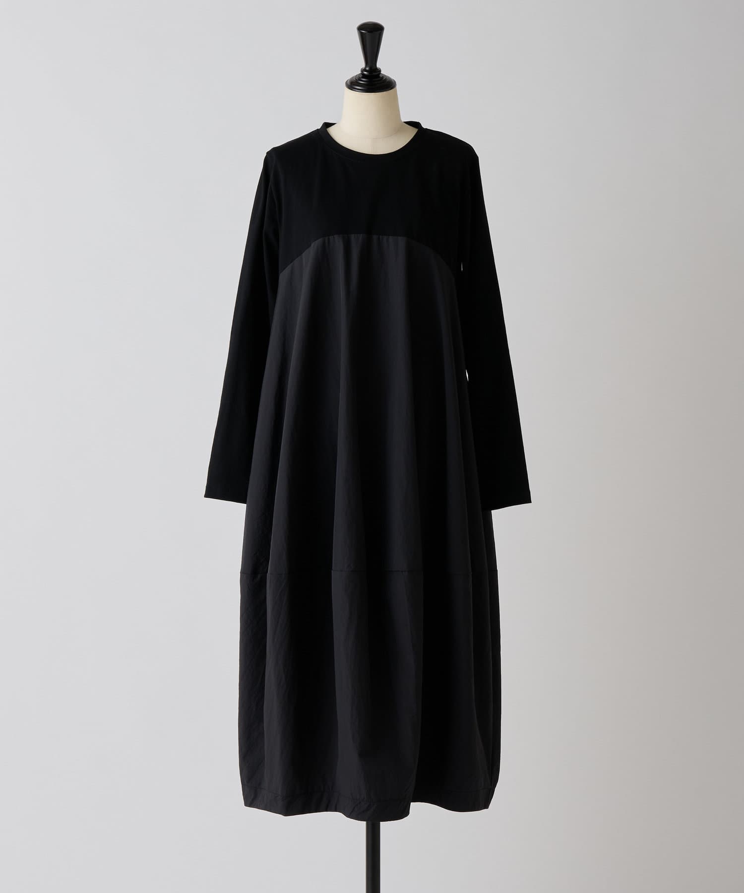 肩回りや袖にはカットソー生地を用い、胸下の切り替えから布帛生地をバルーン状の丸いシルエットにしたワンピ―ス。