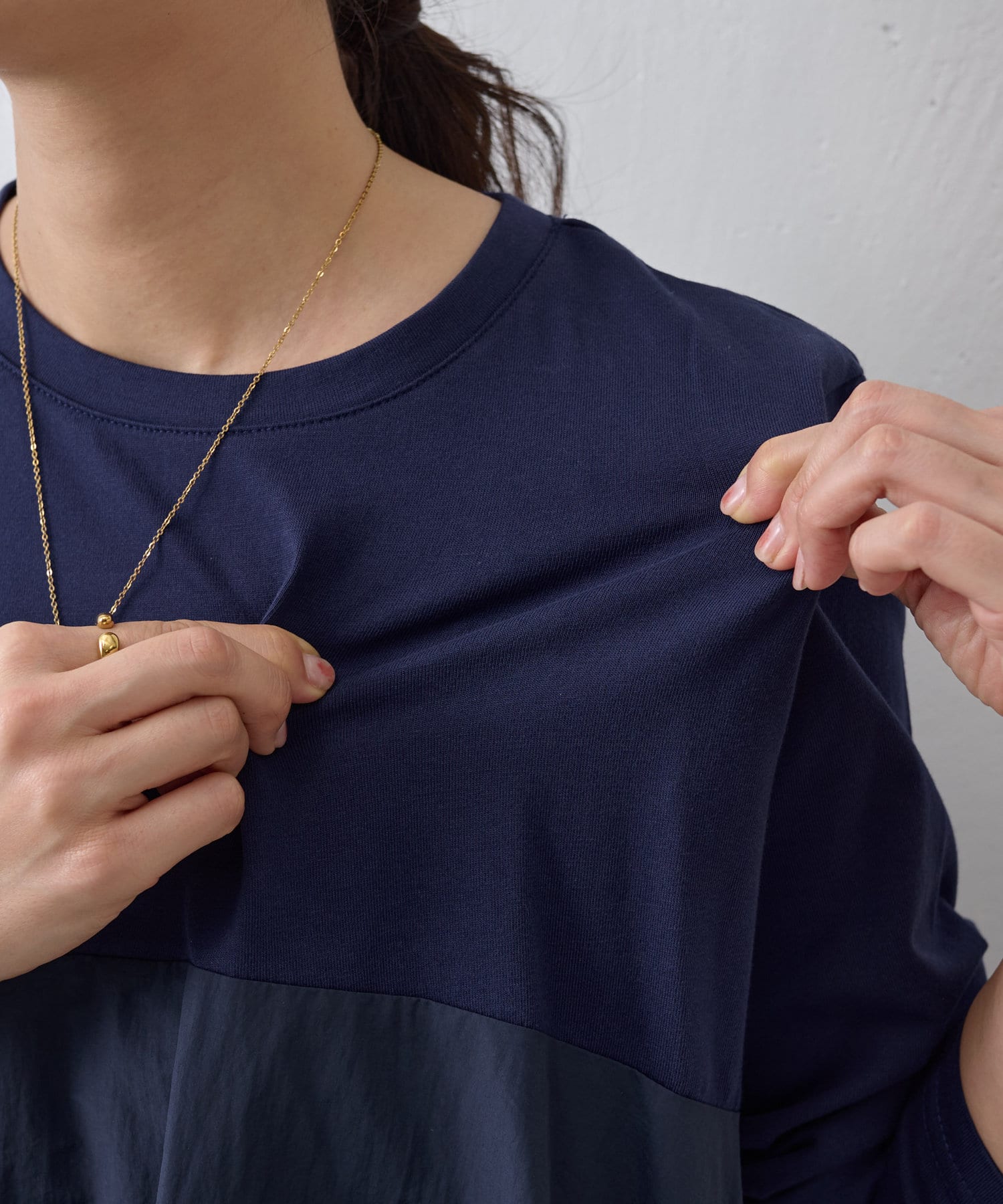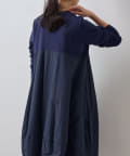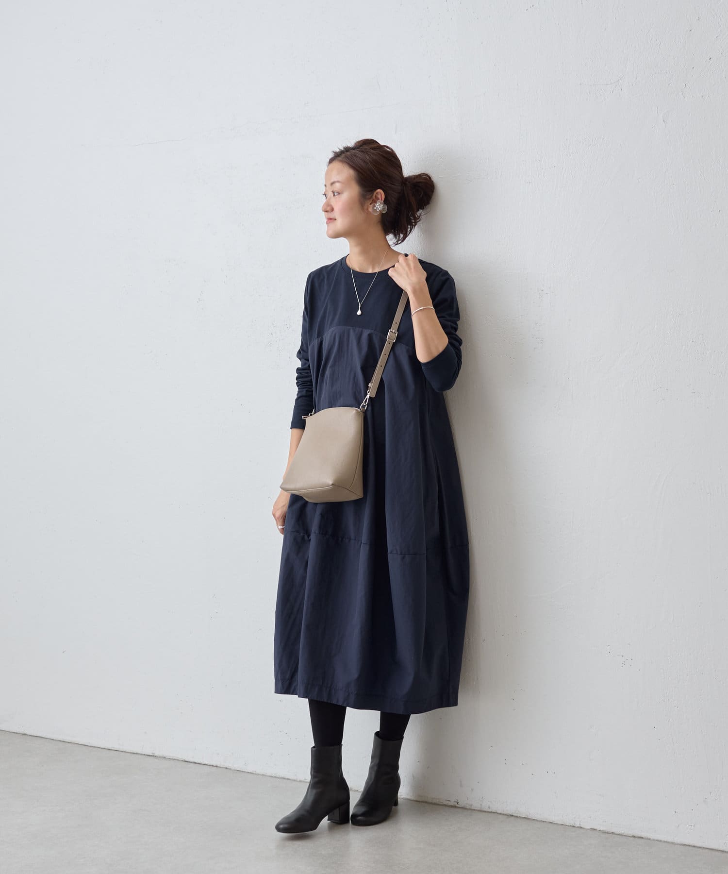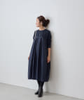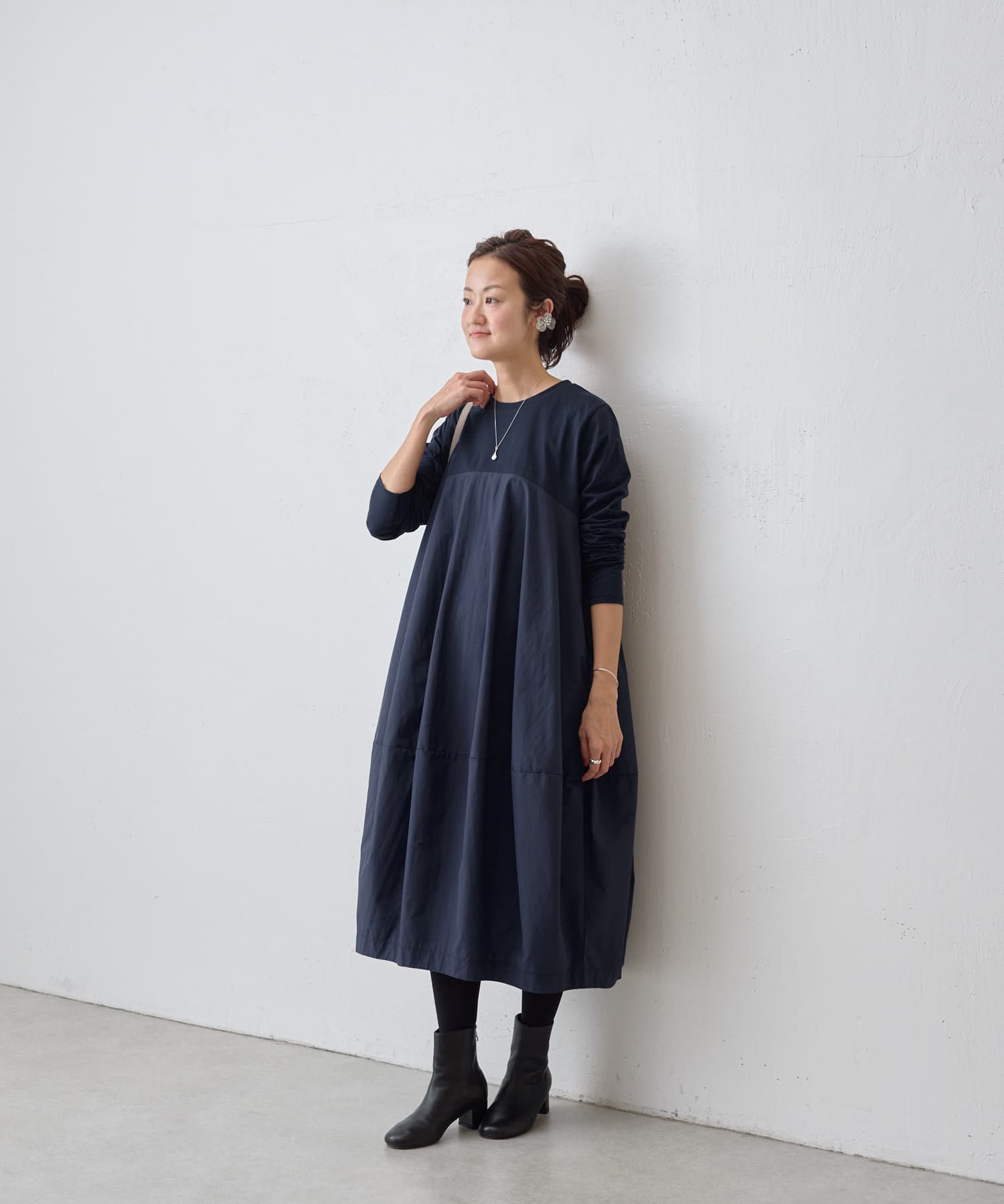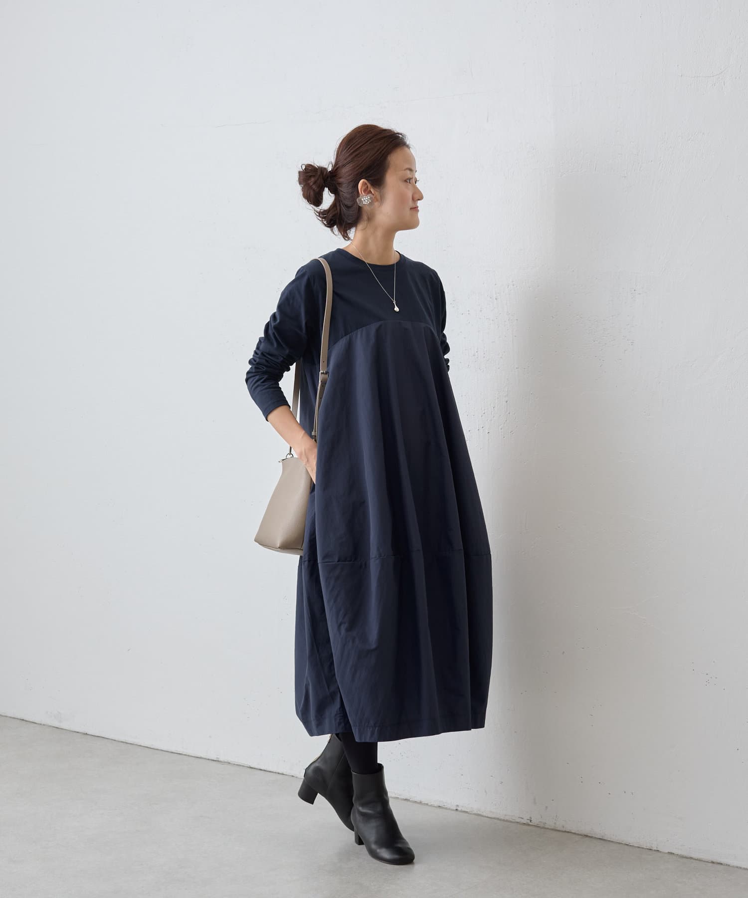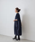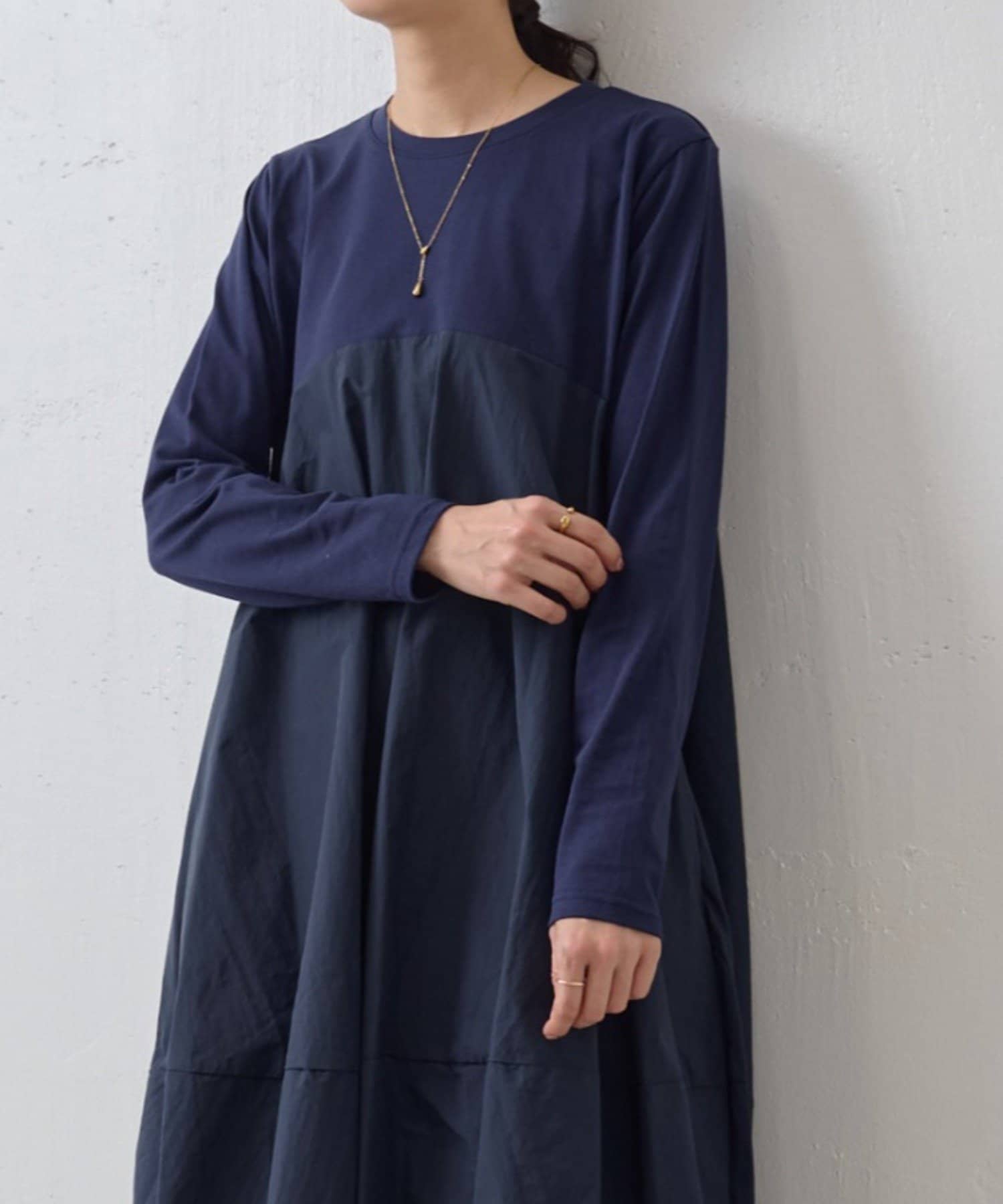 肩回りや袖にはカットソー生地を用い、胸下の切り替えから布帛生地をバルーン状の丸いシルエットにしたワンピ―ス。