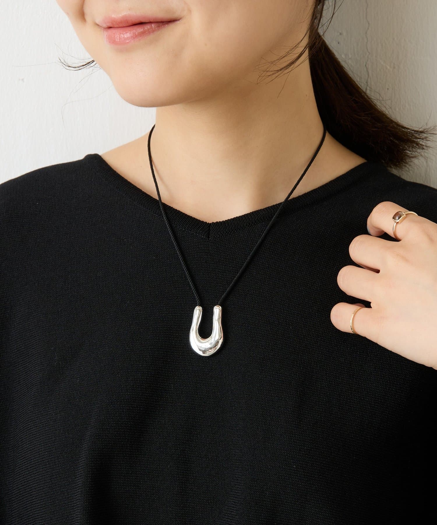 馬蹄型のシルバーパーツがさりげないアクセントになるコードネックレス。