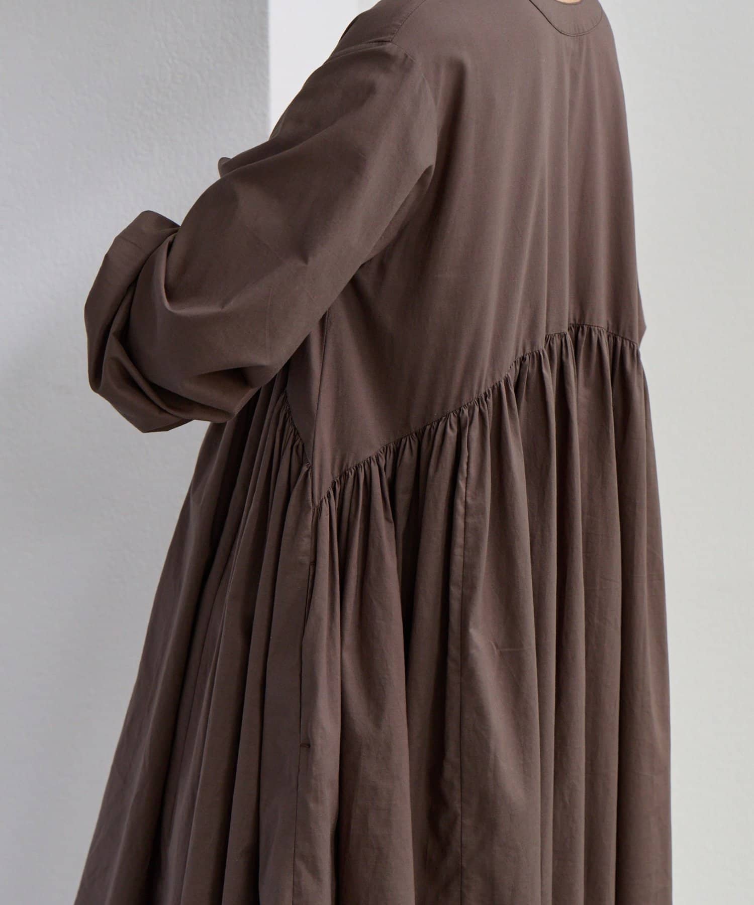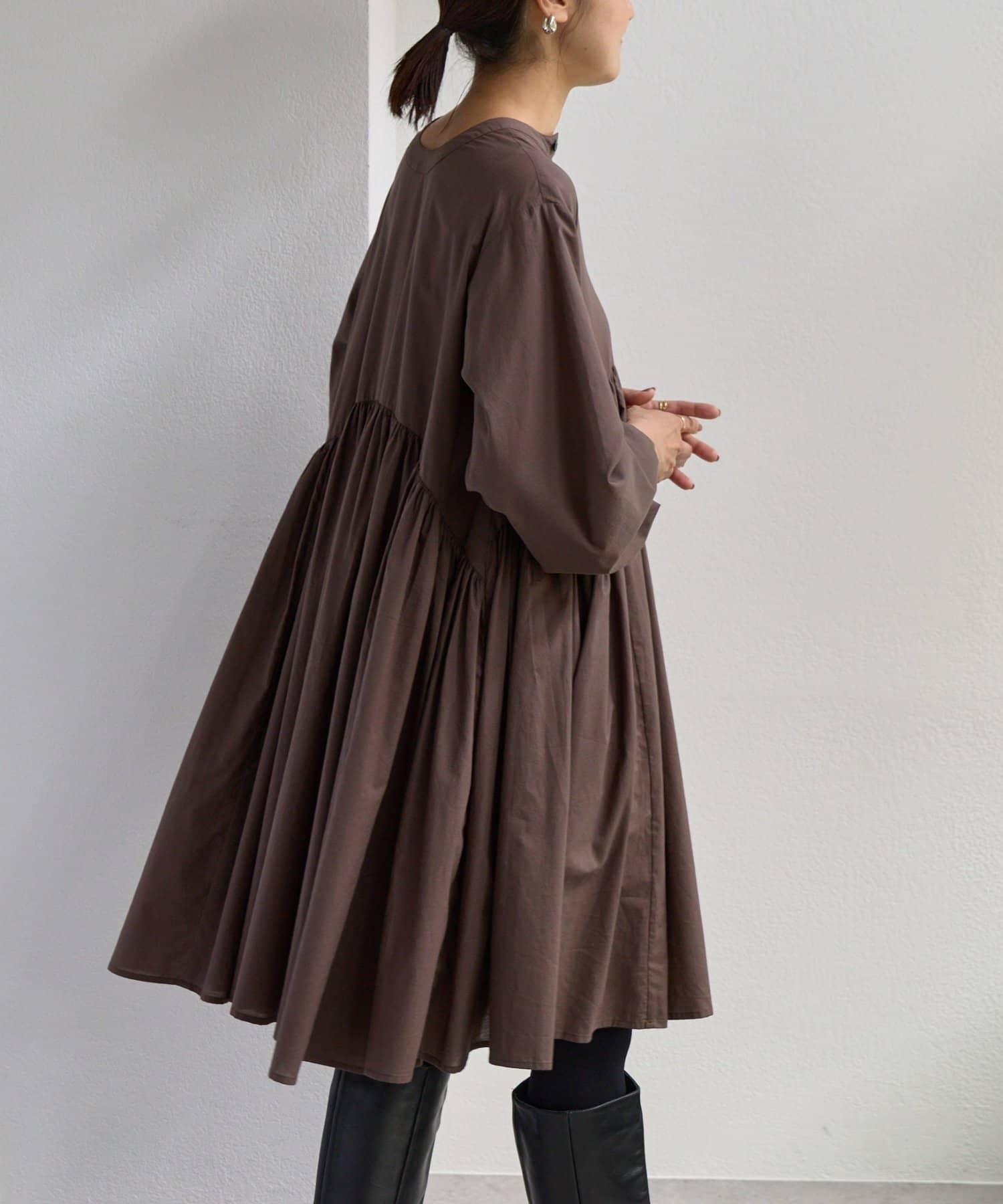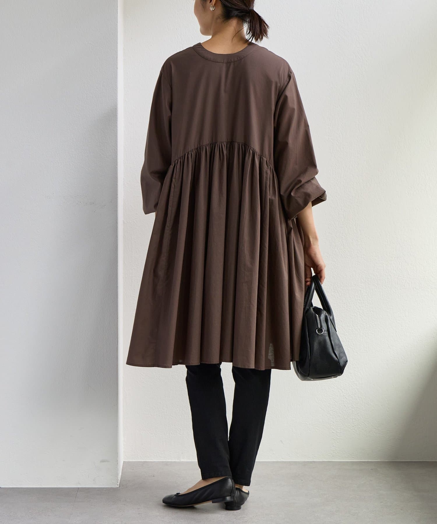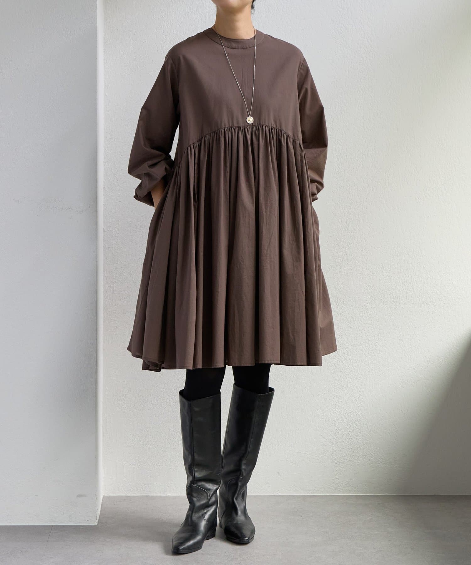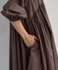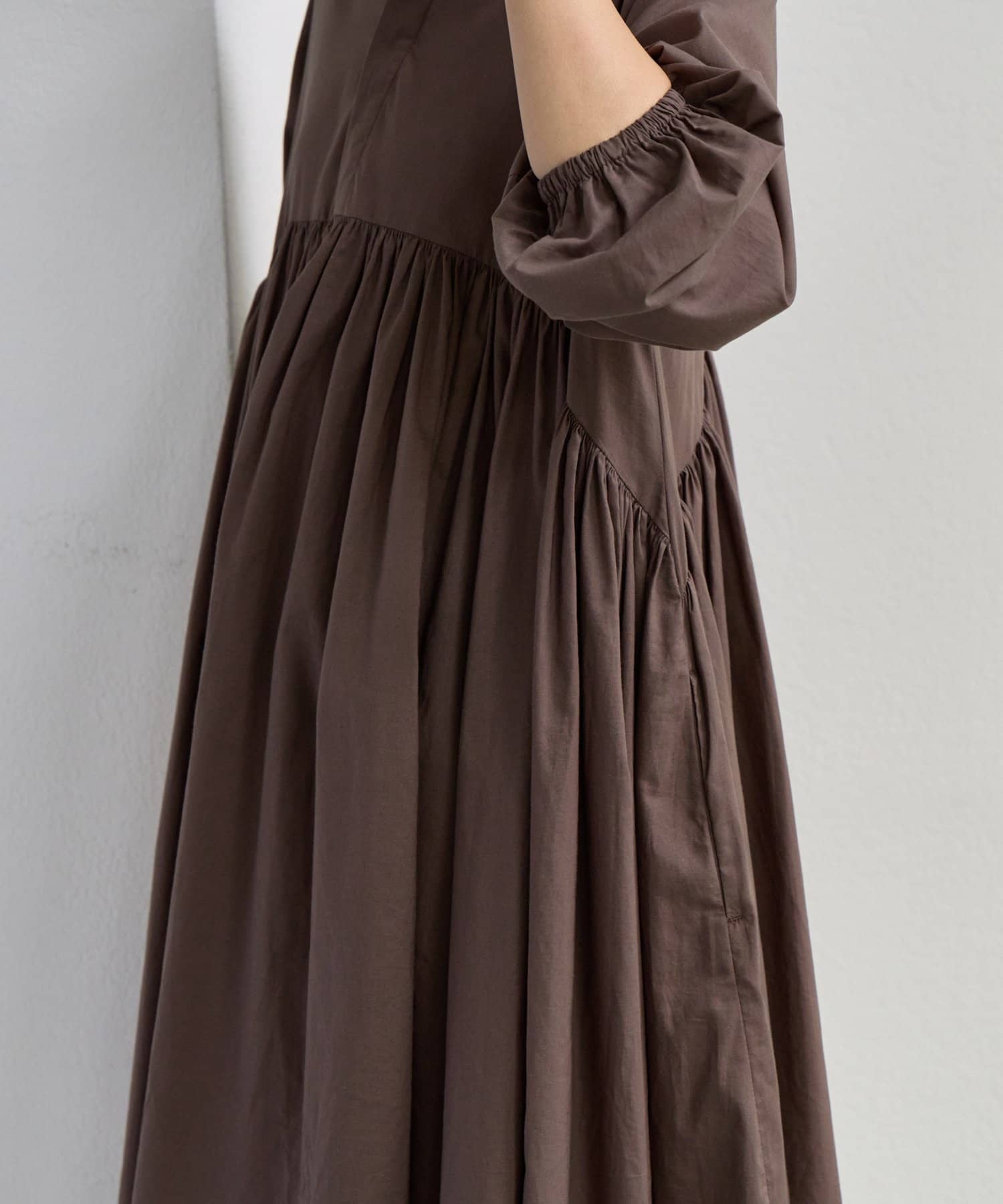 胸元をラウンドカットし、ギャザーをたっぷり寄せて、女性らしいデザインに。