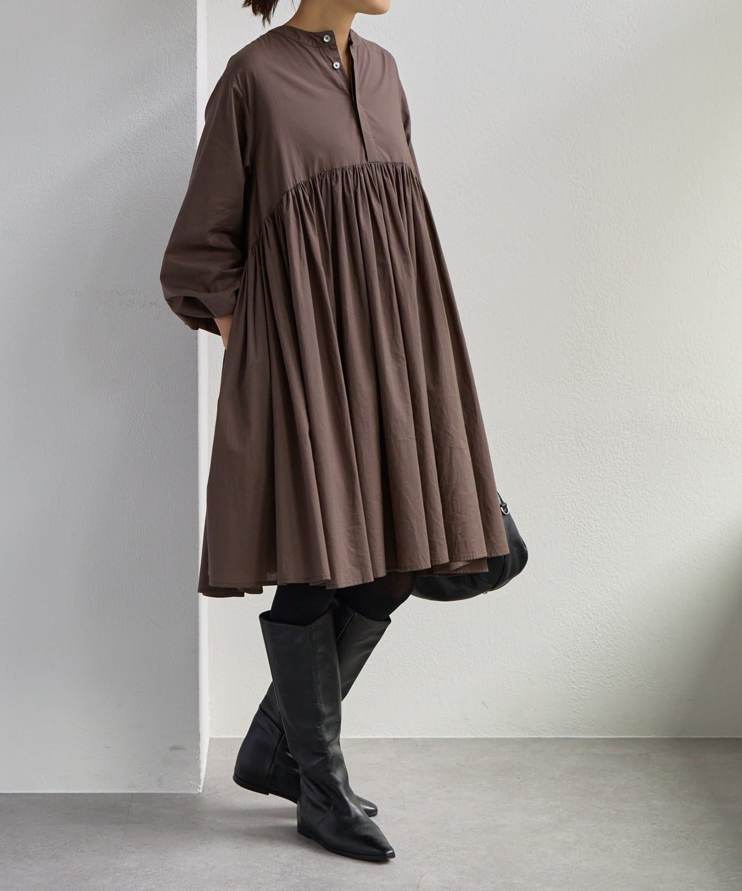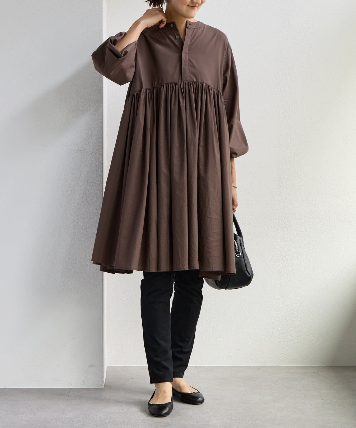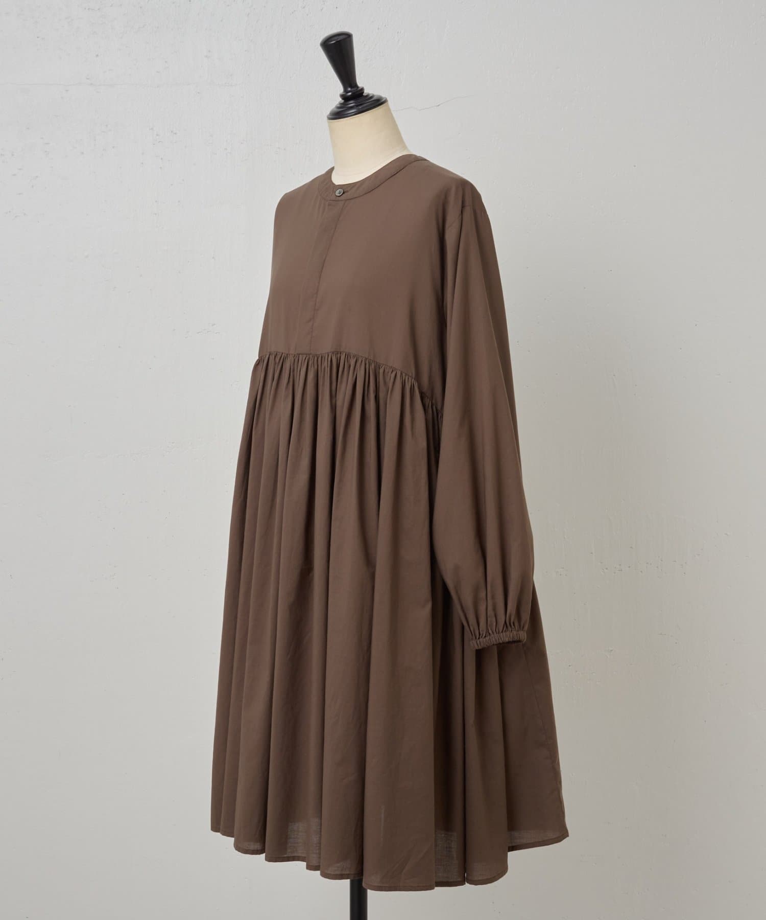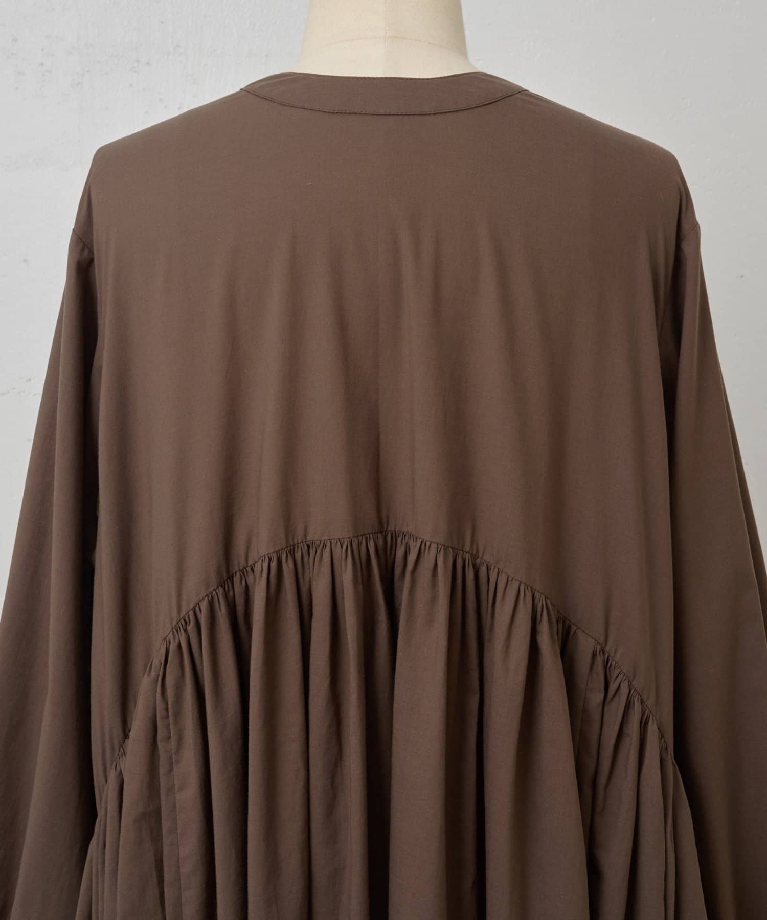 胸元をラウンドカットし、ギャザーをたっぷり寄せて、女性らしいデザインに。