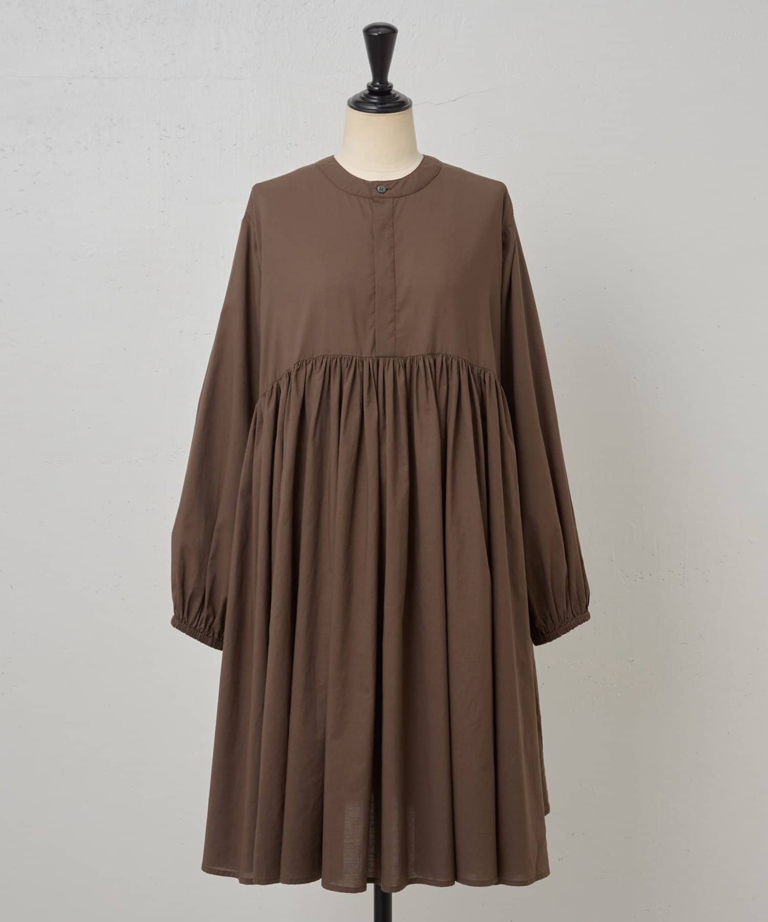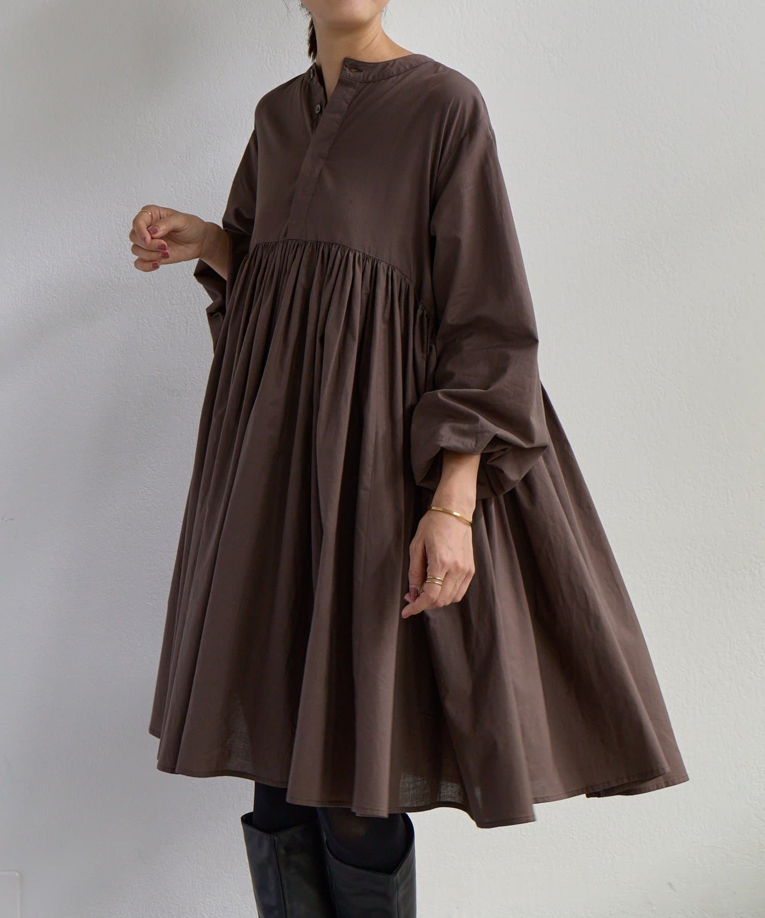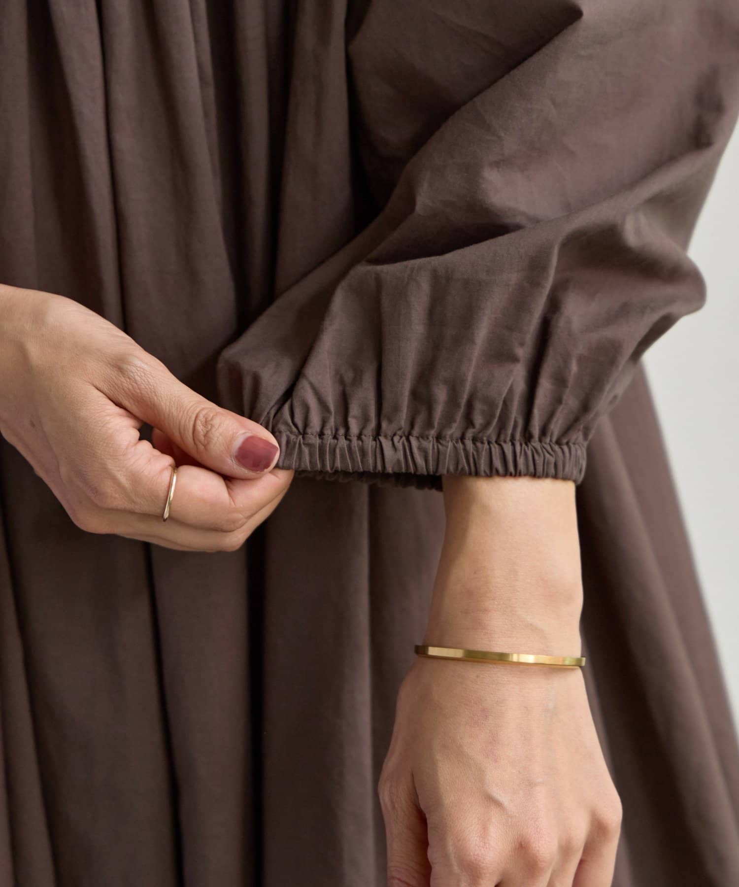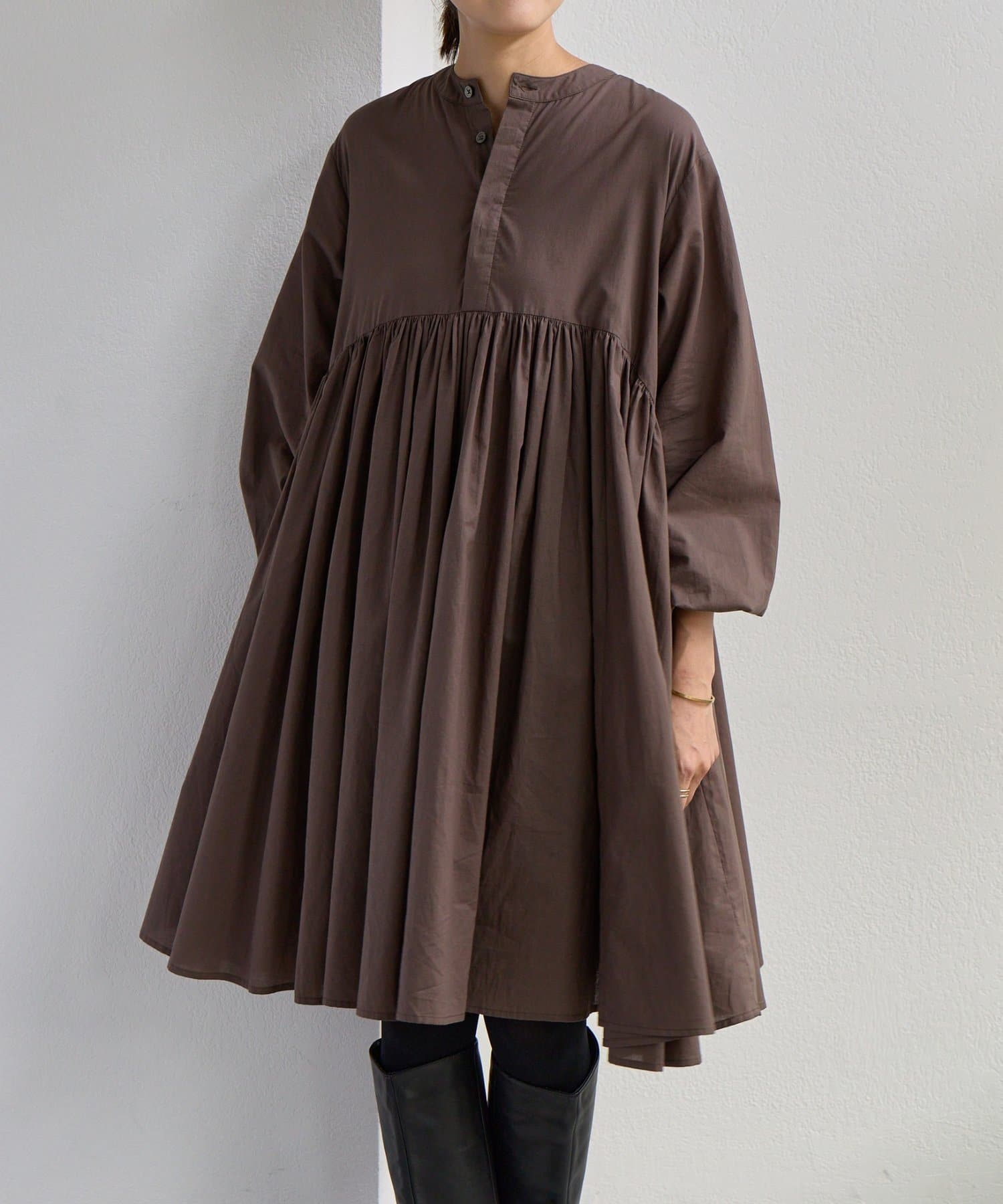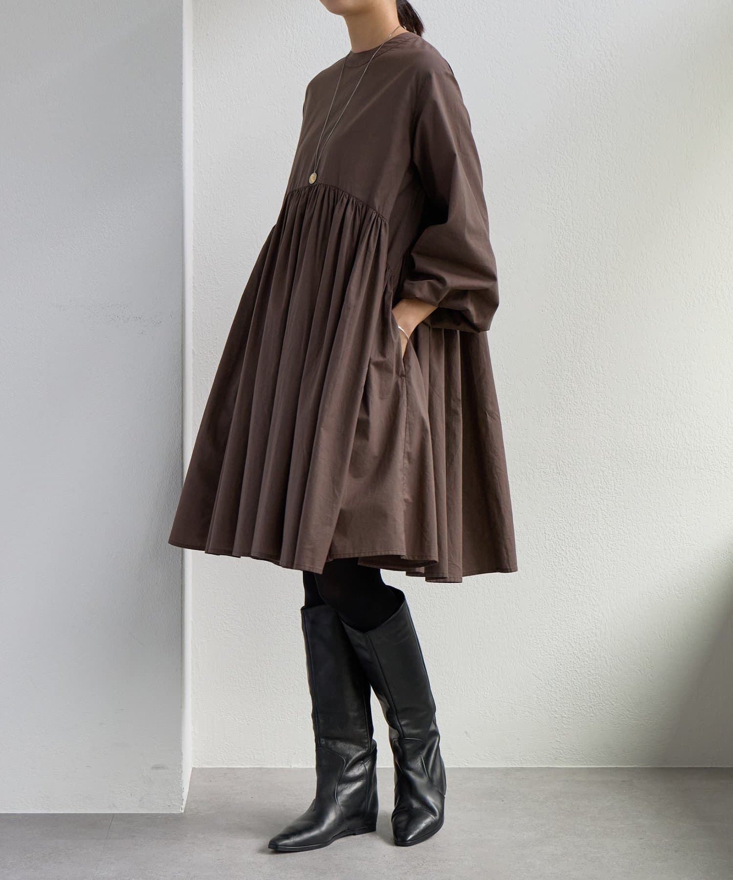 胸元をラウンドカットし、ギャザーをたっぷり寄せて、女性らしいデザインに。