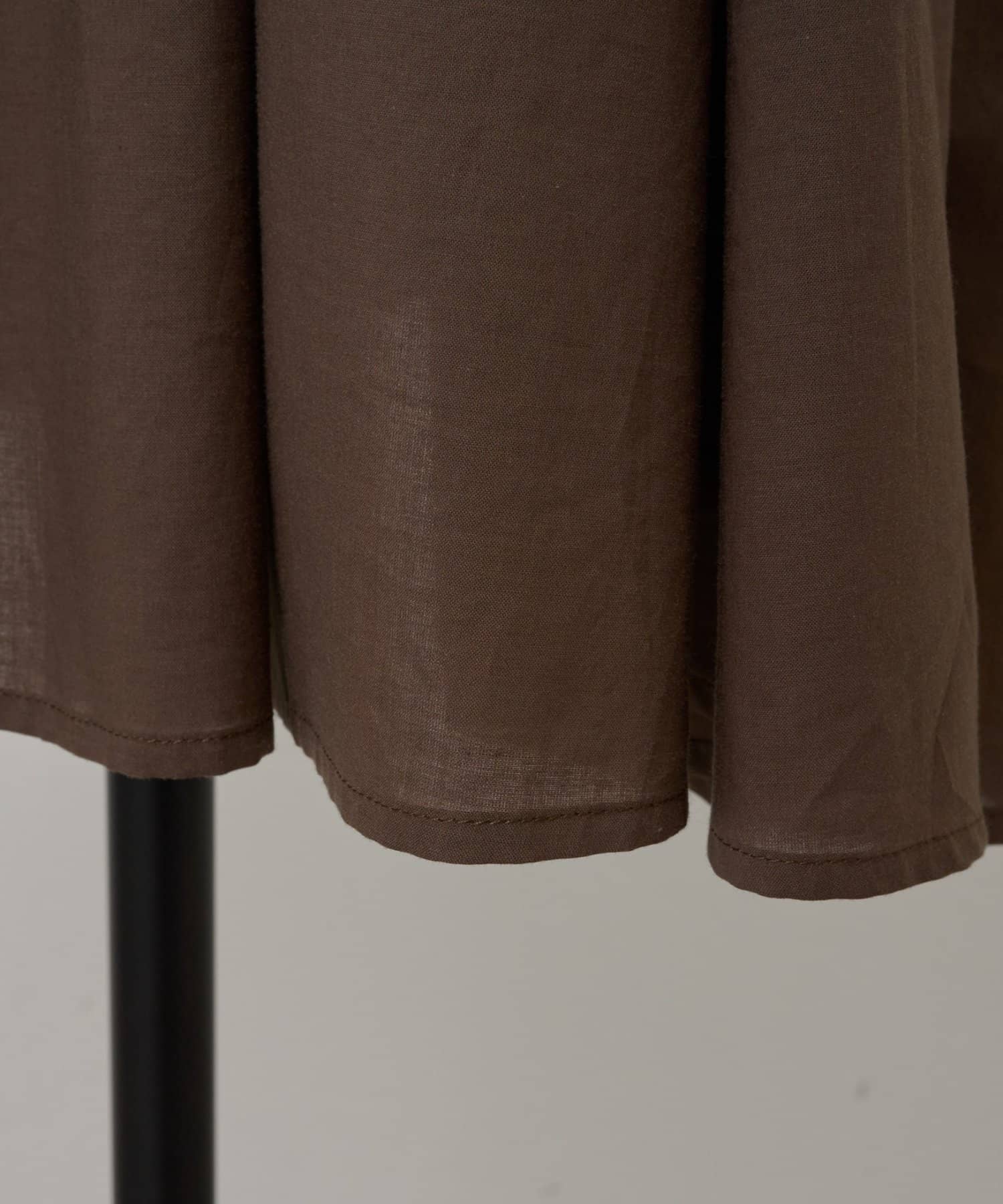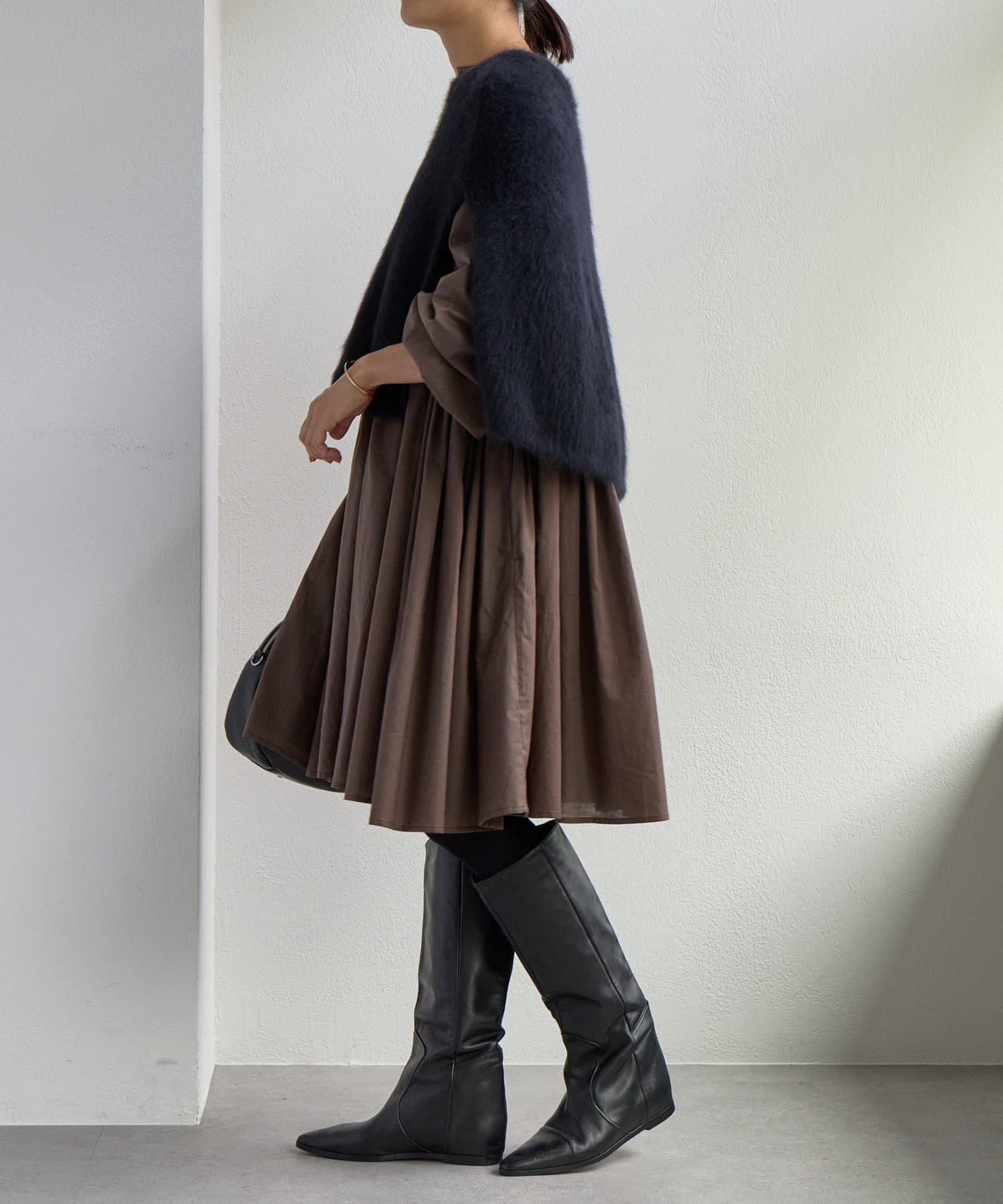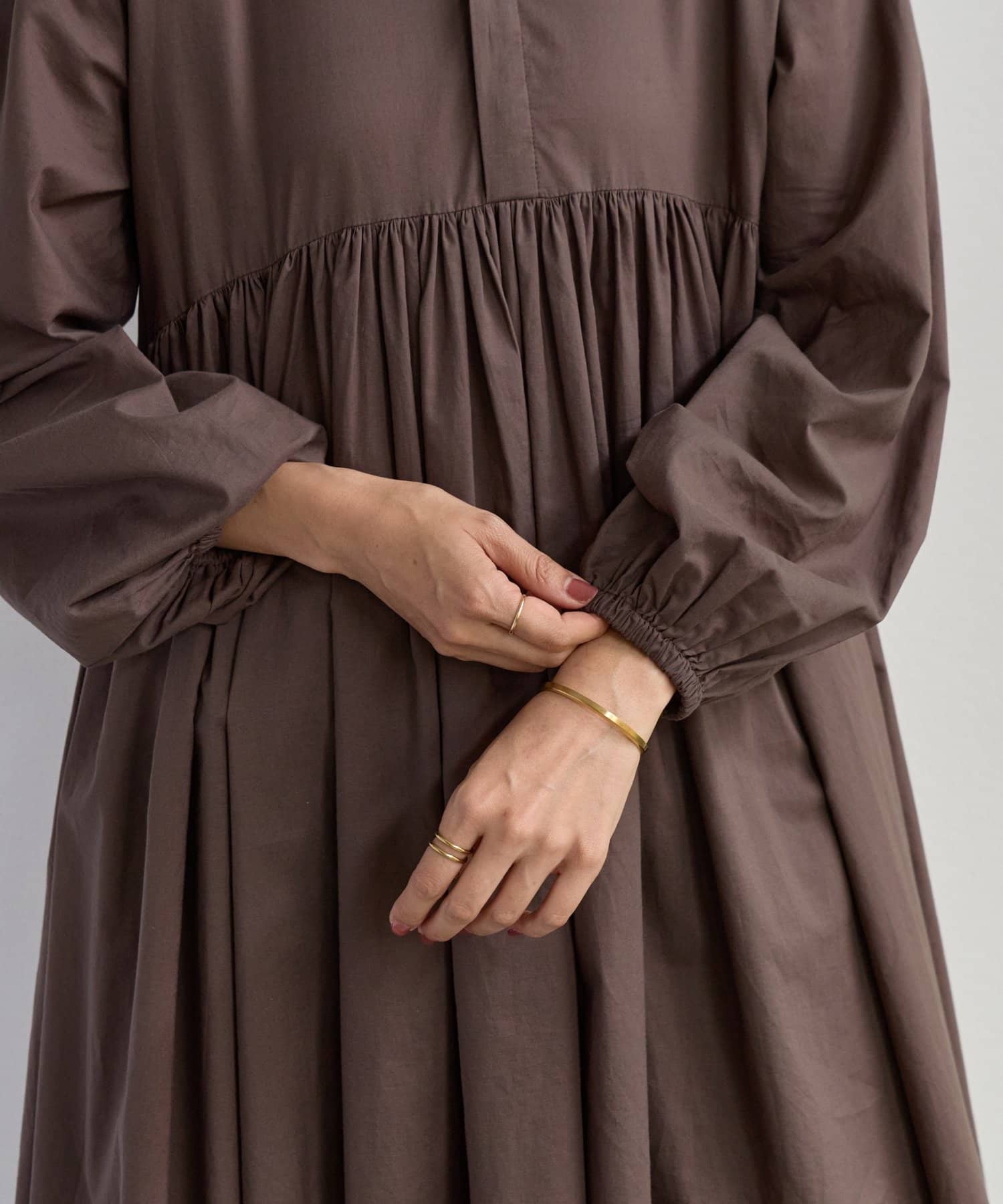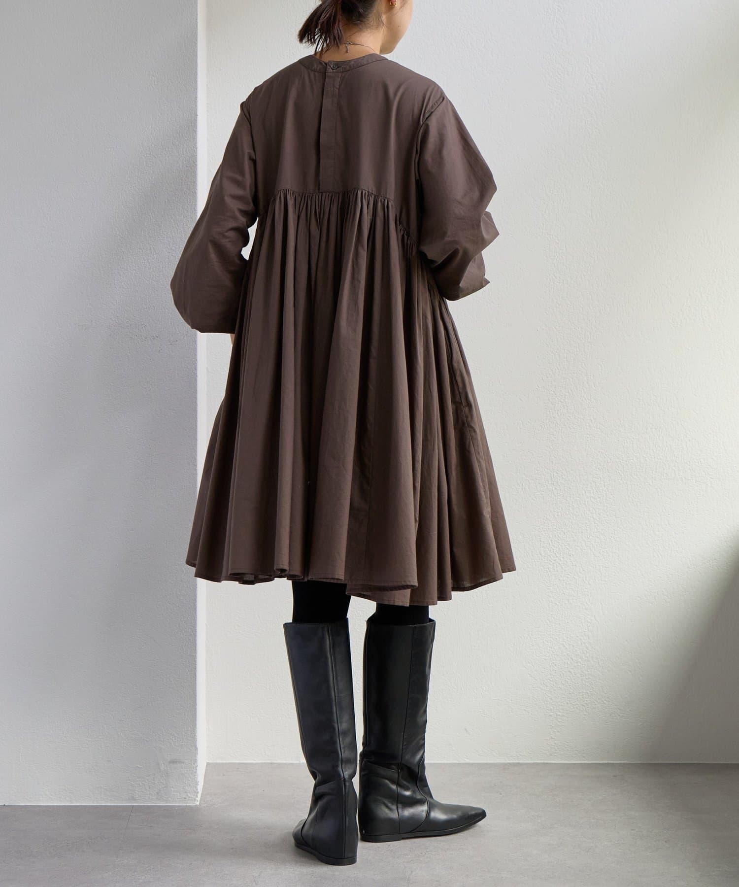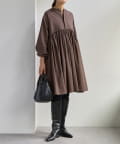 胸元をラウンドカットし、ギャザーをたっぷり寄せて、女性らしいデザインに。