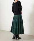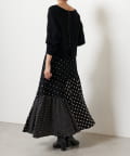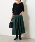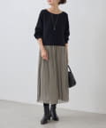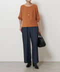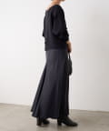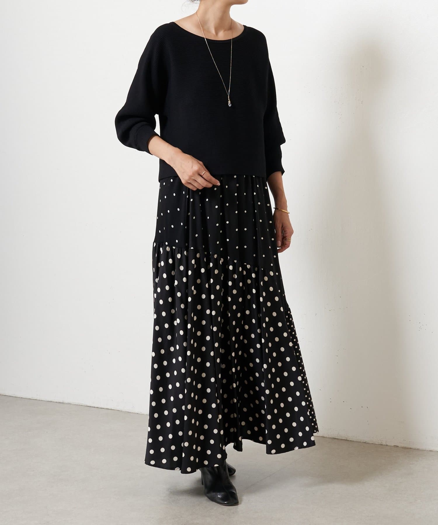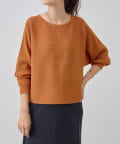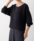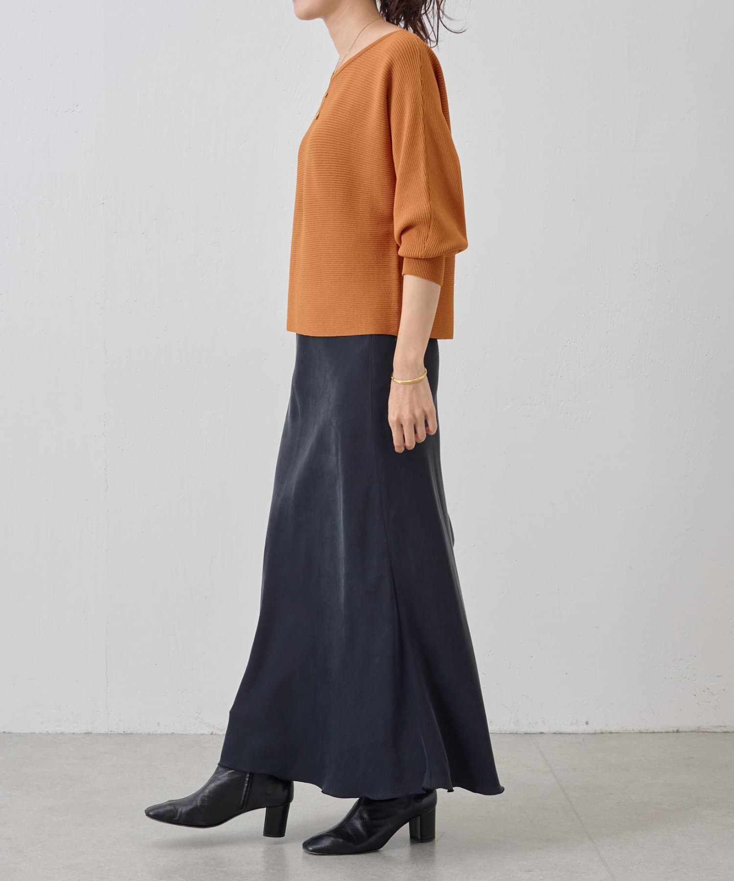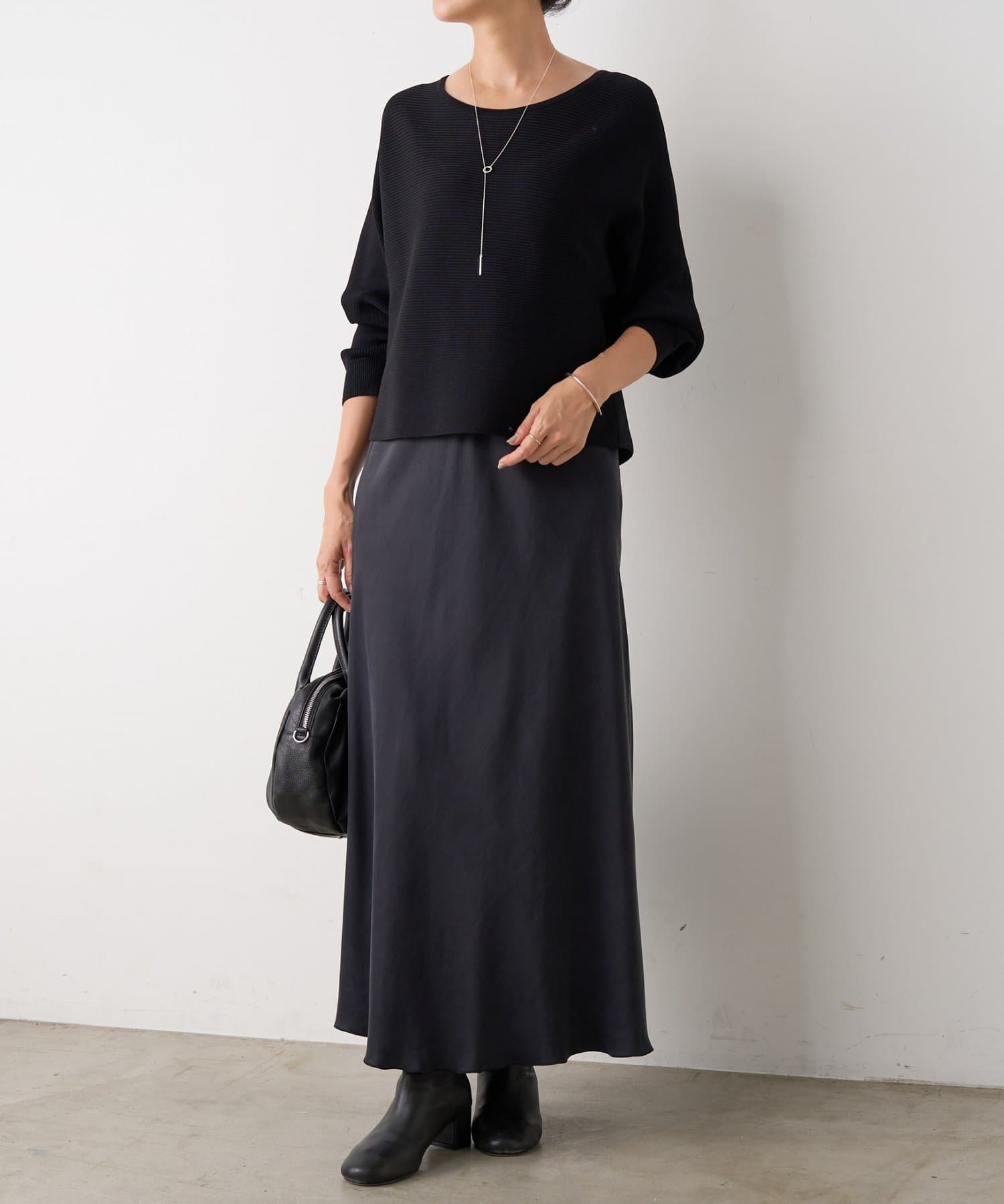 ドルマンスリーブで腕のラインは拾わず、しっとりと落ち感があるので女性らしい印象に。