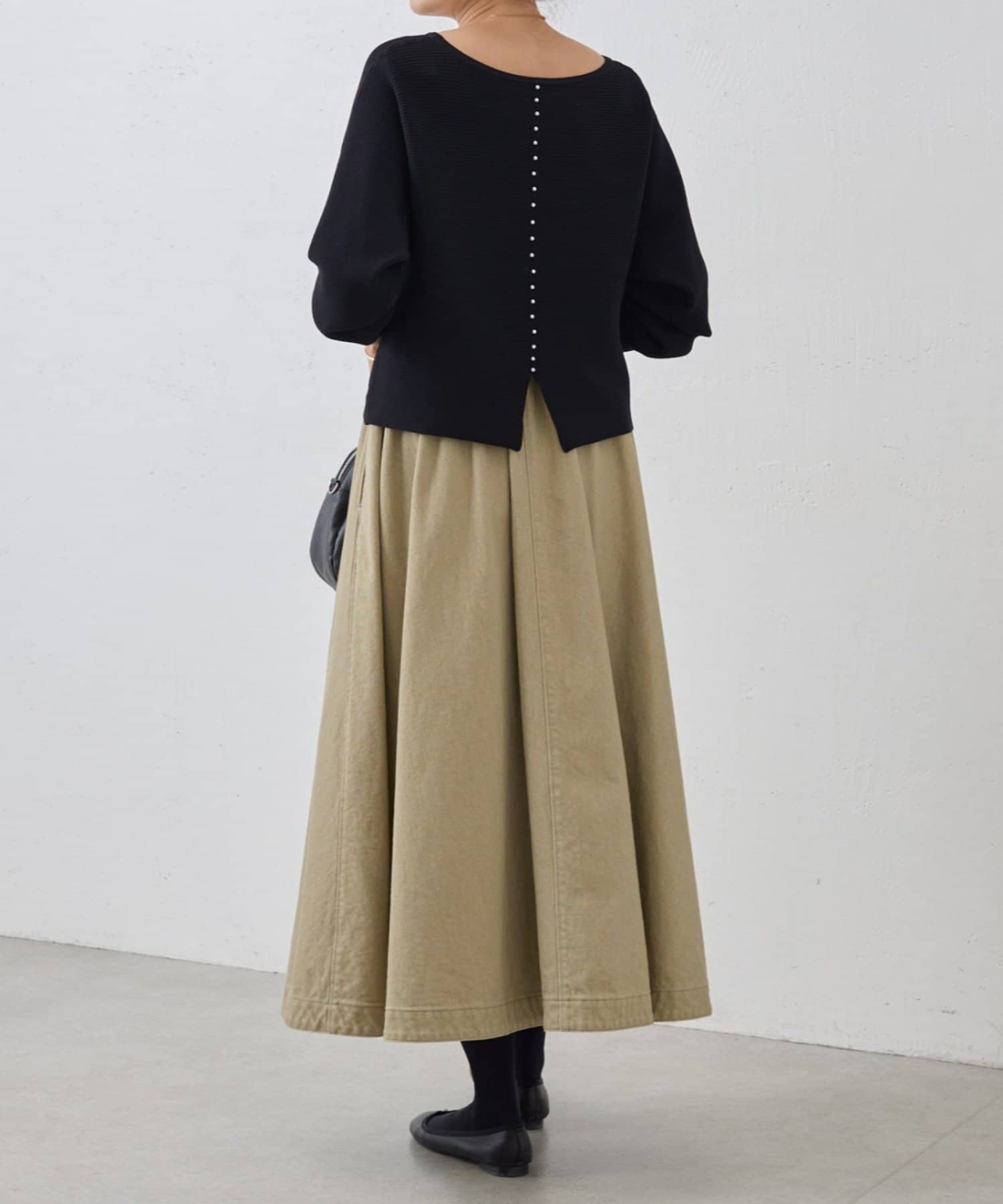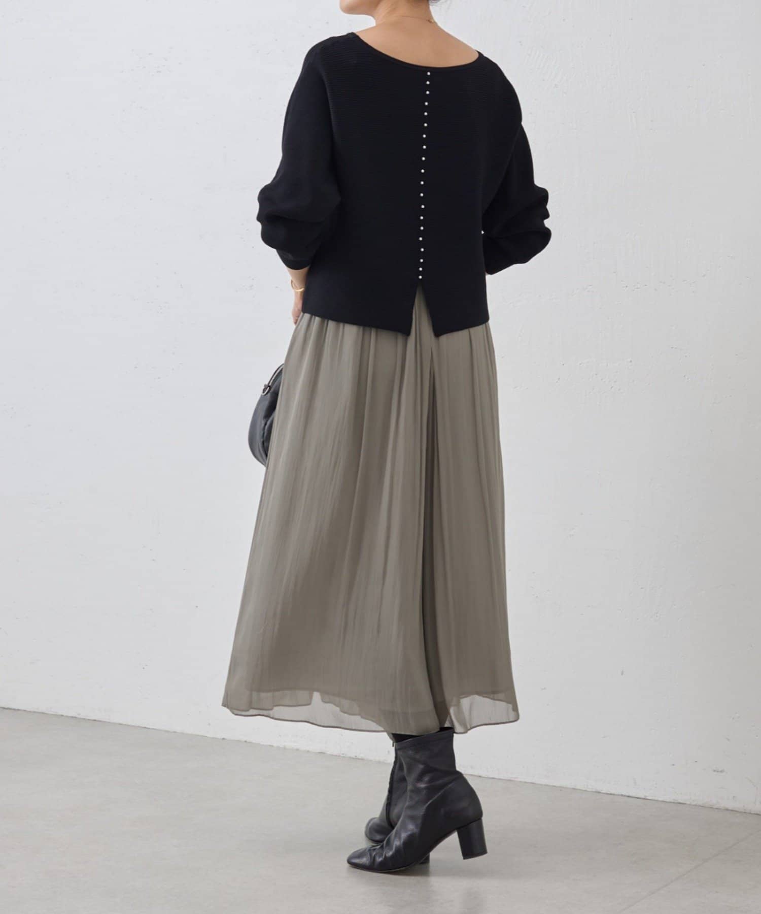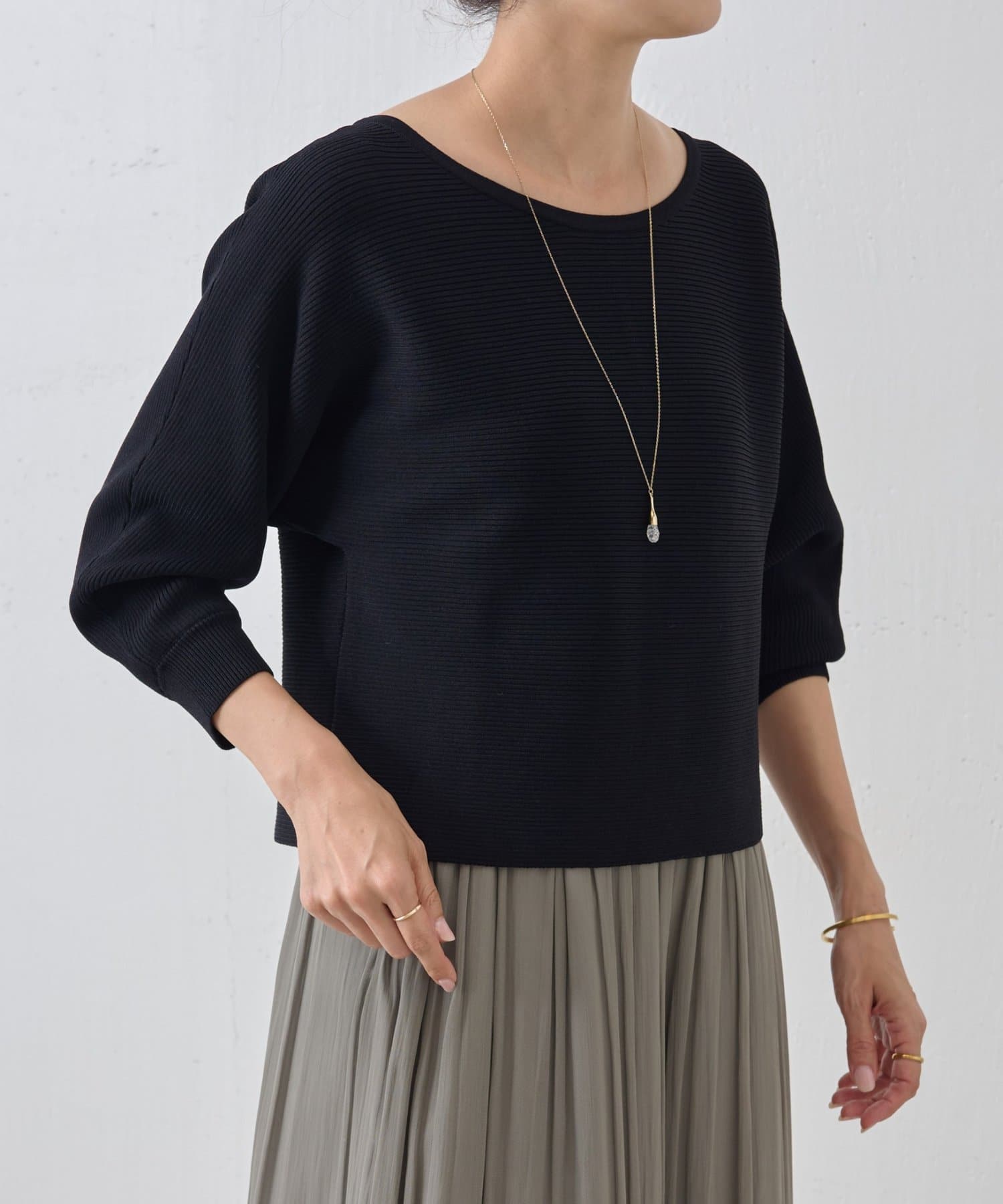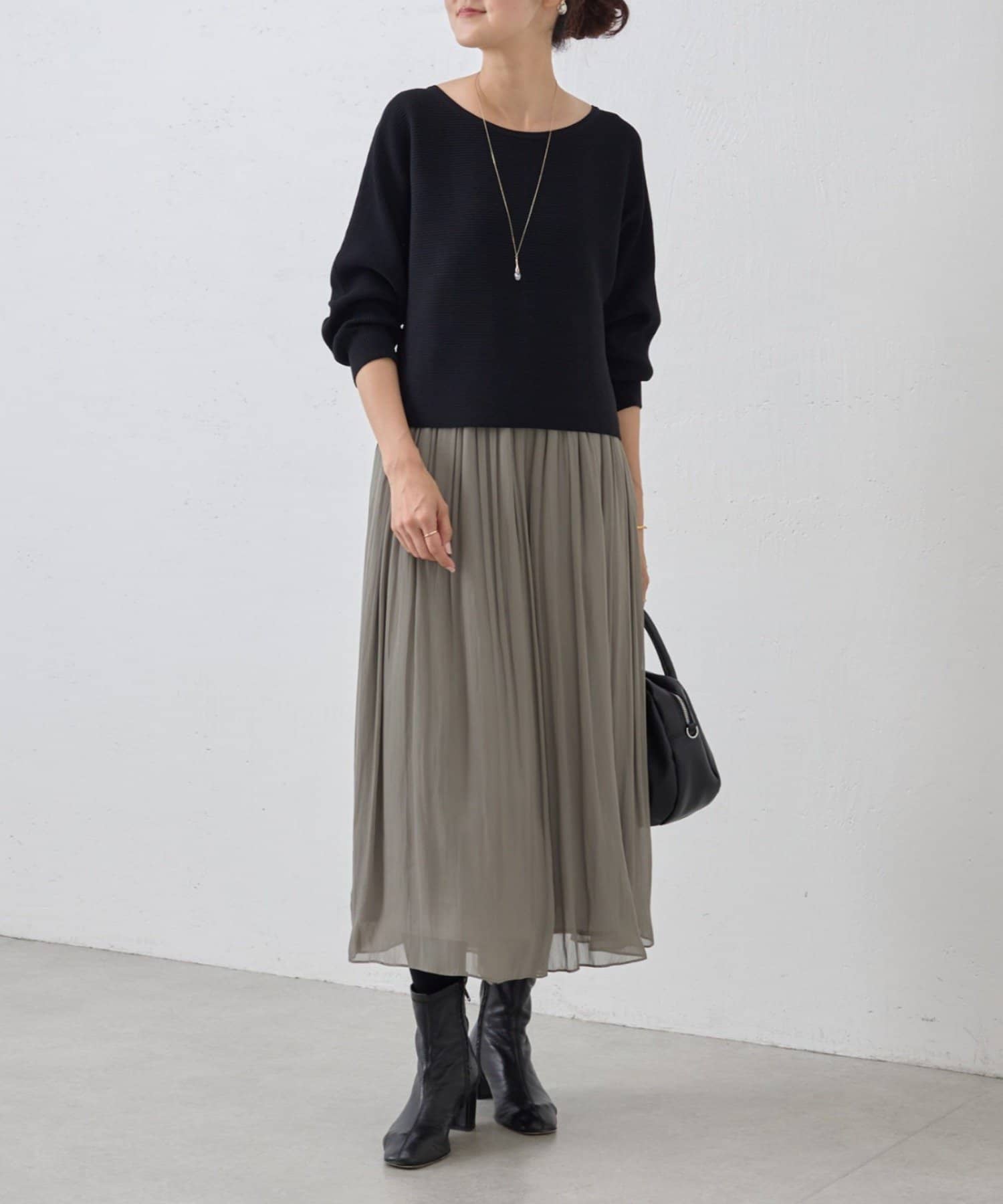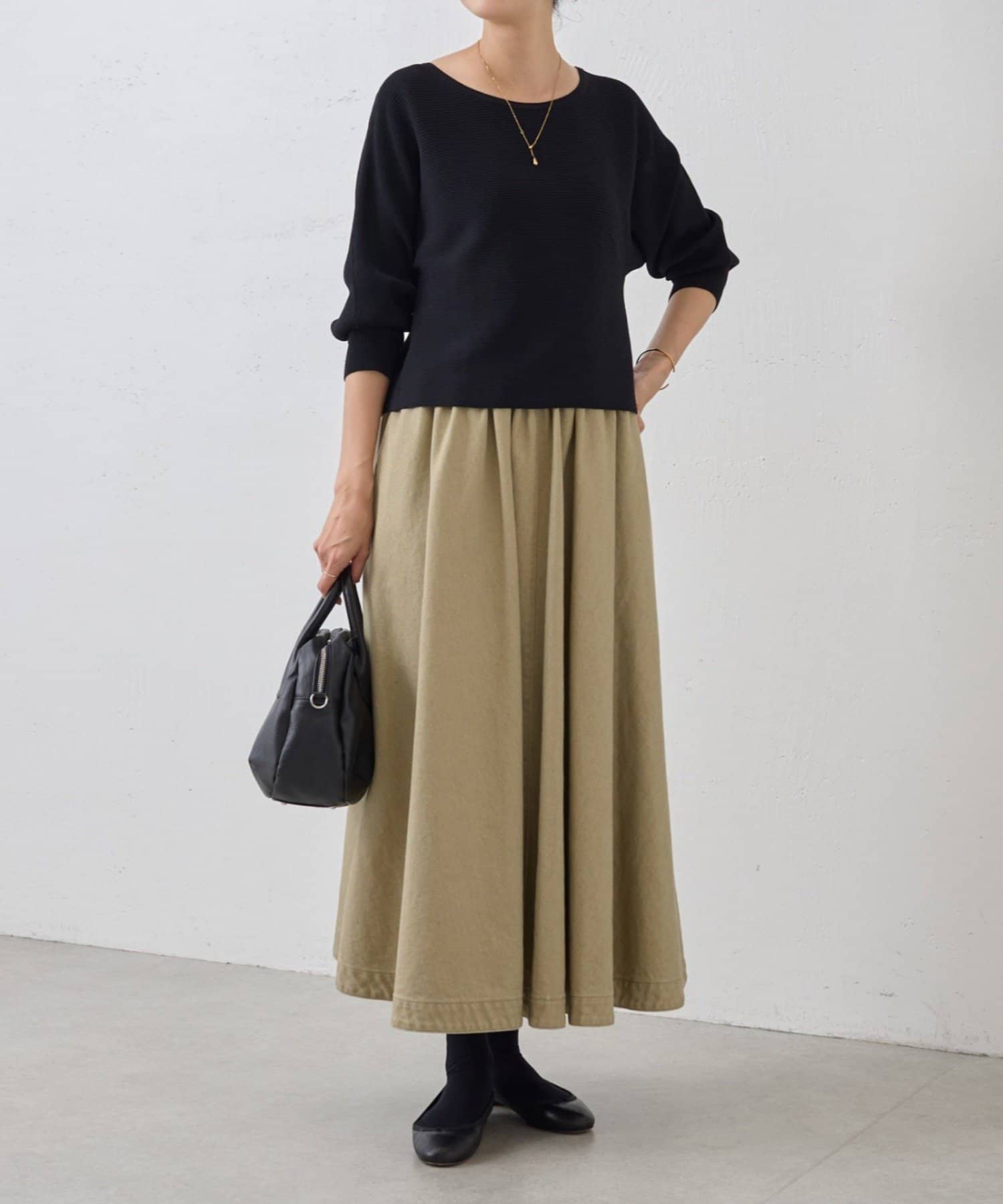 ニュアンスのあるボートネックは程よい抜け感で、デコルテラインを綺麗に見せてくれます。
