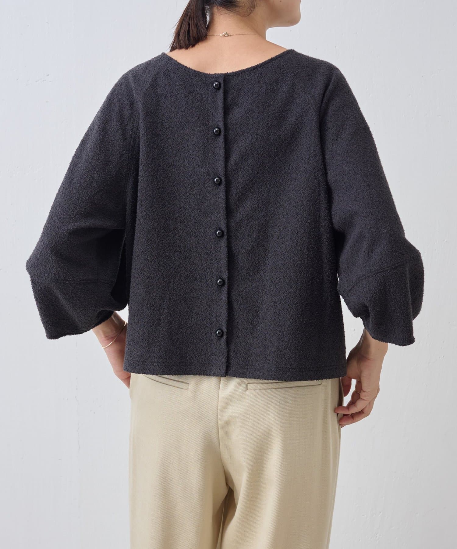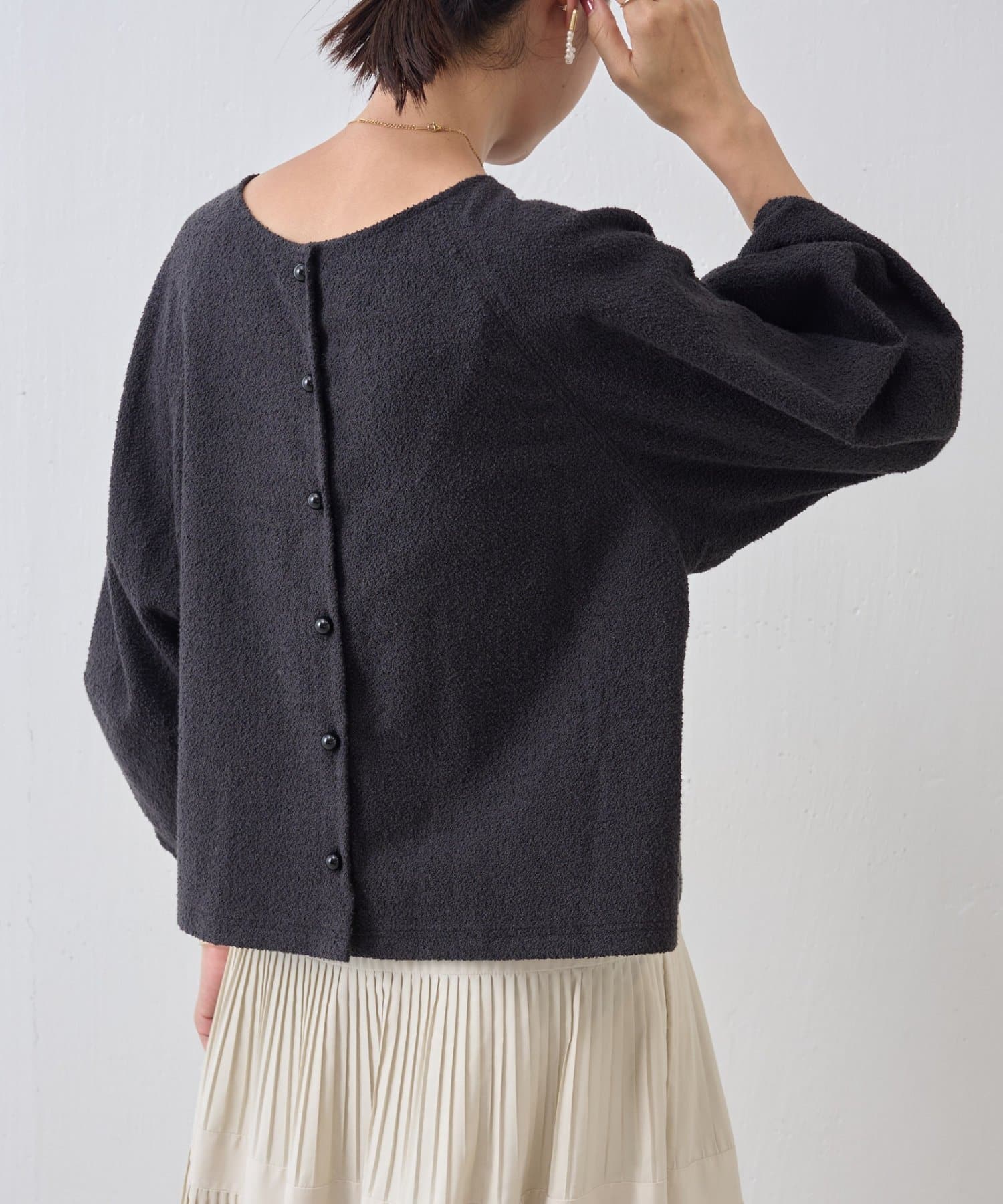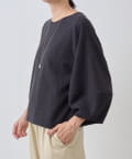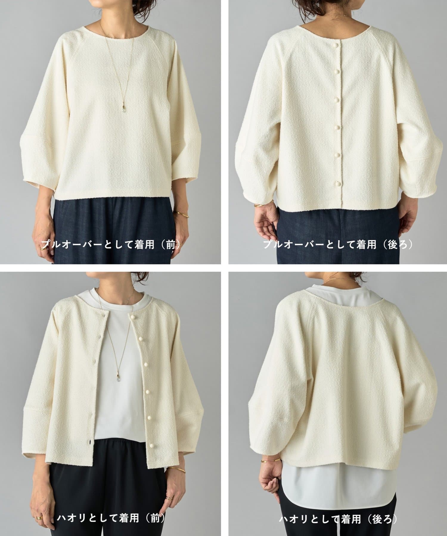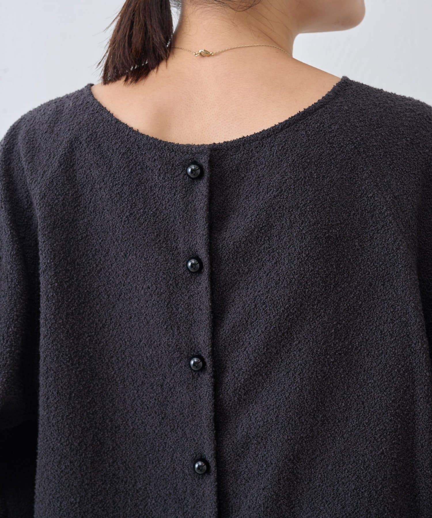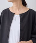 ボタン側を後ろにすればシンプルなクルーネックトップスとして、ボタン側を前にすれば軽やかなカーディガン感覚で着用可能。