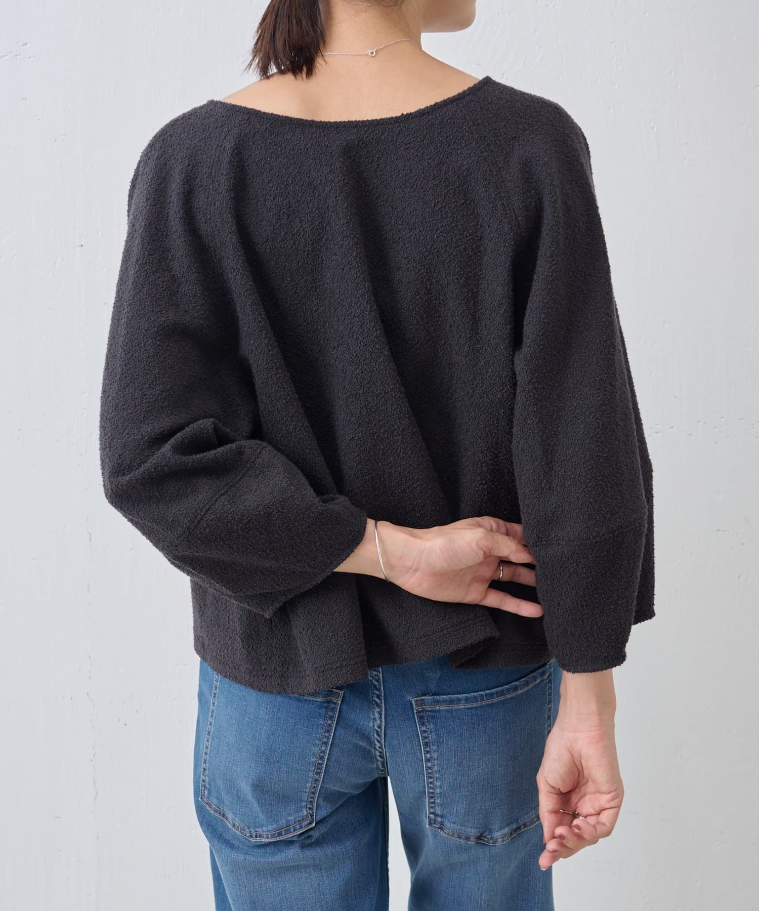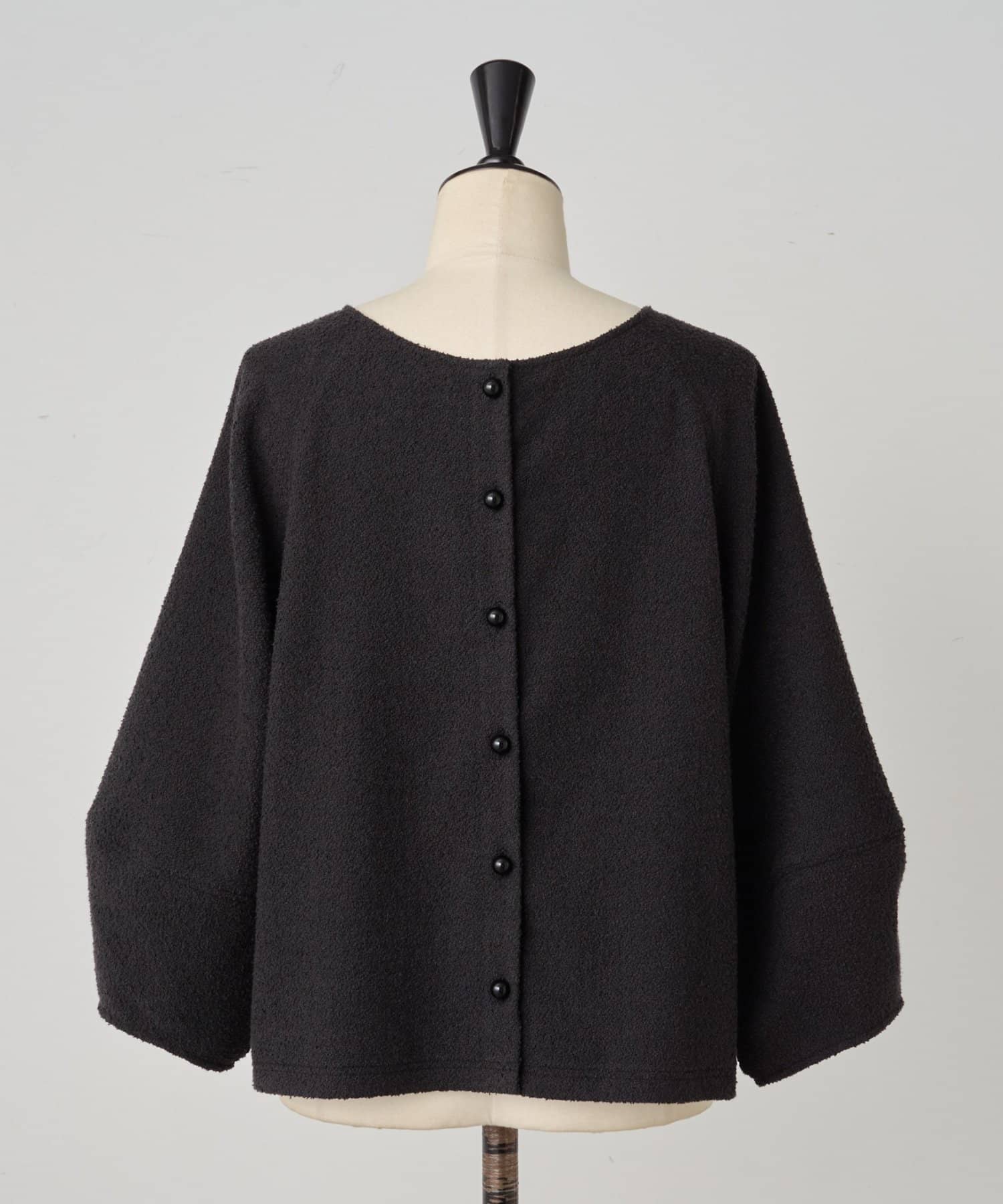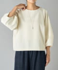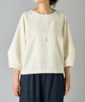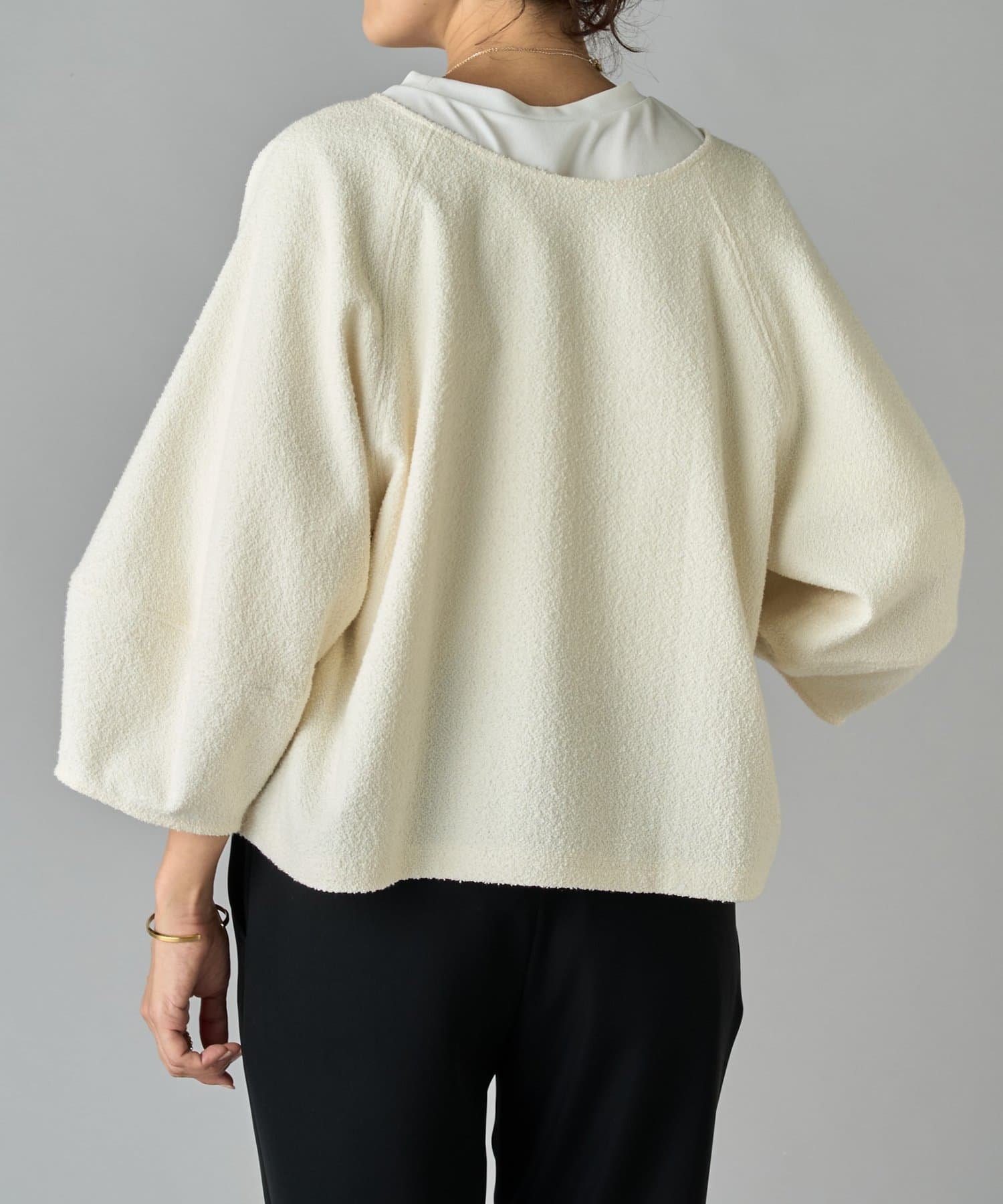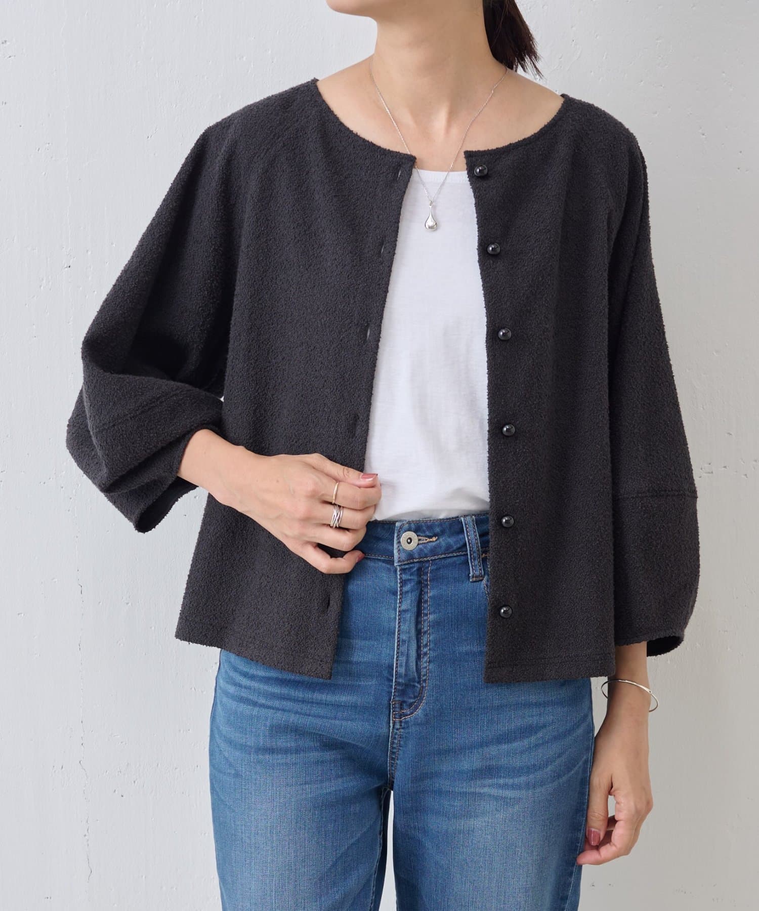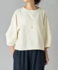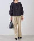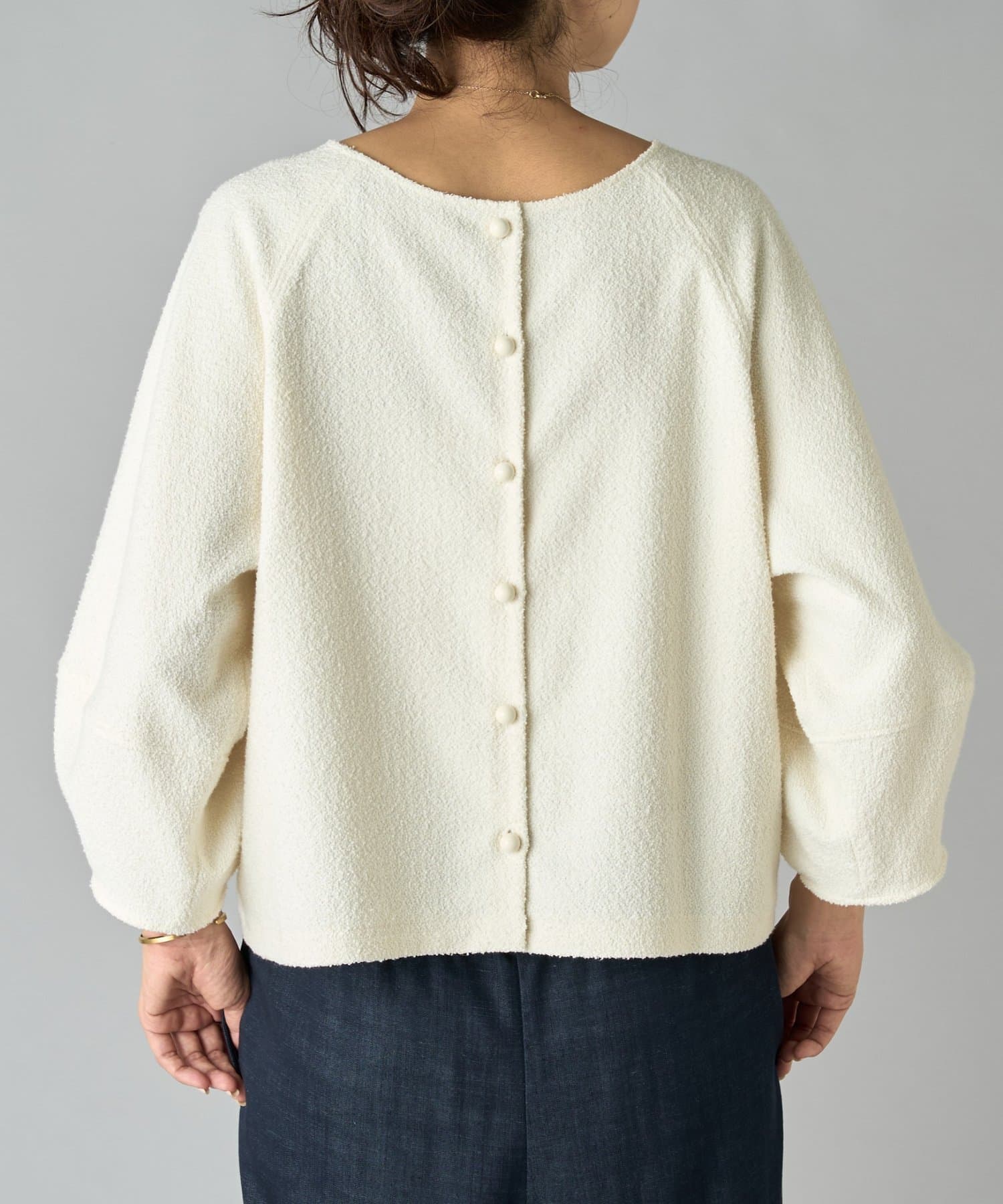 ボタン側を後ろにすればシンプルなクルーネックトップスとして、ボタン側を前にすれば軽やかなカーディガン感覚で着用可能。