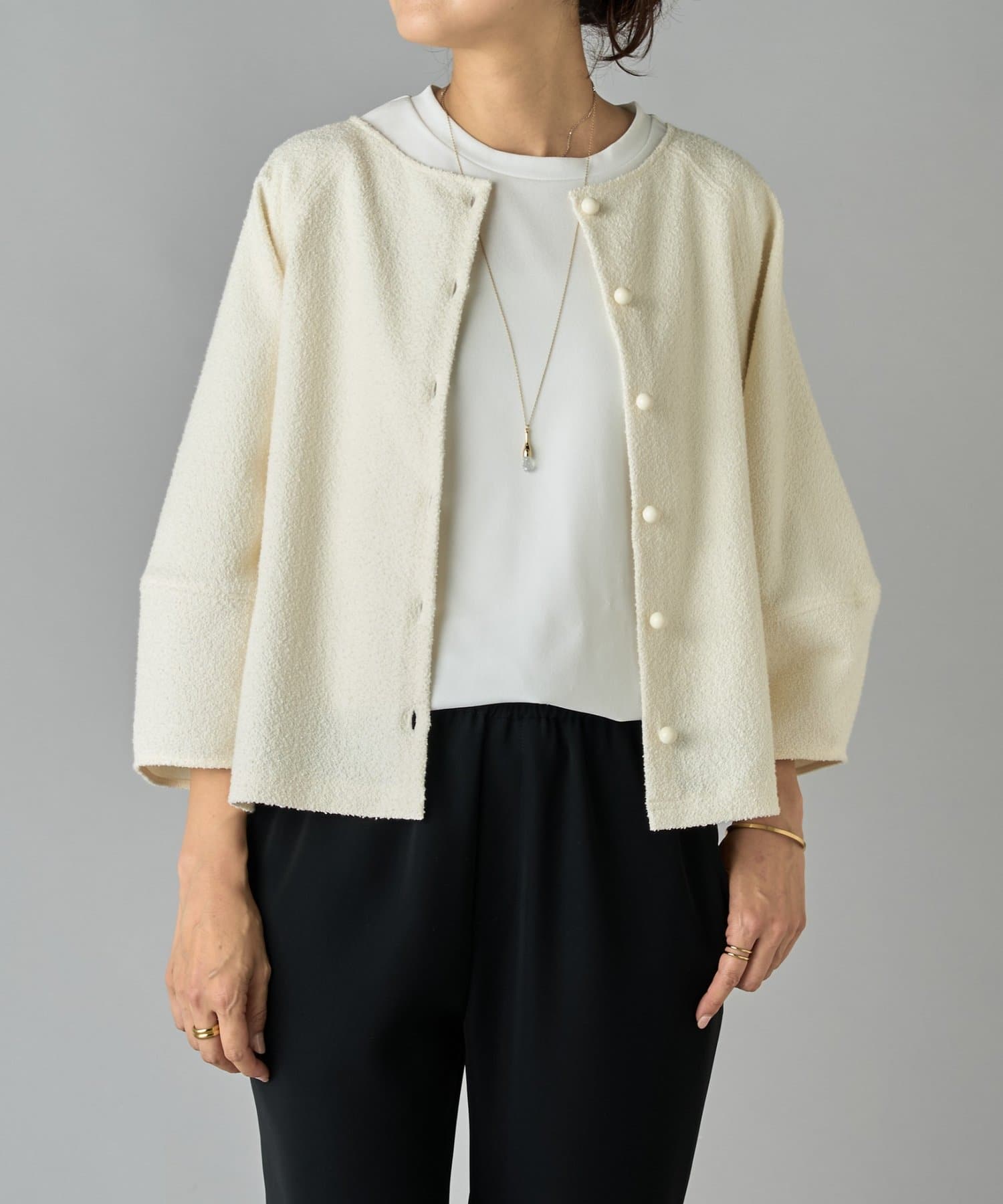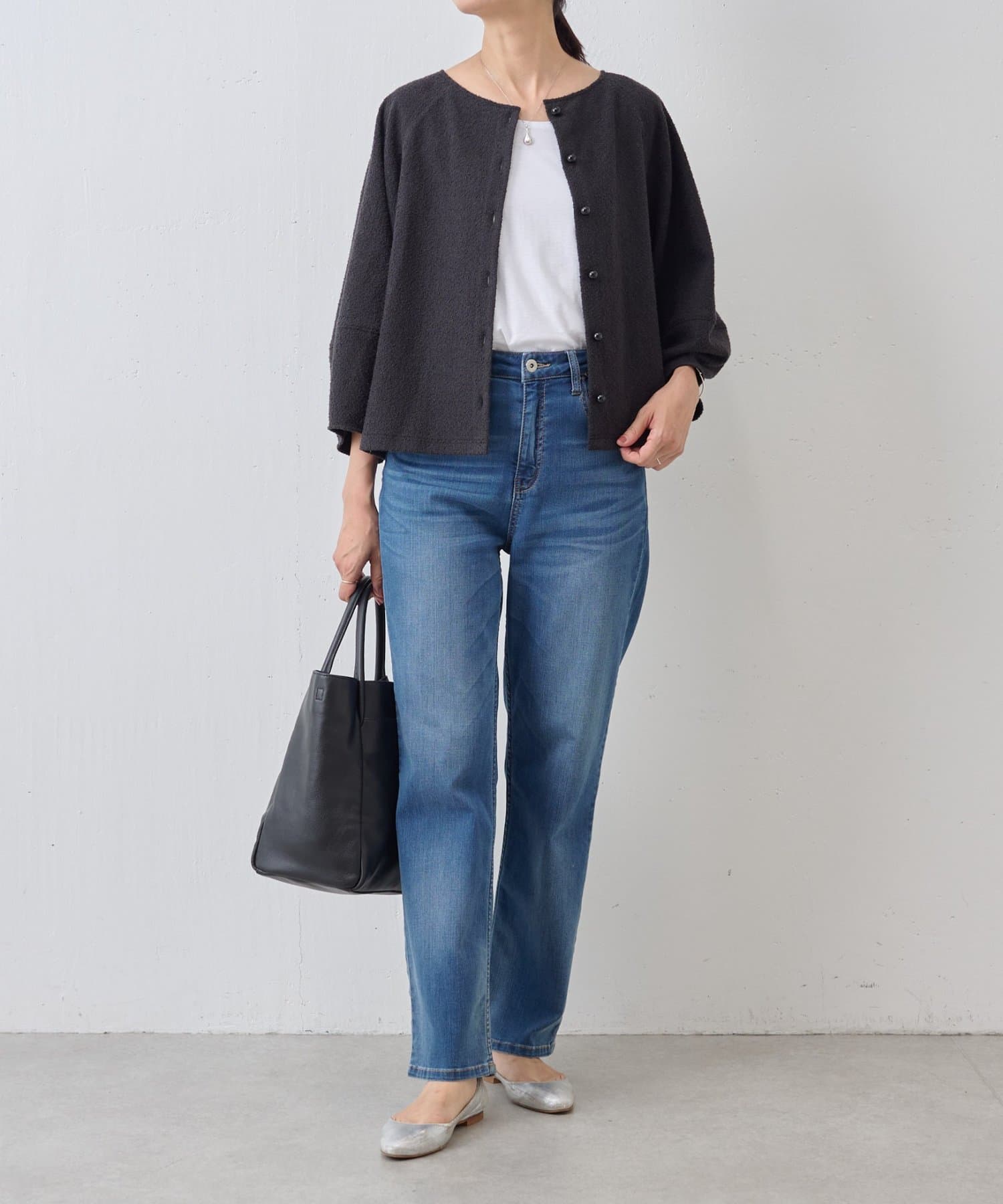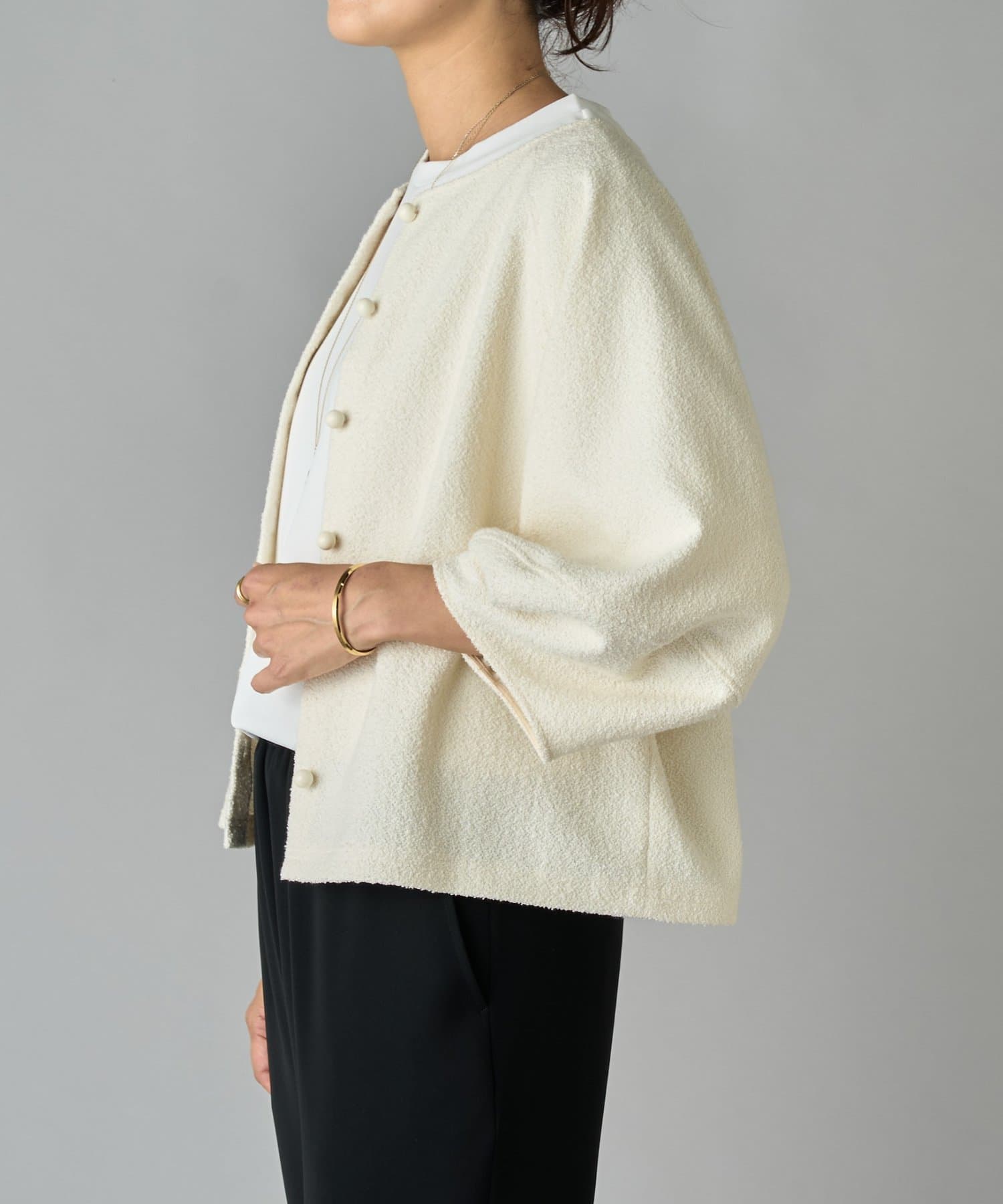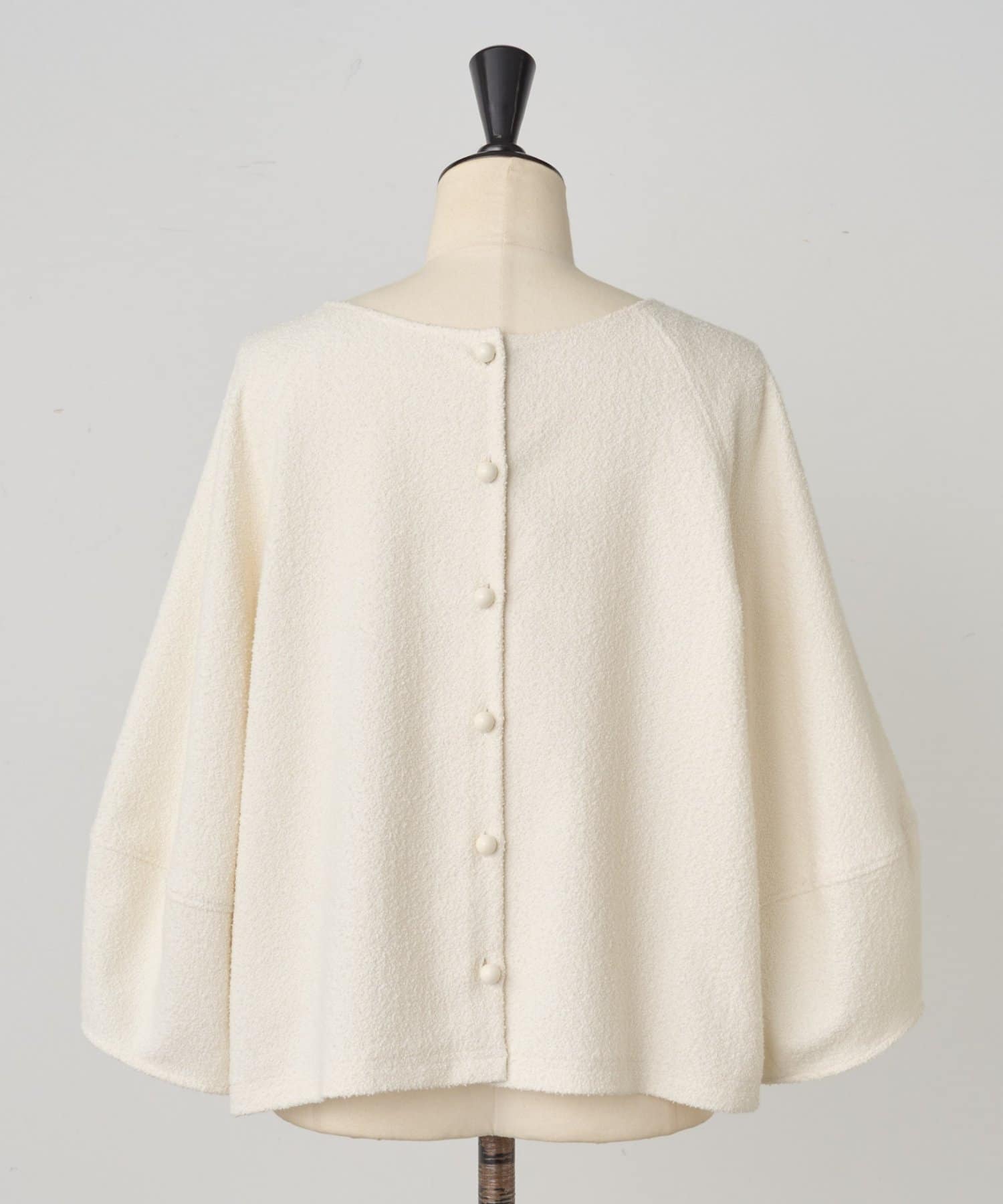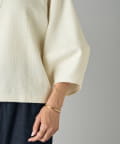 ボタン側を後ろにすればシンプルなクルーネックトップスとして、ボタン側を前にすれば軽やかなカーディガン感覚で着用可能。