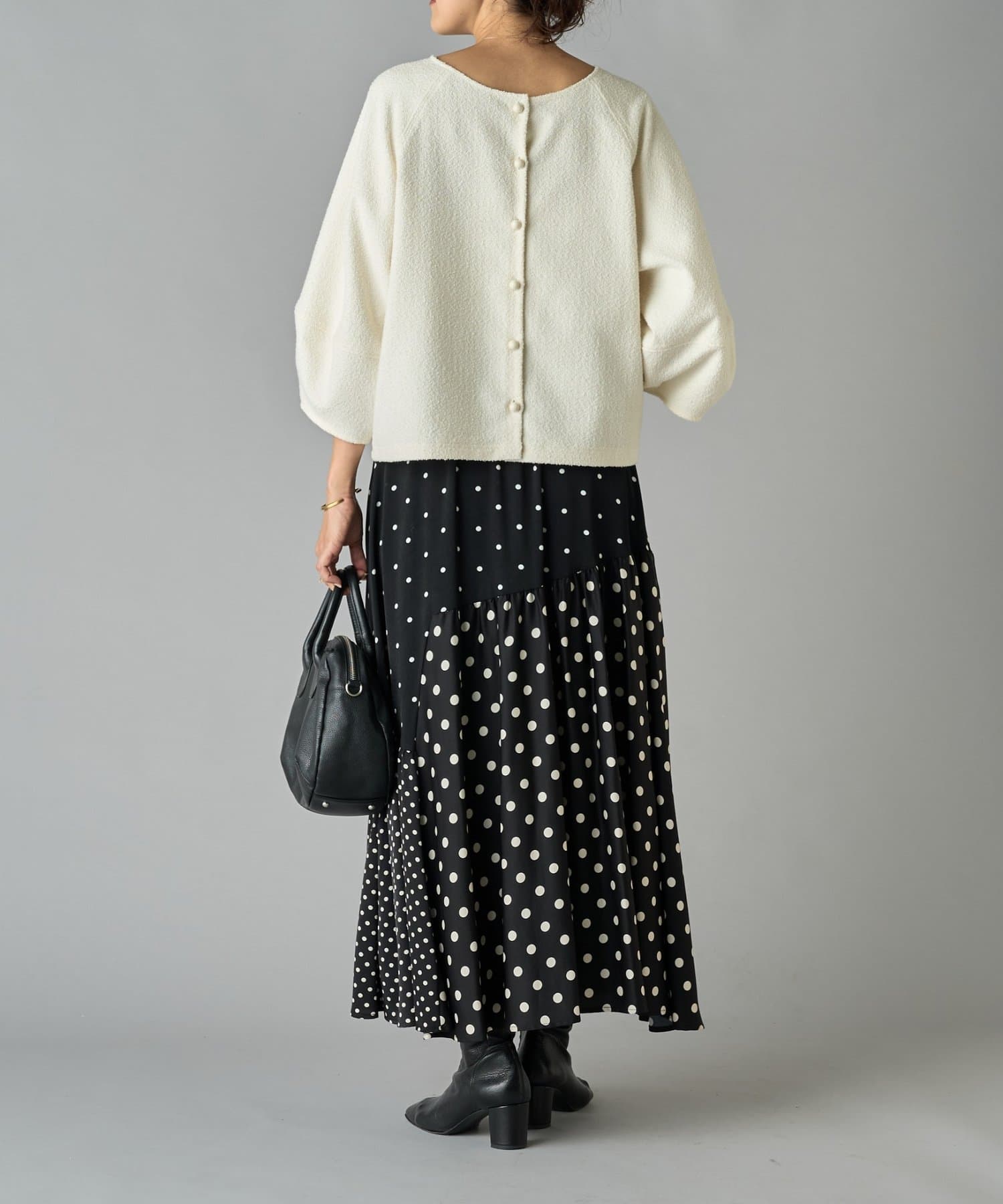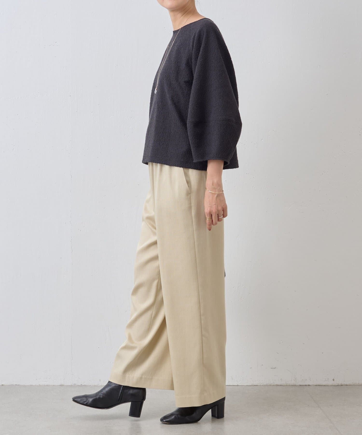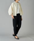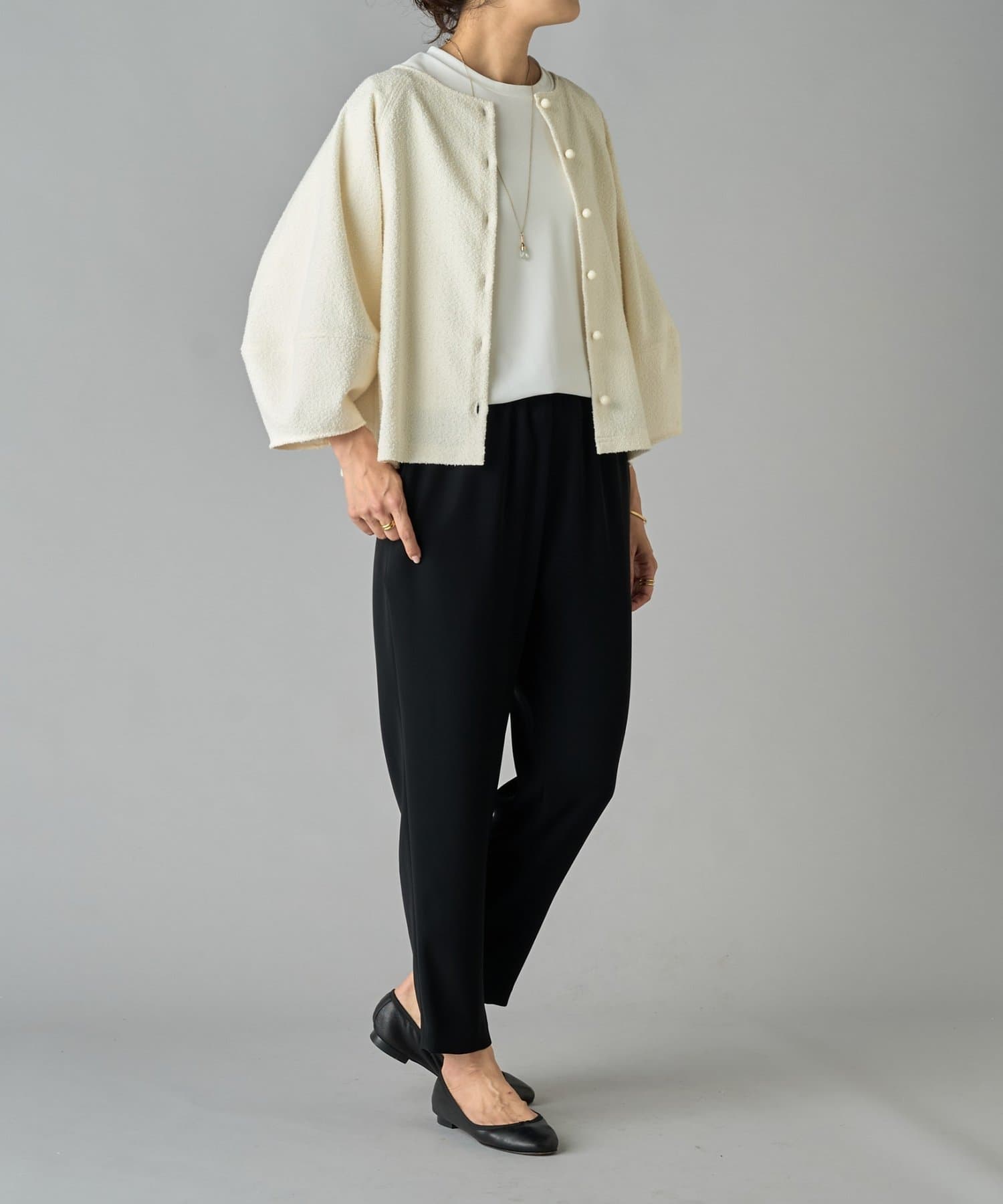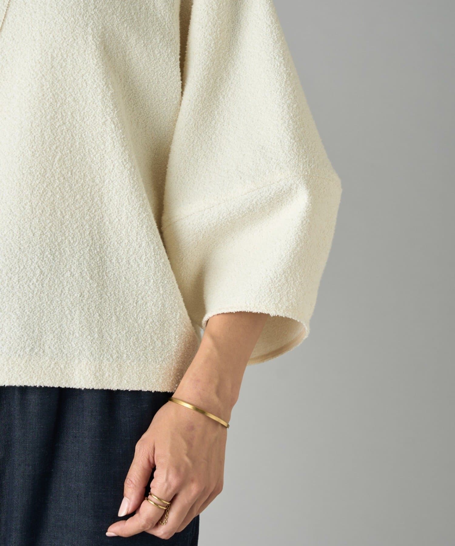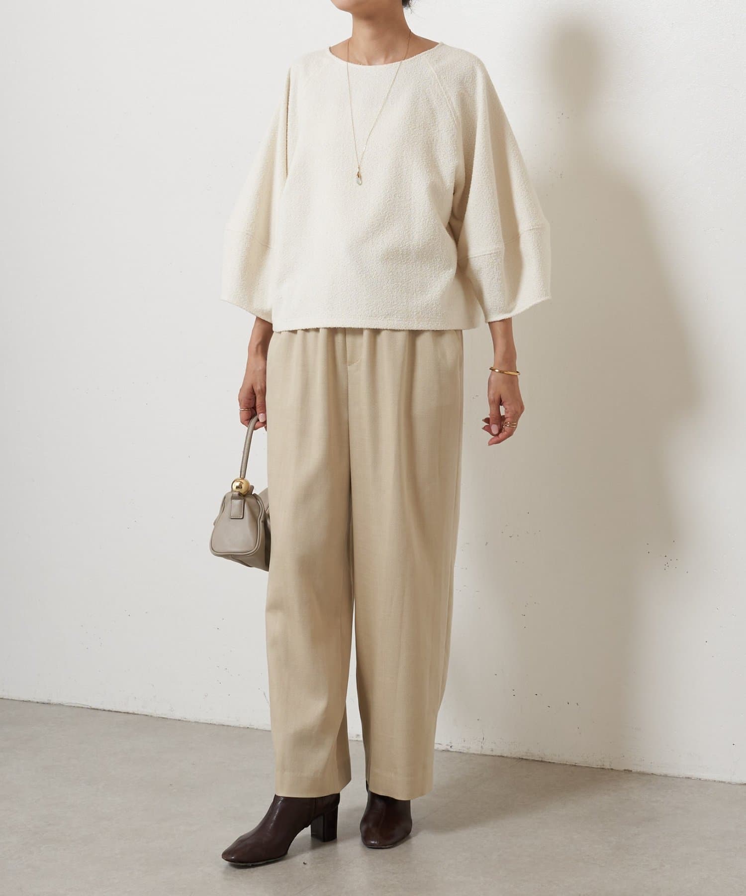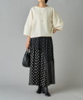 程よいボリューム感のある袖が女性らしい柔らかな印象を演出し、短めの着丈でボトムスとのバランスも◎