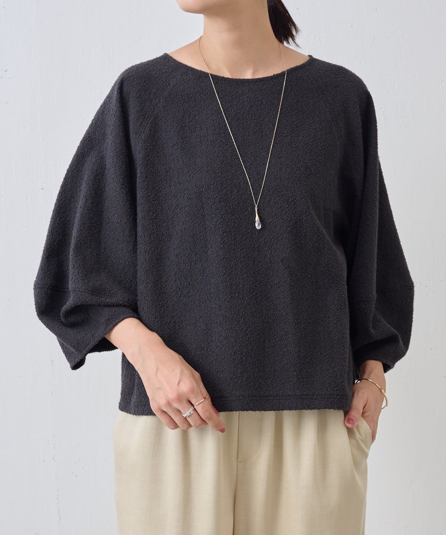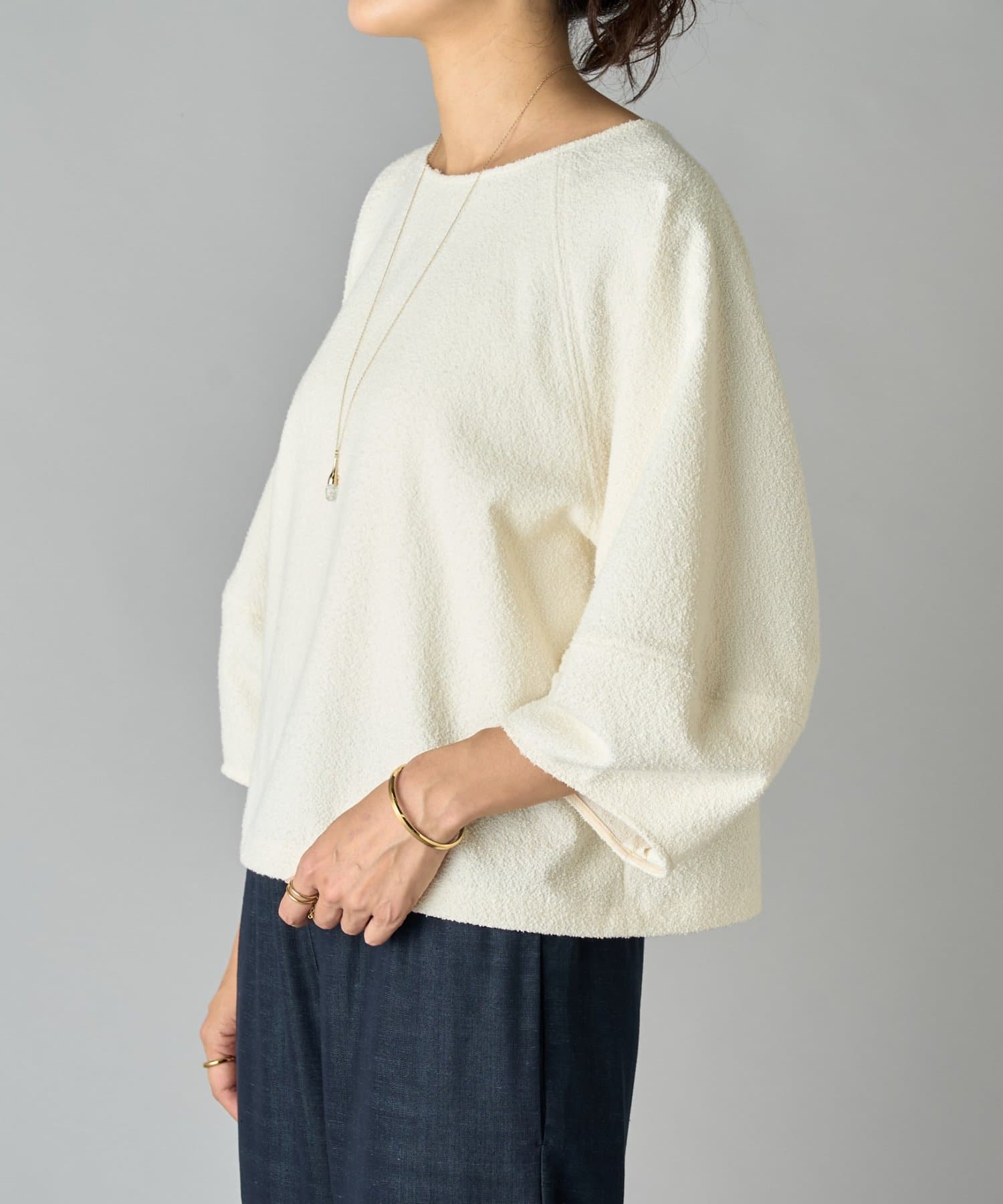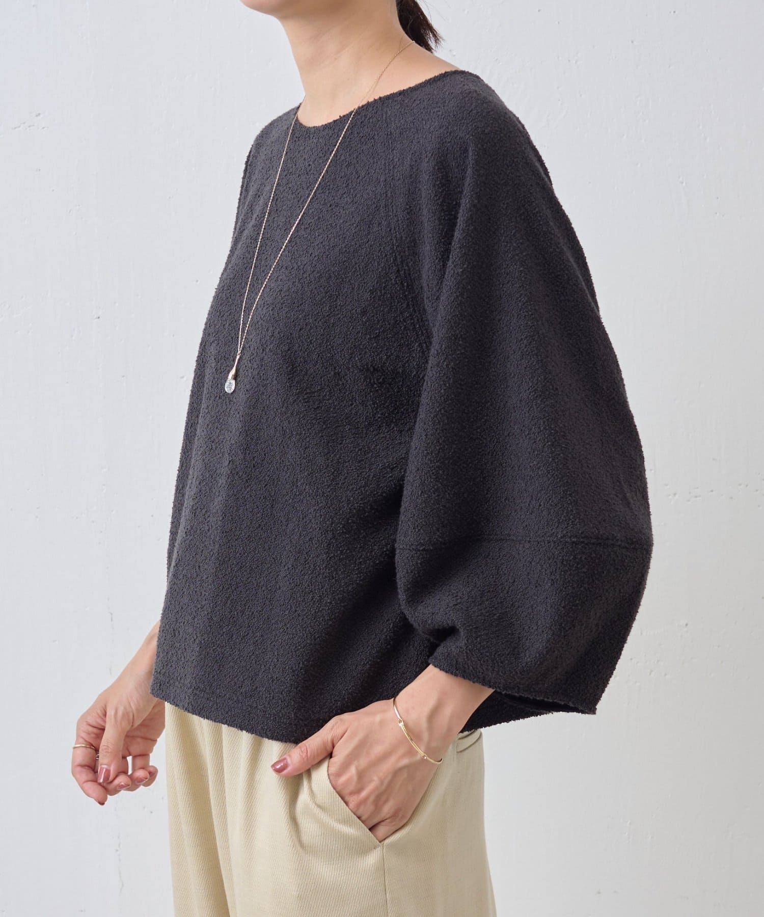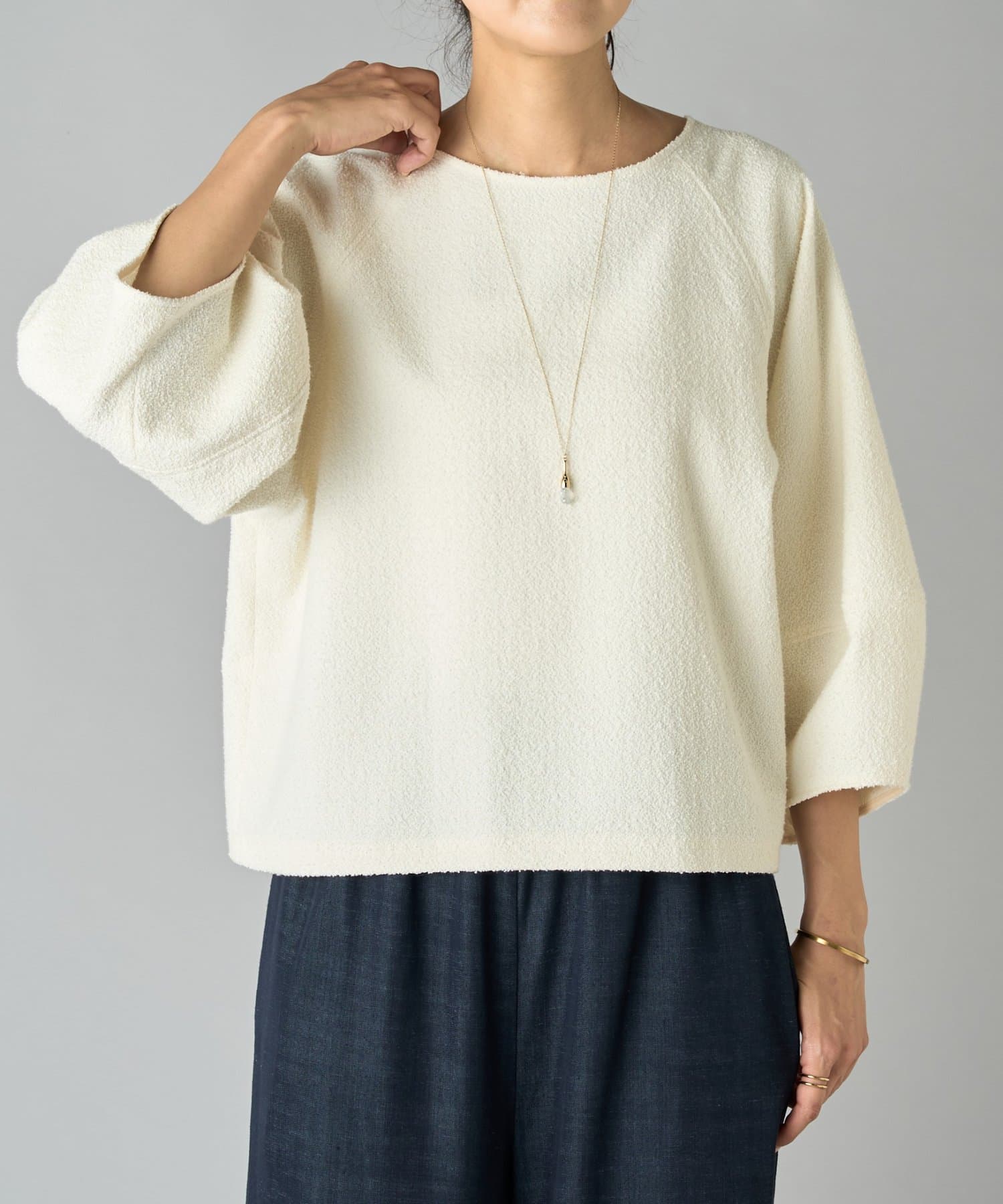 表情のあるミニループ素材を使用したショート丈のプルオーバー。