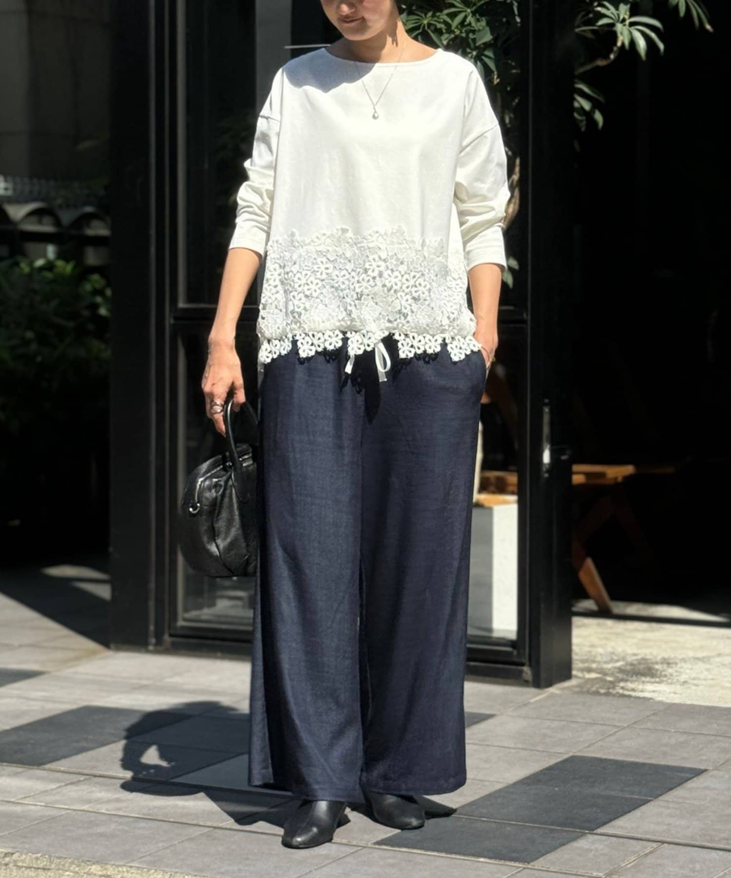 裾の絞りとレースがフェミニンな印象を添えるカットソー。