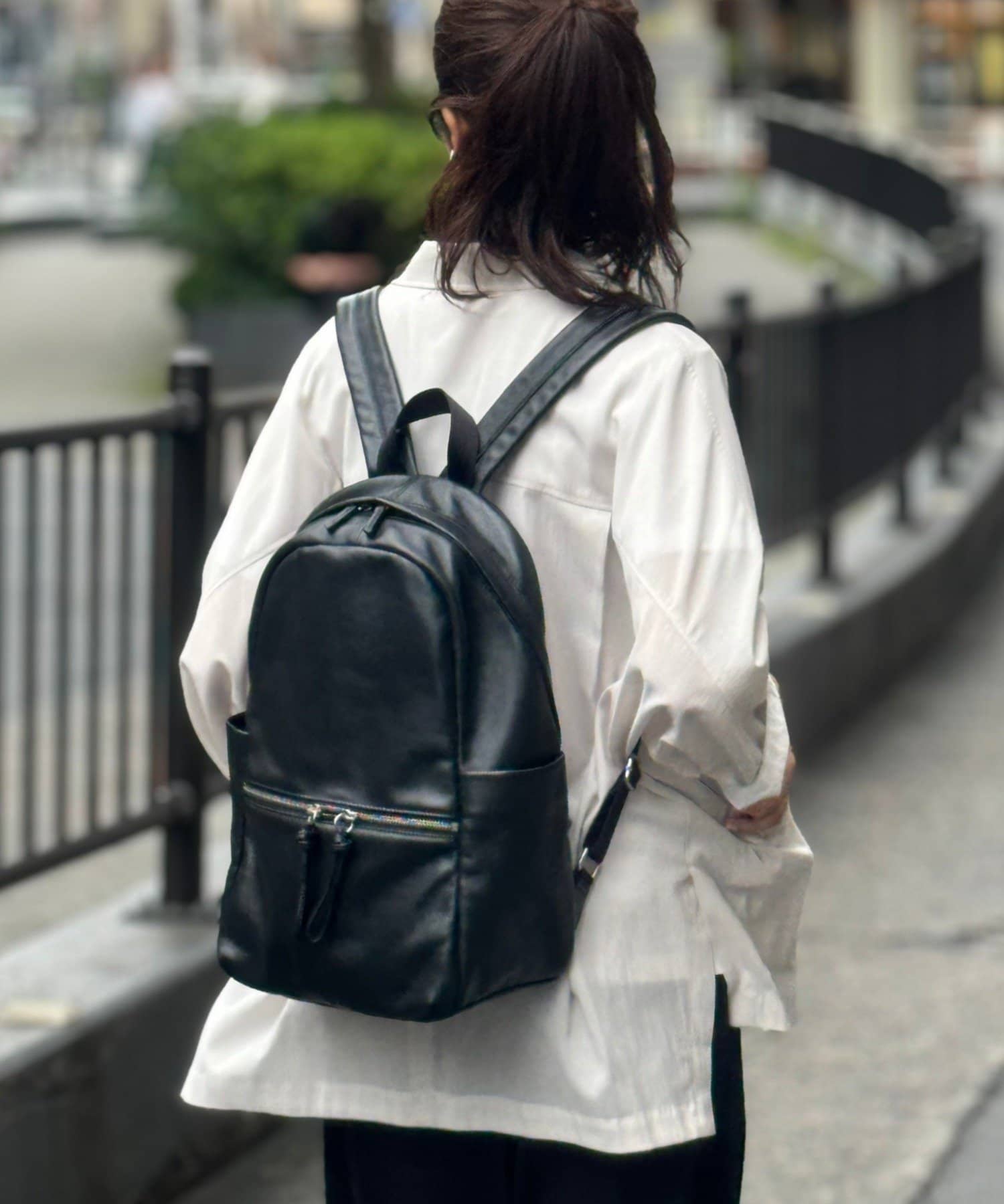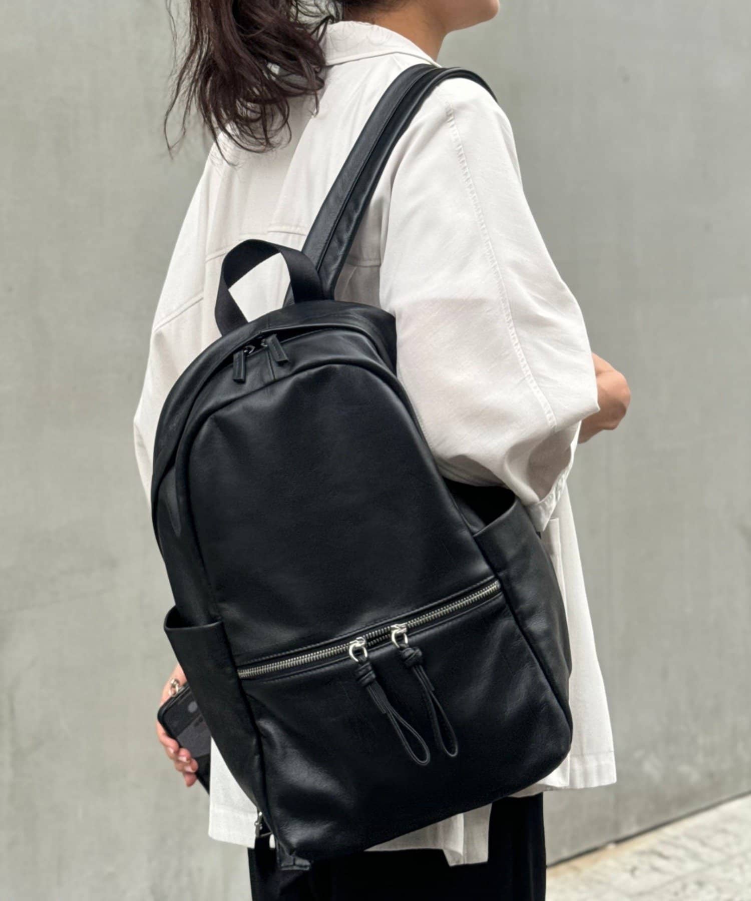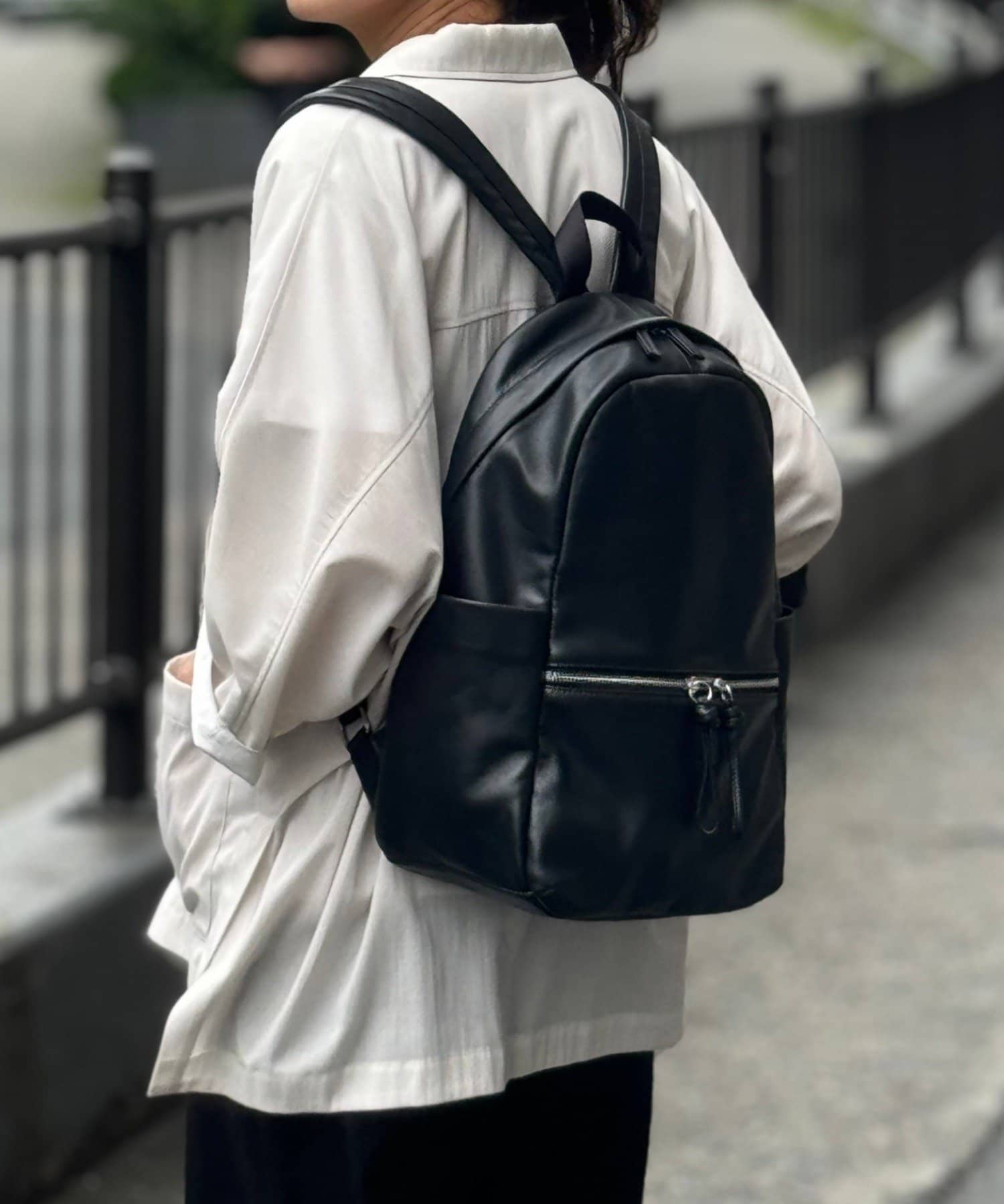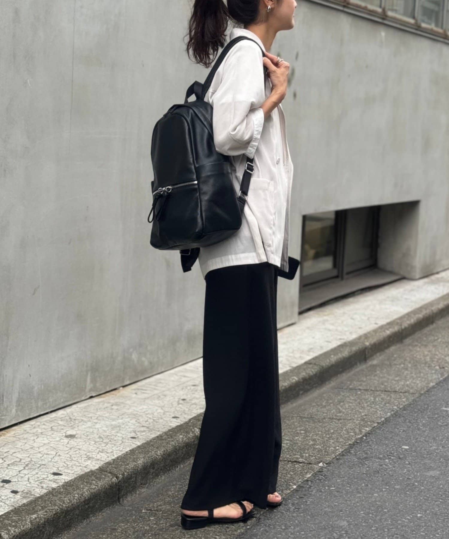洗練されたミニマルデザインで、きれいめカジュアルからナチュラルスタイルまで、さまざまなコーデにマッチするレザーリュック。
