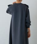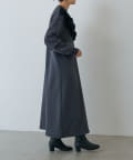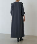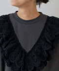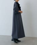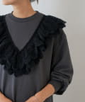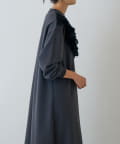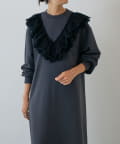衿元はVネックですっきりとしたデザインに、同系色のニットフリルで甘くなりすぎず落ち着いた印象に。