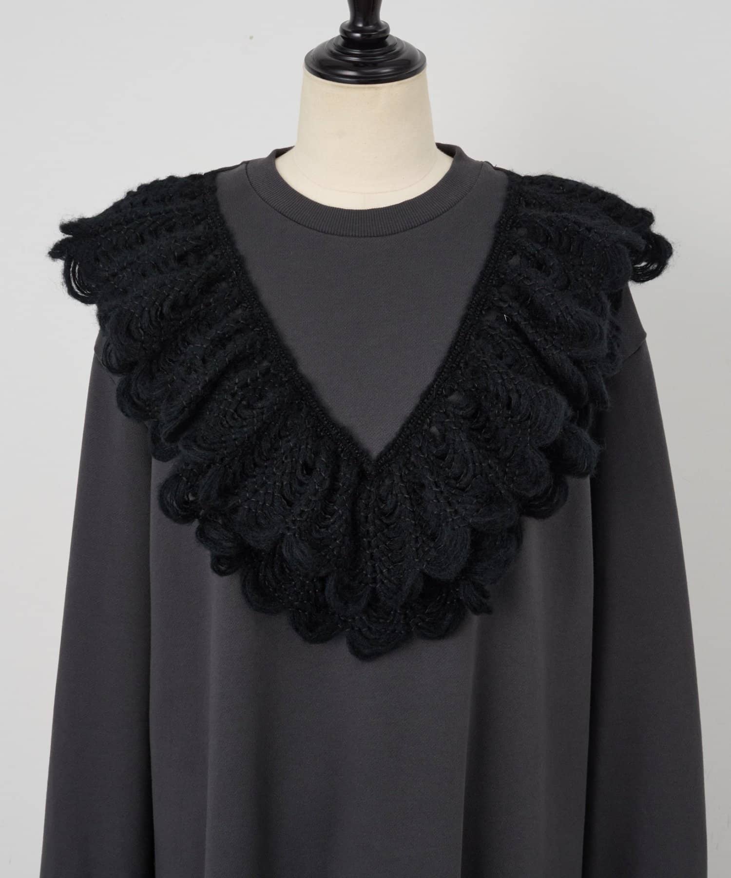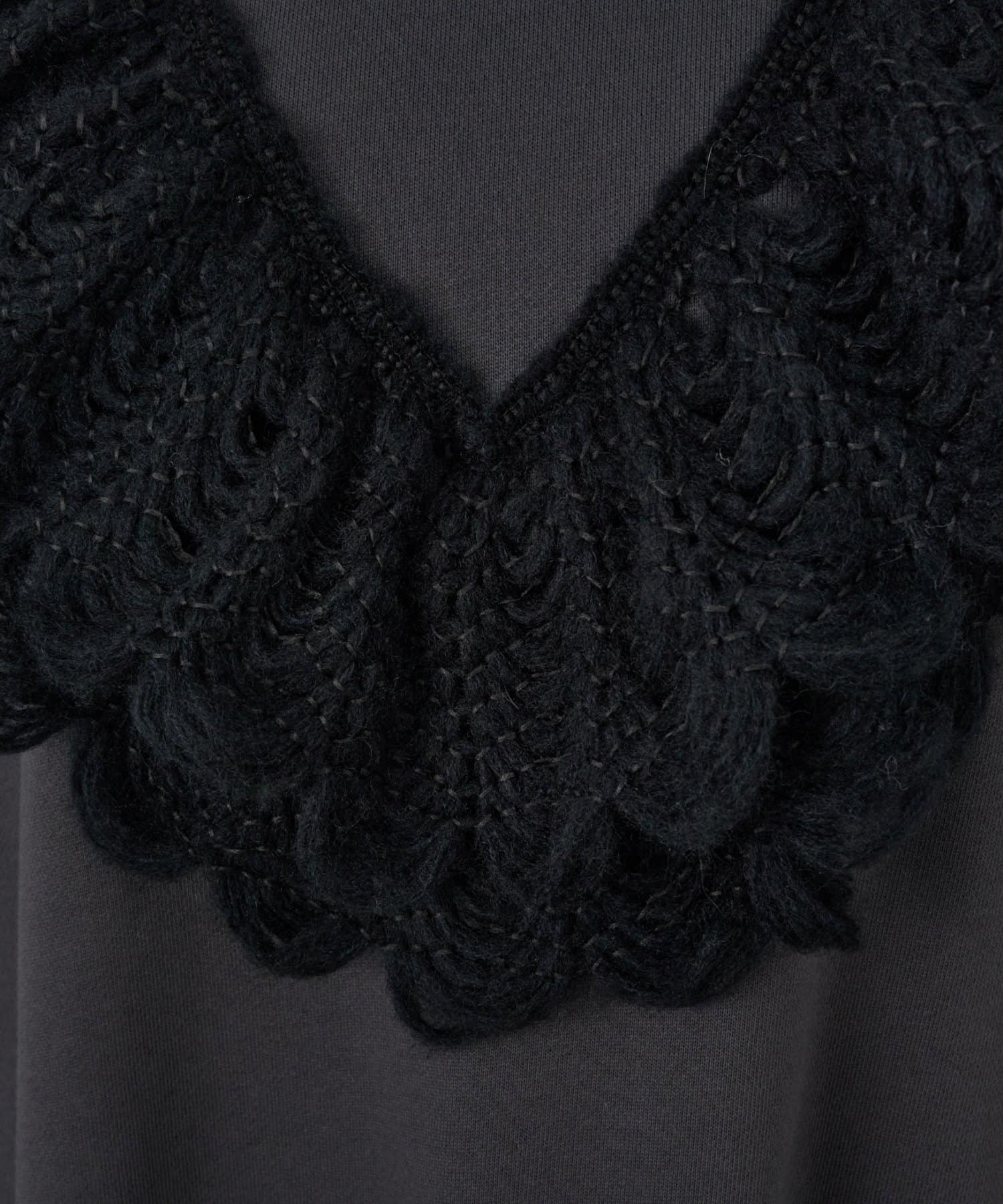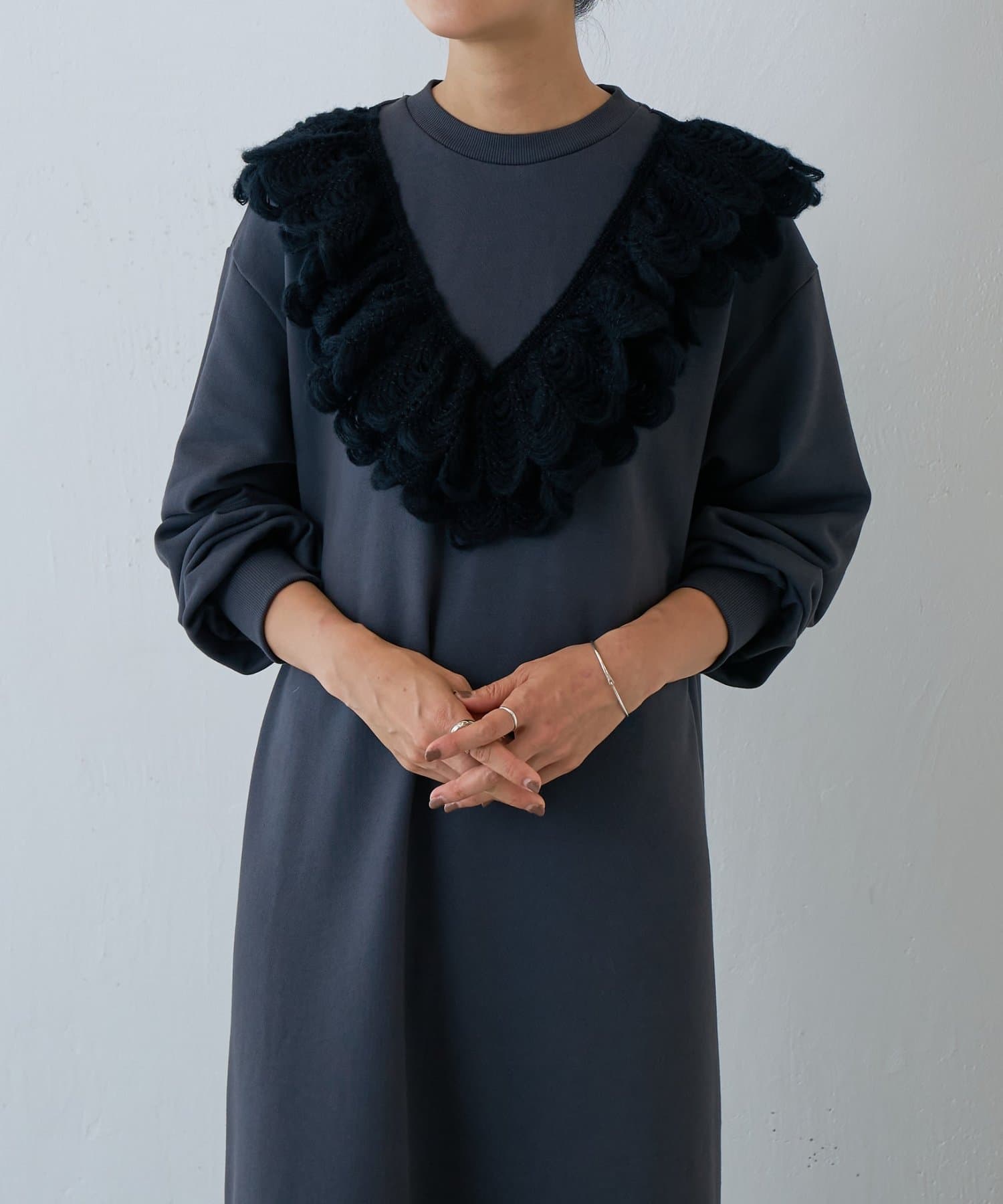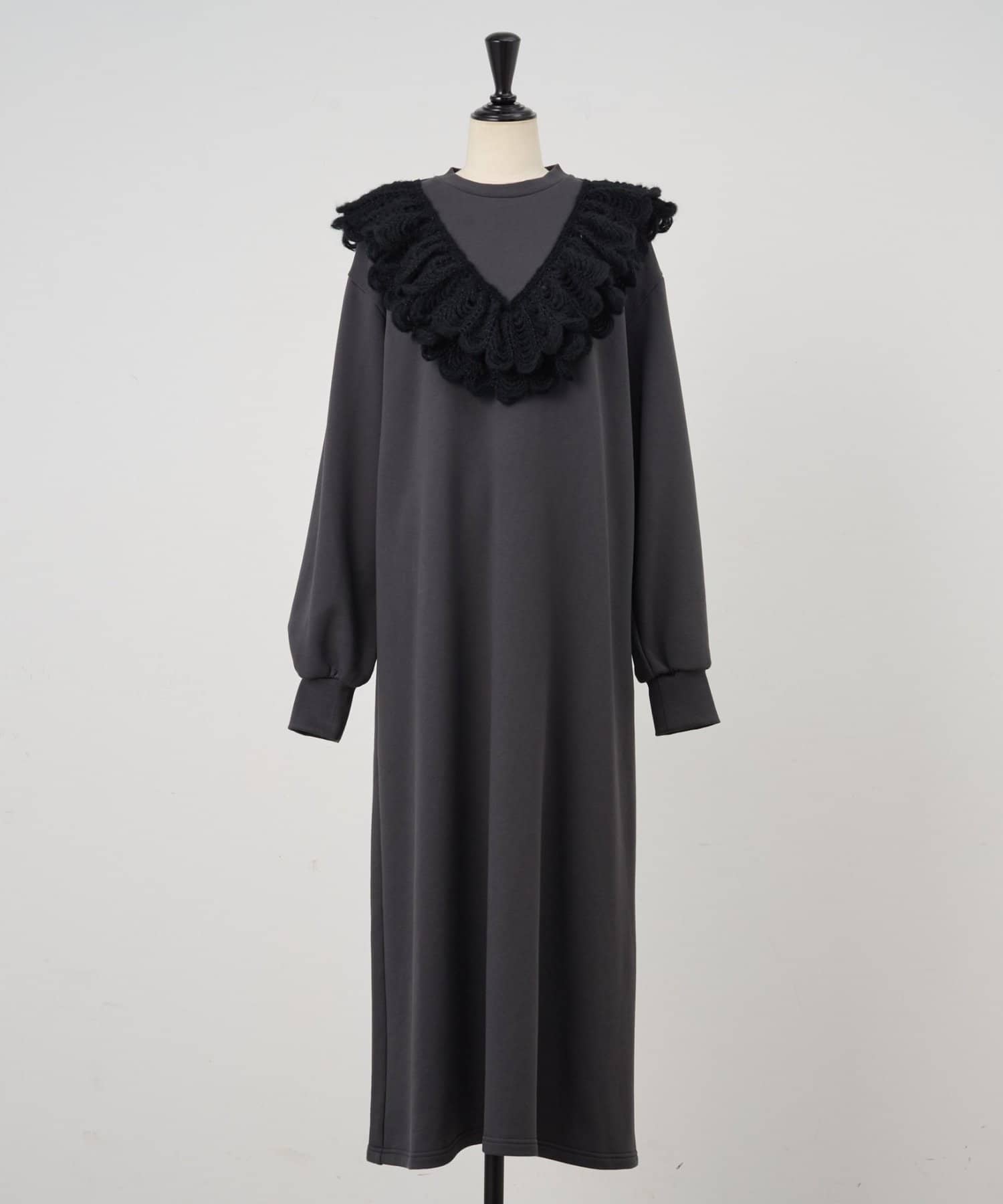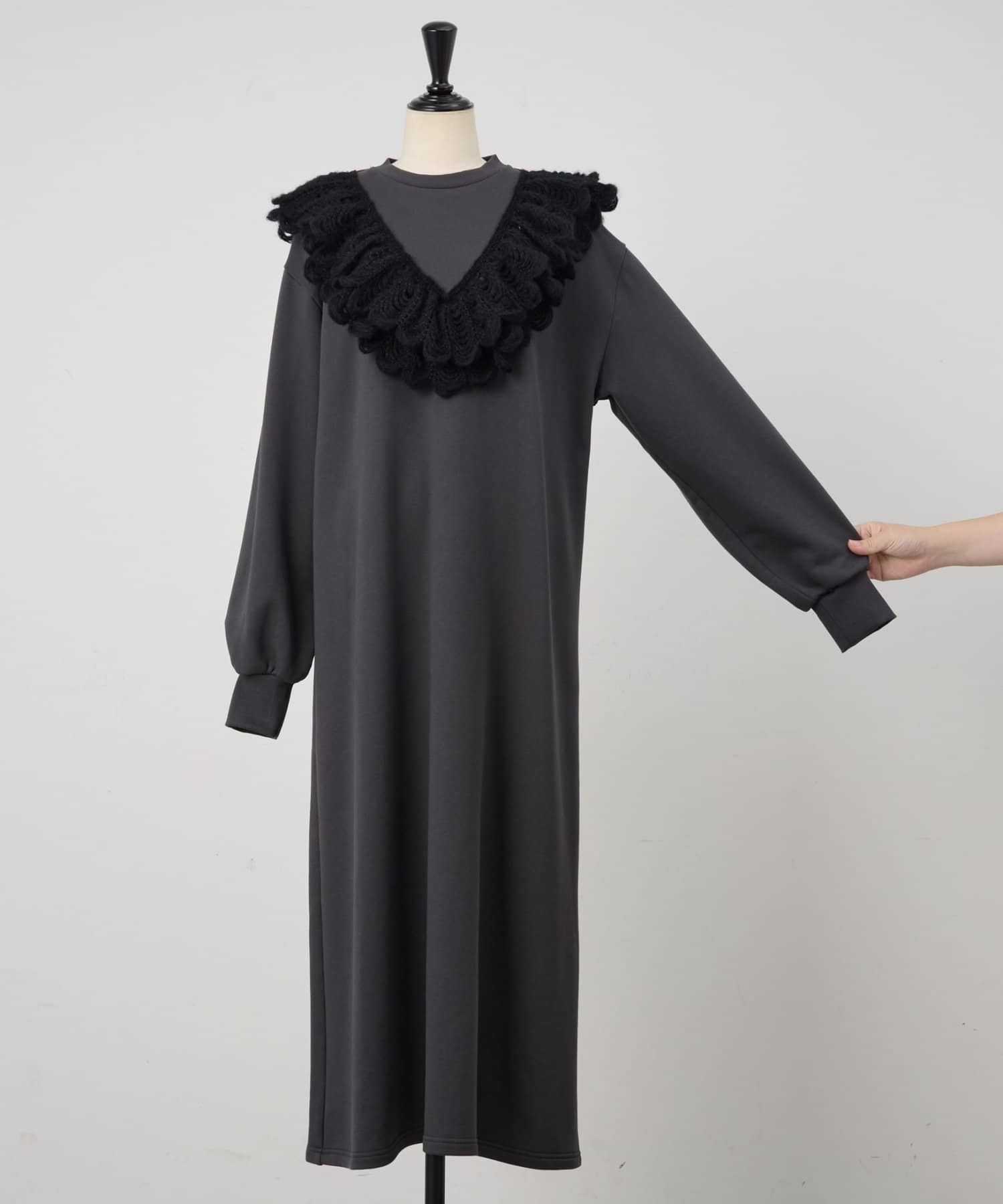 衿元にタム糸を使用した透かし編みのニットレースを施したワンピース。