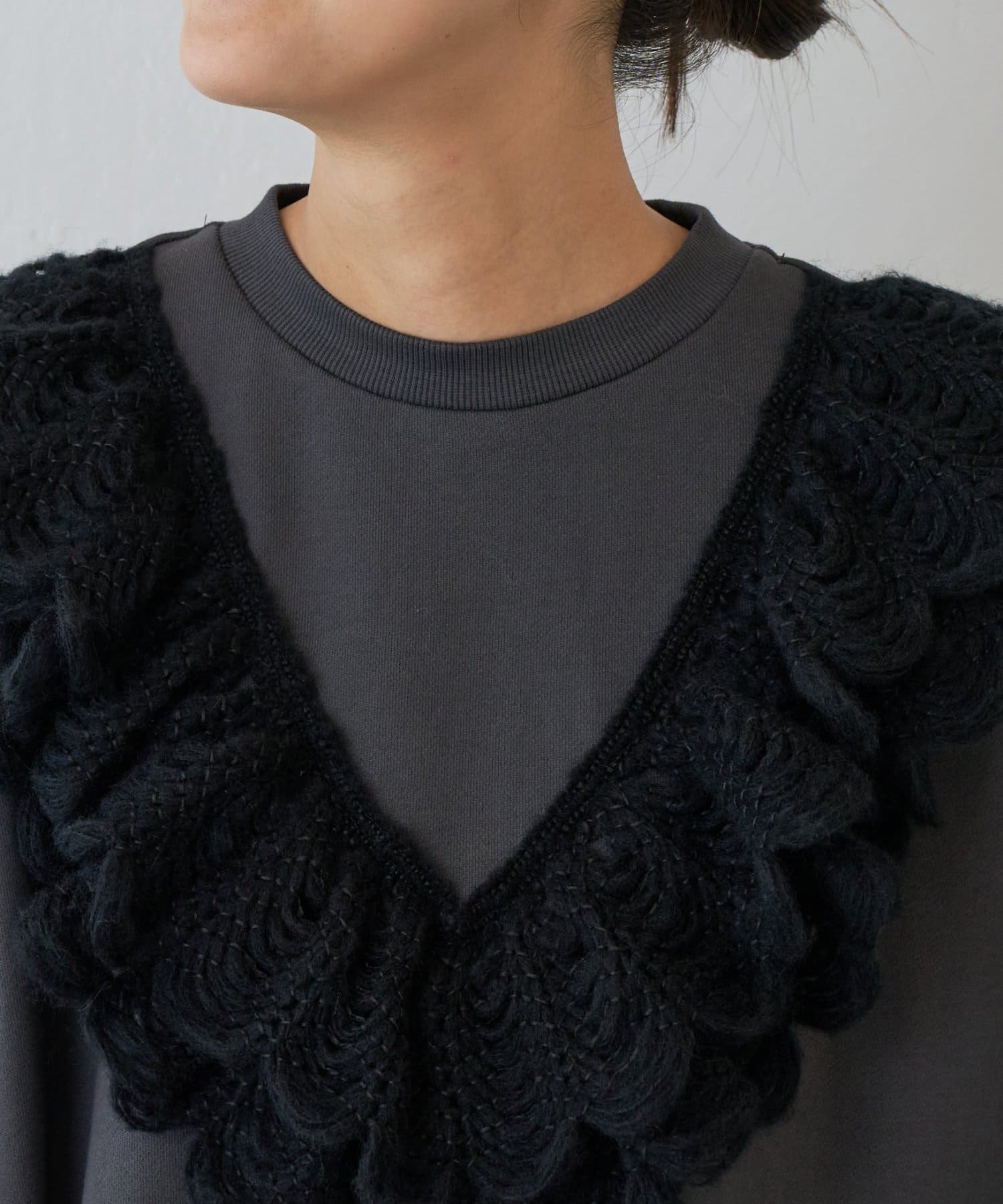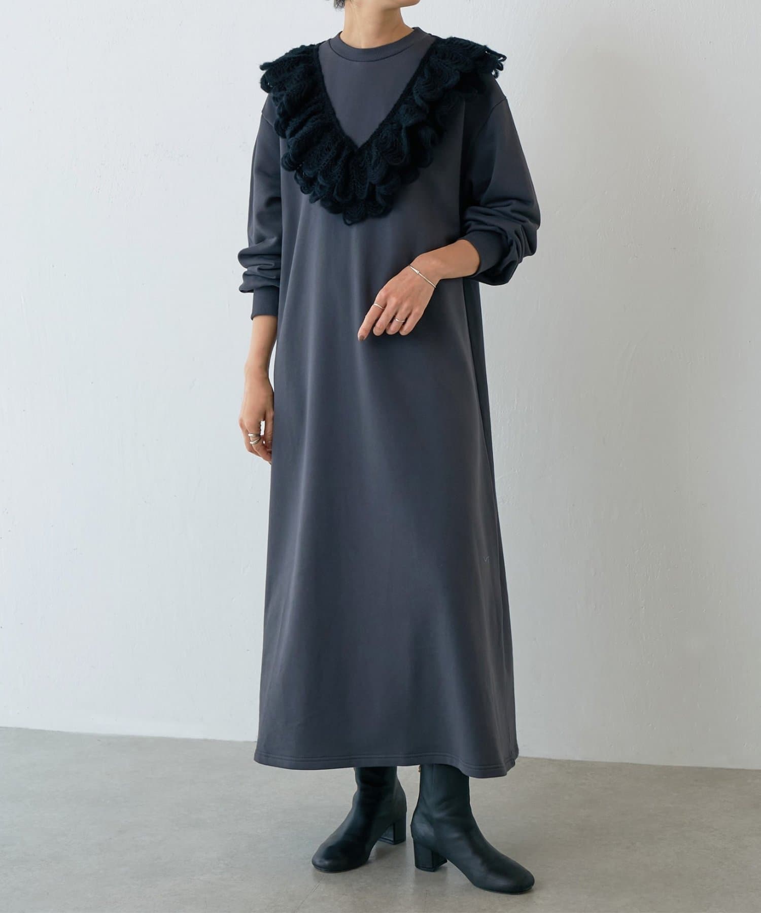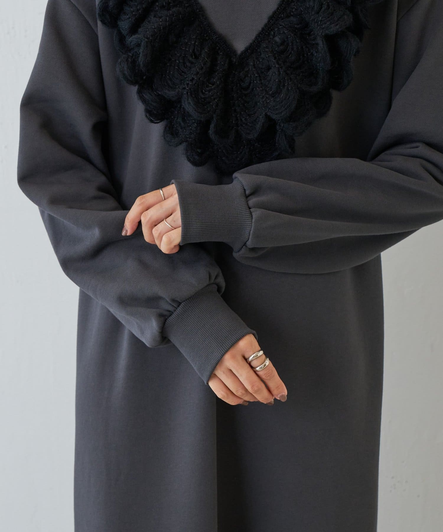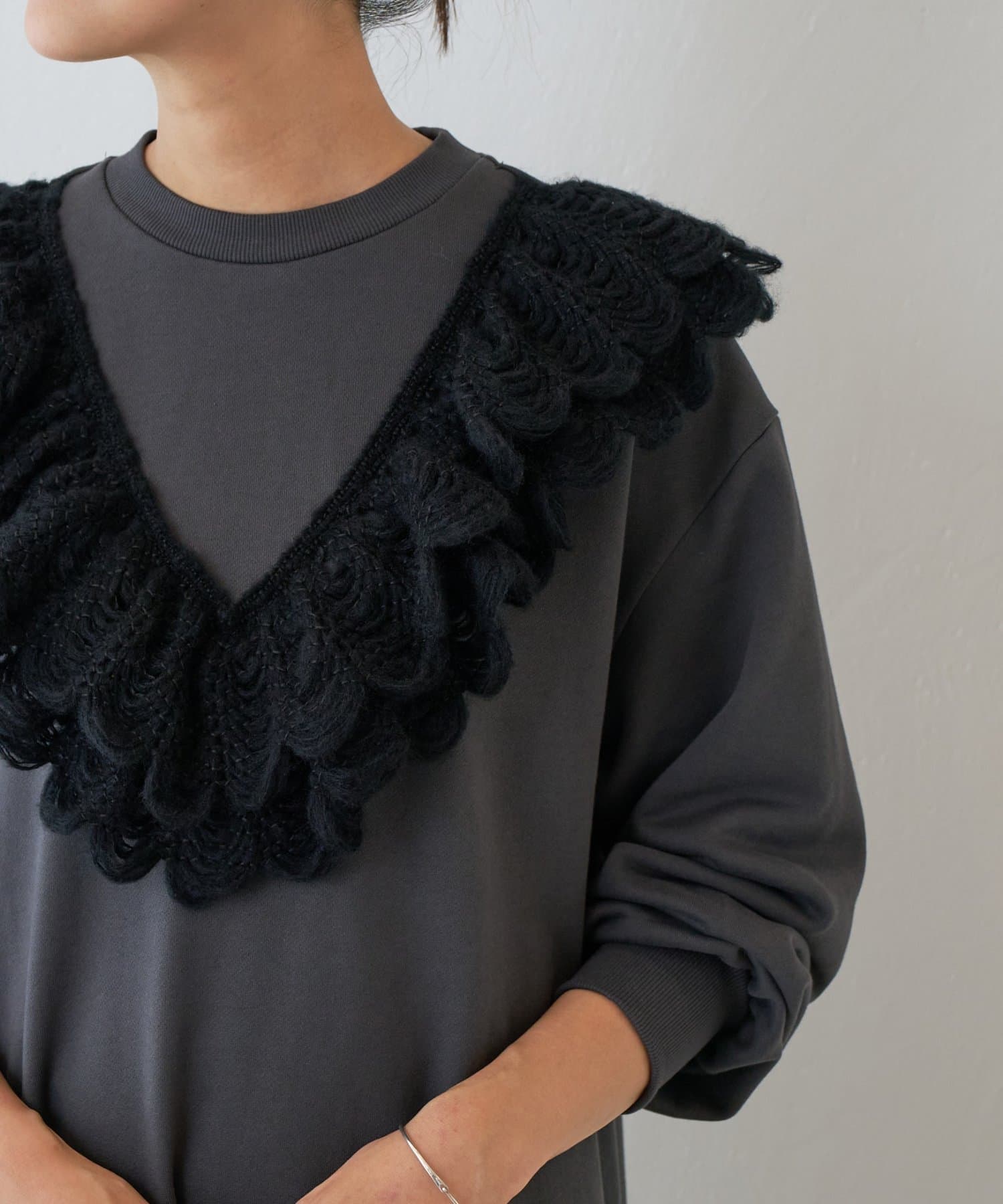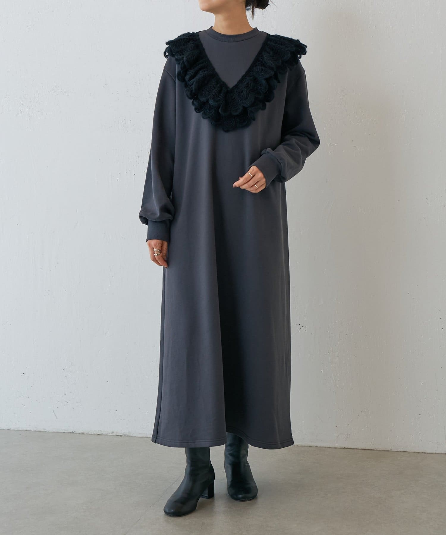 衿元にタム糸を使用した透かし編みのニットレースを施したワンピース。