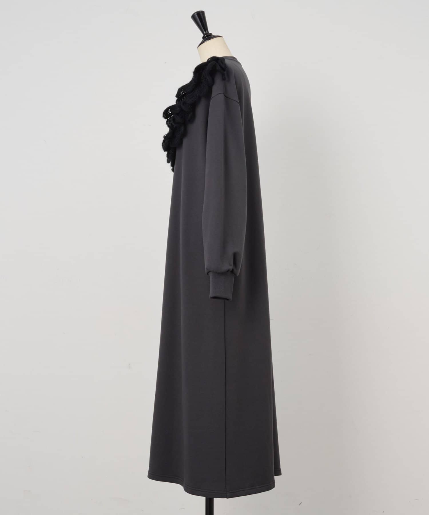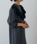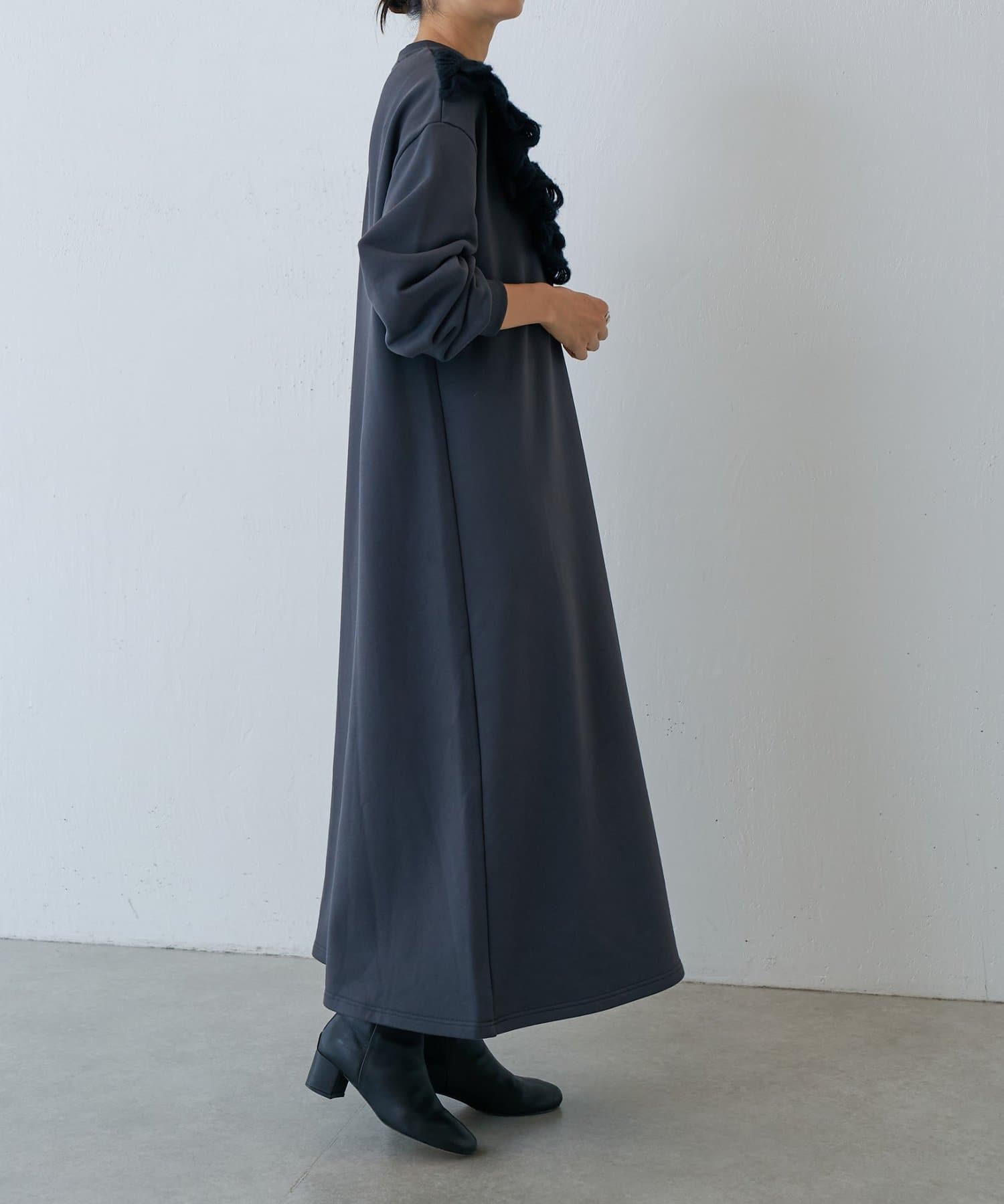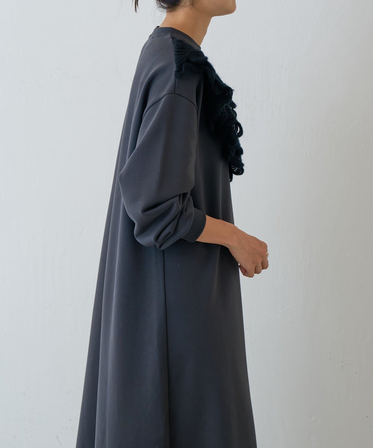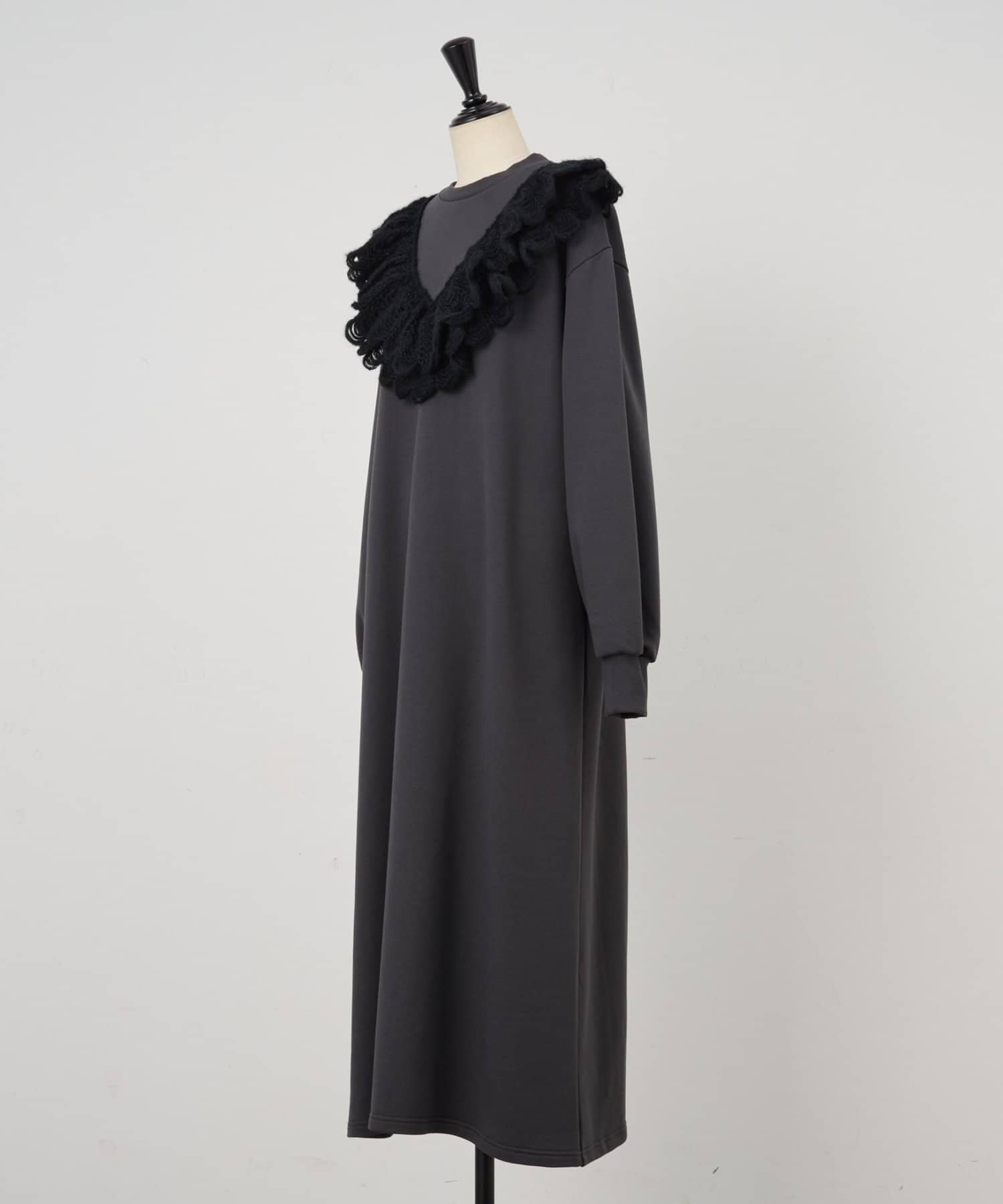 衿元にタム糸を使用した透かし編みのニットレースを施したワンピース。