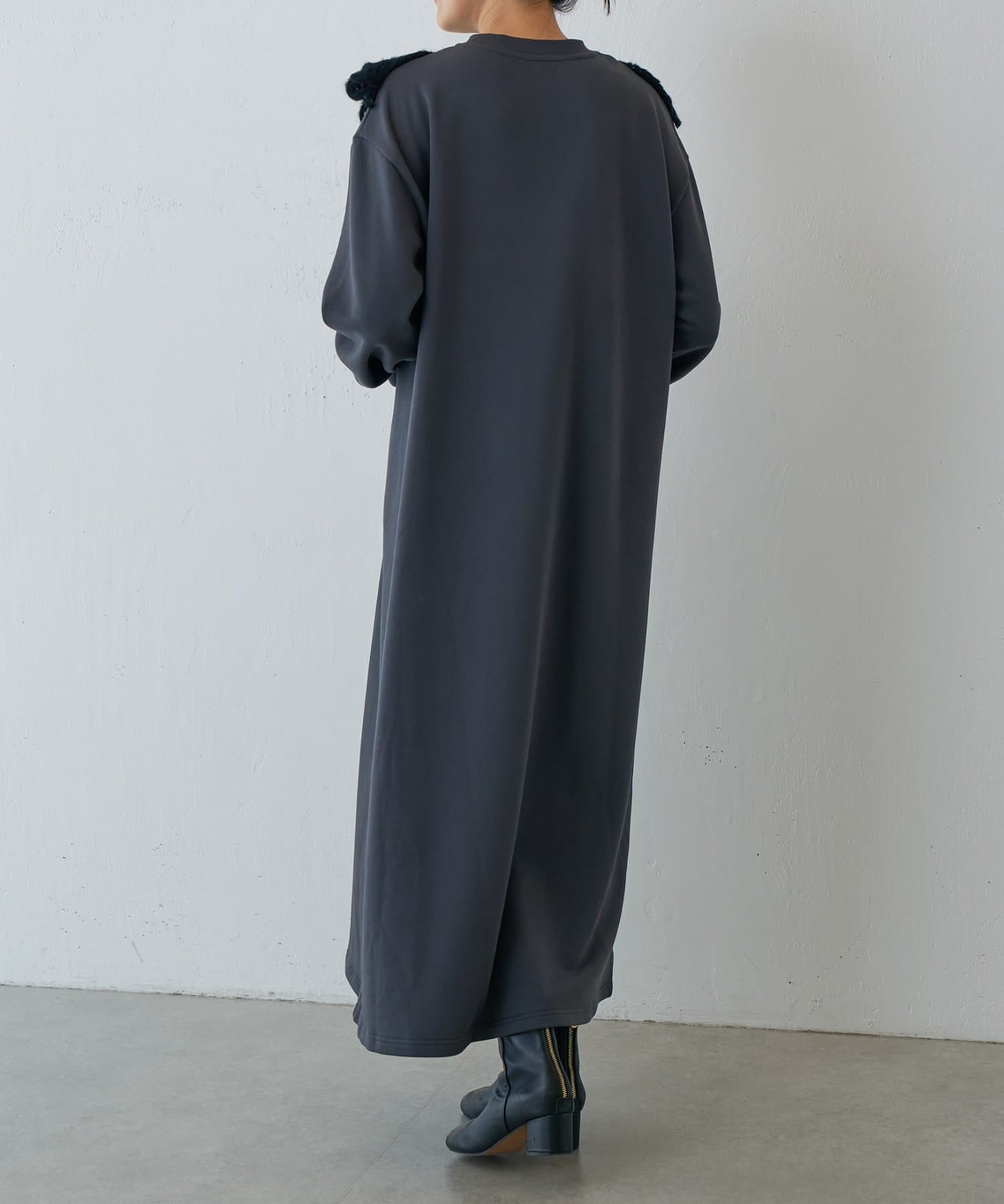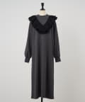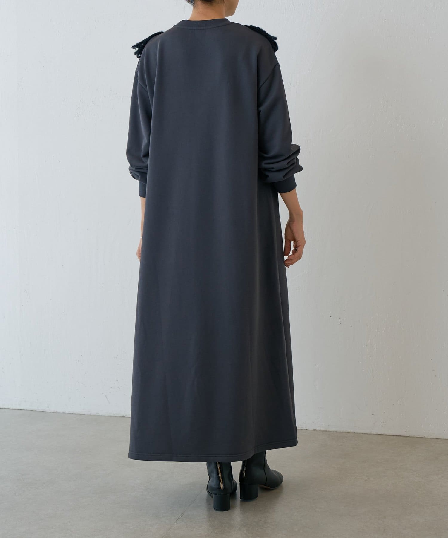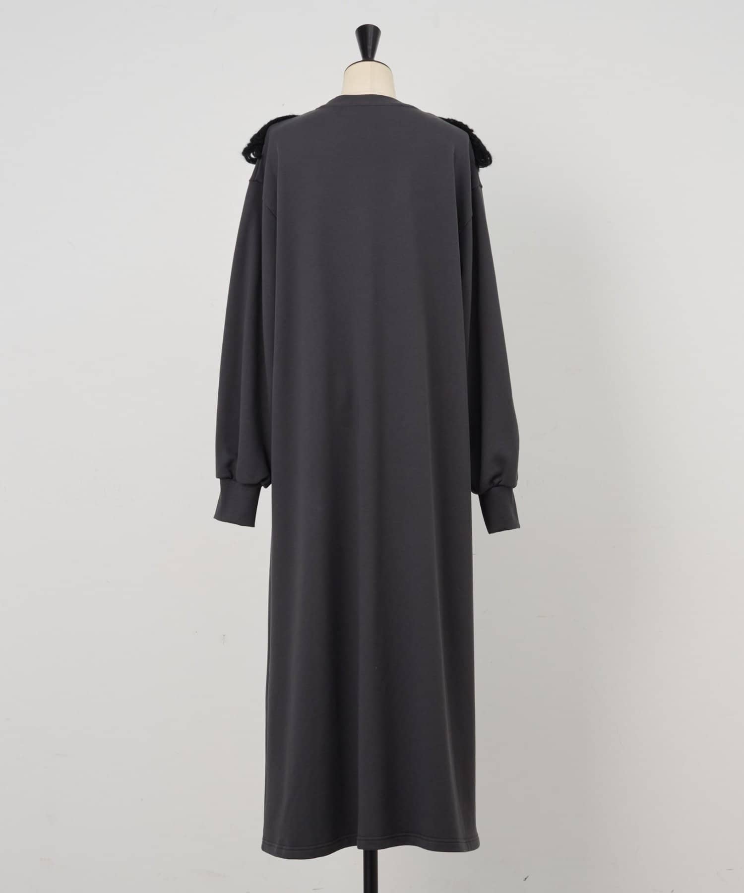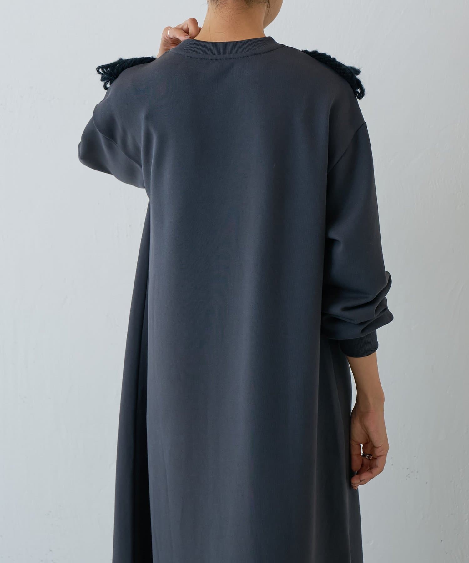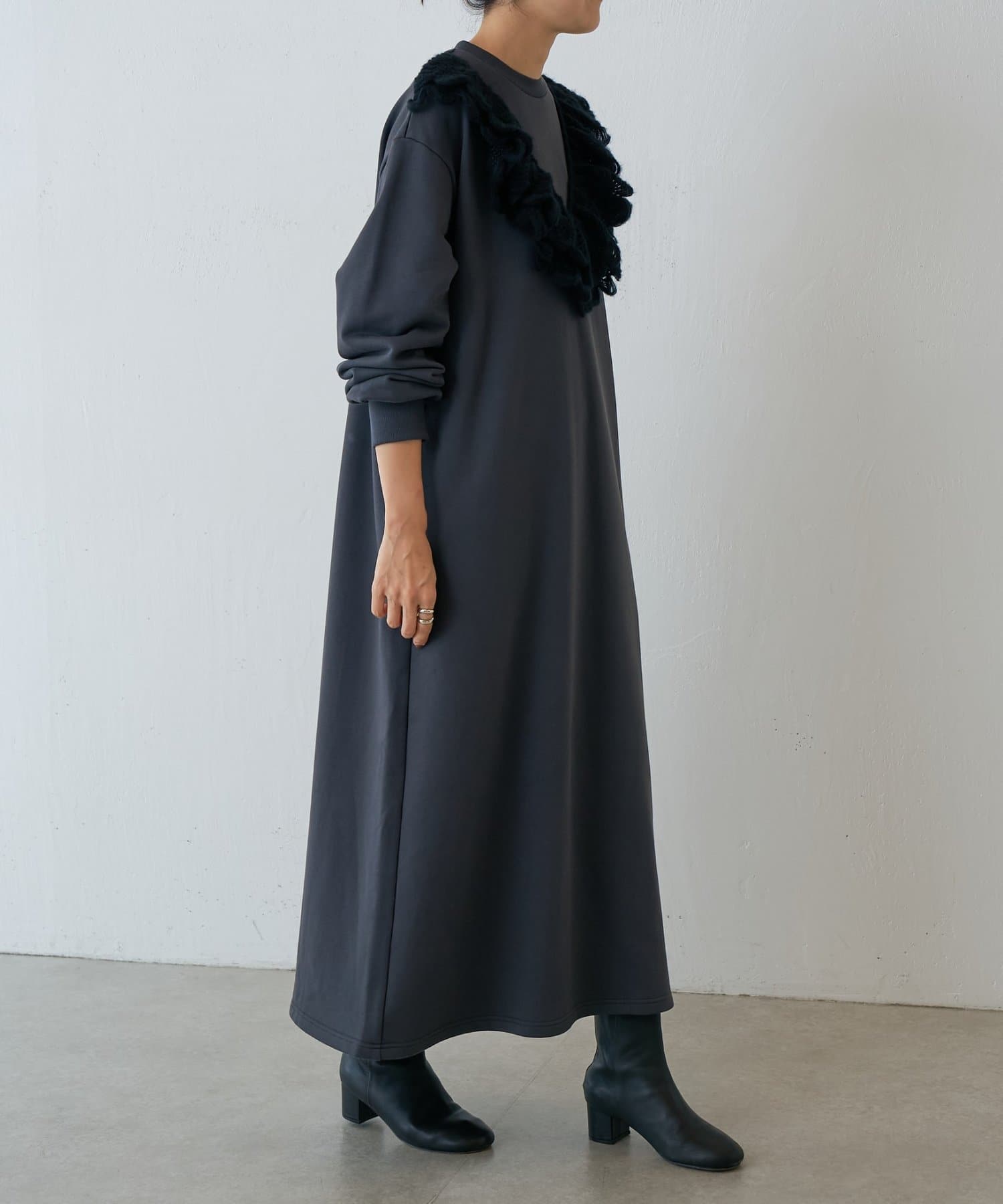 衿元にタム糸を使用した透かし編みのニットレースを施したワンピース。