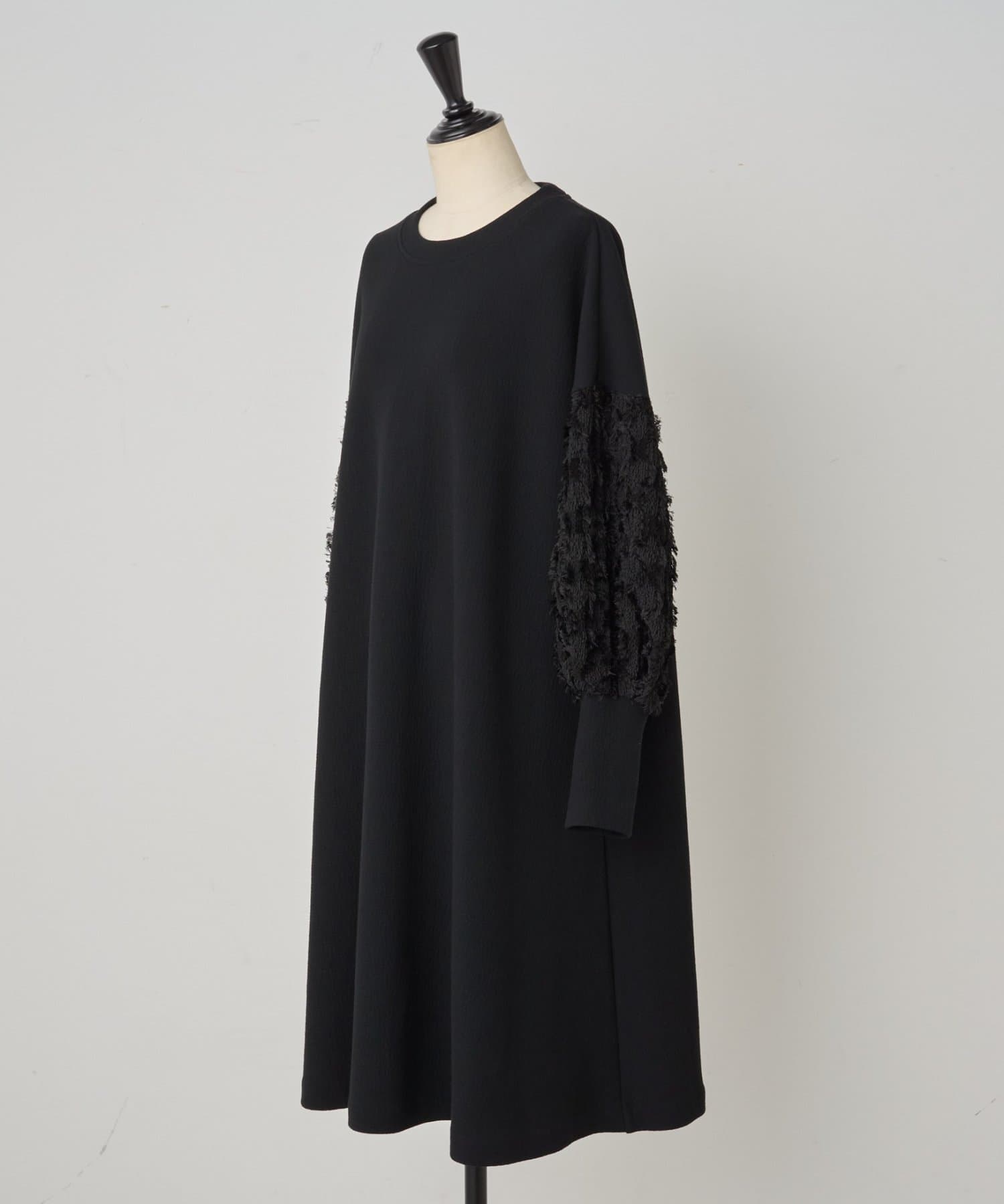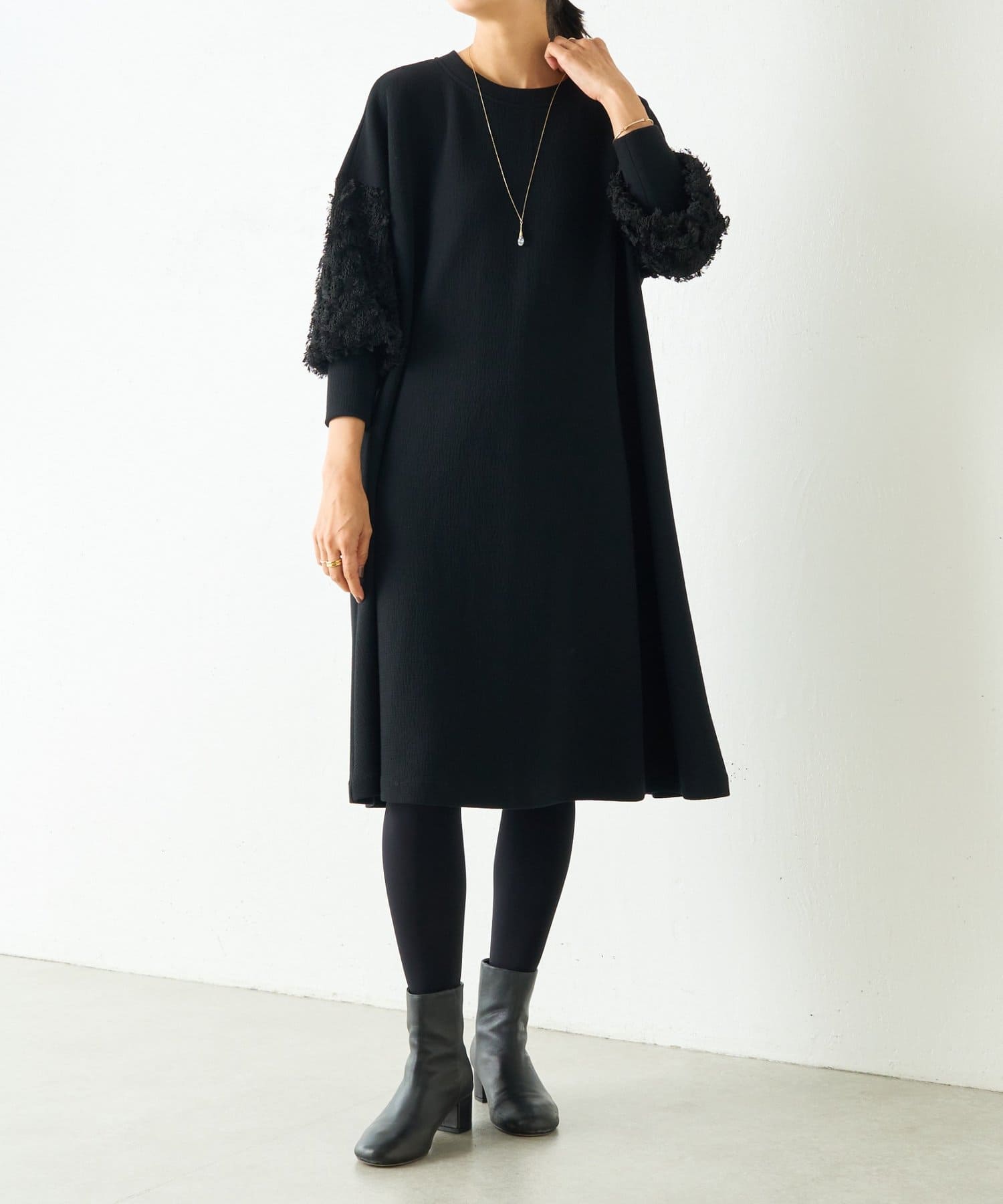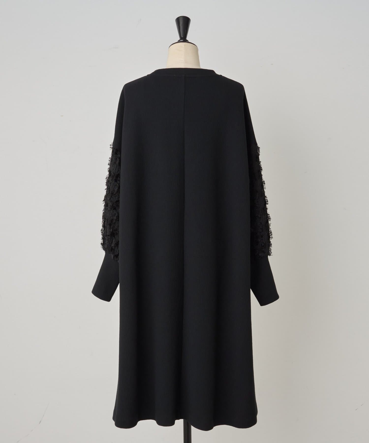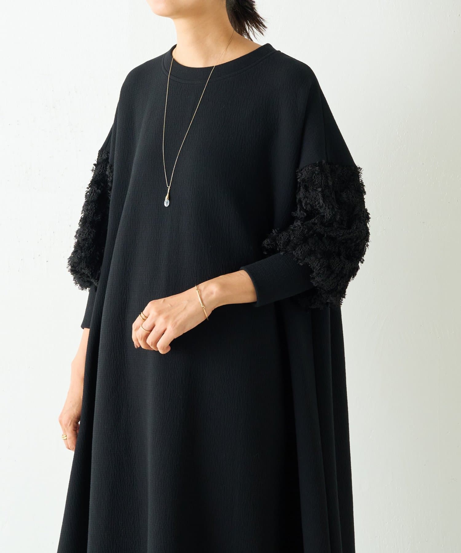 表情豊かなフリンジジャガード生地が目を引くミディアムワンピース。