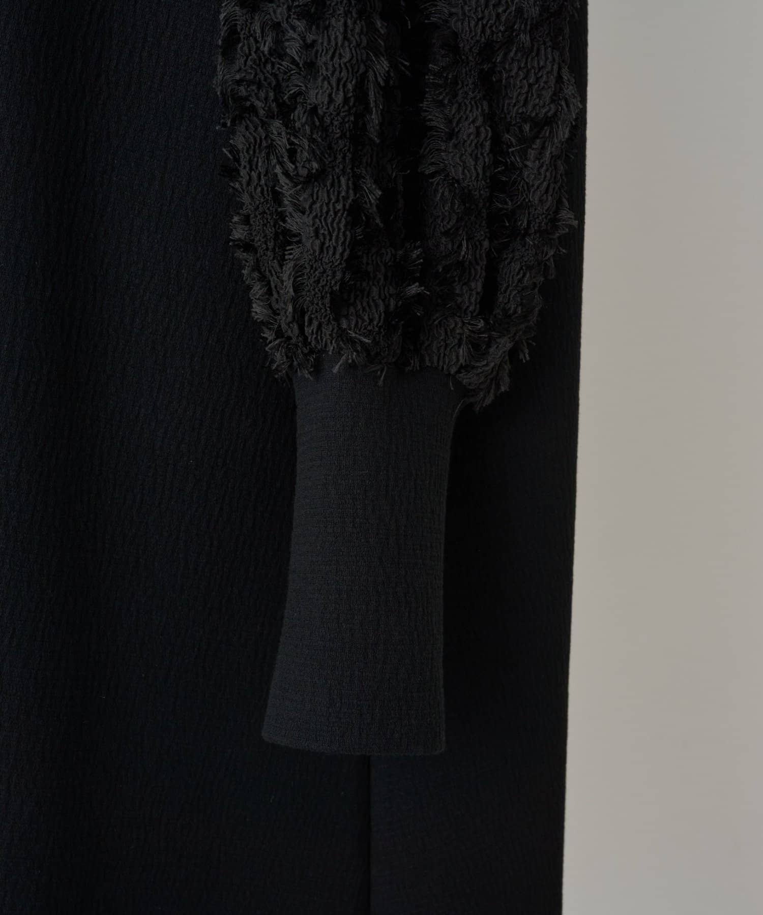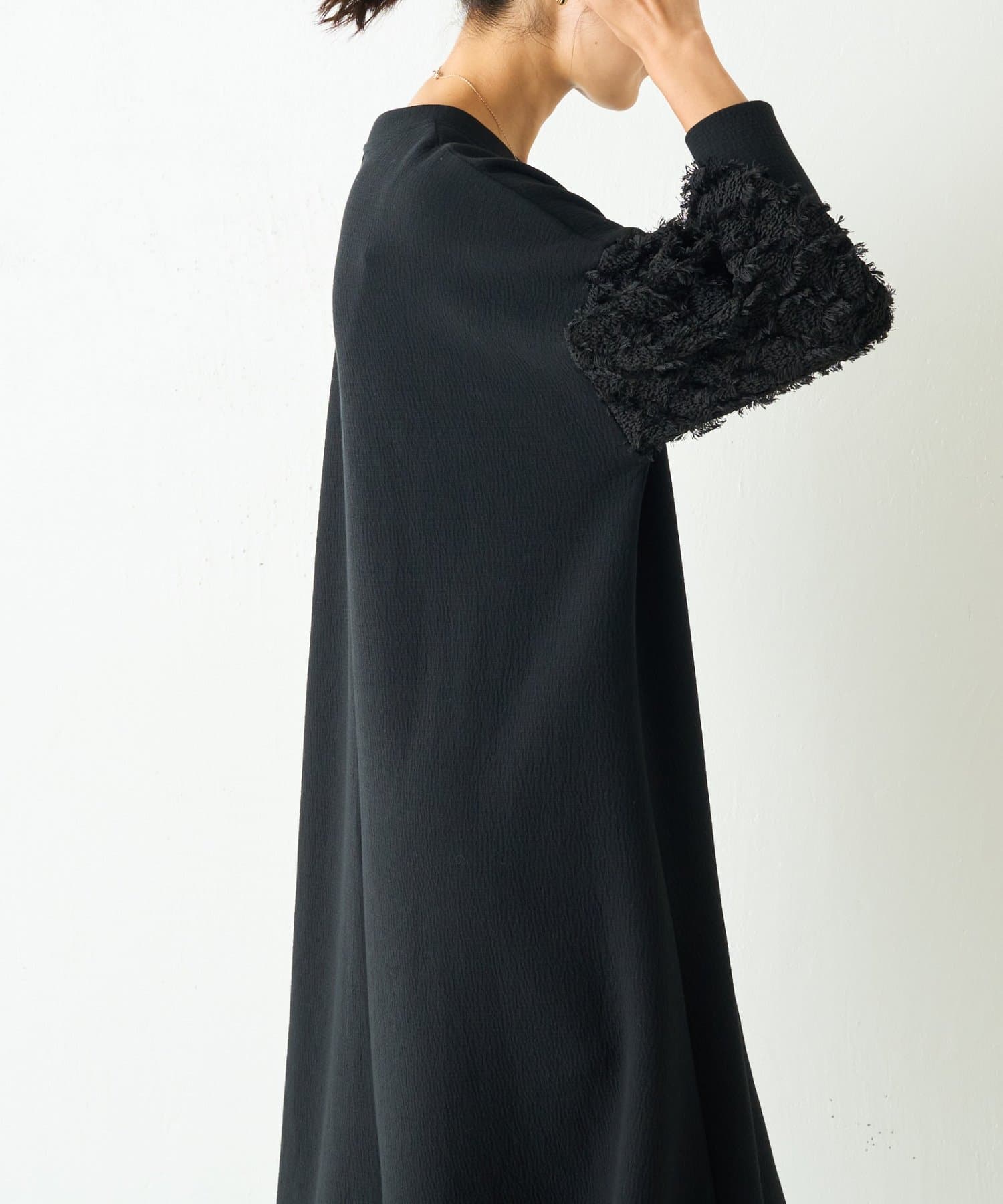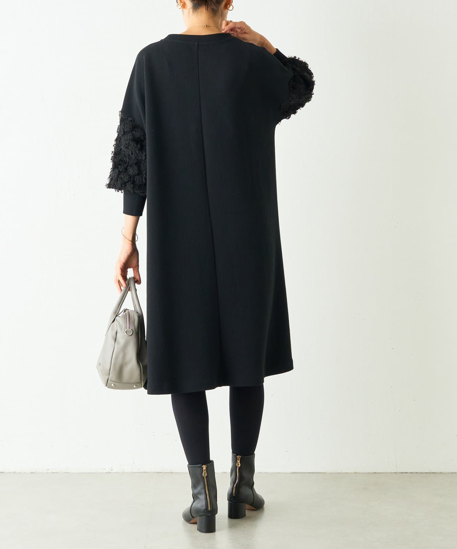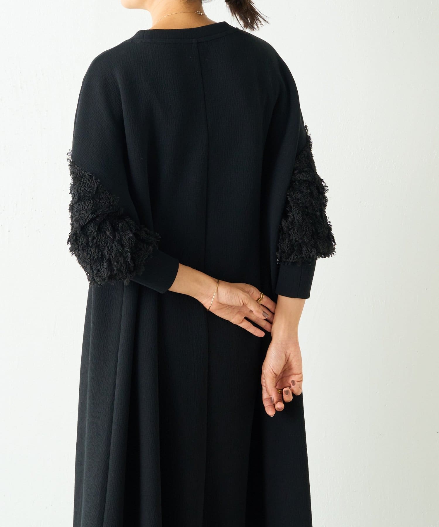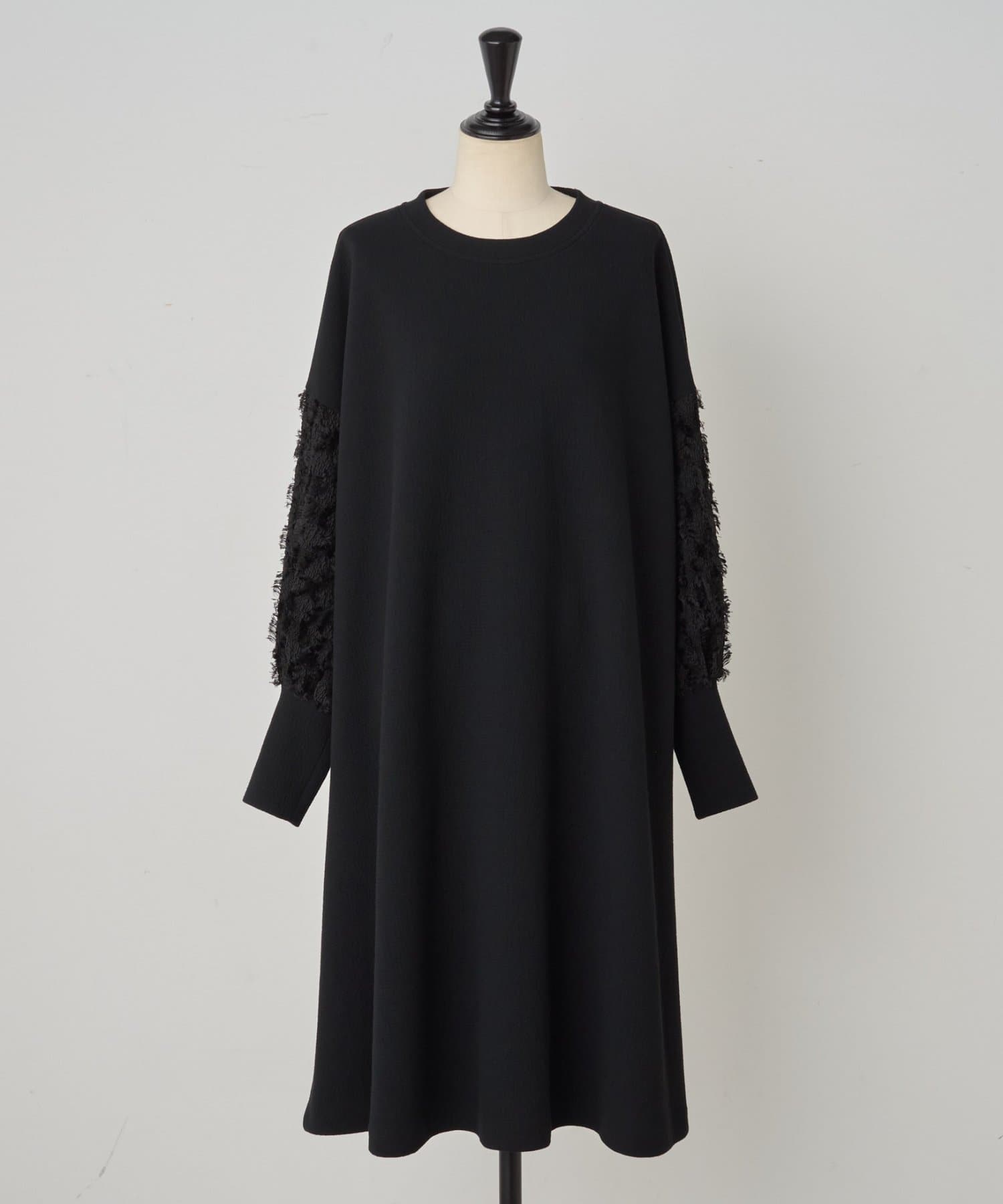 表情豊かなフリンジジャガード生地が目を引くミディアムワンピース。